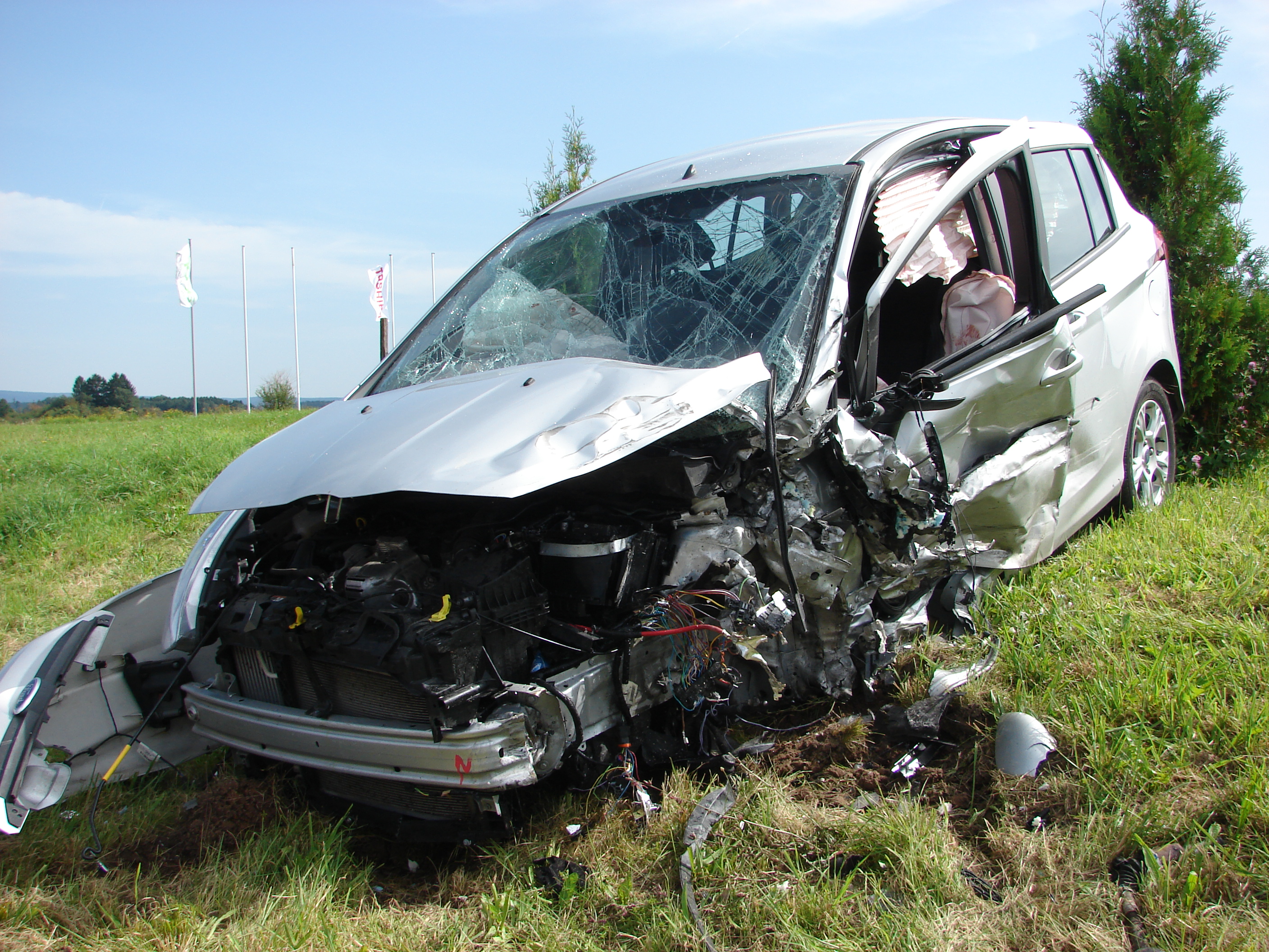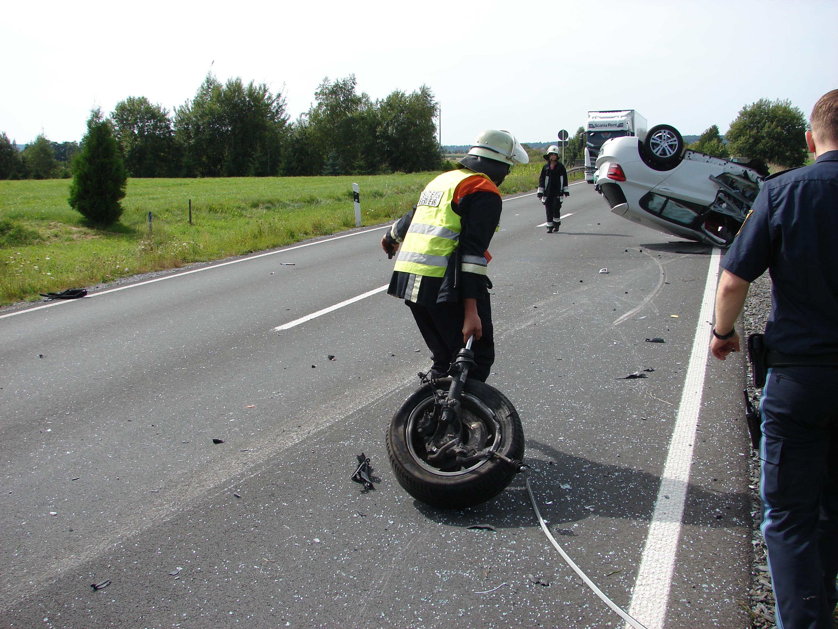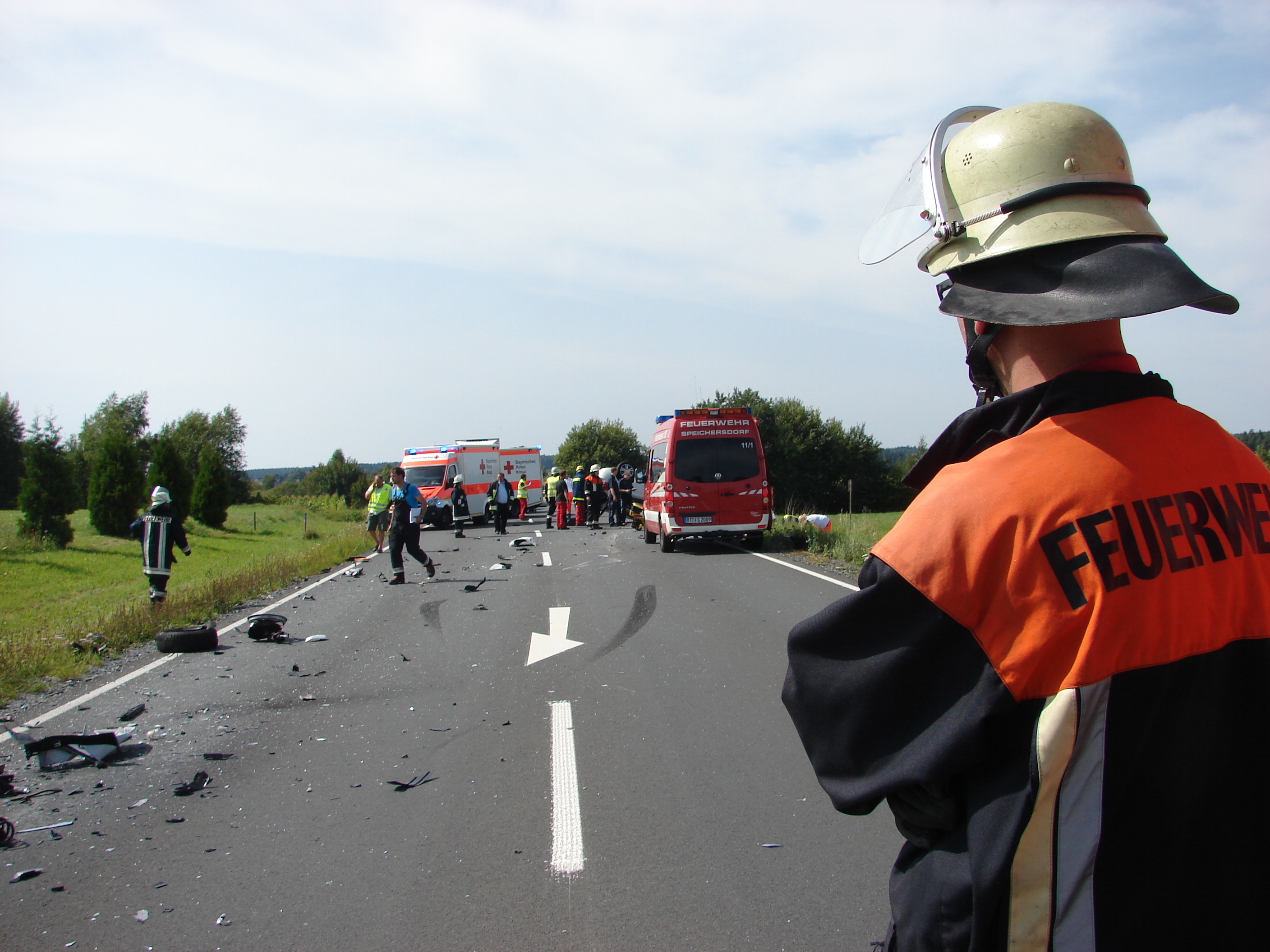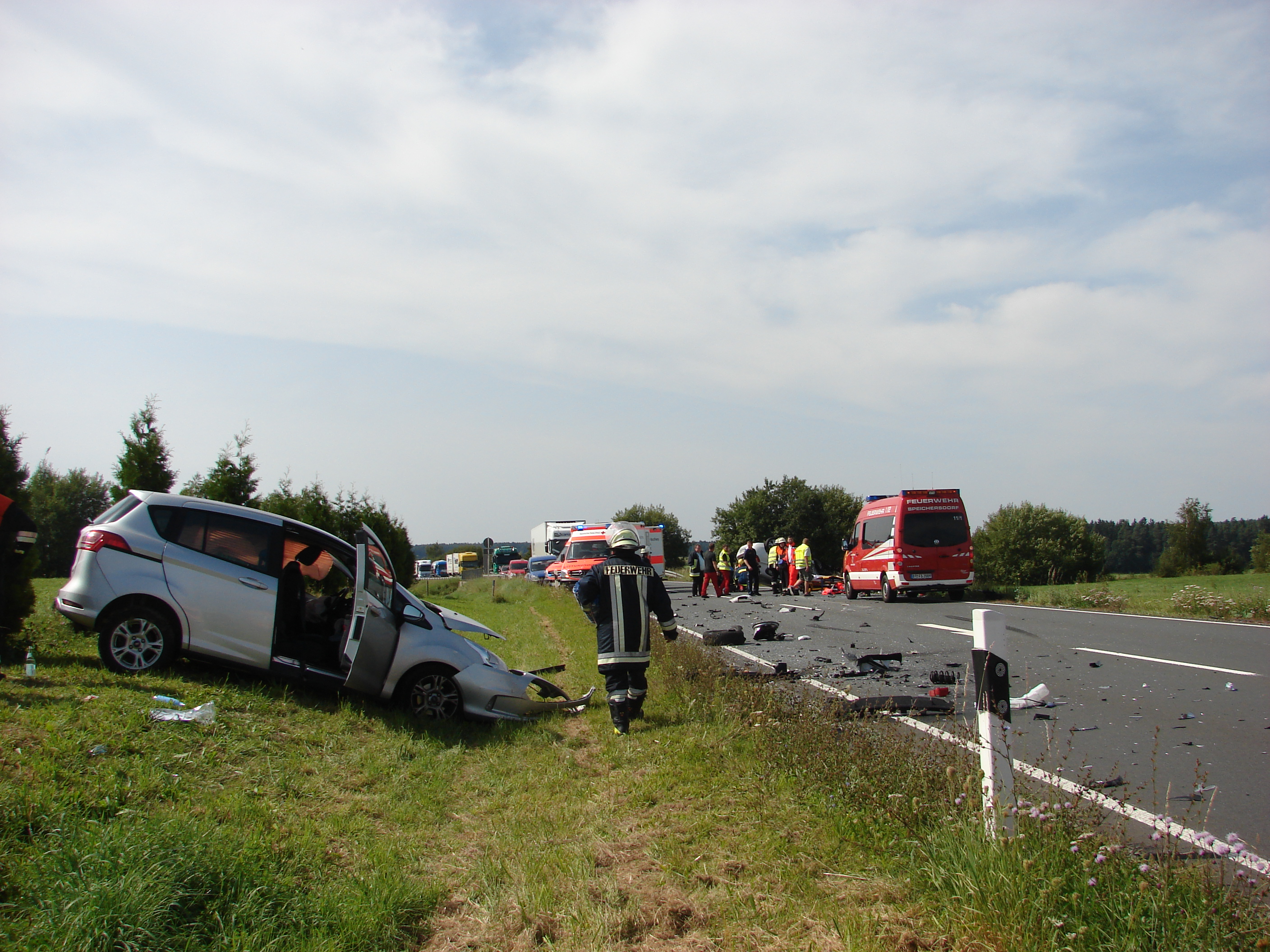 Die anrückenden Einsatzkräfte fanden ein Trümmerfeld vor. Ein BMW und ein Ford stießen im Begegnungsverkehr zusammen. Der BMW überschlug sich und schilderte einige Meter über die Fahrbahn bis er zum Stehen kam. Der Ford schleuderte in den Graben und kam an der Böschung zum Stehen. Die beiden Insassen des Fords konnten sich selbst aus dem PKW befreien. Bei dem Ford kam es durch dem Aufprall zu einer Rauchentwicklung, die sich aber nicht als Fahrzeugbrand bestätigte. Die Fahrerin des BMWs konnte von der Feuerwehr ohne Einsatz des Rettungssatzes aus dem Auto gerettet werden.  Sie wurde dem Rettungsteam des BRKs, bestehend aus Rettungssanitätern und Notarzt, übergeben. Die beiden anderen Unfallbeteiligten wurden ebenfalls vom BRK versorgt. Alle Verunfallten wurden nach der Erstversorgung mit leichten bis schweren Verletzungen ins Krankenhaus gebracht. Neben der Bergung der Unfallopfern wurde der Verkehr durch die Feuerwehr umgeleitet, da die Bundesstraße für Dauer des Einsatzes total gesperrt werden musste.