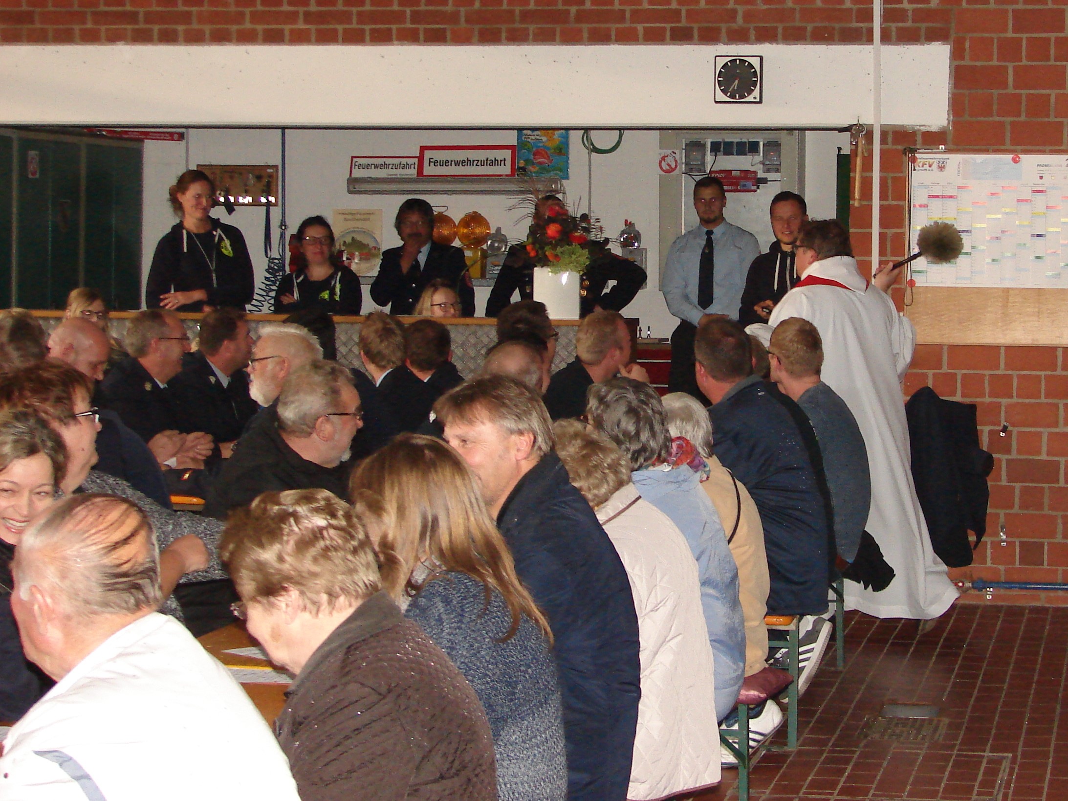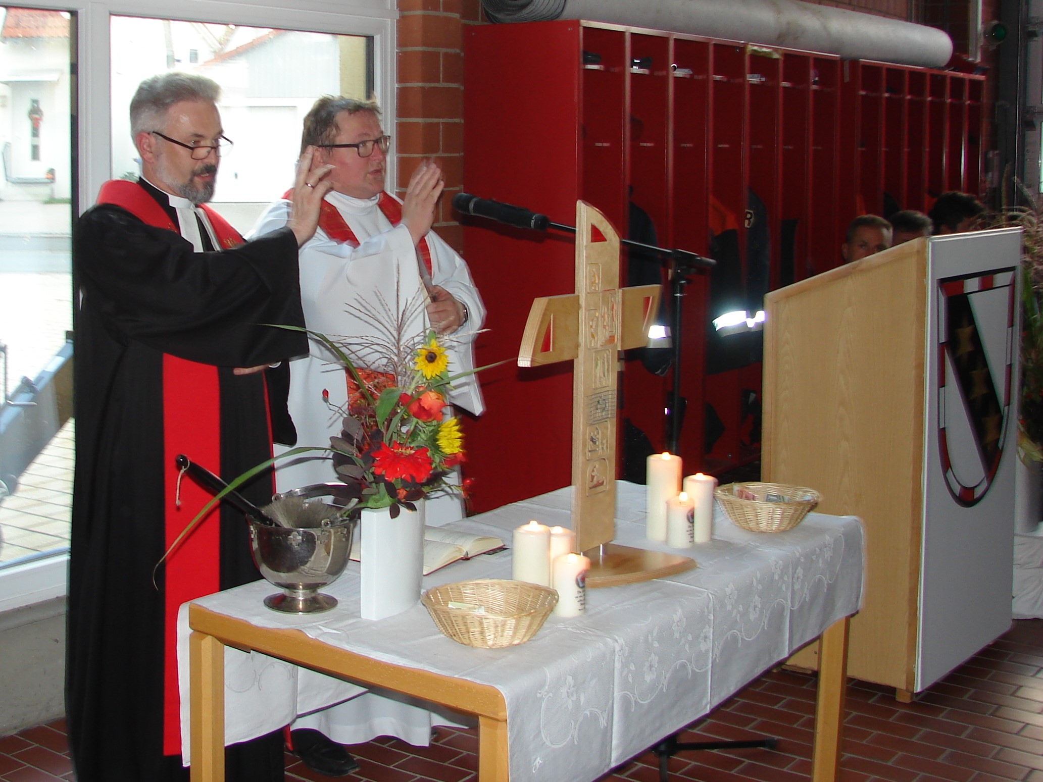Den ökumenischen Gottesdienst gestalteten die beiden Pfarrer Dirk Grafe und Sven Grillmeier und dem Motto: Durch Weisheit wird ein Haus gebaut und durch Verstand erhalten. Dirk Grafe stellte in seiner Andacht die Frage: Ja brauche man den dies alles, das kostet doch ein Vermögen. Er bejahte dies ausdrücklich, wie er und sein  Kollege Sven Grillmeier erst kürzlich beim Unfall auf der B 22 oder beim Brand nur wenige Meter vom Gerätehaus entfernt feststellen konnte. Es brauche dieses Haus damit die Gerätschaften und die Mannschaft ordentlich untergebracht sind.