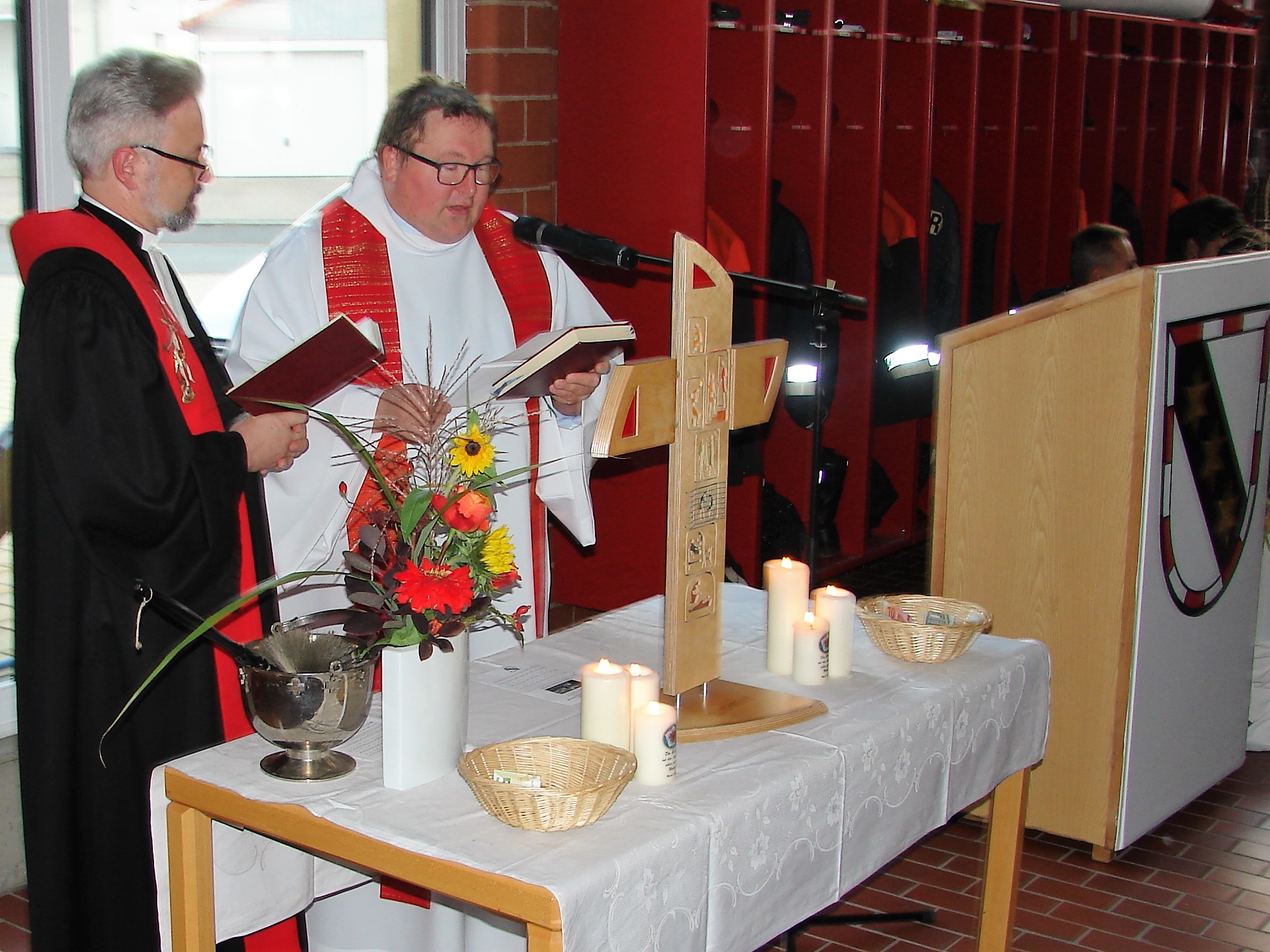 Den ökumenischen Gottesdienst gestalteten die beiden Pfarrer Dirk Grafe und Sven Grillmeier und dem Motto: Durch Weisheit wird ein Haus gebaut und durch Verstand erhalten. Dirk Grafe stellte in seiner Andacht die Frage: Ja brauche man den dies alles, das kostet doch ein Vermögen. Er bejahte dies ausdrücklich, wie er und sein  Kollege Sven Grillmeier erst kürzlich beim Unfall auf der B 22 oder beim Brand nur wenige Meter vom Gerätehaus entfernt feststellen konnte. Es brauche dieses Haus damit die Gerätschaften und die Mannschaft ordentlich untergebracht sind.