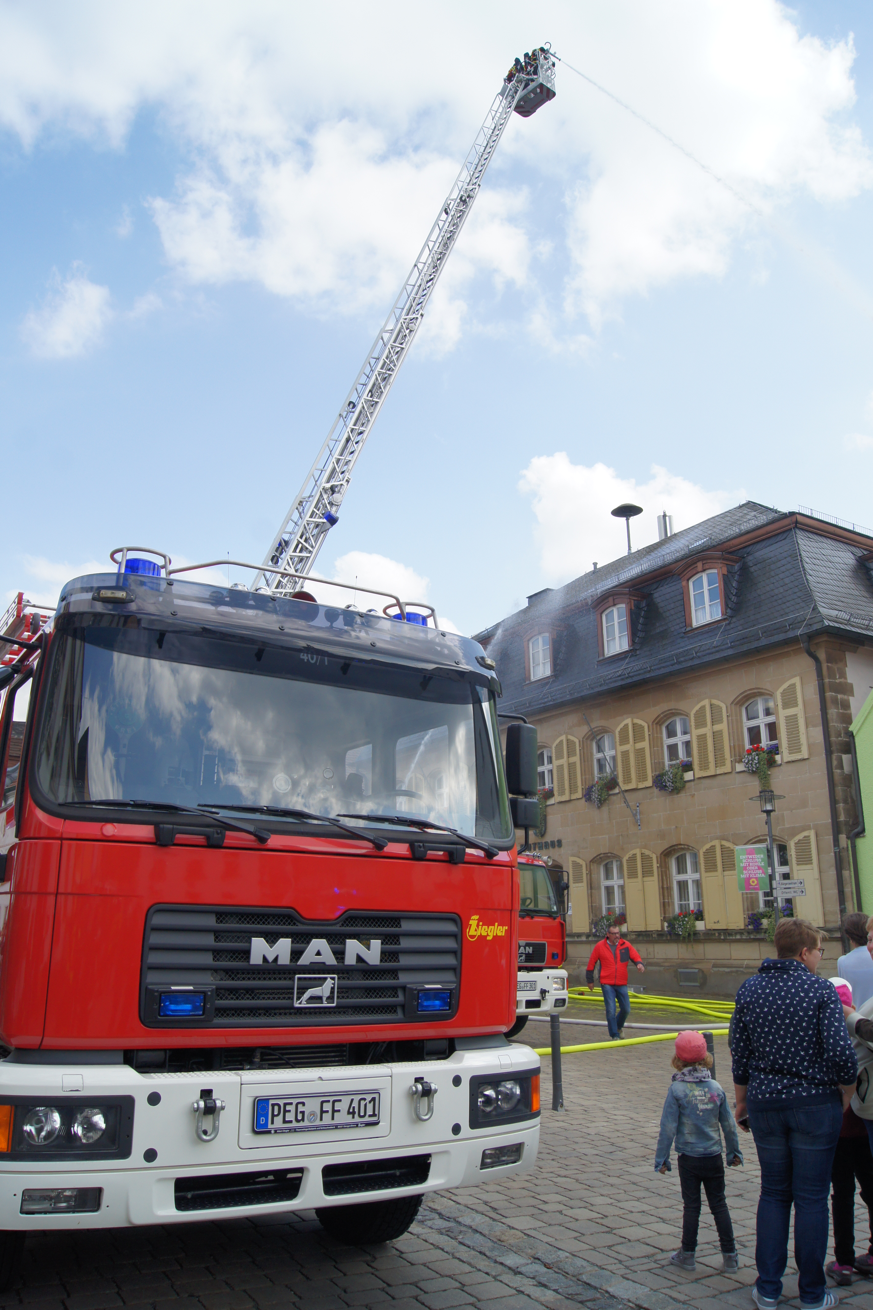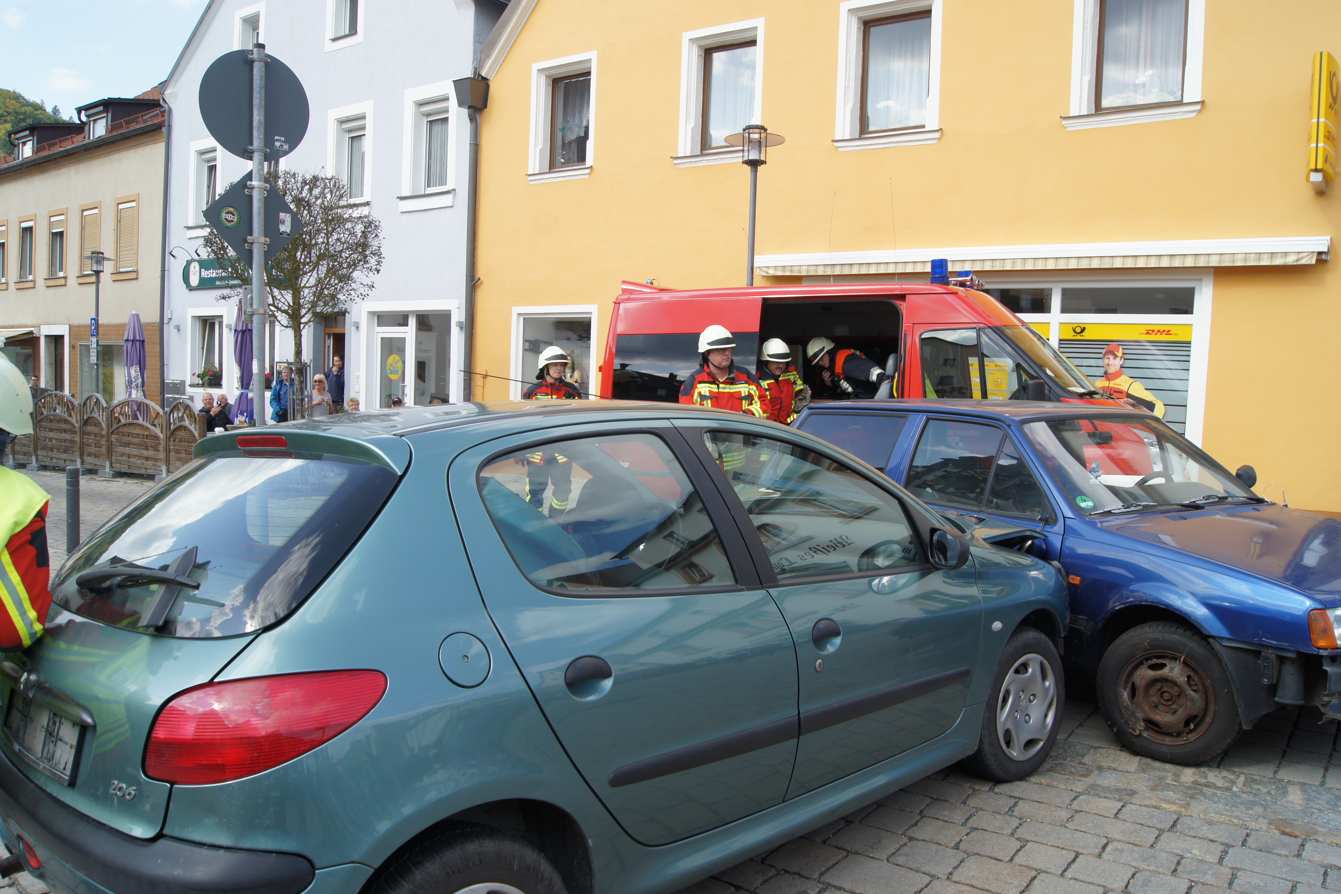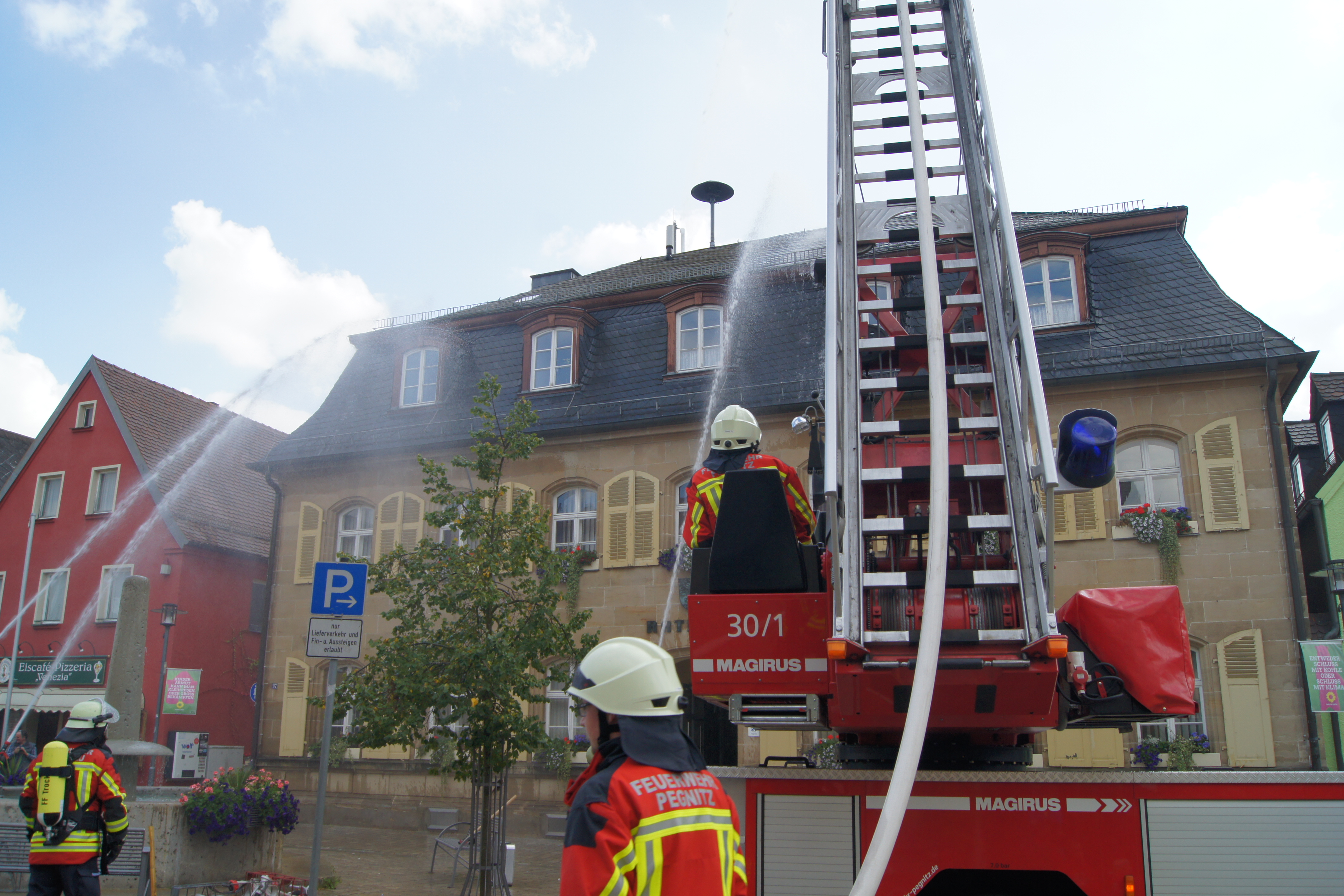 „Starke Rauchentwicklung mit Feuerschein aus dem Rathaus und mehrere Personen sind in Gefahr“, so lautete der Notruf, den ein Spaziergänger in der Pegnitzer Hauptstraße am Samstag gegen 14 Uhr absetzte. Weitere Notrufe gingen durch Passanten und Nachbarn ein. Des Weiteren habe sich ein Unfall durch abgelenkte Verkehrsteilnehmer im Kreuzungsbereich auf Höhe der Poststelle ereignet, Personen seien noch im Fahrzeug eingeklemmt. Die Integrierte Leitstelle Bayreuth-Kulmbach alarmierte dementsprechend die erforderlichen Einsätzkräfte. Glücklicherweise handelte es sich bei dem Szenario jedoch um keinen Ernstfall, sondern die Übung der Inspektion III im Rahmen der Feuerwehraktionswoche.