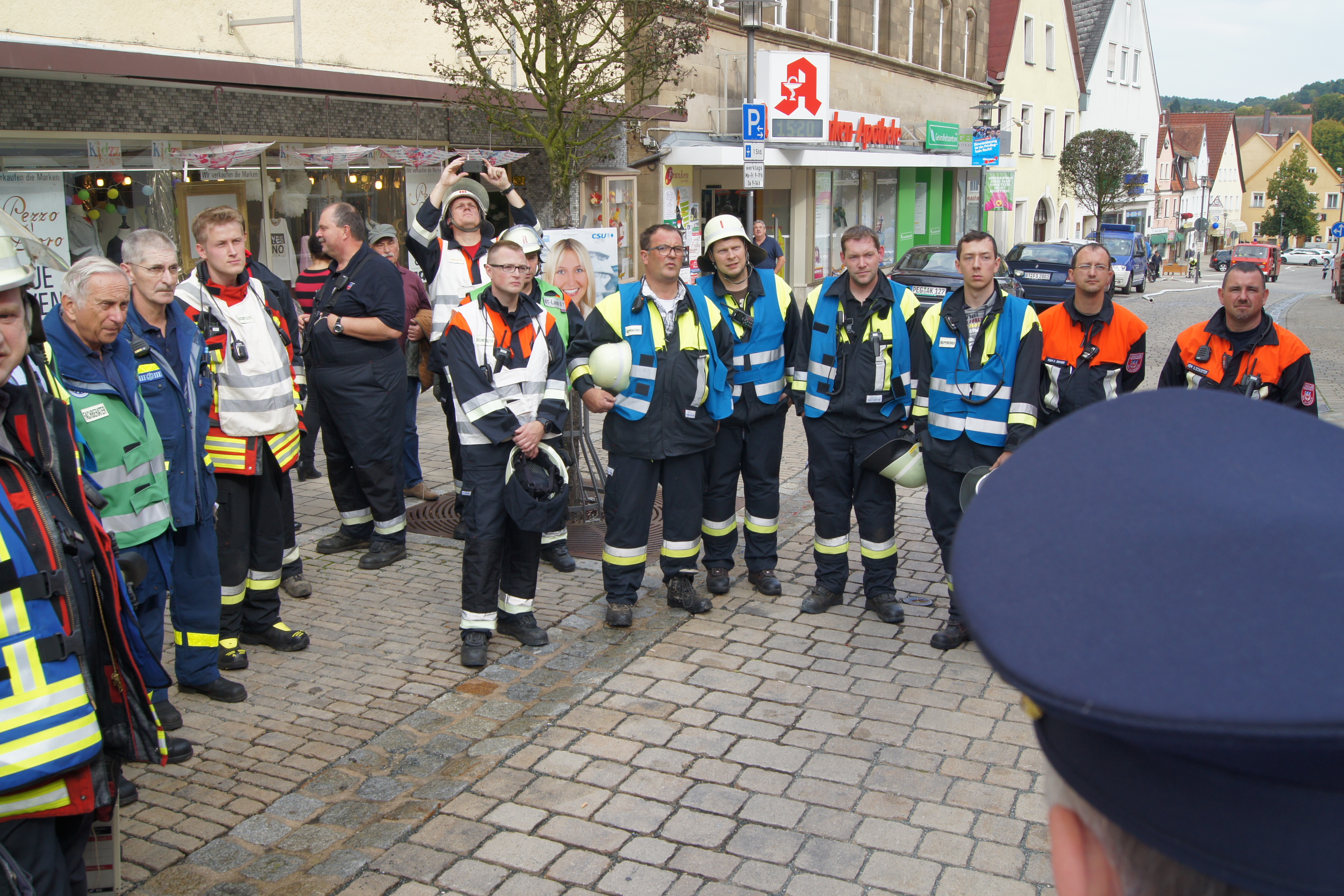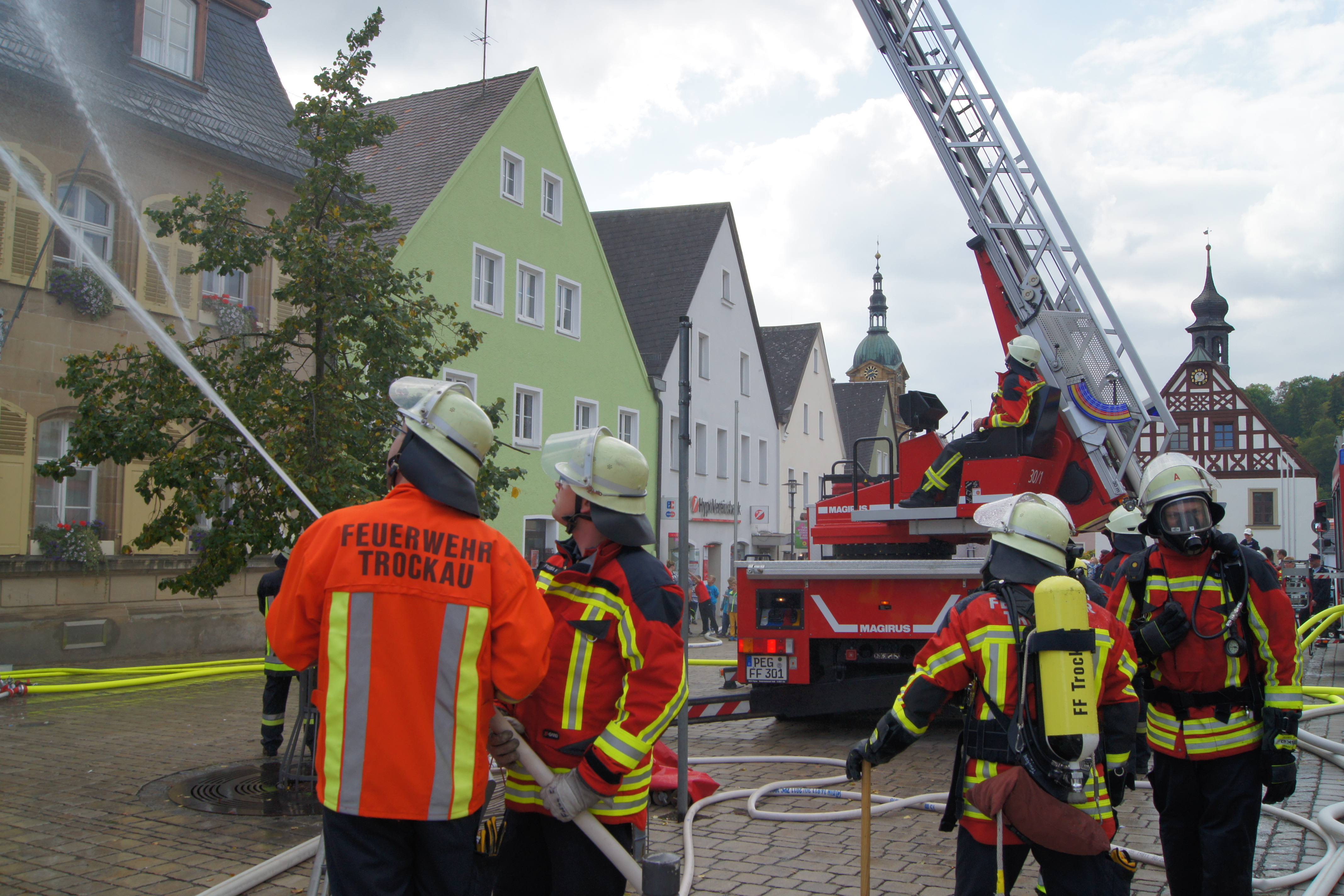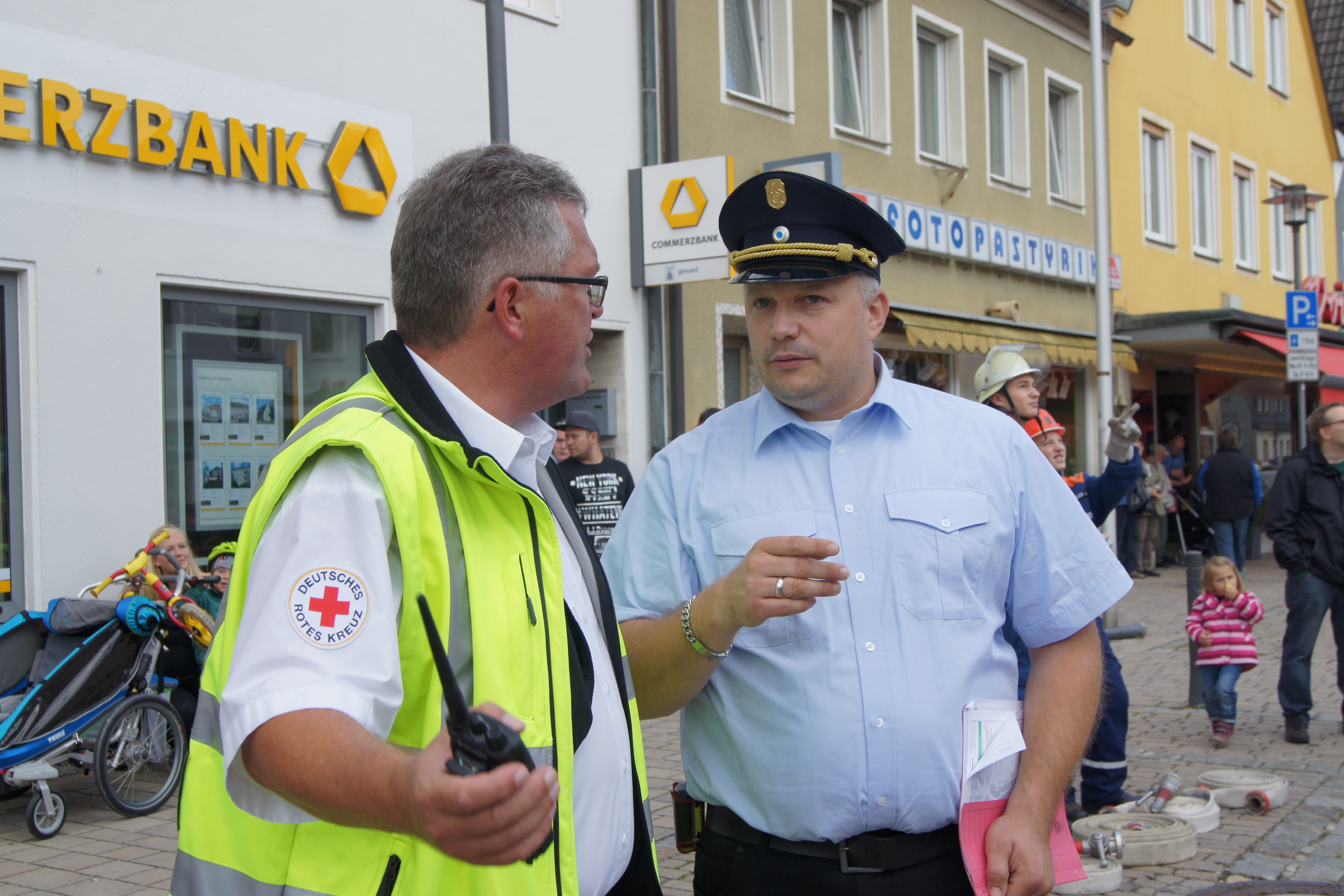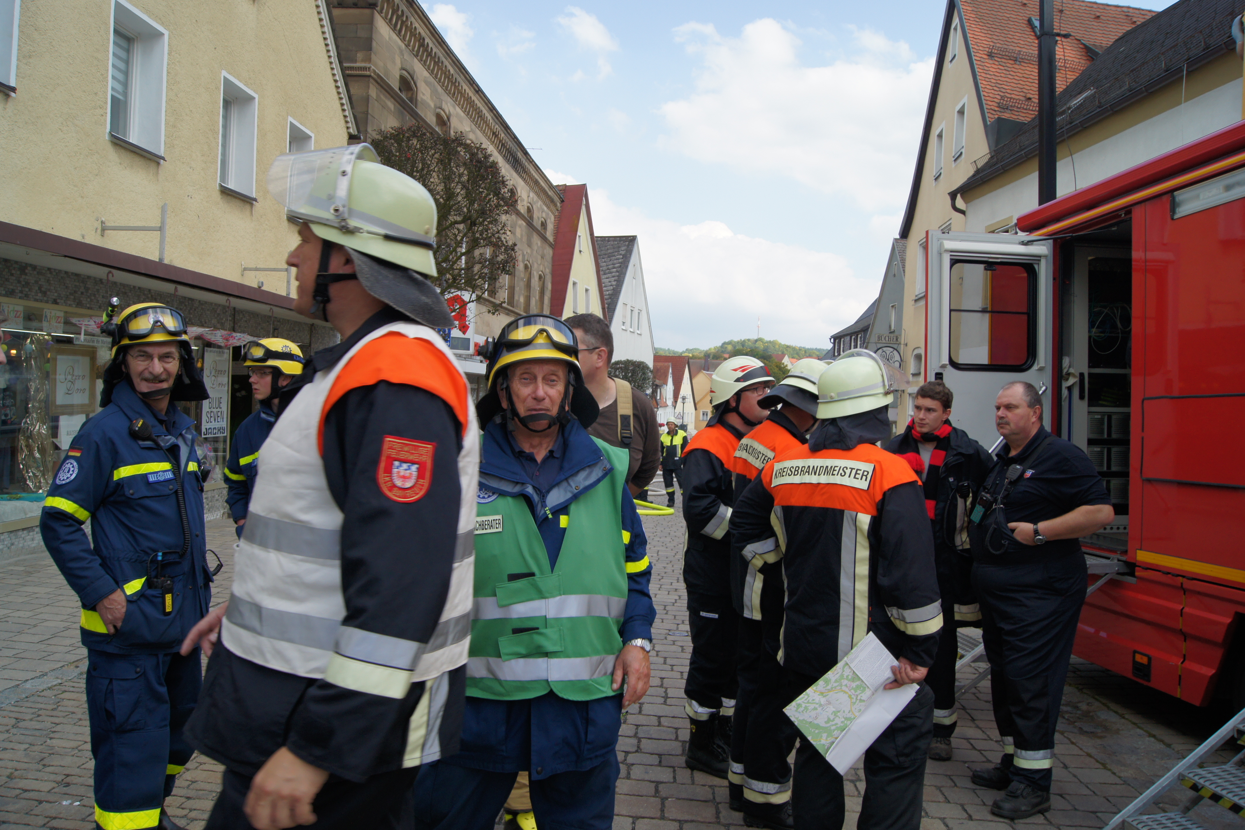 Begleitet von zahlreichen Zuschauern, setzte sich die Rettungskette rasch in Bewegung und arbeitete die fünf Einsatzabschnitte Menschenrettung, Brandbekämpfung, Löschwasserförderung, Bereitstellung und Verkehrsregelung zügig ab. Insgesamt galten acht Personen im Rathaus – unter ihnen Bürgermeister Uwe Raab – als eingeschlossen und vermisst, sie mussten von Atemschutzgeräteträgern gerettet werden. Bei dem Verkehrsunfall war man von zwei weiteren Verletzten ausgegangen, die ebenfalls von den Helfern des Bayerischen Roten Kreuzes ( BRK ) erstversorgt wurden. Auch der Fachberater des Technischen Hilfswerks, Rudi Unger, war an die Übungsstelle geeilt.