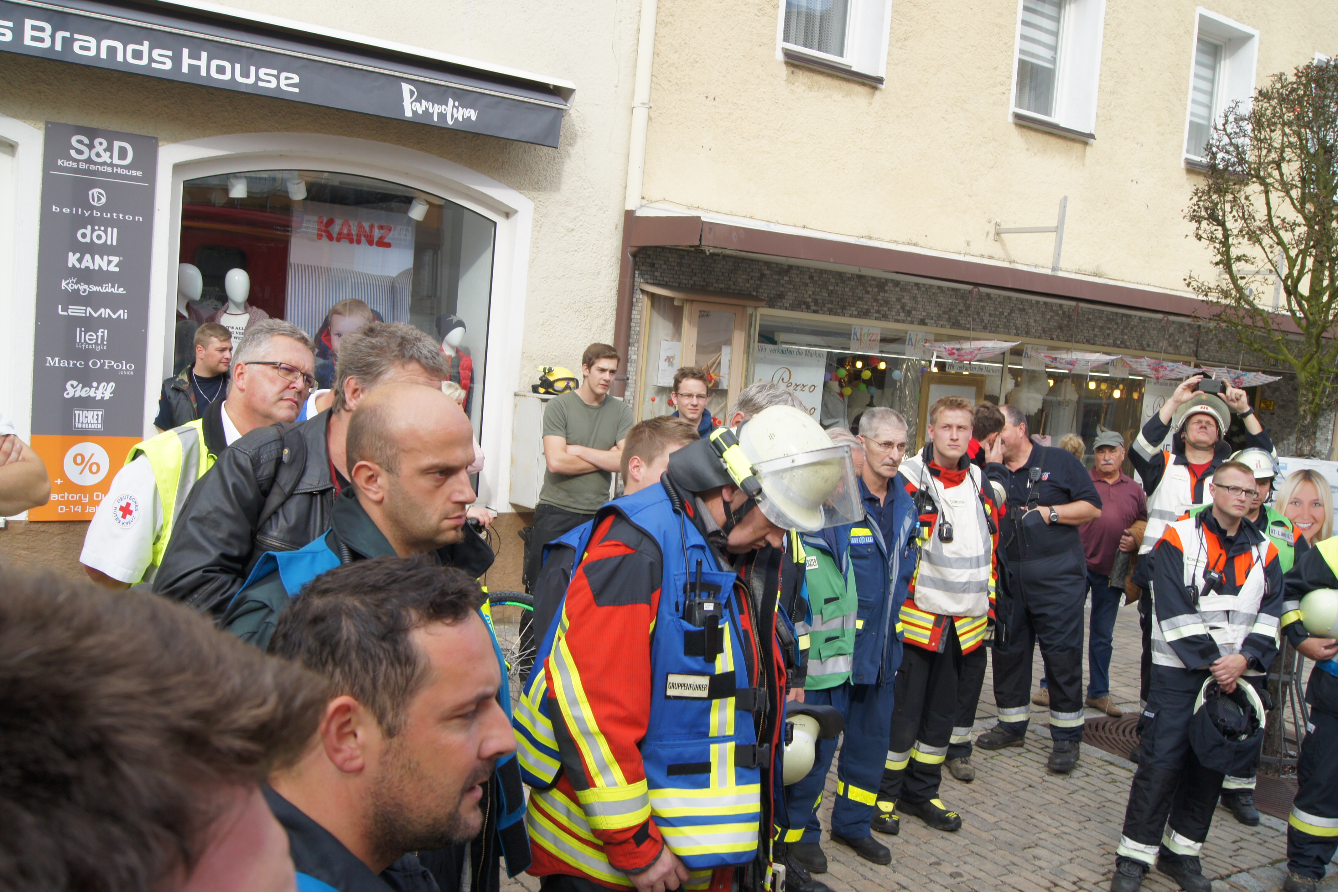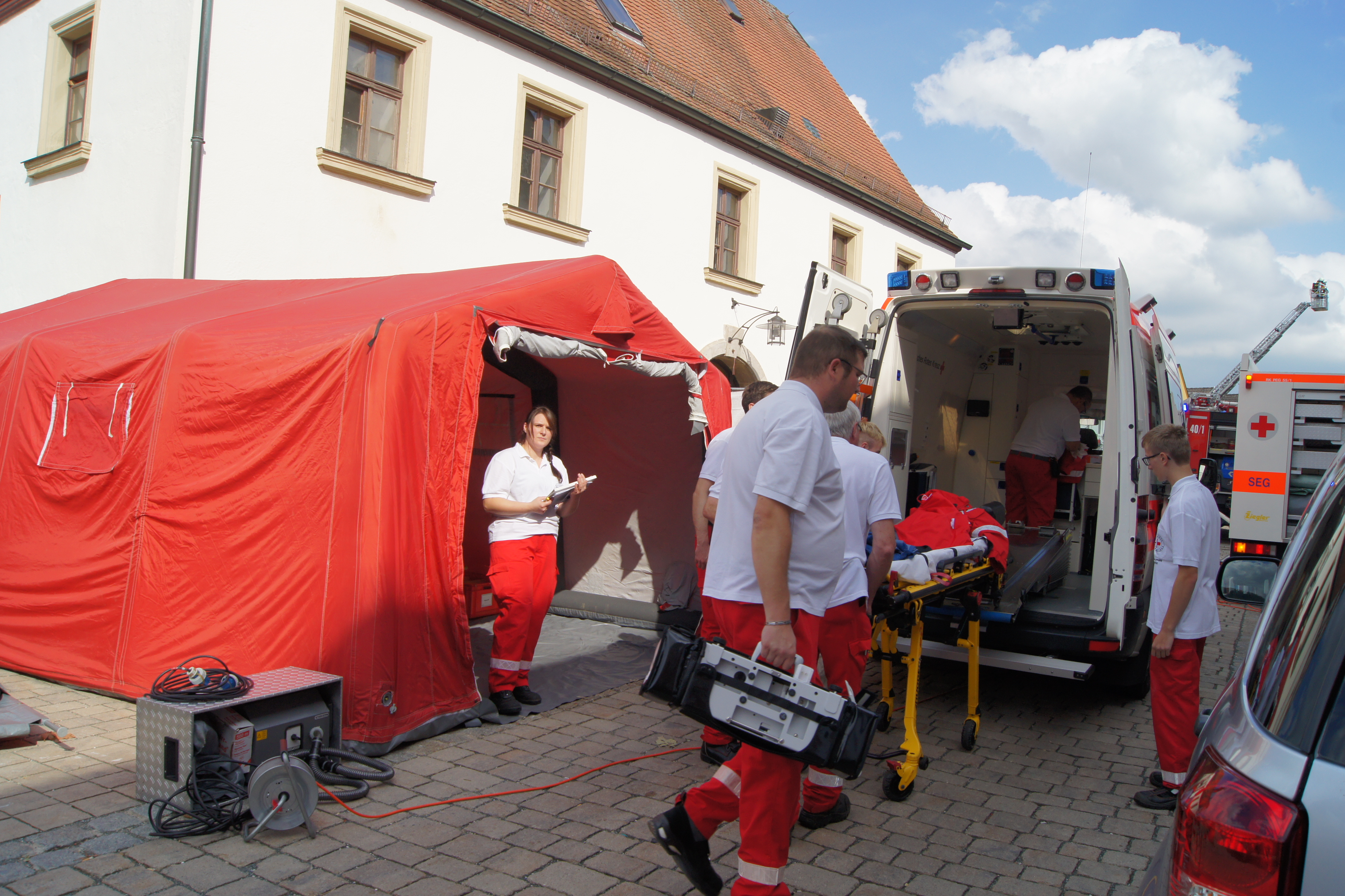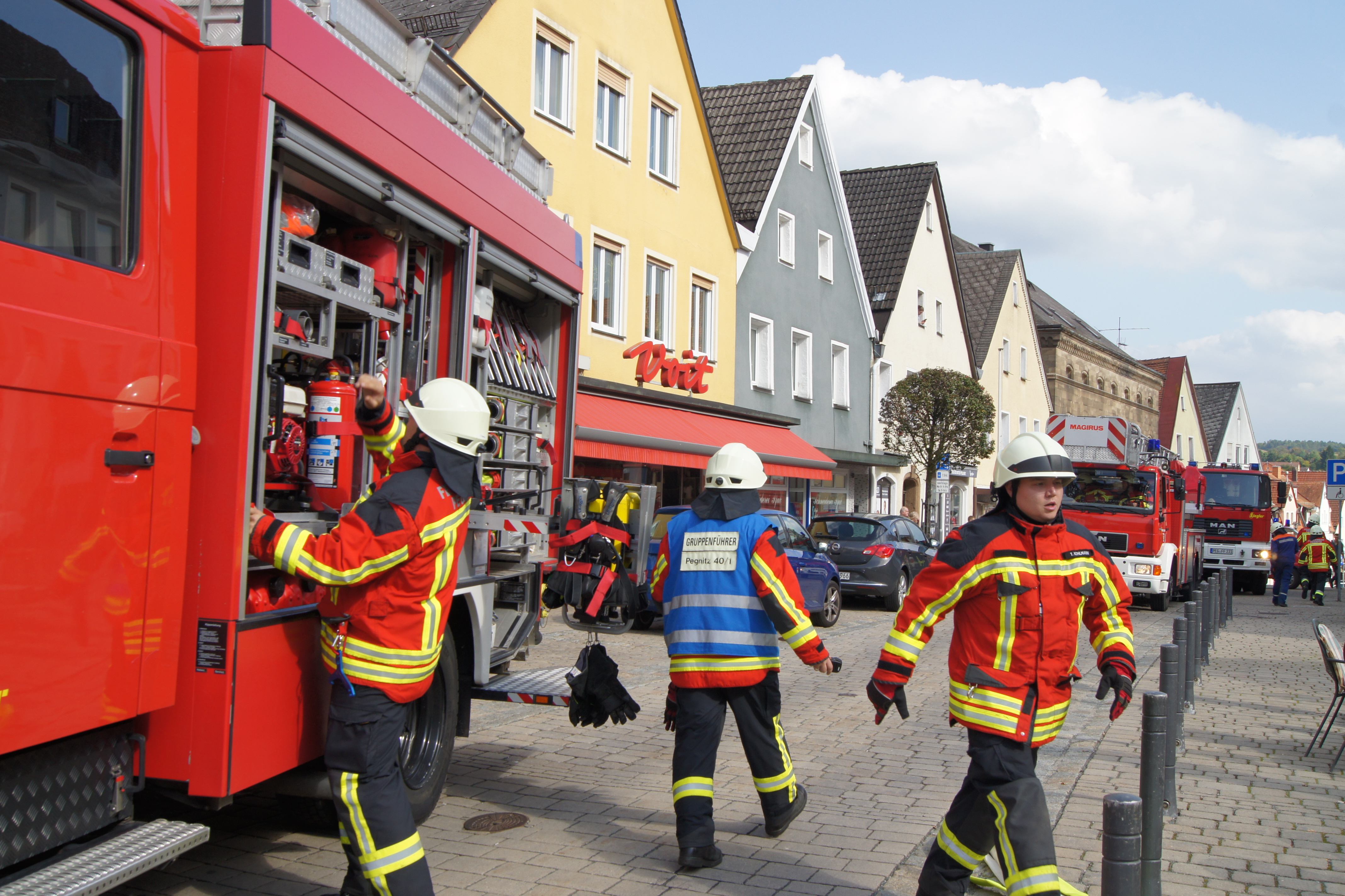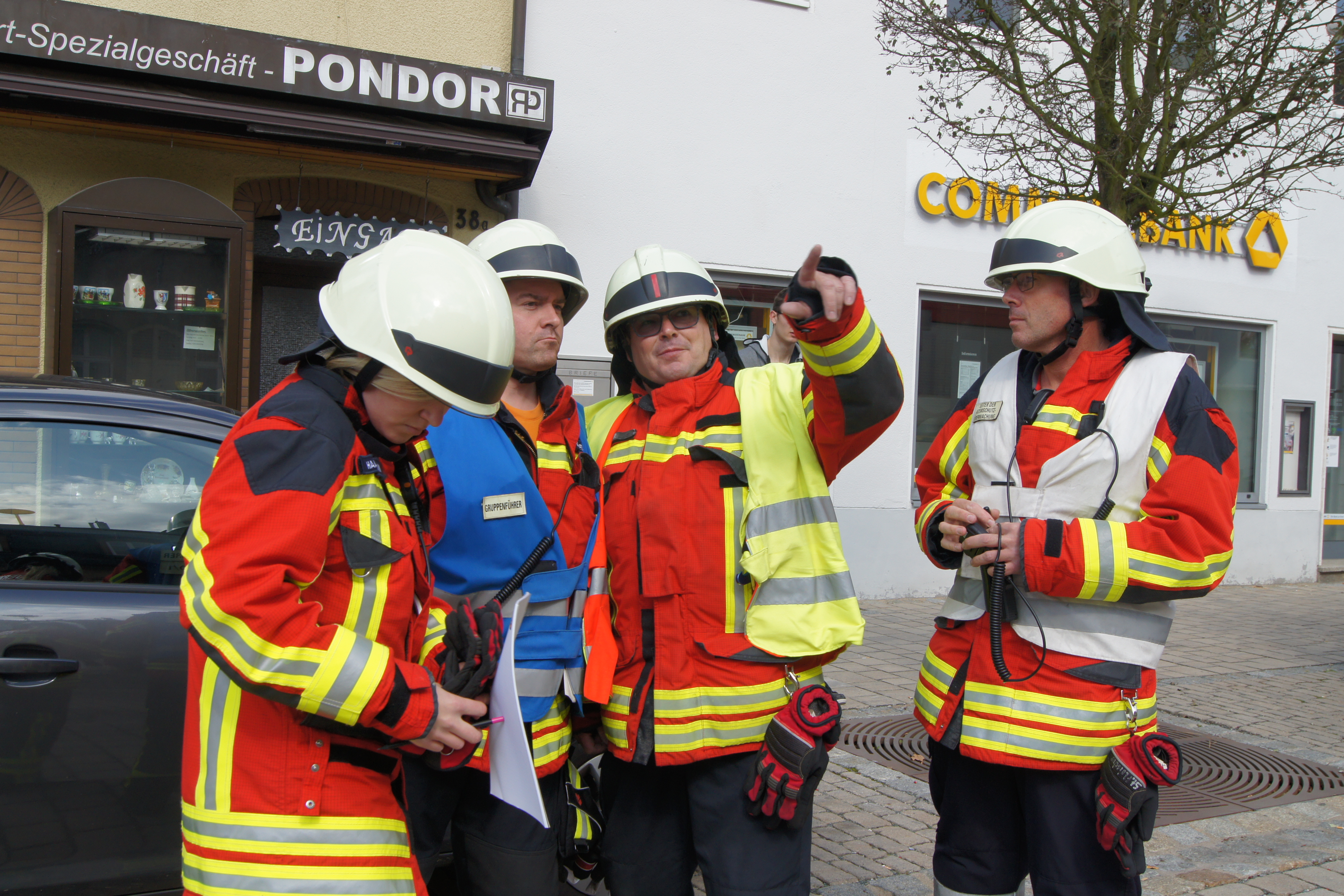 Begleitet von zahlreichen Zuschauern, setzte sich die Rettungskette rasch in Bewegung und arbeitete die fünf Einsatzabschnitte Menschenrettung, Brandbekämpfung, Löschwasserförderung, Bereitstellung und Verkehrsregelung zügig ab. Insgesamt galten acht Personen im Rathaus – unter ihnen Bürgermeister Uwe Raab – als eingeschlossen und vermisst, sie mussten von Atemschutzgeräteträgern gerettet werden. Bei dem Verkehrsunfall war man von zwei weiteren Verletzten ausgegangen, die ebenfalls von den Helfern des Bayerischen Roten Kreuzes ( BRK ) erstversorgt wurden. Auch der Fachberater des Technischen Hilfswerks, Rudi Unger, war an die Übungsstelle geeilt.