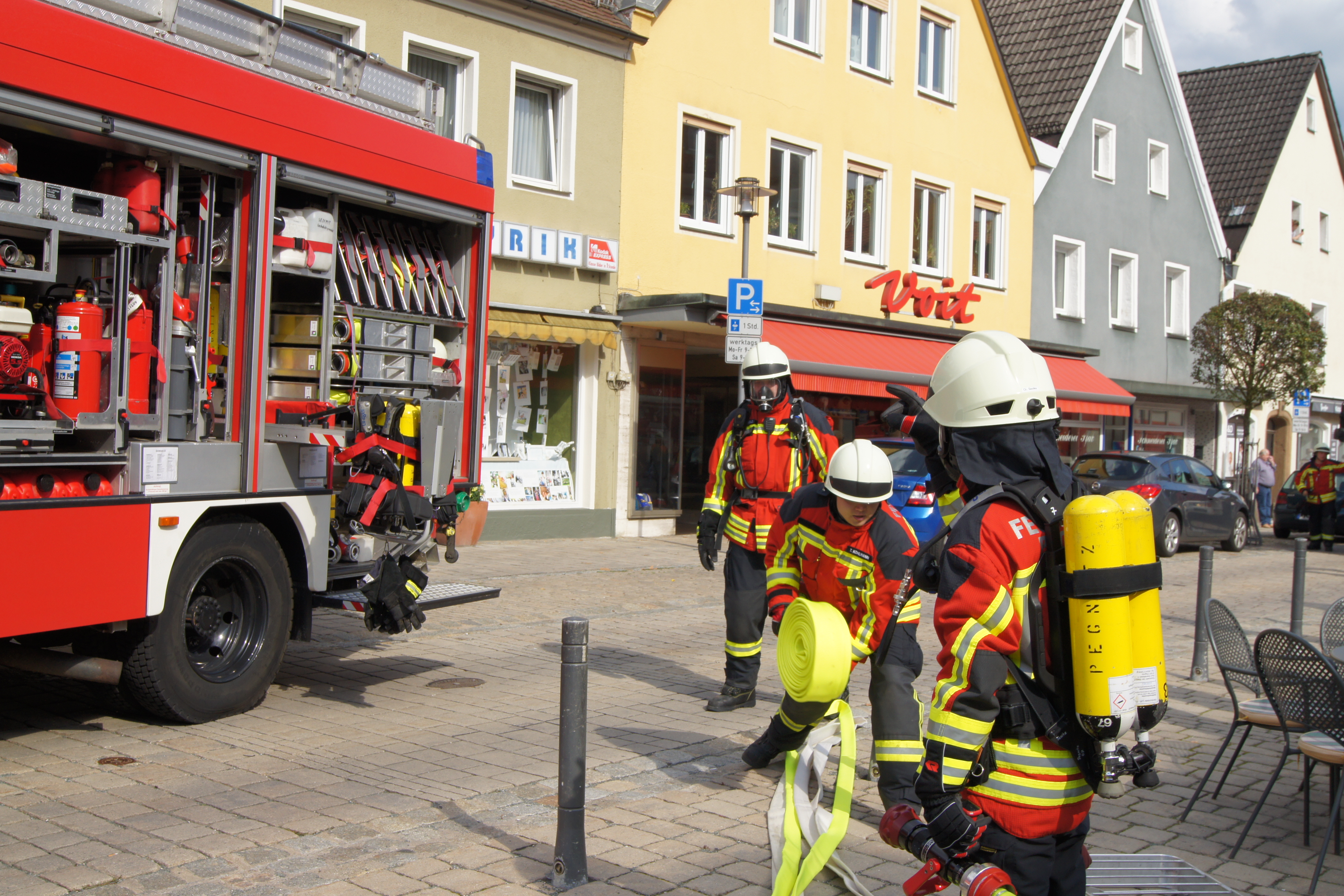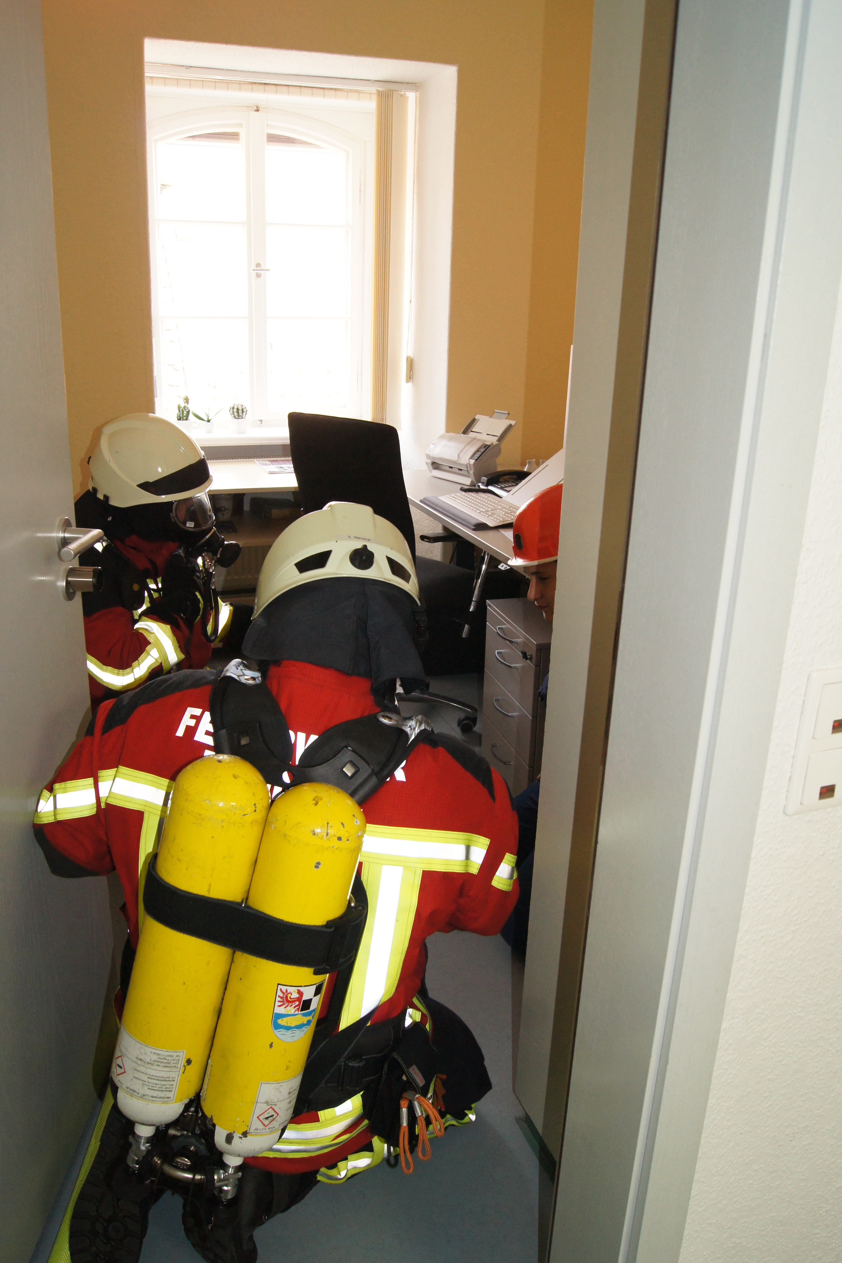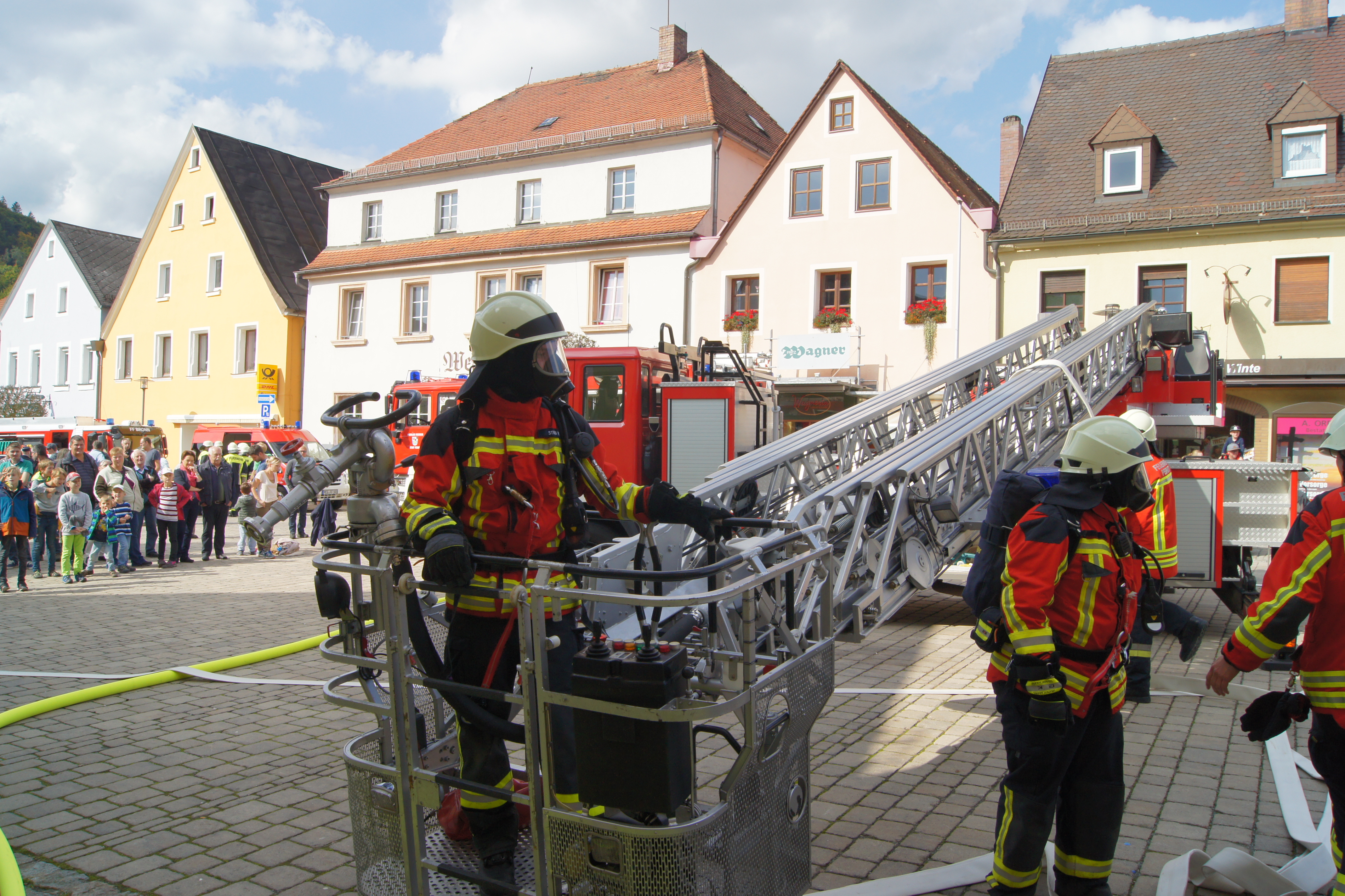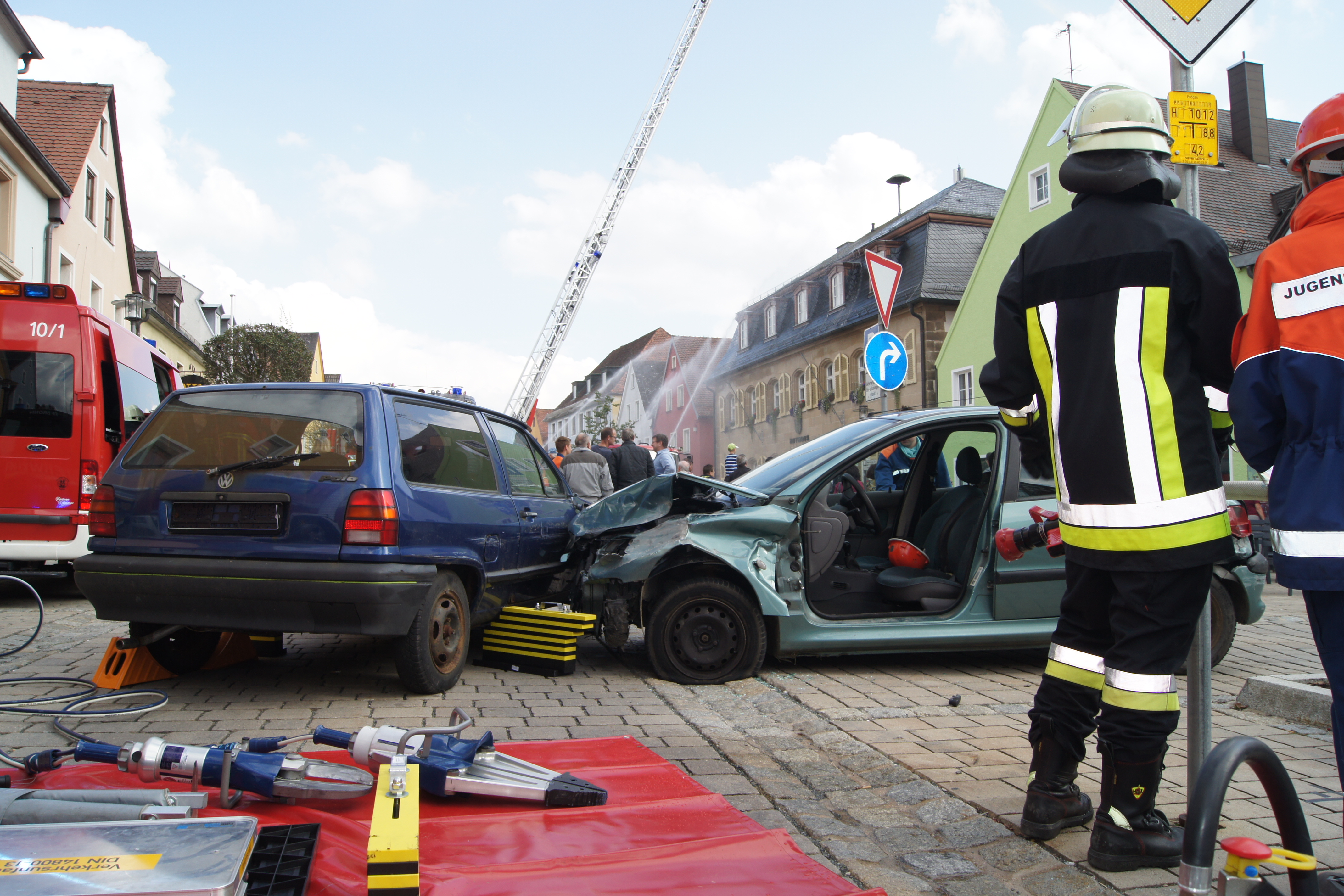 Begleitet von zahlreichen Zuschauern, setzte sich die Rettungskette rasch in Bewegung und arbeitete die fünf Einsatzabschnitte Menschenrettung, Brandbekämpfung, Löschwasserförderung, Bereitstellung und Verkehrsregelung zügig ab. Insgesamt galten acht Personen im Rathaus – unter ihnen Bürgermeister Uwe Raab – als eingeschlossen und vermisst, sie mussten von Atemschutzgeräteträgern gerettet werden. Bei dem Verkehrsunfall war man von zwei weiteren Verletzten ausgegangen, die ebenfalls von den Helfern des Bayerischen Roten Kreuzes ( BRK ) erstversorgt wurden. Auch der Fachberater des Technischen Hilfswerks, Rudi Unger, war an die Übungsstelle geeilt.