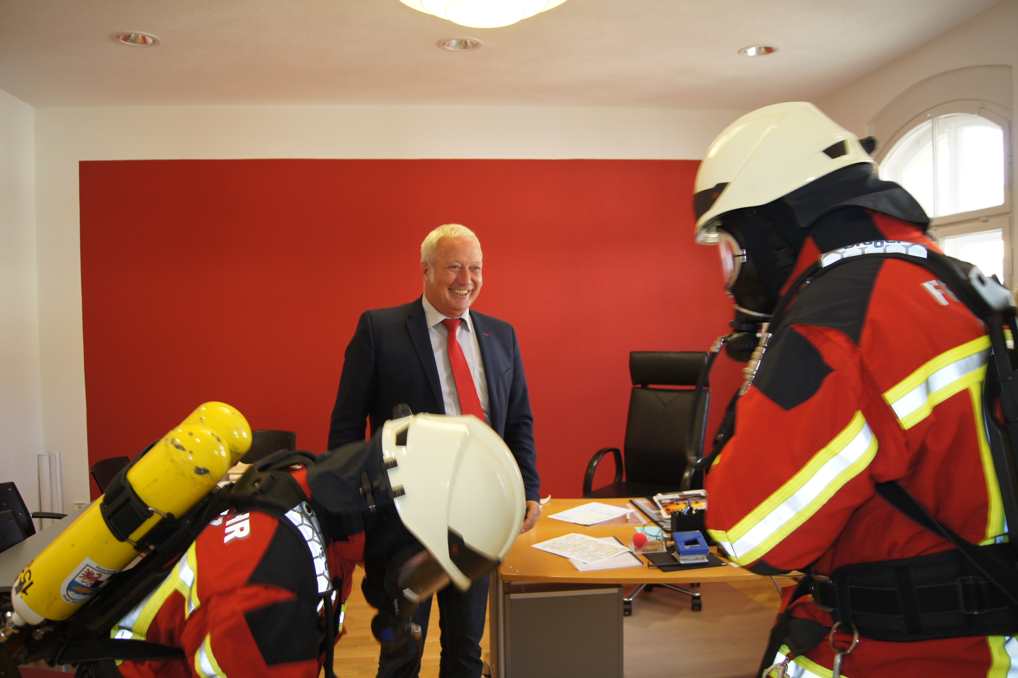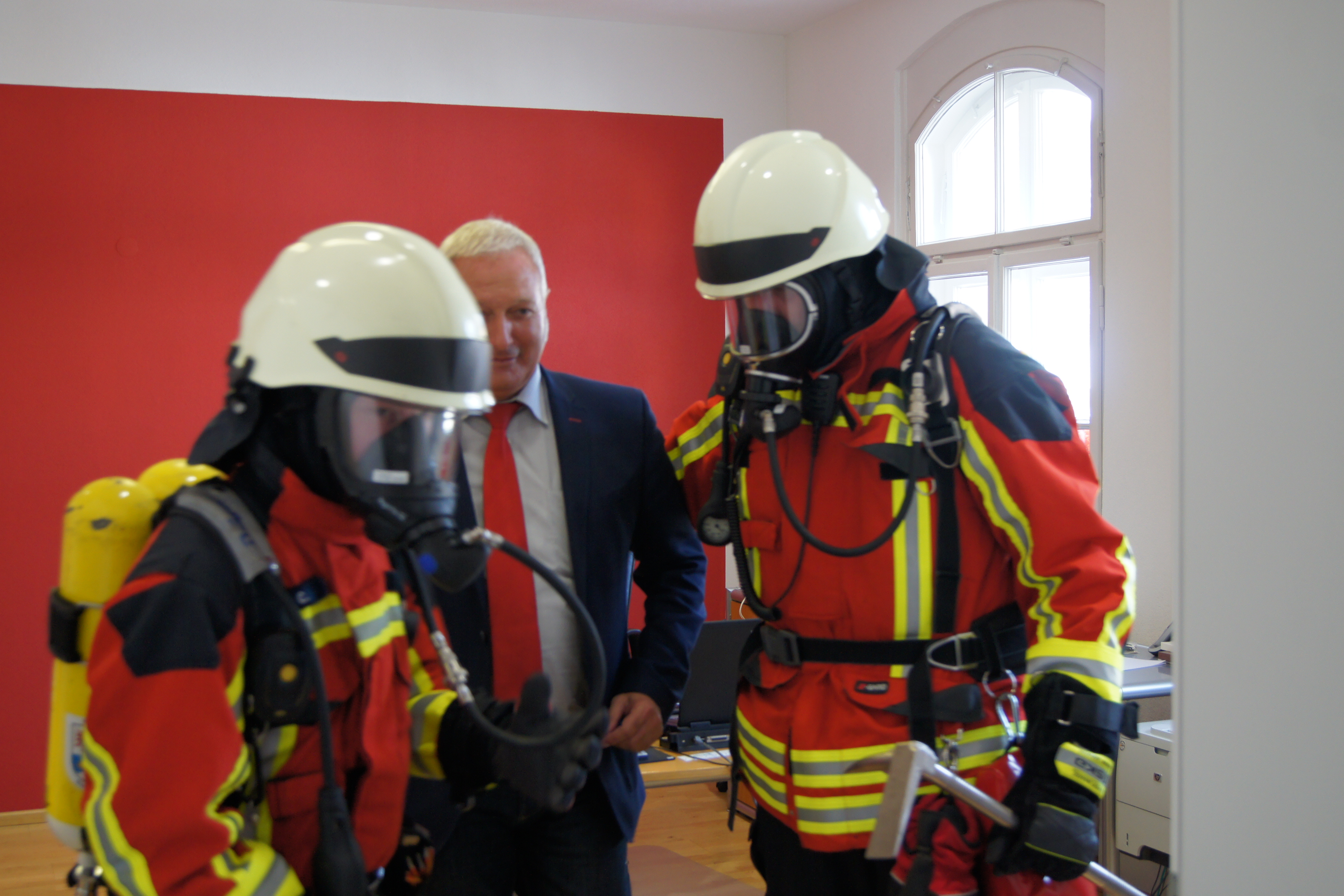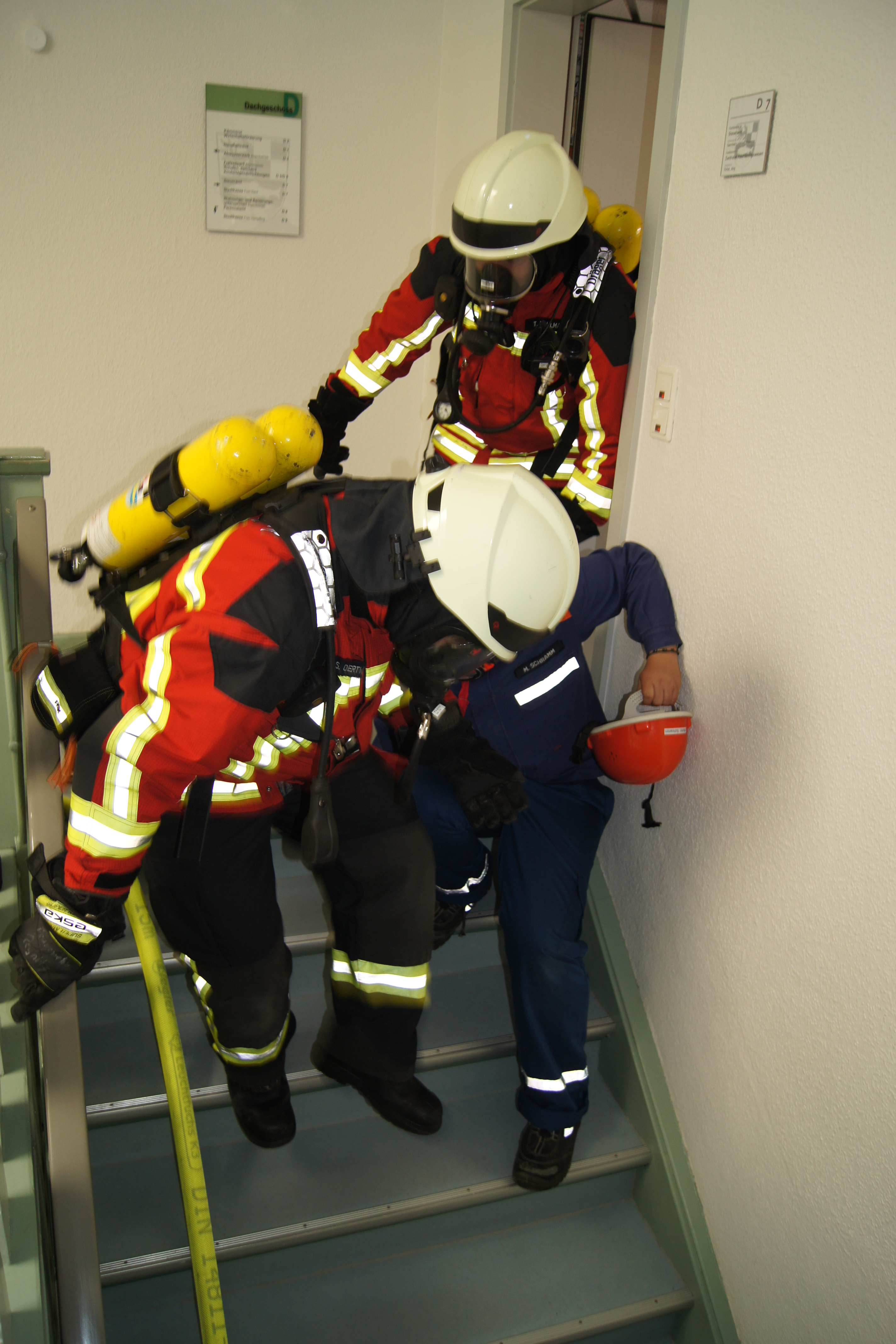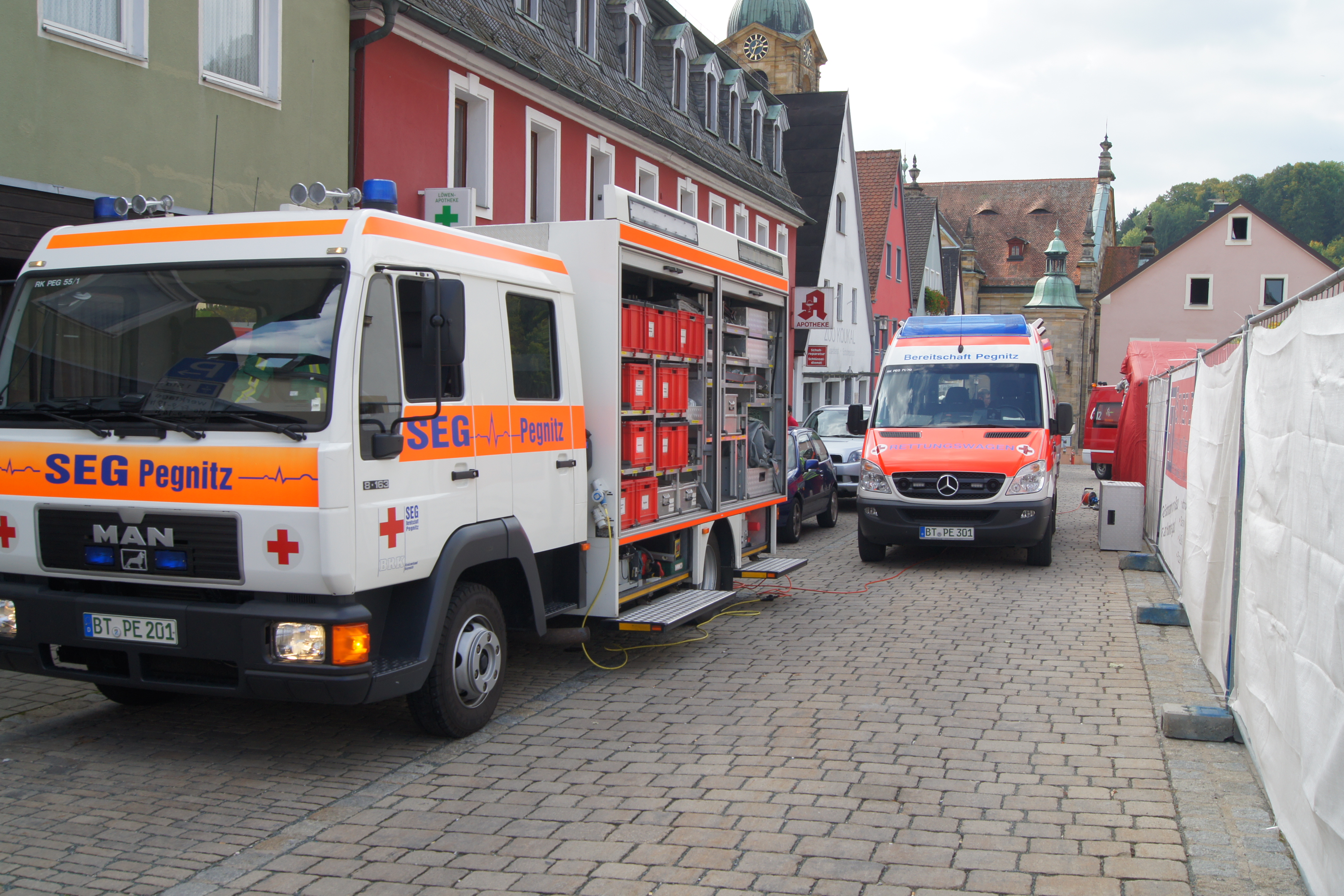 Begleitet von zahlreichen Zuschauern, setzte sich die Rettungskette rasch in Bewegung und arbeitete die fünf Einsatzabschnitte Menschenrettung, Brandbekämpfung, Löschwasserförderung, Bereitstellung und Verkehrsregelung zügig ab. Insgesamt galten acht Personen im Rathaus – unter ihnen Bürgermeister Uwe Raab – als eingeschlossen und vermisst, sie mussten von Atemschutzgeräteträgern gerettet werden. Bei dem Verkehrsunfall war man von zwei weiteren Verletzten ausgegangen, die ebenfalls von den Helfern des Bayerischen Roten Kreuzes ( BRK ) erstversorgt wurden. Auch der Fachberater des Technischen Hilfswerks, Rudi Unger, war an die Übungsstelle geeilt.