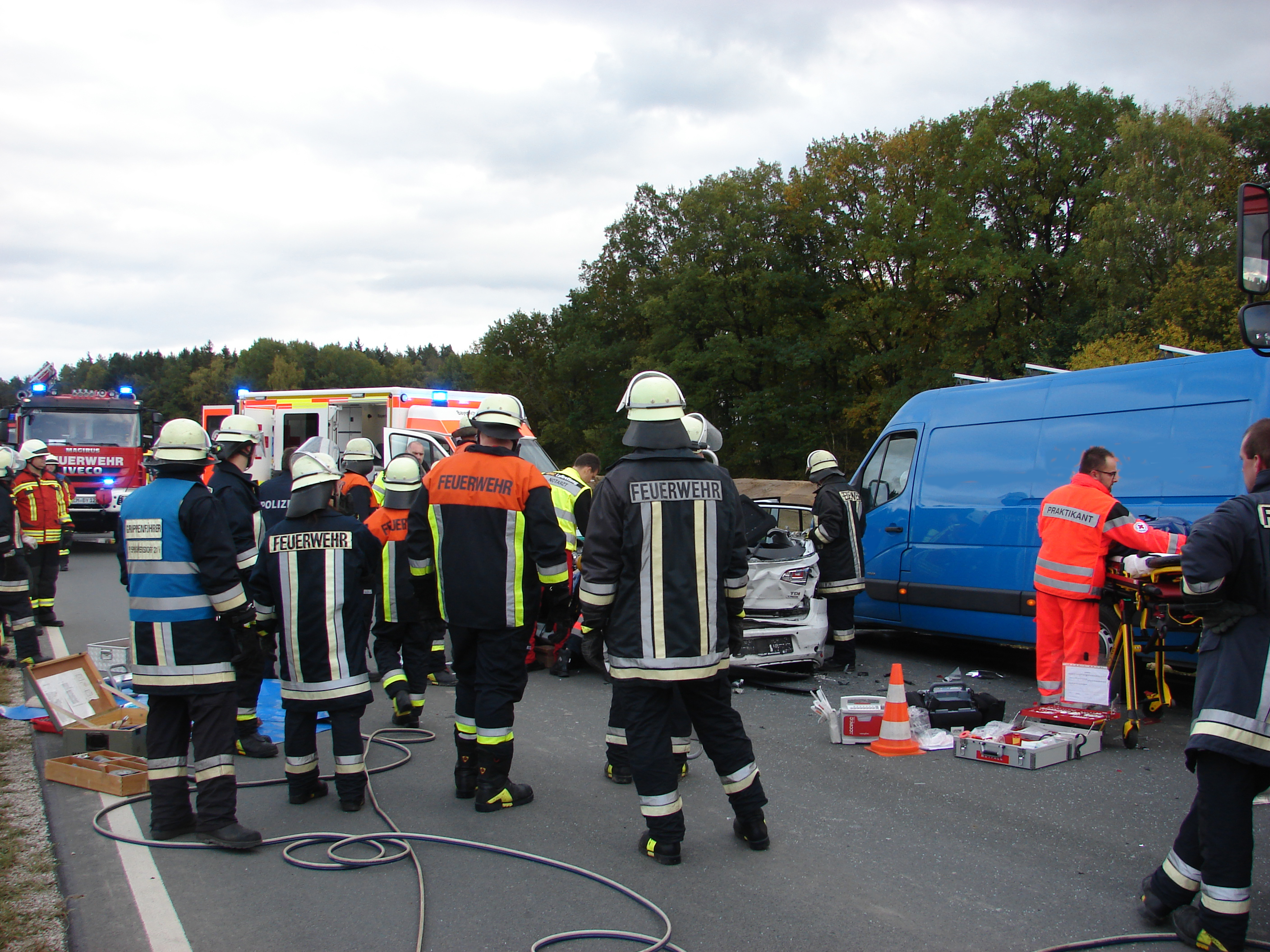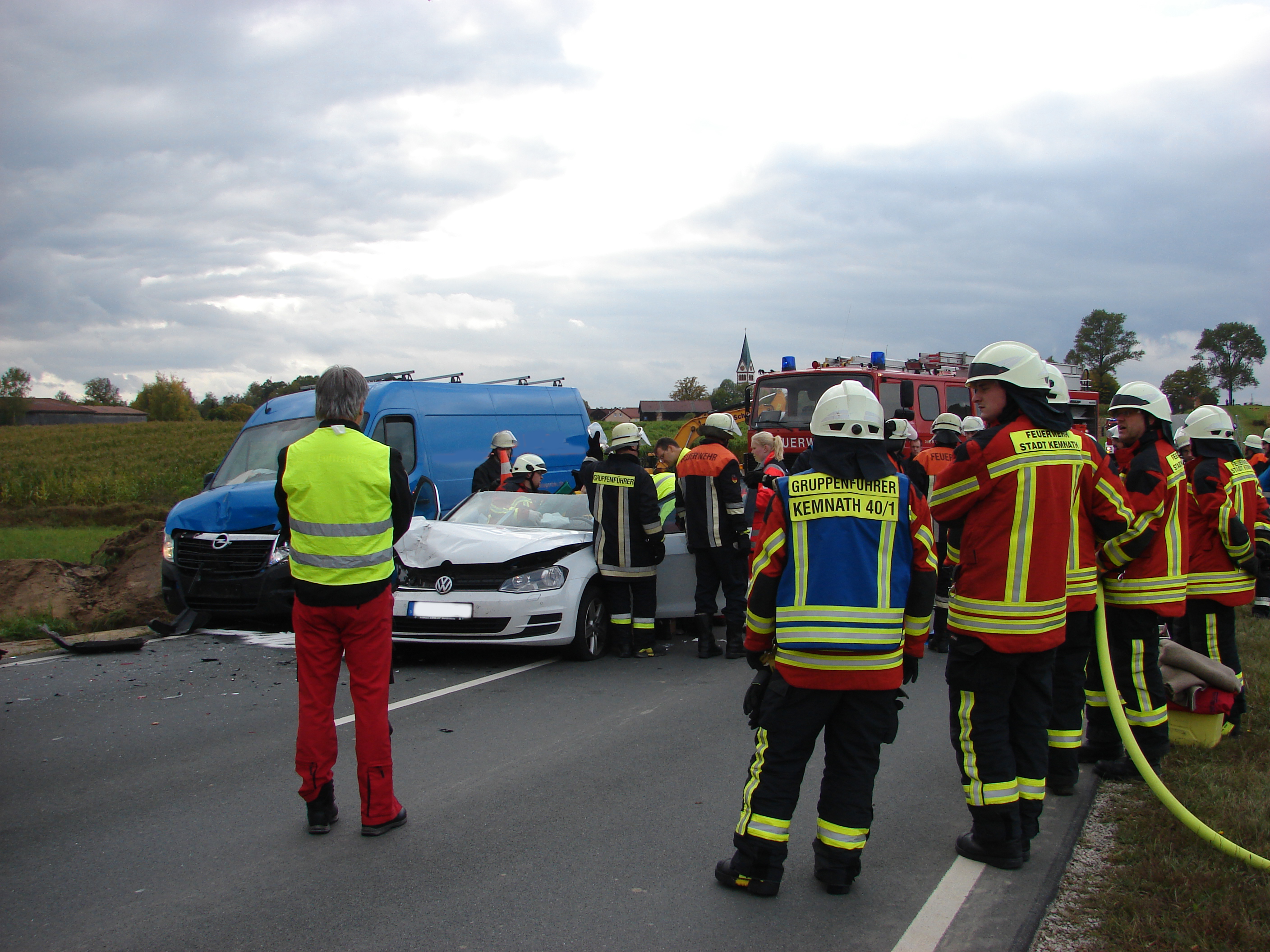 Die Rettungskräfte fanden drei Fahrzeuge im Baustellenbereich, hier wird zur Zeit ein Radweg gebaut, vor, die aufeinander gefahren waren. Laut Polizeiangaben fuhren zwei Autos langsam hinter einer Baumaschine, ein Fahrer eines Sprinters erkannte die Situation zu spät und fuhr auf einen VW Golf auf. Durch die Wucht wurde das Fahrzeug auf das vorausfahrende Kfz aufgeschoben. Der Golffahrer wurde durch den Aufprall so stark verletzt, dass er über massive Rückenschmerzen klagte. Unter der Leitung des Notarztes, der mit dem Rettungshubschrauber eingeflogen wurde, wurde er patientengerecht befreit. Dies bedeutete, dass das Dach des Fahrzeuges entfernt wurde und der Verunfallte mit Hilfe einer Schaufeltrage aus dem Auto geborgen wurde. Er wurde schwerverletzt ins Krankenhaus gefahren. Die beiden anderen Unfallbeteiligten wurden ebenfalls verletzt.