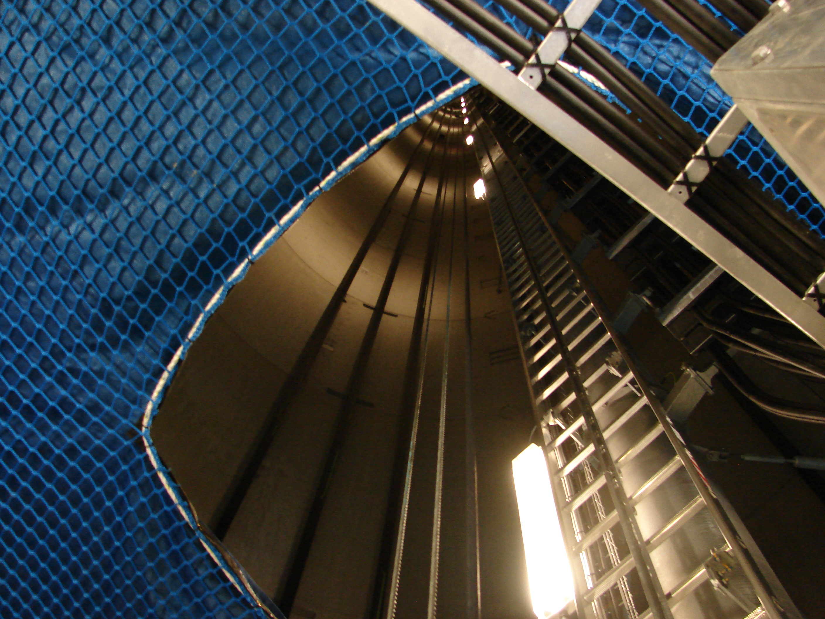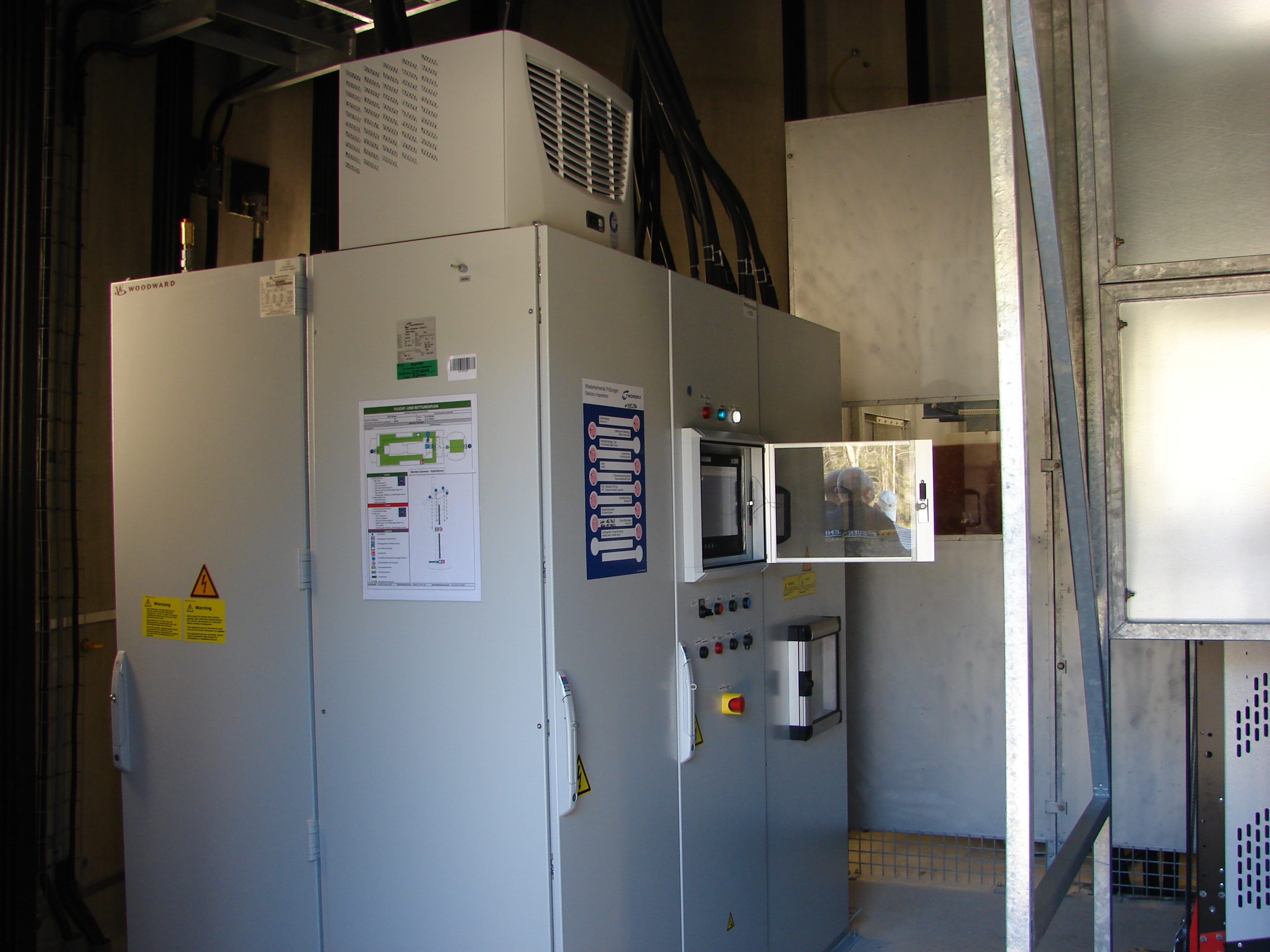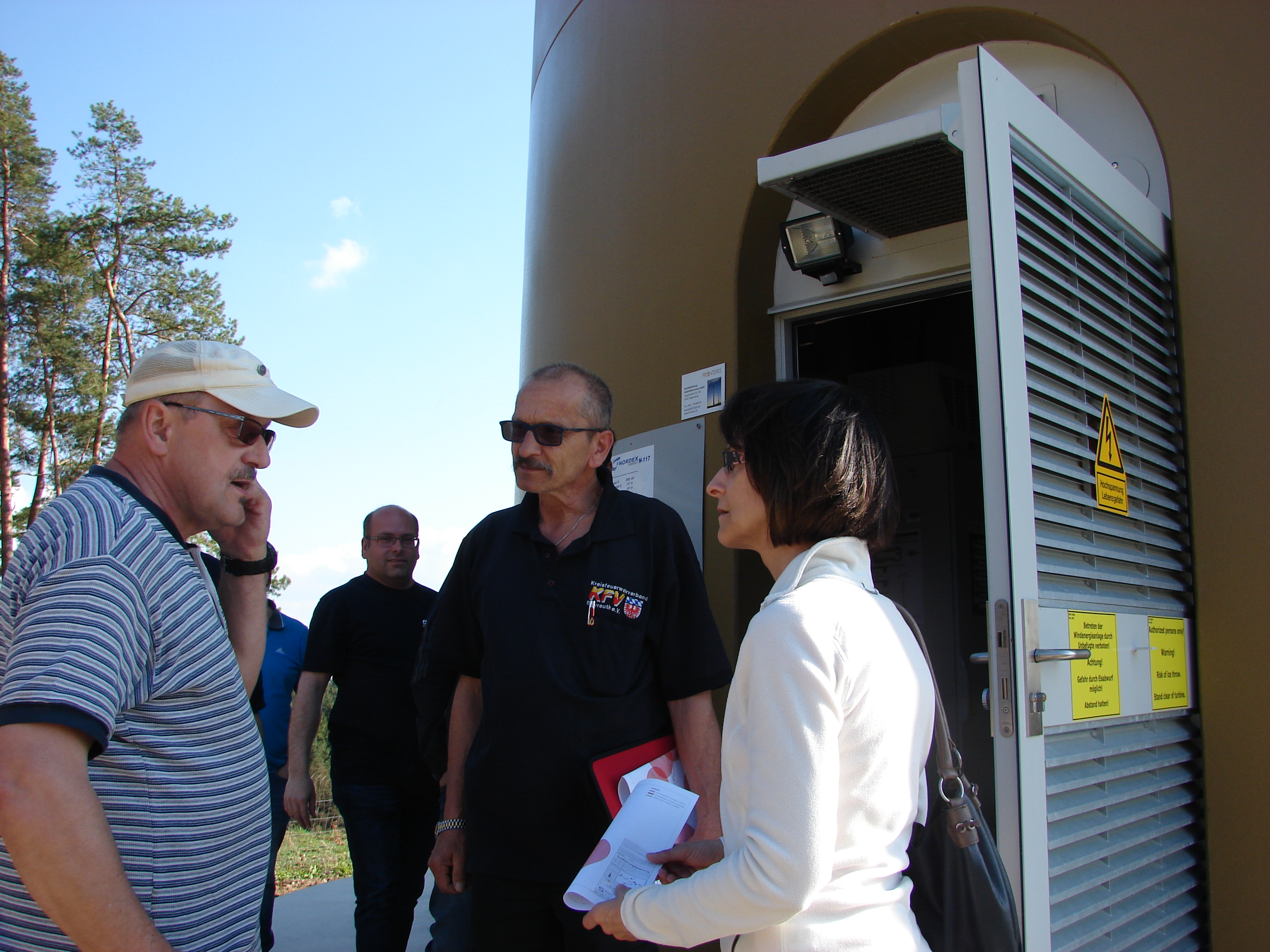 Herr Teuber und Herr Riedel vom Betreiber Fronteris mit Sitz in Regensburg, erklärten den Führungskräften, dass bei einem Brandfall der Gondel ein Löschen unmöglich ist. Die Arbeit der Feuerwehr beschränkt sich auf das weiträumige Absperren, hierzu wurde den Feuerwehren ein Plan übergeben. Anders sieht es bei einem Unfall von einem Techniker, die immer zu zweit anwesend sind, aus. Hier wird von der Leitstelle das Höhenrettungsteam der Berufsfeuerwehr Nürnberg alarmiert. Zudem sind in der Winderergieanlage 3 zwei persönliche Schutzausrüstungen deponiert, vor allem für dem Notarzt, der keine Höhenrettungsausrüstung mitführt. In die Maschinengondel gelangt man mit Hilfe eines abgespeckten Aufzug, der für zwei Personen Platz bietet. Die letzten zehn Meter muss man zu Fuß aufsteigen, bis man in über 140m Höhe den Maschienenraum erreicht hat.