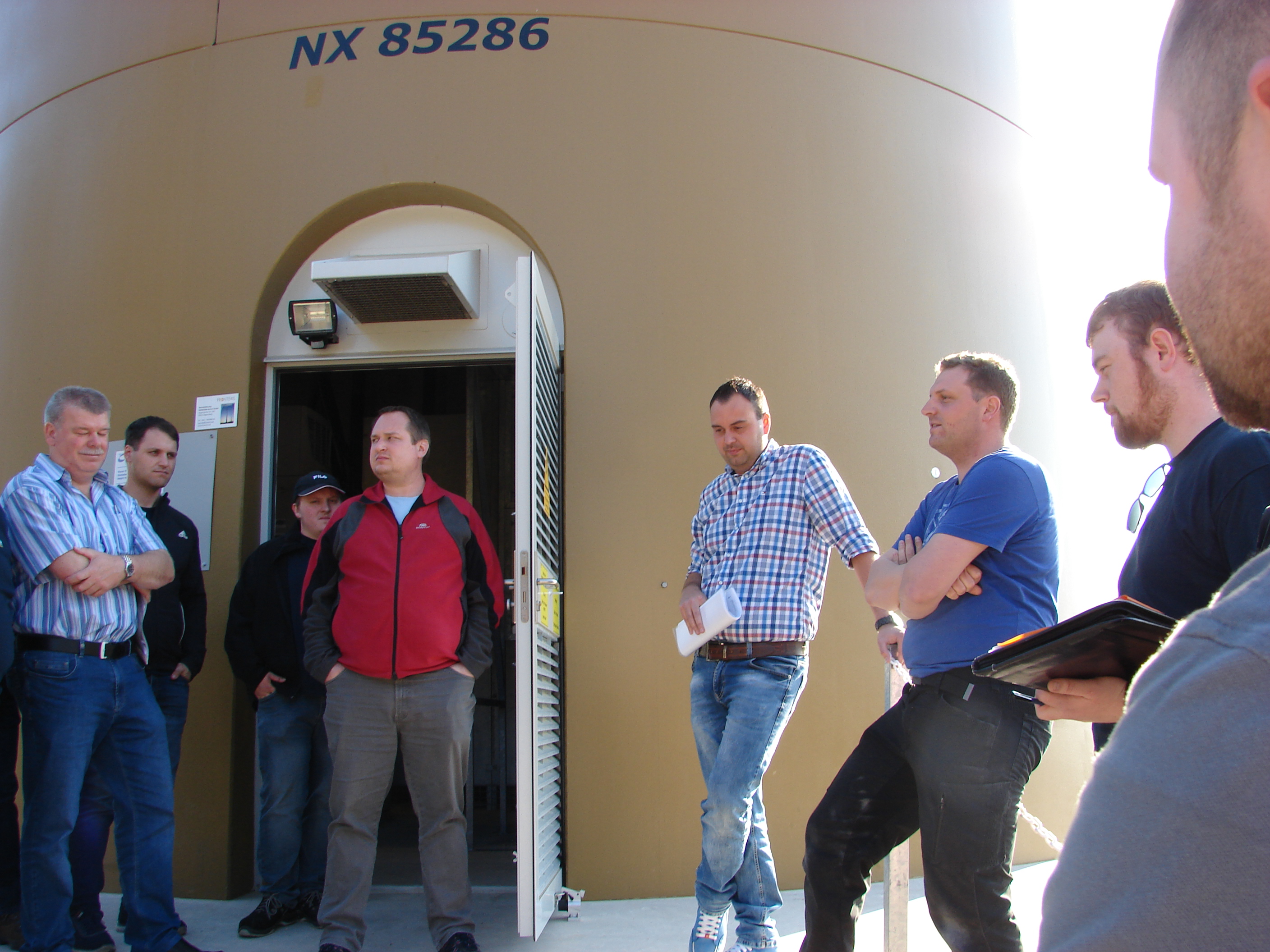 Sollte in einem Unglücksfall Öl aus dem Getriebe auslaufen, so wird dies im hermetisch abgeschlossenen Maschinenraum aufgefangen, zudem ist der untere Schaltraum gegen austretendes Öl gesichert. Alle Anlagen werden vom Betreiber und vom Hersteller Nordex überwacht, um Störungen frühzeitig zu erkennen. Die beiden Referenten gingen auch auf die Konstruktion der Anlagen ein und erklärten den interessierten Kräften, warum die Anlagen zu bestimmten Zeiten nicht laufen. Hier handelt es sich meist um Auflagen von den Genemigungsbehörden, so soll verhindert werden, das übermässiger Schadenwurf die Anwohner stört, aber auch Vogelflugzeiten, Dämmerung, werden berücksichtigt. Bei Wartungssarbeiten werden die Anlagen auch abgeschaltet. In der Hoffnung, dass man sich bei keinem Einsatz wieder trifft, verabschiedeten sich die beiden Techniker.