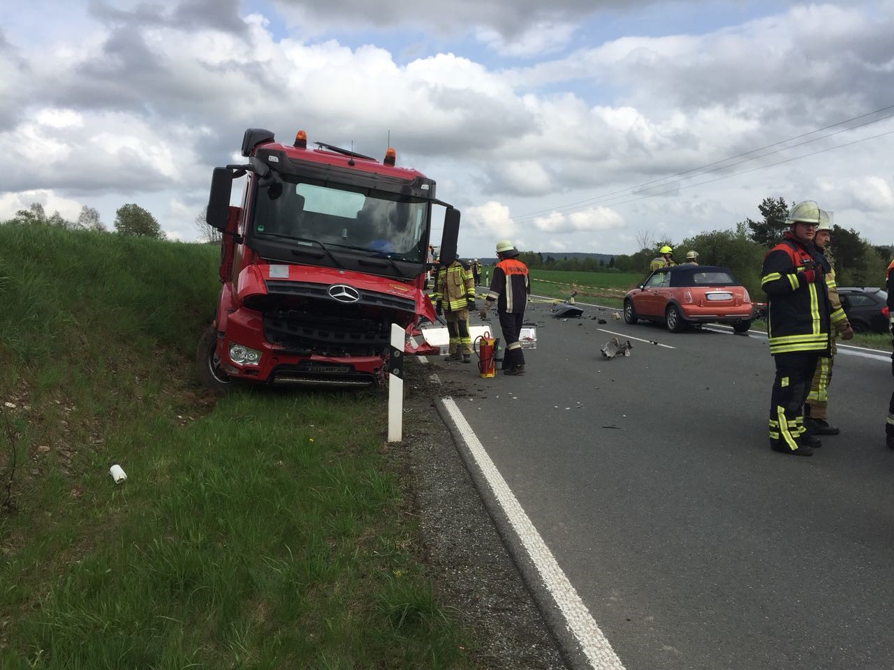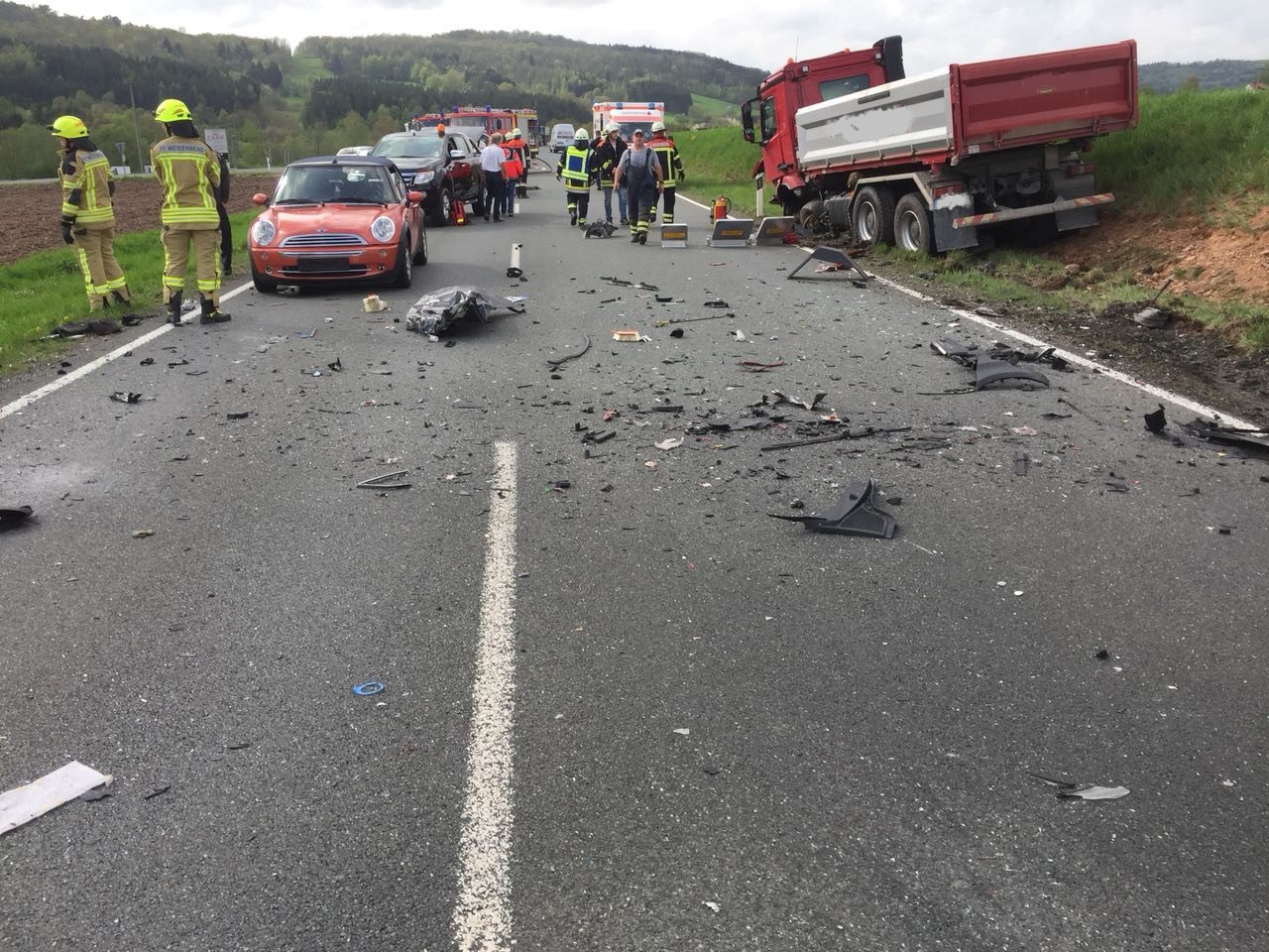 Kurz nach 16 Uhr war der 34 Jahre alte Mann aus dem Landkreis Bayreuth mit seinem Skoda von Bayreuth in Richtung Weidenberg unterwegs. Kurz nach der Abzweigung zum dortigen Betonwerk wechselte er nach links auf die Gegenfahrbahn und kollidierte mit dem entgegenkommenden Lastwagen. Dessen 49-jähriger Fahrer konnte nicht mehr ausweichen und es kam zum Frontalzusammenstoß. Der 34-jährige Autofahrer erlitt schwerste Verletzungen. Eine Ersthelferin rettete den Schwerverletzten aus seinem völlig demolierten Fahrzeug und begann mit Erste-Hilfe Maßnahmen. Ein mit dem Rettungshubschrauber zum Unfallort gebrachter Notarzt führte die Reanimationsmaßnahmen fort. Allerdings starb der Autofahrer noch an der Unfallstelle an seinen schwersten Verletzungen. Der Lastwagenfahrer aus dem Landkreis Kulmbach kam mit leichteren Verletzungen und einem Schock in ein Krankenhaus. In das Trümmerfeld an der Unfallstelle fuhr noch ein nachfolgendes Fahrzeug und wurde dadurch im Frontbereich beschädigt.