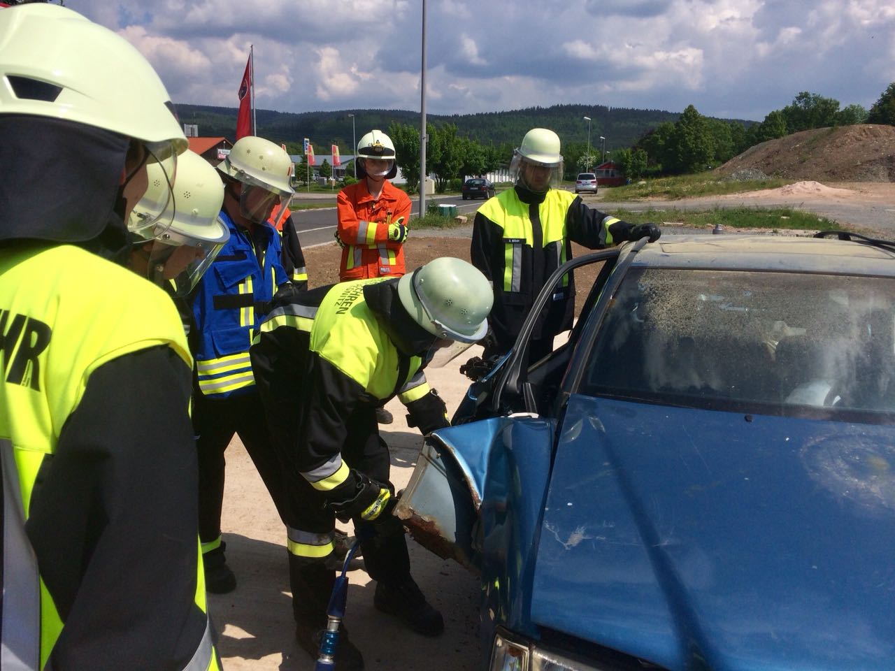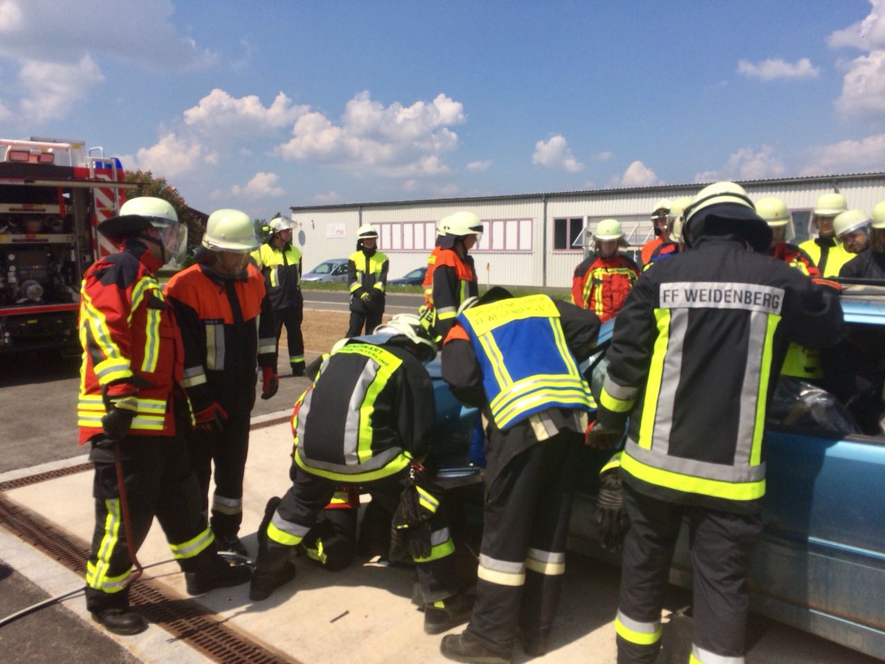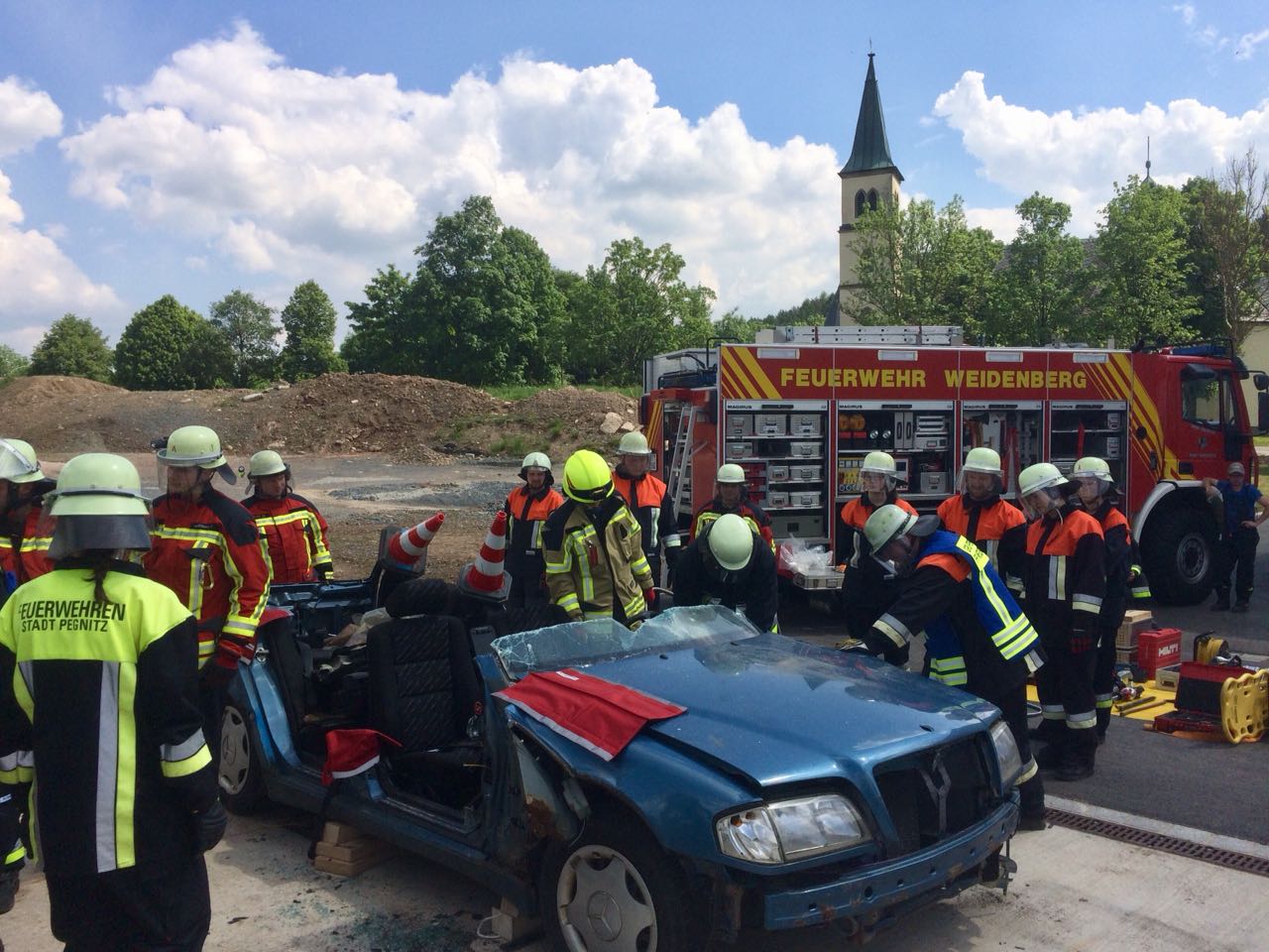 Insgesamt 30 Teilnehmer aus den Freiwilligen Feuerwehren Bad Berneck, Bronn, Hollfeld, Mistelbach, Trockau, Troschenreuth, Unterlind, Waischenfeld, Weidenberg und Zeulenreuth besuchten am 12.05.2018 den Lehrgang Schneide- und Spreiztechnik der Ausbildungsinspektion des Landkreises Bayreuth. Nach der theoretischen Unterweisung am Vormittag erfolgte am Nachmittag der Praxisteil. Auch die neuen Antriebsarten, Kennzeichenabfrage und das sogenannte „e-call“ waren dabei Themenpunkte. Das Übungsfahrzeug wurde mit den Rettungsgeräten des Rüstwagens aus Weidenberg und dem Hilfeleistungslöschgruppenfahrzeug 10 aus Bronn zerlegt. Die Abarbeitung erfolgte in aller Ruhe, so dass auch jeder die Möglichkeit hatte, die Rettungsgeräte zu bedienen. Während der Mittagspause bekamen die Teilnehmer eine sehr beeindruckende Führung durch das neue Gerätehaus. Ganz herzlichen Dank gilt der FF Weidenberg für die „rund-um-sorglos“-Organisation und Verpflegung. Auch die beiden Kommandanten Heinrich Schmidt und Marco Kießling begrüßten die Teilnehmer und machten sich ein Bild von dem Ausbildungstag.