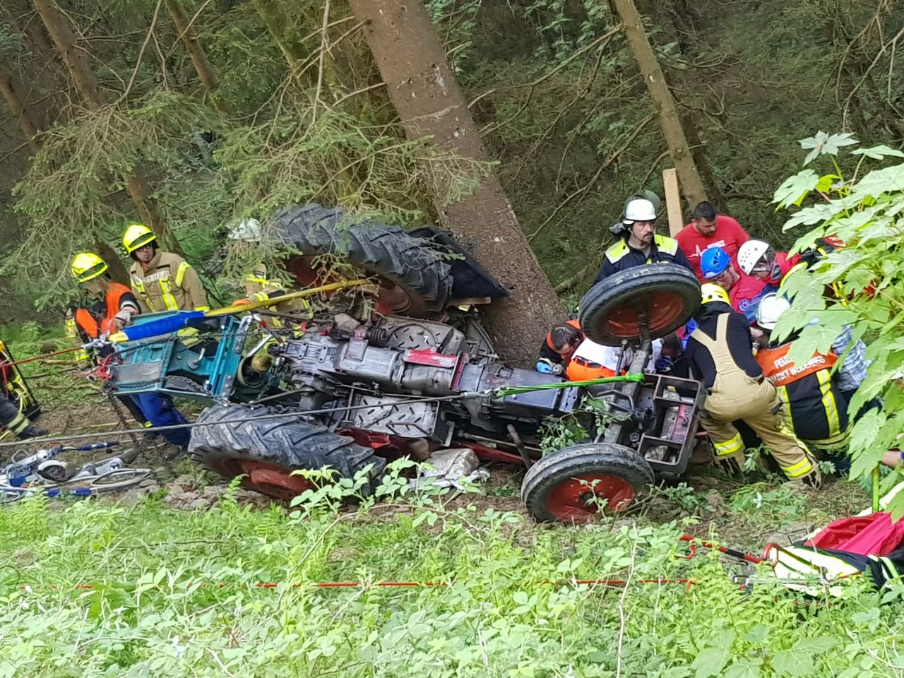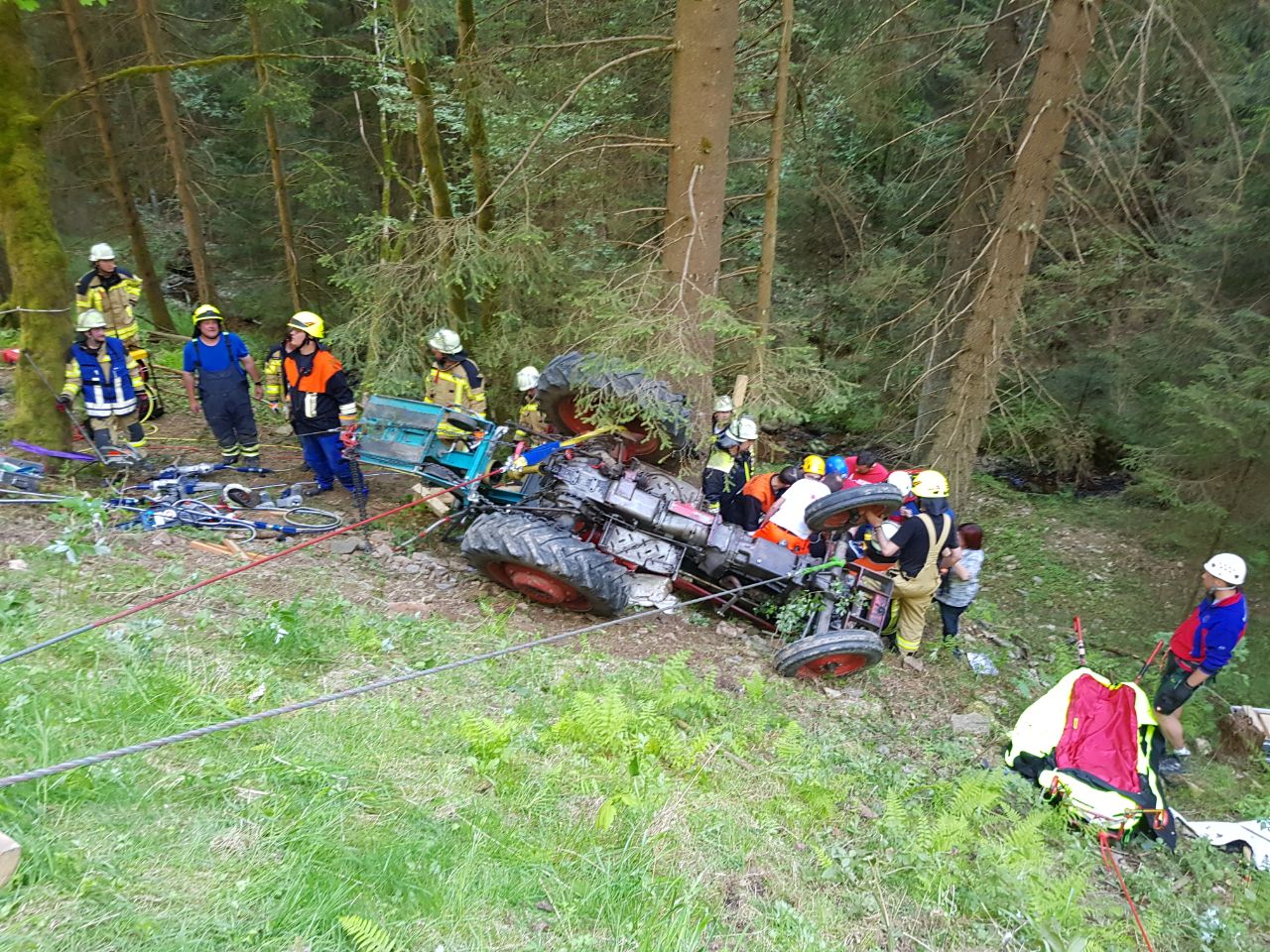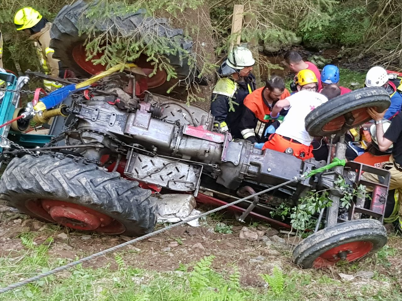 Die Rettungsmaßnahmen gestalteten sich aufgrund der Lage des Fahrzeuges, der Traktor lag auf dem Dach, des unter dem Traktor eingeklemmten Fahrers und der Zugänglichkeit über einesteile Böschung mit steinigem Waldboden als schwierig. Um einen sicheren Zugang zum Patienten zu ermöglichen, entschied sich der Einsatzleiter, Warmensteinachs Kommandant Philipp Wanninger, die steile Böschung mittels Steckleiter und Feuerwehrleine zu überwinden. Des Weiteren wurde der Traktor mittels Seilwinde und Umlenkrolle (HLF 20 Warmensteinach – Fixpunkt hintere Achse d. Traktors) und zwei Greifzügen (Feuerwehr Weidenberg – Fixpunkt Vorderachse und Anbaugerät (Holzspalter des Traktors) gesichert. Die Stabilisierung der Zugmaschine erfolgte mittels Hebekissen und Unterbaumaterial. Nun konnte die Rettung des Patienten erfolgen. Hierfür wurde zunächst das Lenkrad des Traktors mittels Pedalschneider entfernt und versucht den rechten Kotflügel durch die Rettungsschere einzuschneiden. Während dieser Tätigkeiten wurde der Patient durch das BRK und einen Notarzt medizinisch versorgt. Schließlich konnte der Traktor durch die bereits angebrachten Zugwinden Richtung Fahrbahn gekippt werden und die patientengerechte Befreiung des Patienten erfolgen. Diese Maßnahme erwies sich als erfolgreich und die verletzte Person konnte der Bergwacht übergeben werden.