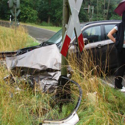 Die ersten Rettungskräfte fanden direkt beim Bahnübergang einen BMW-Kombi liegen. Dieser war im Frontbereich völlig zerstört. Der Fahrzeugführer war bereits selbständig, unverletzt aus den PKW ausgestiegen. Der Autofahrer konnte sein Fahrzeug, trotz Blinklicht des Bahnüberganges nicht mehr rechtzeitig zum Stehen bringen. Der BMW wurde daraufhin im Frontbereich vom Zug erfasst, obwohl der Zugführer noch eine Vollbremsung auslöste. Glücklicherweise wurde bei diesem Bremsmanöver niemand im Zug verletzt. Der Zug konnte trotz Beschädigung des Triebkopfes seine Fahrt, nachdem der Zugführer routinemäßig ausgewechselt wurde, nach Bayreuth fortsetzen.