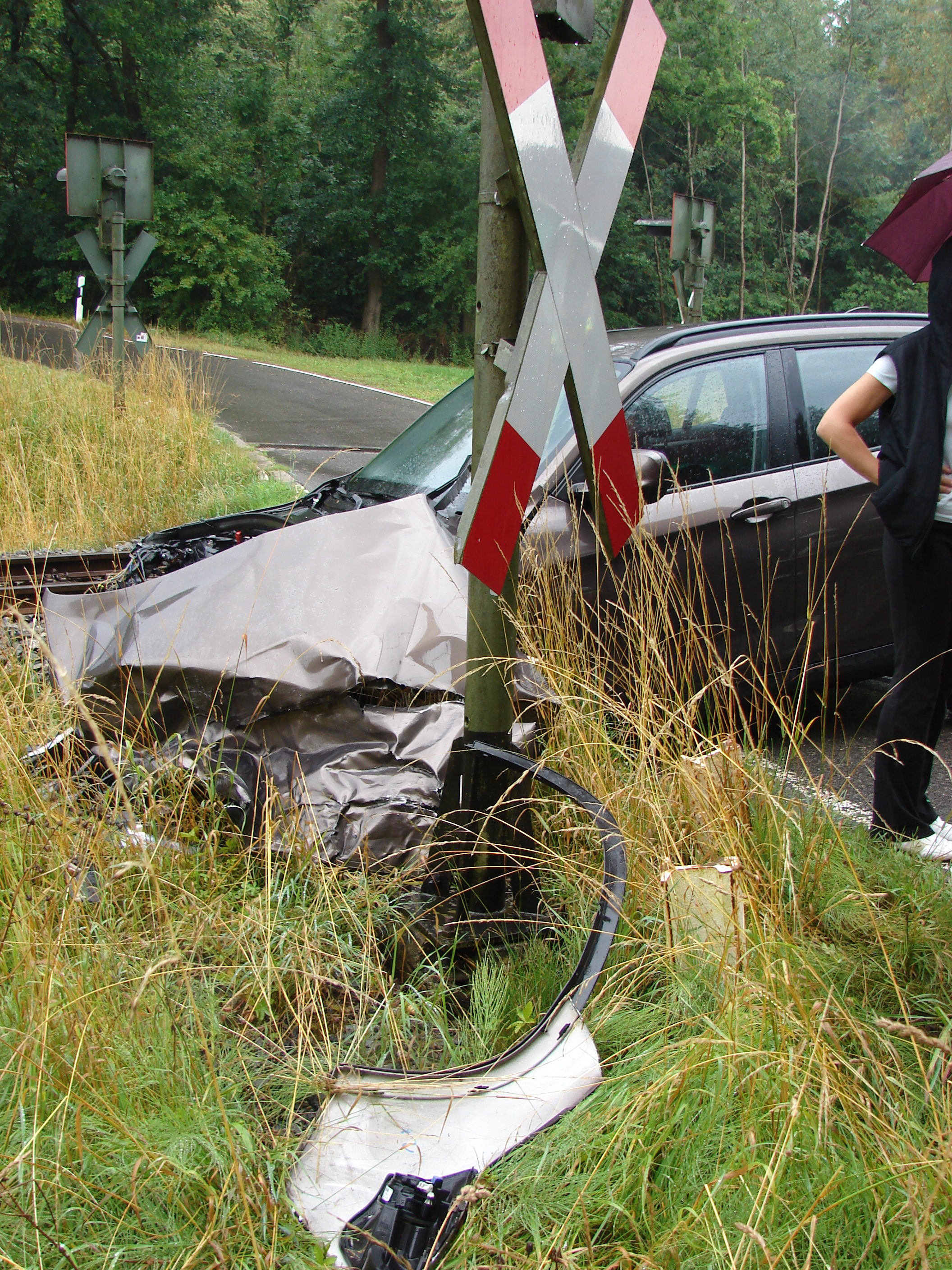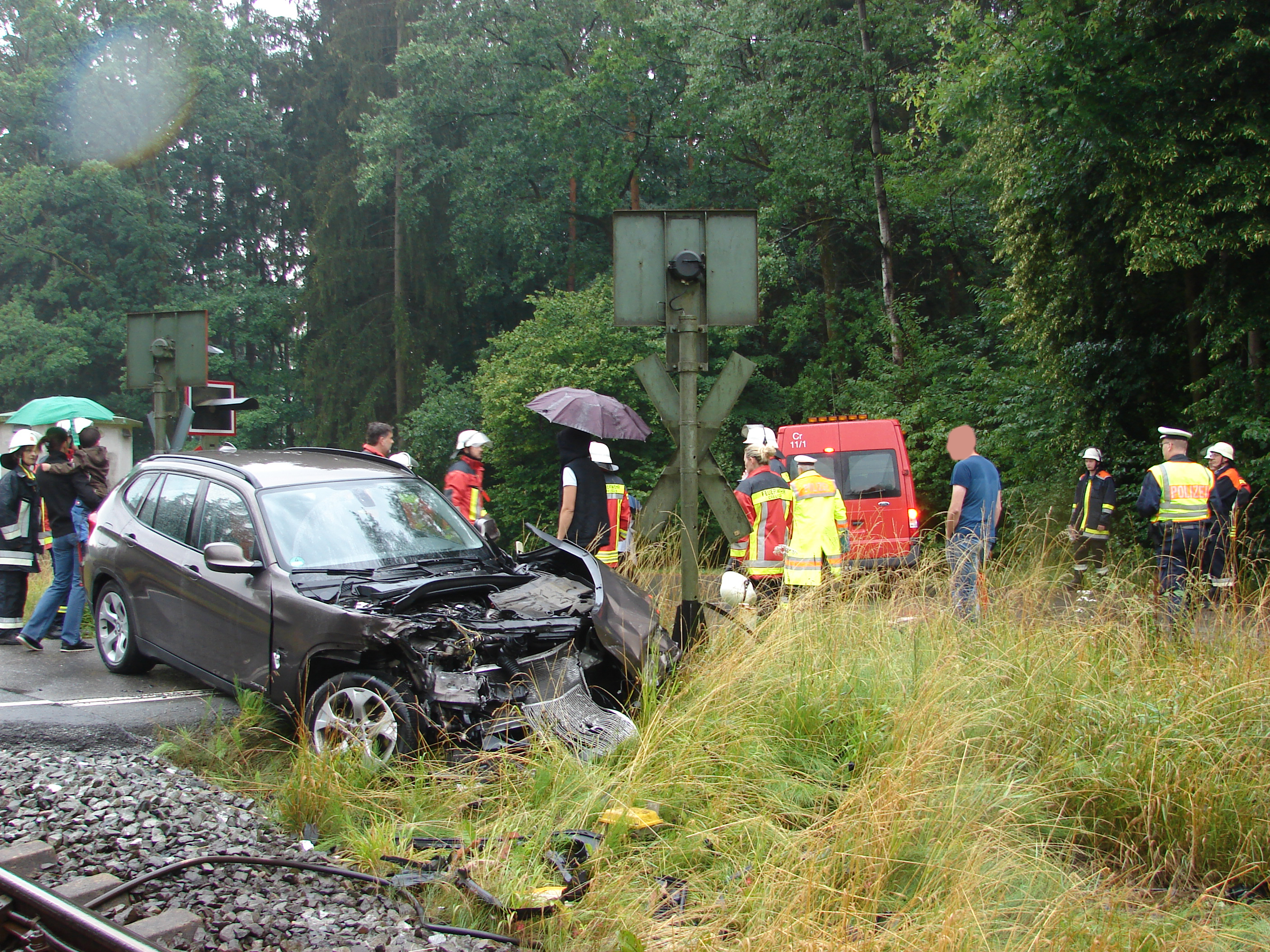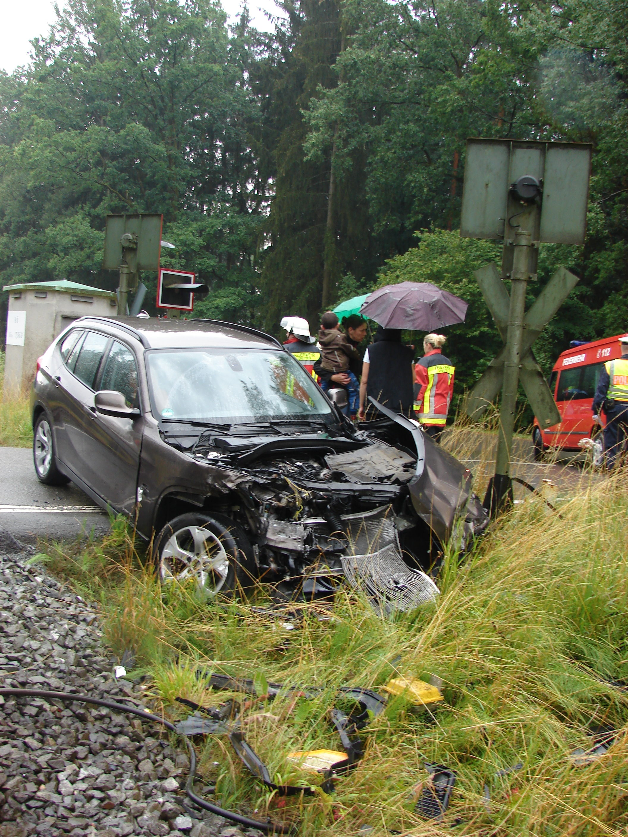 Die ersten Rettungskräfte fanden direkt beim Bahnübergang einen BMW-Kombi liegen. Dieser war im Frontbereich völlig zerstört. Der Fahrzeugführer war bereits selbständig, unverletzt aus den PKW ausgestiegen. Der Autofahrer konnte sein Fahrzeug, trotz Blinklicht des Bahnüberganges nicht mehr rechtzeitig zum Stehen bringen. Der BMW wurde daraufhin im Frontbereich vom Zug erfasst, obwohl der Zugführer noch eine Vollbremsung auslöste. Glücklicherweise wurde bei diesem Bremsmanöver niemand im Zug verletzt. Der Zug konnte trotz Beschädigung des Triebkopfes seine Fahrt, nachdem der Zugführer routinemäßig ausgewechselt wurde, nach Bayreuth fortsetzen.