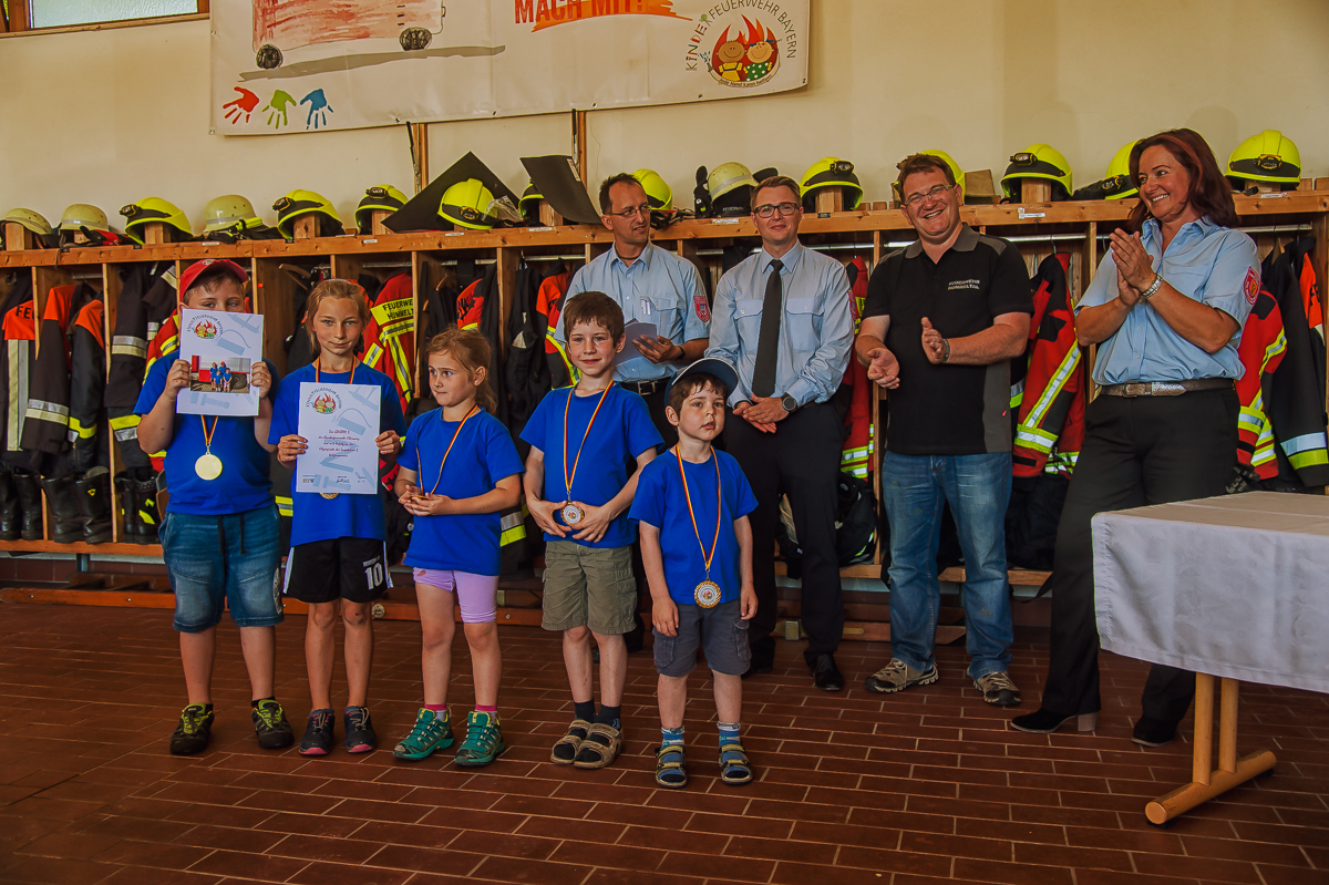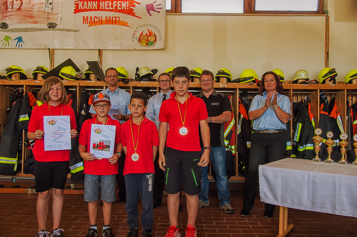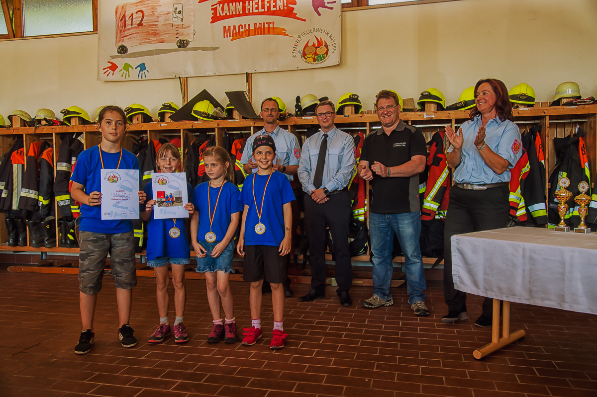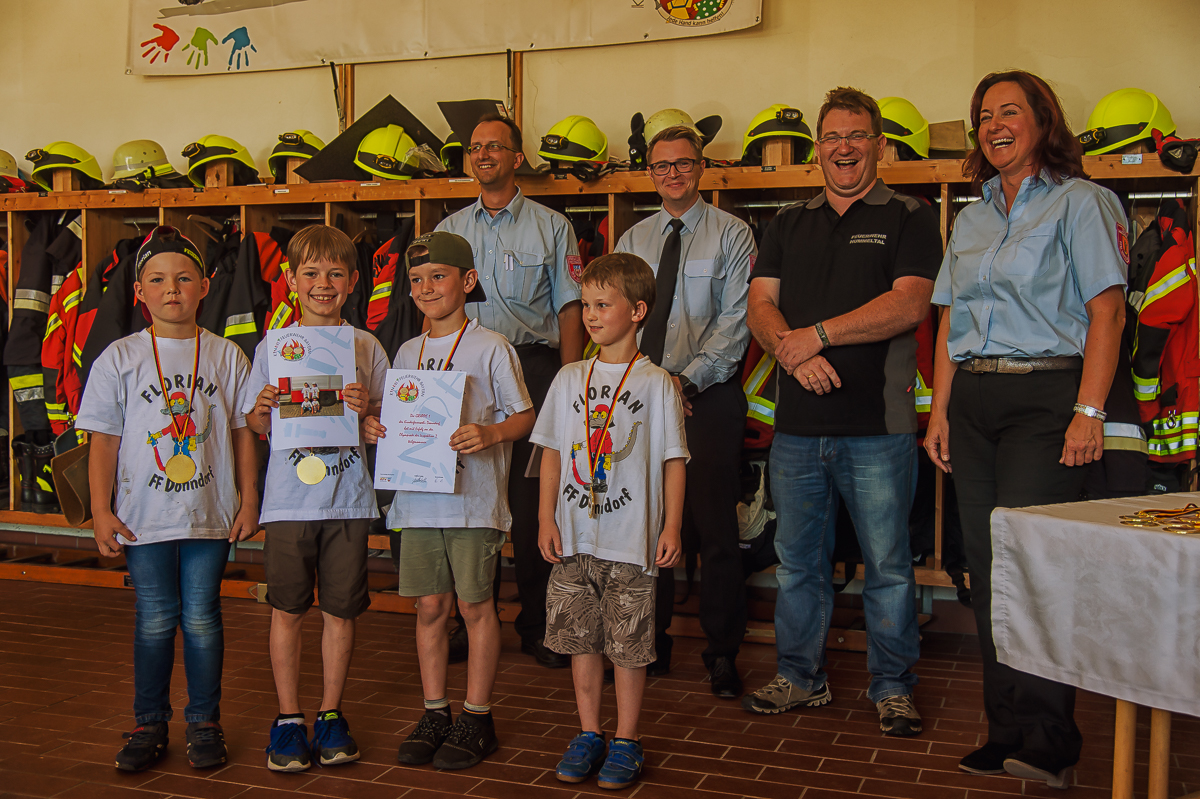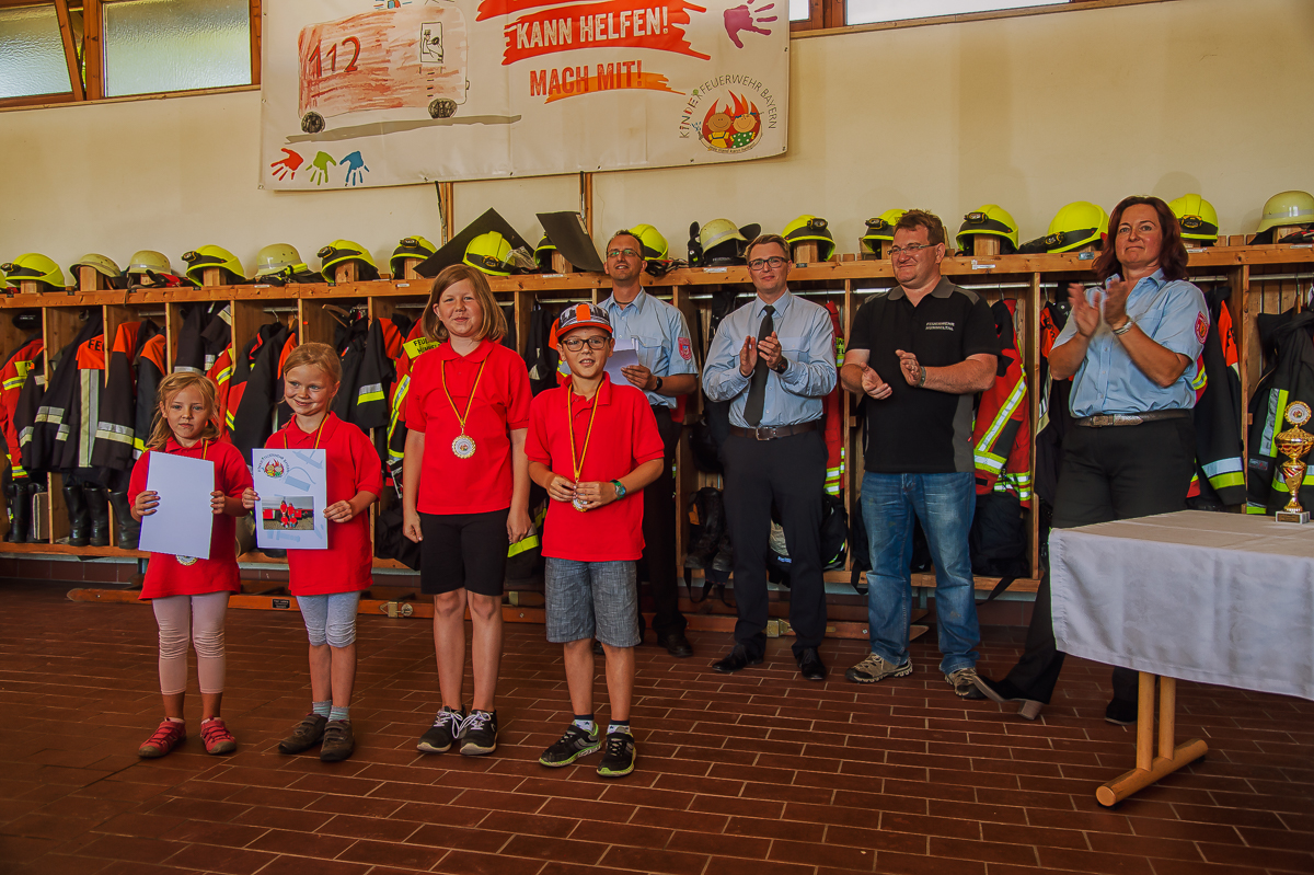 Jede Menge Medaillen, Urkunden, Fotos, Pokale gab es dann, begleitet von viel Applaus für die Kinder beim krönenden Abschluss aus den Händen von Katrin Fiedler, Bürgermeister Patrick Meyer, Kreisbrandmeister Daniel Ermer und Kreisjugendfeuerwehrwart Marco Meyer.