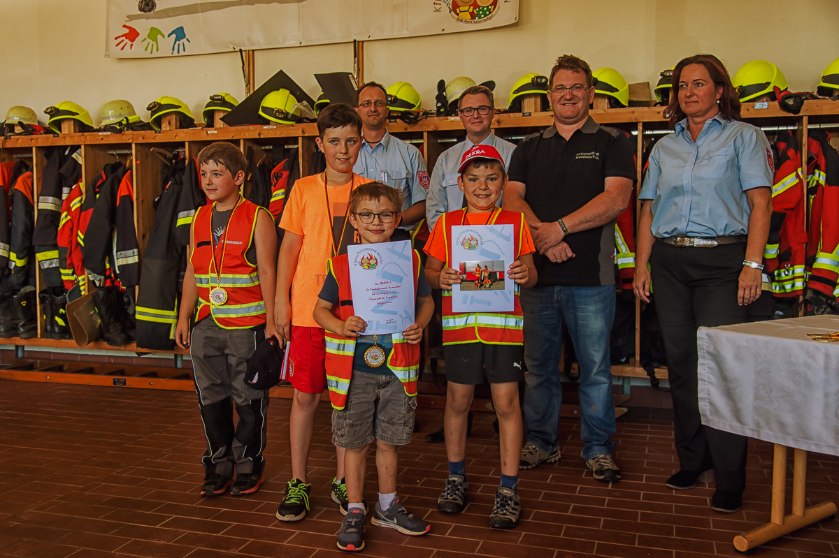 Jede Menge Medaillen, Urkunden, Fotos, Pokale gab es dann, begleitet von viel Applaus für die Kinder beim krönenden Abschluss aus den Händen von Katrin Fiedler, Bürgermeister Patrick Meyer, Kreisbrandmeister Daniel Ermer und Kreisjugendfeuerwehrwart Marco Meyer.