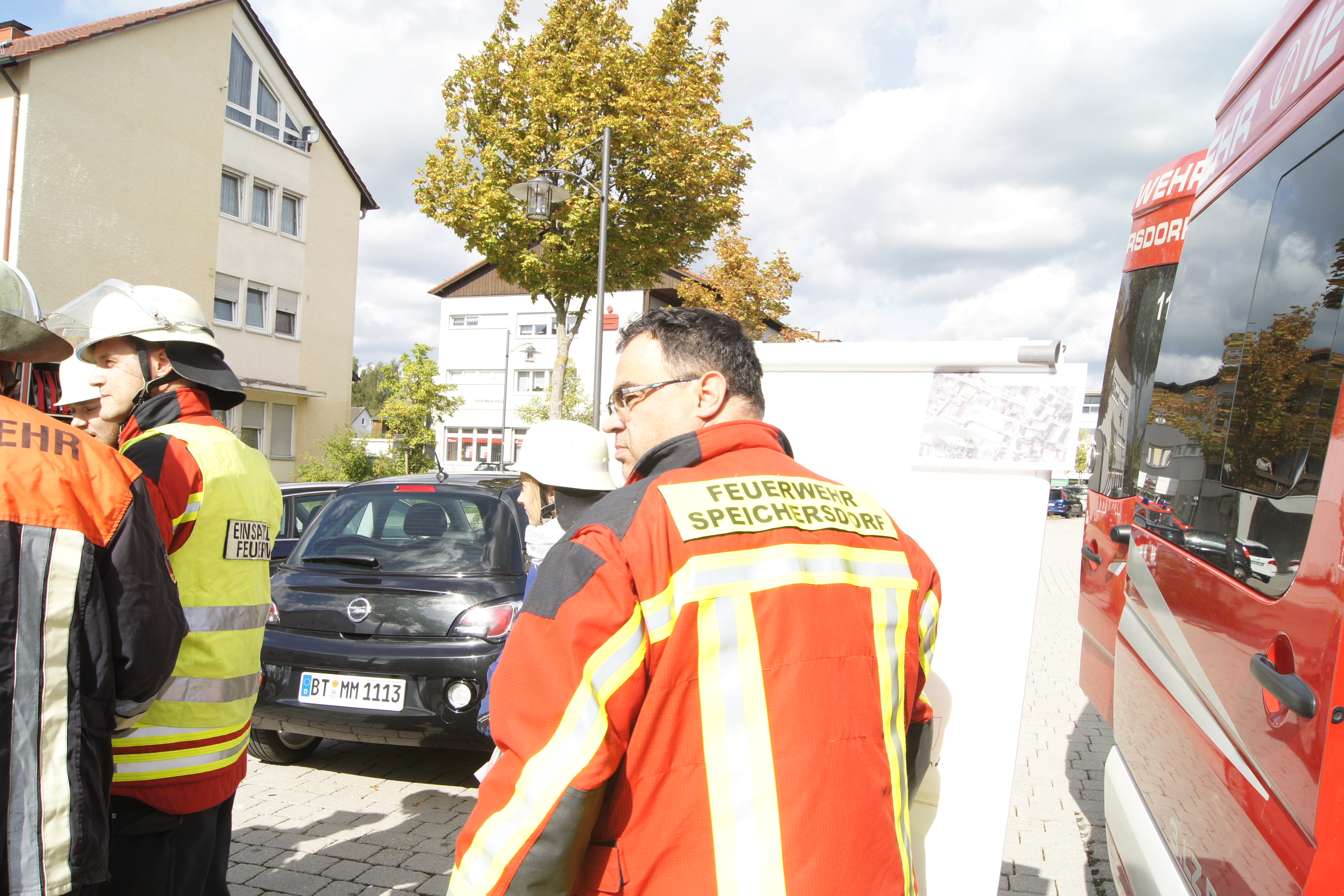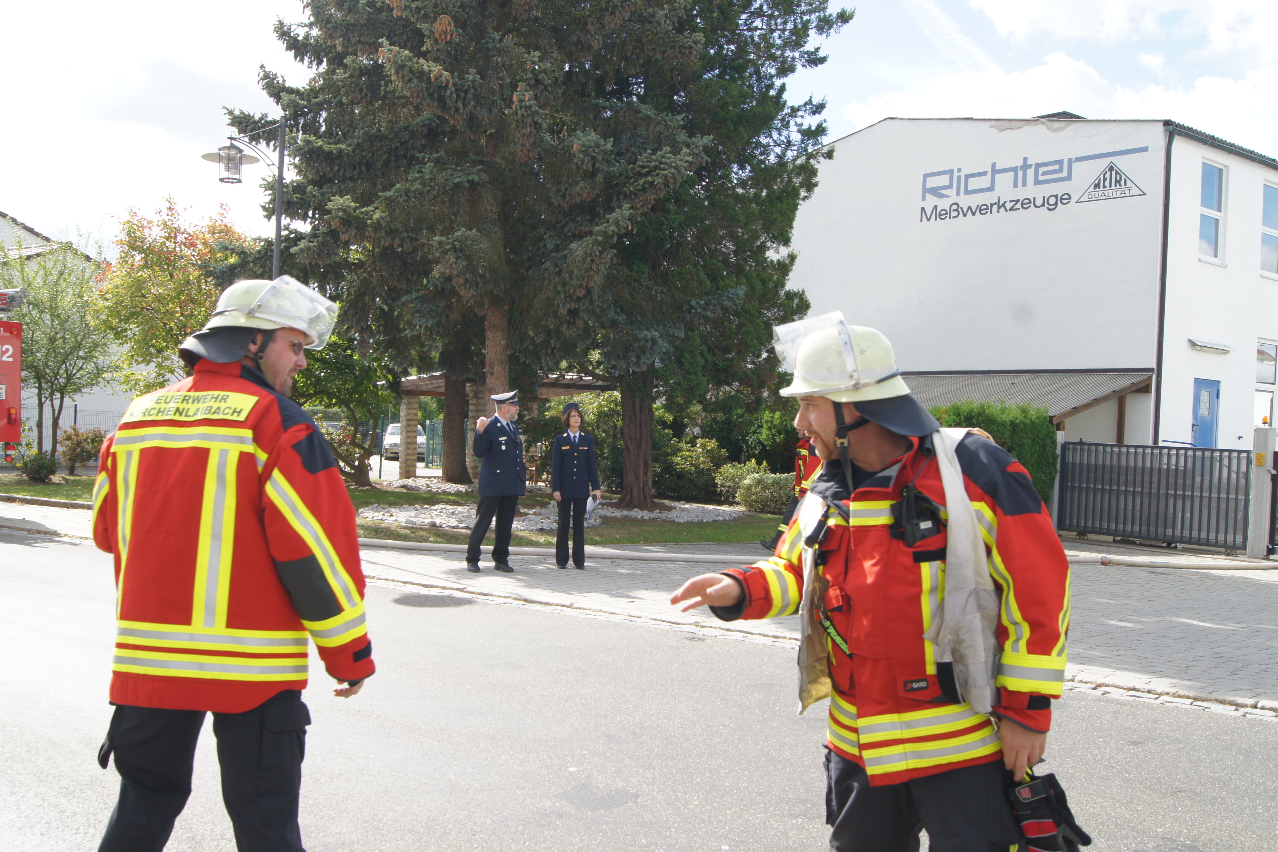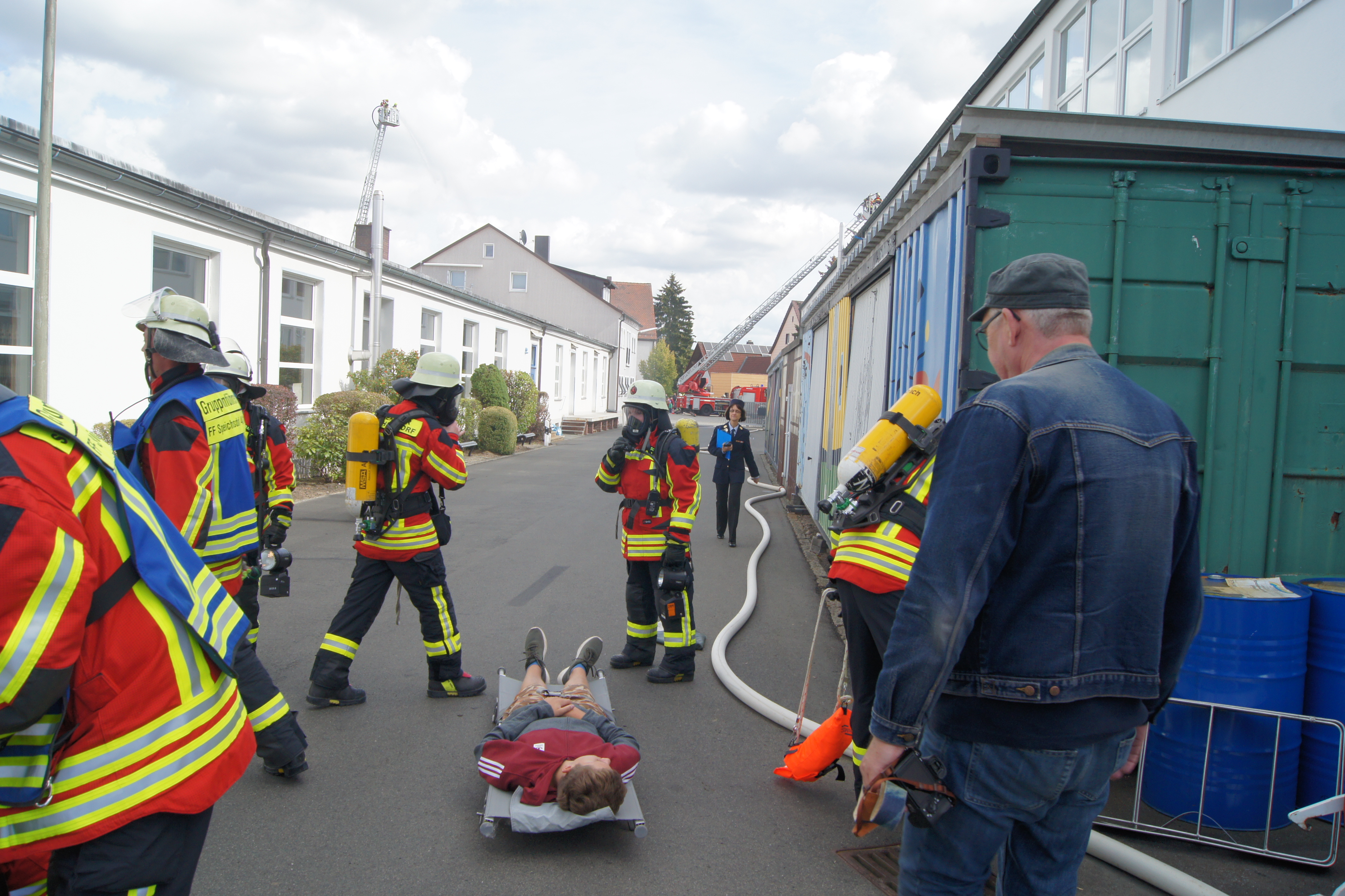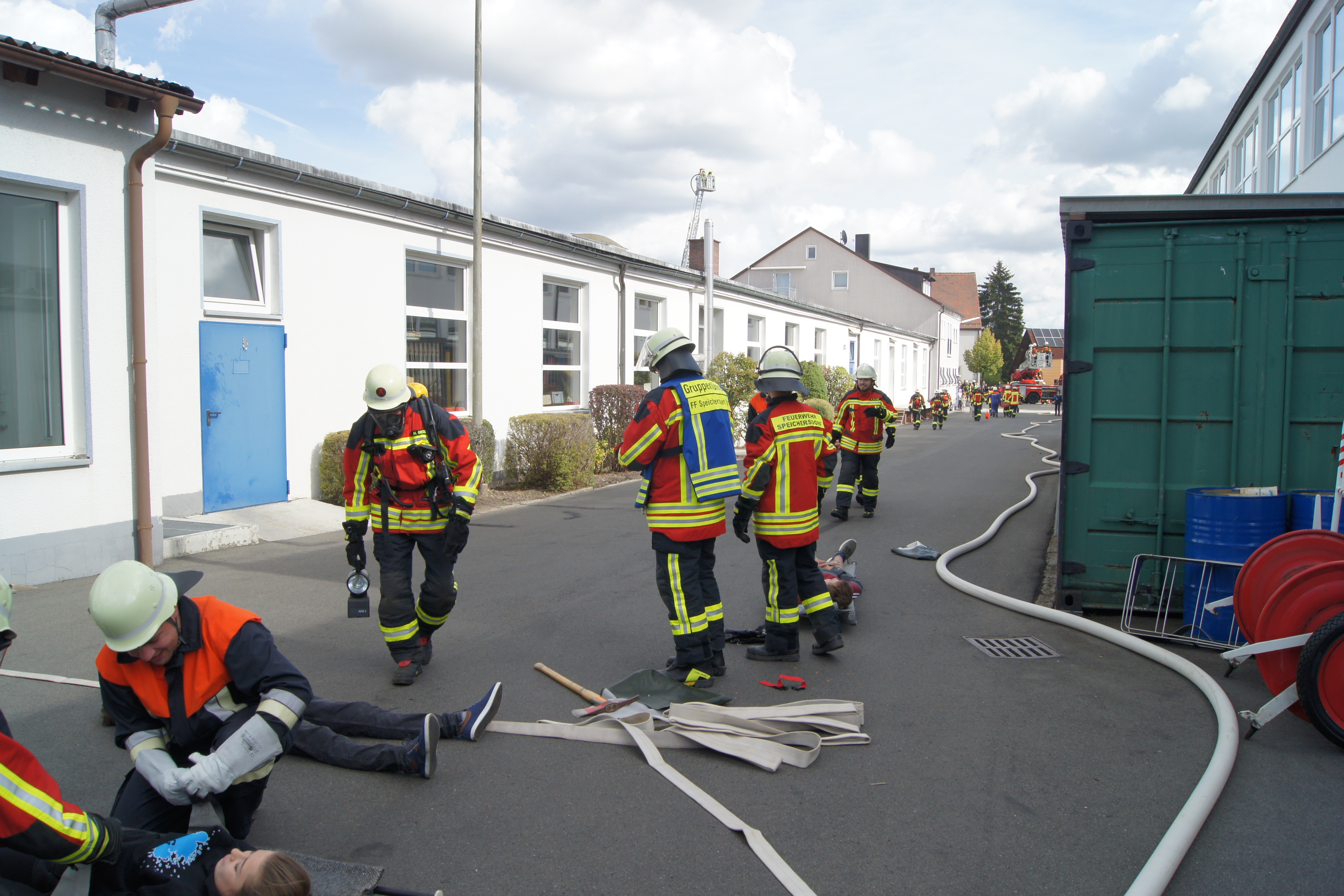 Die Übung im Rahmen der Feuerwehraktionswoche fand am Samstag Nachmittag in der Inspektion IV in Speichersdorf statt. Dort war man bei der Firma Friedrich Richter Meßwerkzeugfabrik GmbH & Co. KG in der Hauptstraße davon ausgegangen, dass es zu einem Unfall in der Färberei gekommen ist, in dessen Zuge es zu einem Feuer gekommen ist. Mehrere Mitarbeiter seien vermisst, das Feuer habe sich schnell auf weitere Teile der Firma ausgebreitet, zwei Hallen stünden in Vollbrand. Vermisst würden ca.5 Mitarbeiter, Chemikalien seien in größeren Mengen vorhanden, so das anspruchsvolle Szenario, das die Feuerwehren Speichersdorf, Kirchenlaibach, Weidenberg, Seybothenreuth, Kemnath, Tressau, Windischenlaibach, Göppmannsbühl, Plössen, Zeulenreuth, der Löschzug Frankenpfalz sowie die Fachberater des THW Pegnitz und die zuständigen Feuerwehrführungskräfte abzuarbeiten hatten. Landrat Hermann Hübner und Bürgermeister Manfred Porsch machten sich zusammen mit Kreisbrandrat Hermann Schreck und Kreisbrandinspektorin Kerstin Schmidt vor Ort ein Bild von der Lage. Die Einsatzleitung hatte Speichersdorfs Kommandant Volker Hammon inne, der von allen Seiten Lob für die Einsatzabarbeitung erhielt.