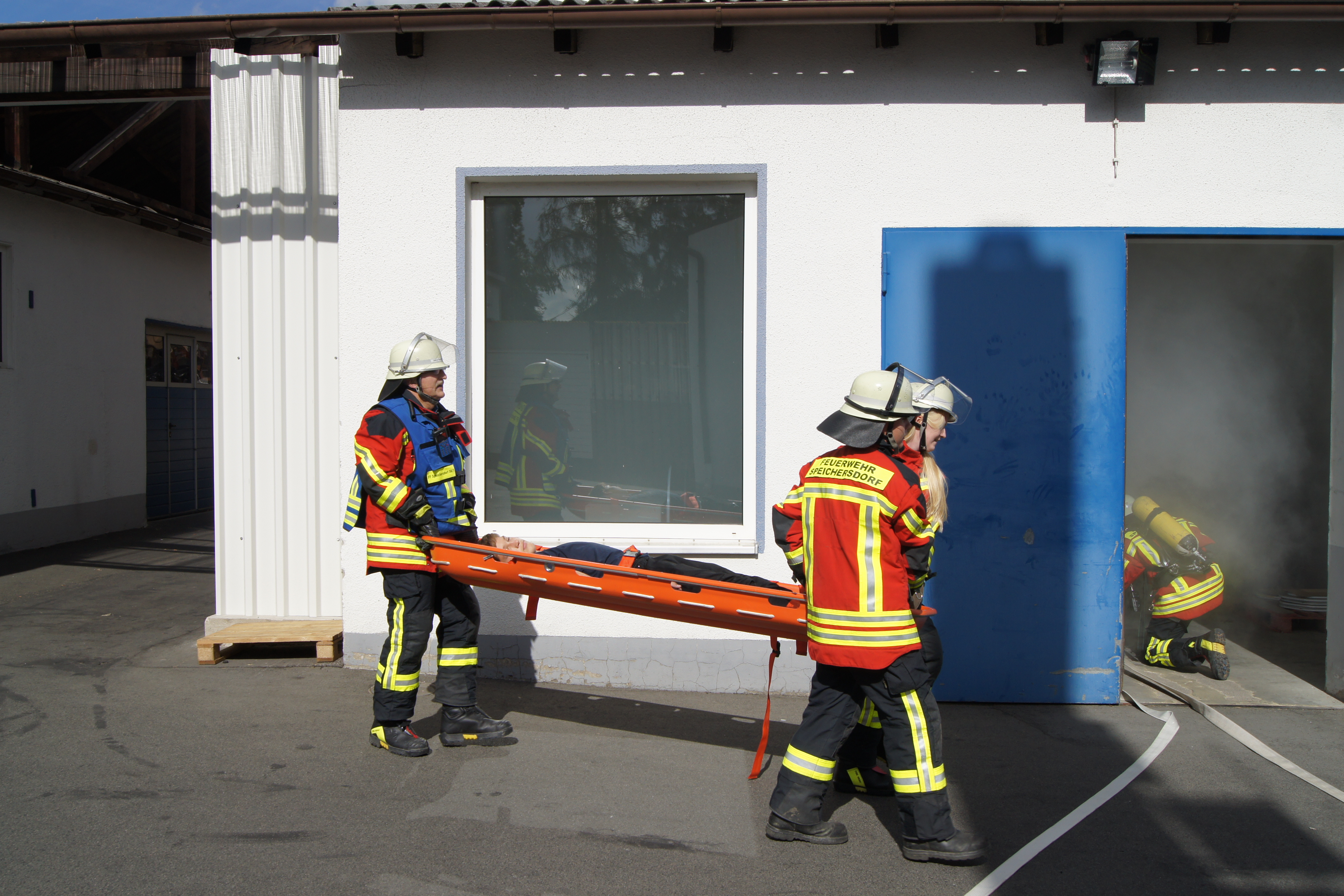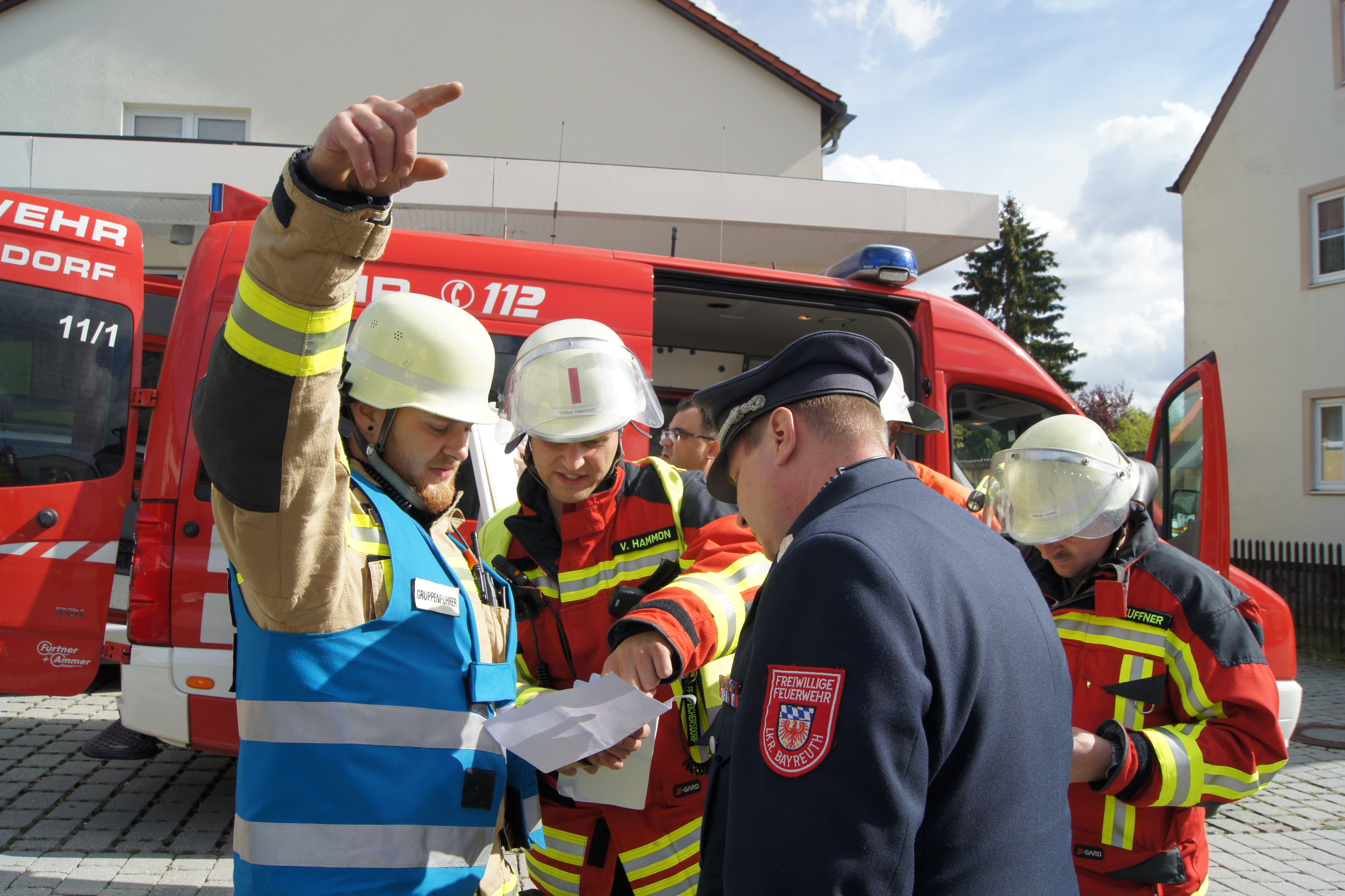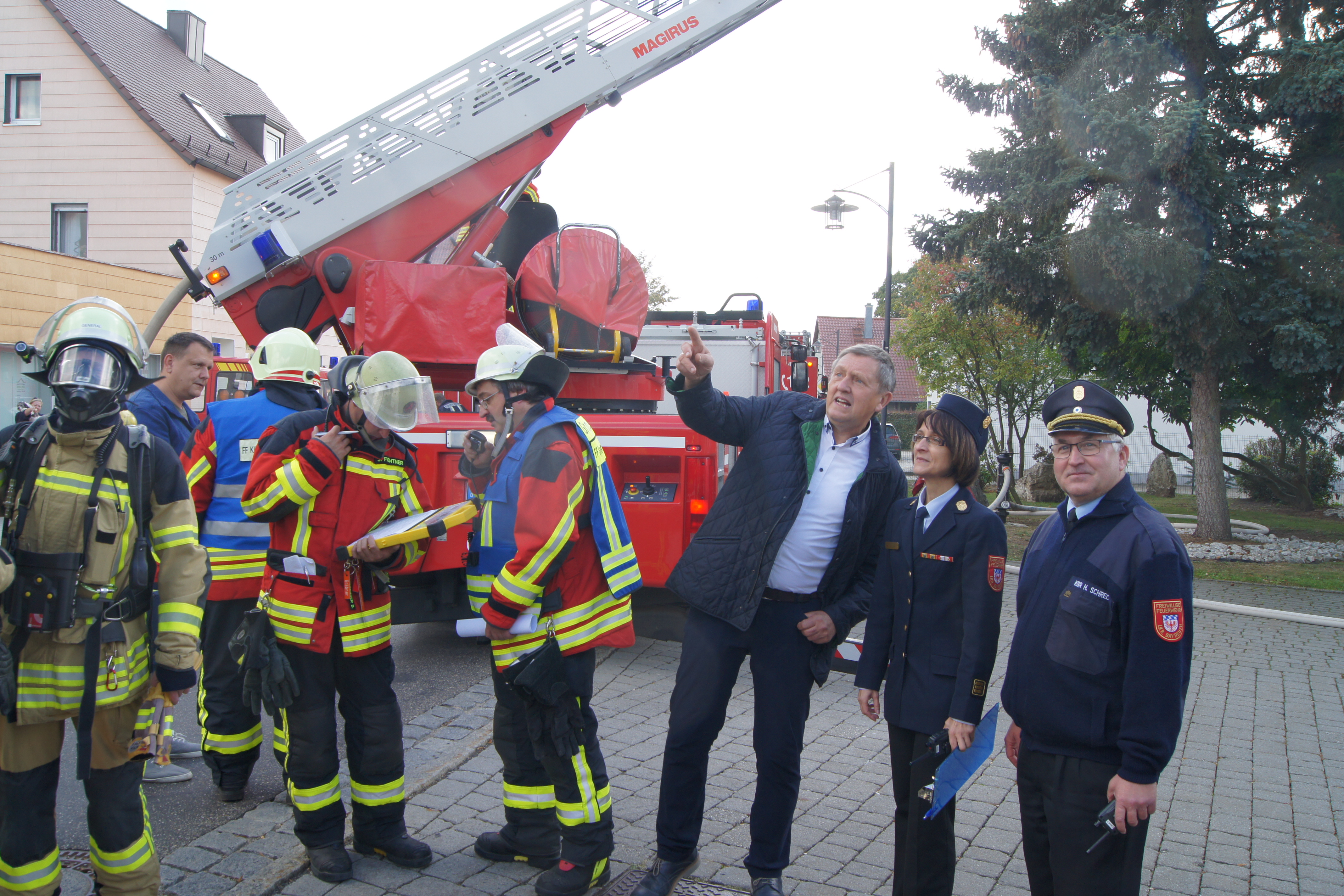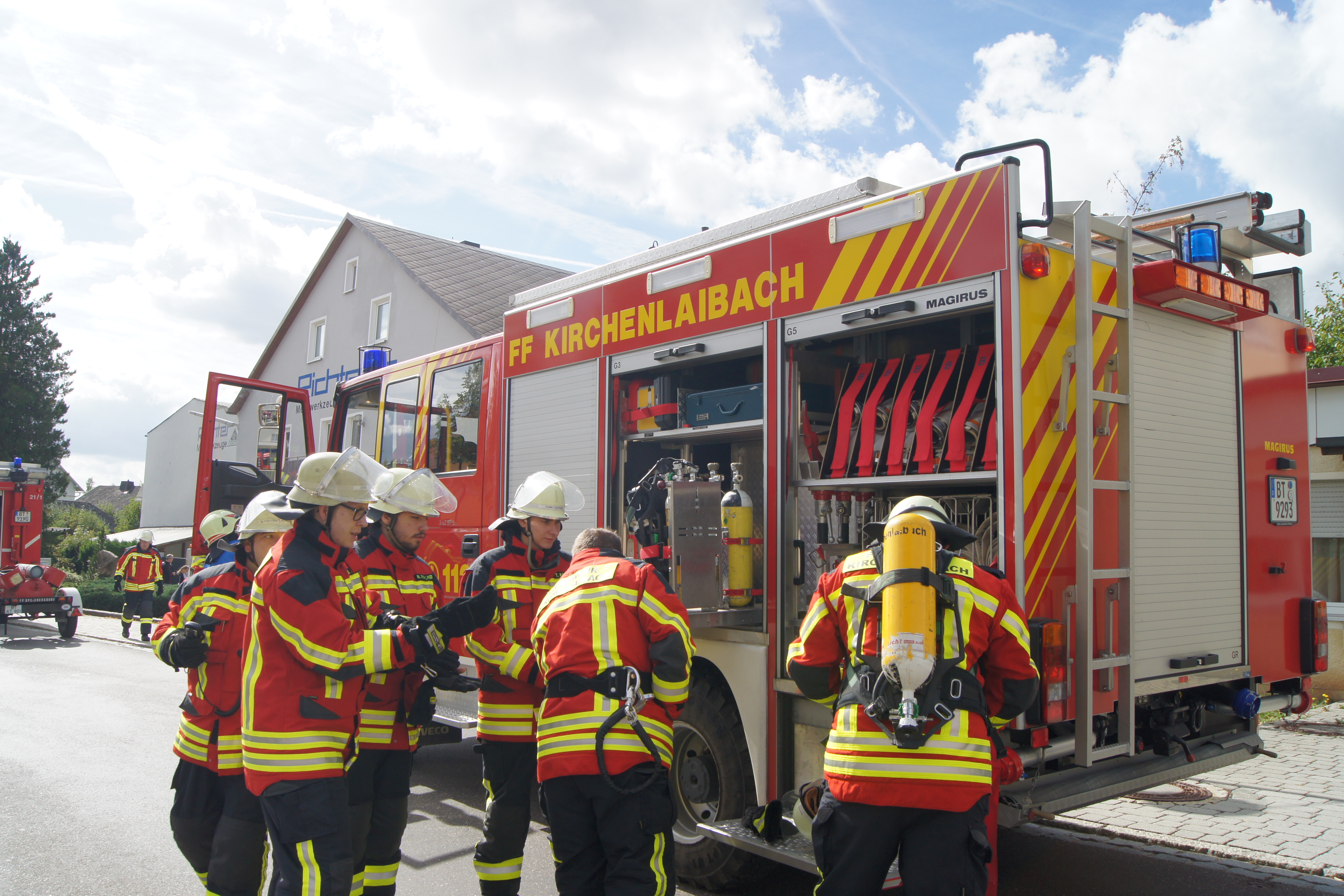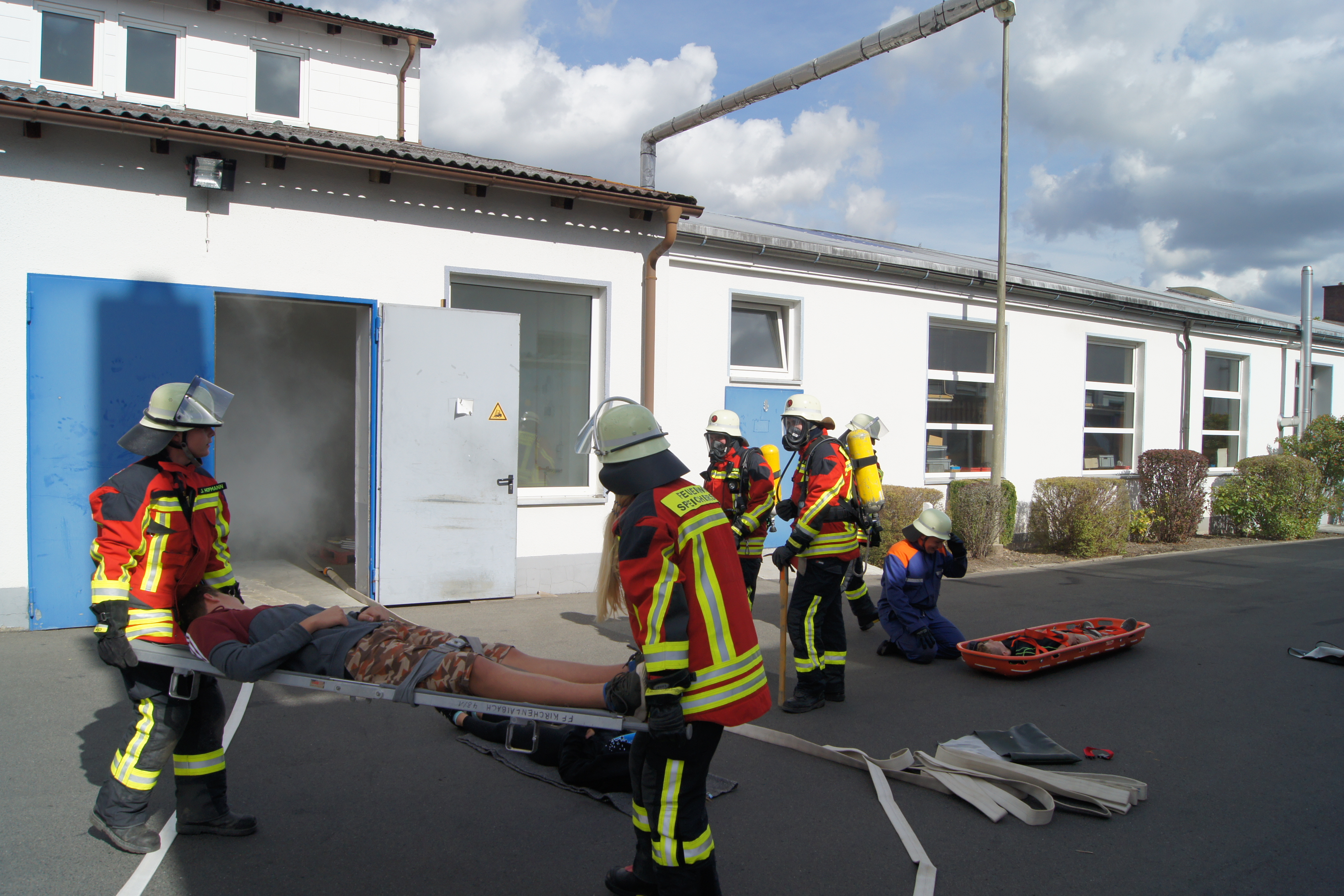 Die Übung im Rahmen der Feuerwehraktionswoche fand am Samstag Nachmittag in der Inspektion IV in Speichersdorf statt. Dort war man bei der Firma Friedrich Richter Meßwerkzeugfabrik GmbH & Co. KG in der Hauptstraße davon ausgegangen, dass es zu einem Unfall in der Färberei gekommen ist, in dessen Zuge es zu einem Feuer gekommen ist. Mehrere Mitarbeiter seien vermisst, das Feuer habe sich schnell auf weitere Teile der Firma ausgebreitet, zwei Hallen stünden in Vollbrand. Vermisst würden ca.5 Mitarbeiter, Chemikalien seien in größeren Mengen vorhanden, so das anspruchsvolle Szenario, das die Feuerwehren Speichersdorf, Kirchenlaibach, Weidenberg, Seybothenreuth, Kemnath, Tressau, Windischenlaibach, Göppmannsbühl, Plössen, Zeulenreuth, der Löschzug Frankenpfalz sowie die Fachberater des THW Pegnitz und die zuständigen Feuerwehrführungskräfte abzuarbeiten hatten. Landrat Hermann Hübner und Bürgermeister Manfred Porsch machten sich zusammen mit Kreisbrandrat Hermann Schreck und Kreisbrandinspektorin Kerstin Schmidt vor Ort ein Bild von der Lage. Die Einsatzleitung hatte Speichersdorfs Kommandant Volker Hammon inne, der von allen Seiten Lob für die Einsatzabarbeitung erhielt.