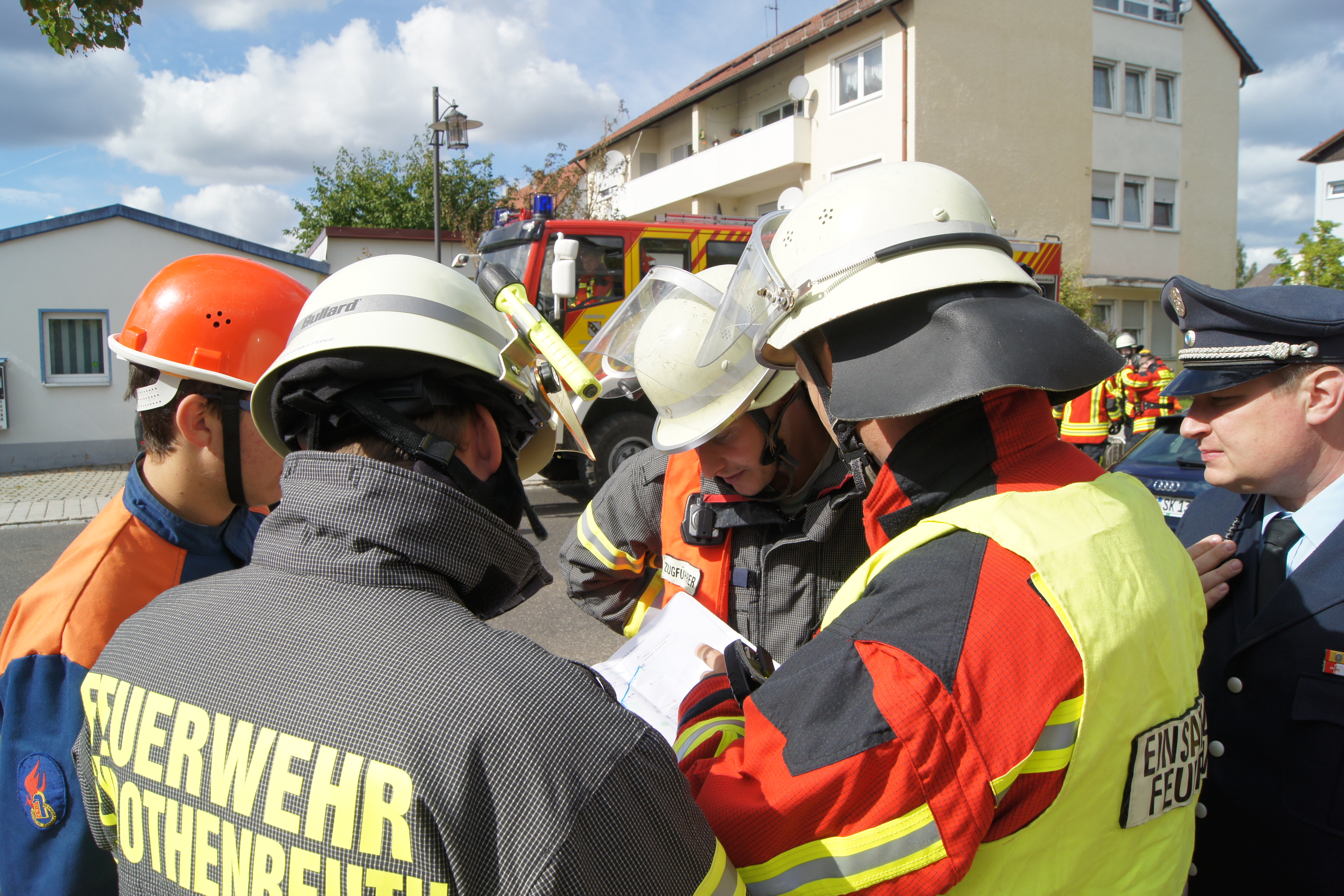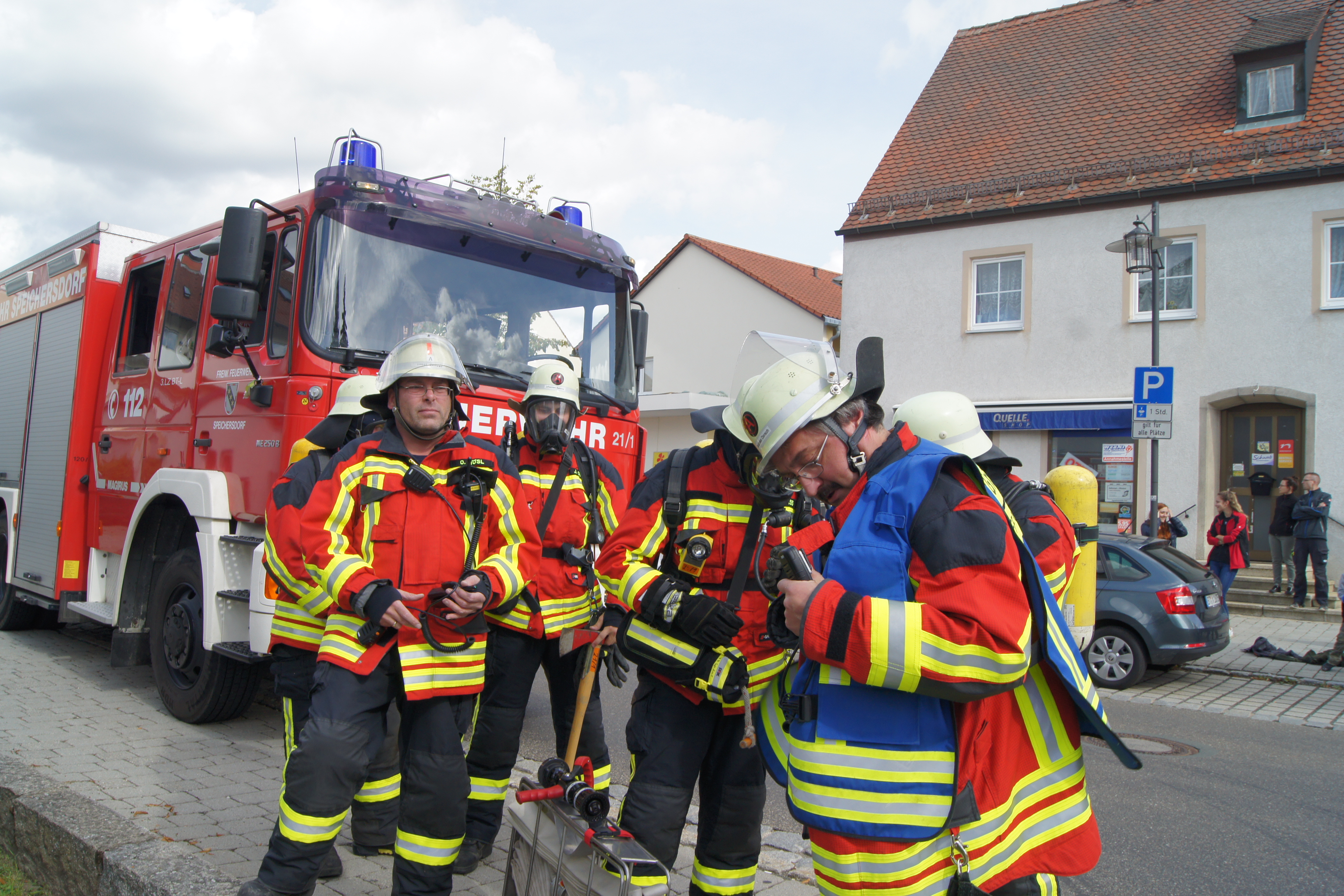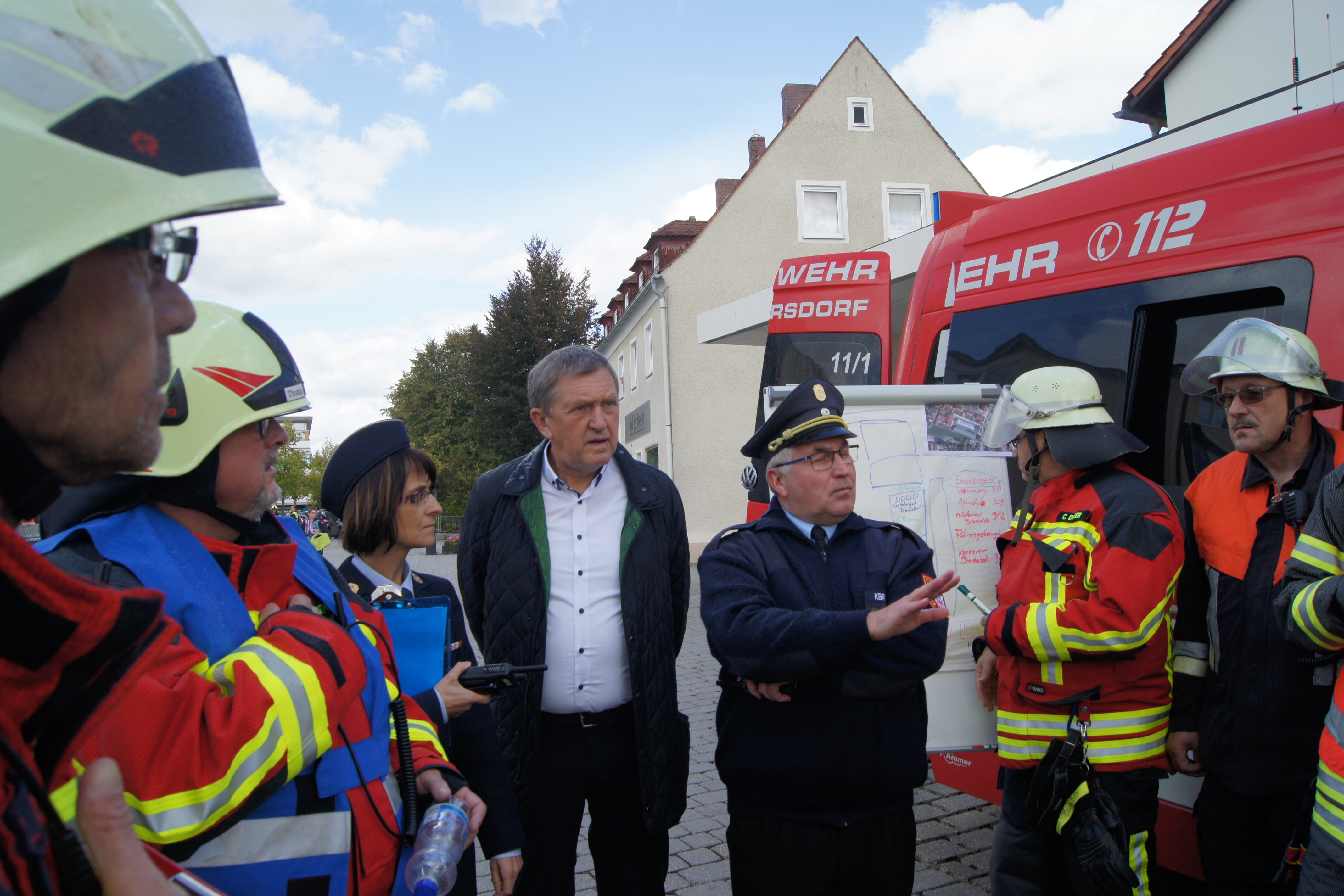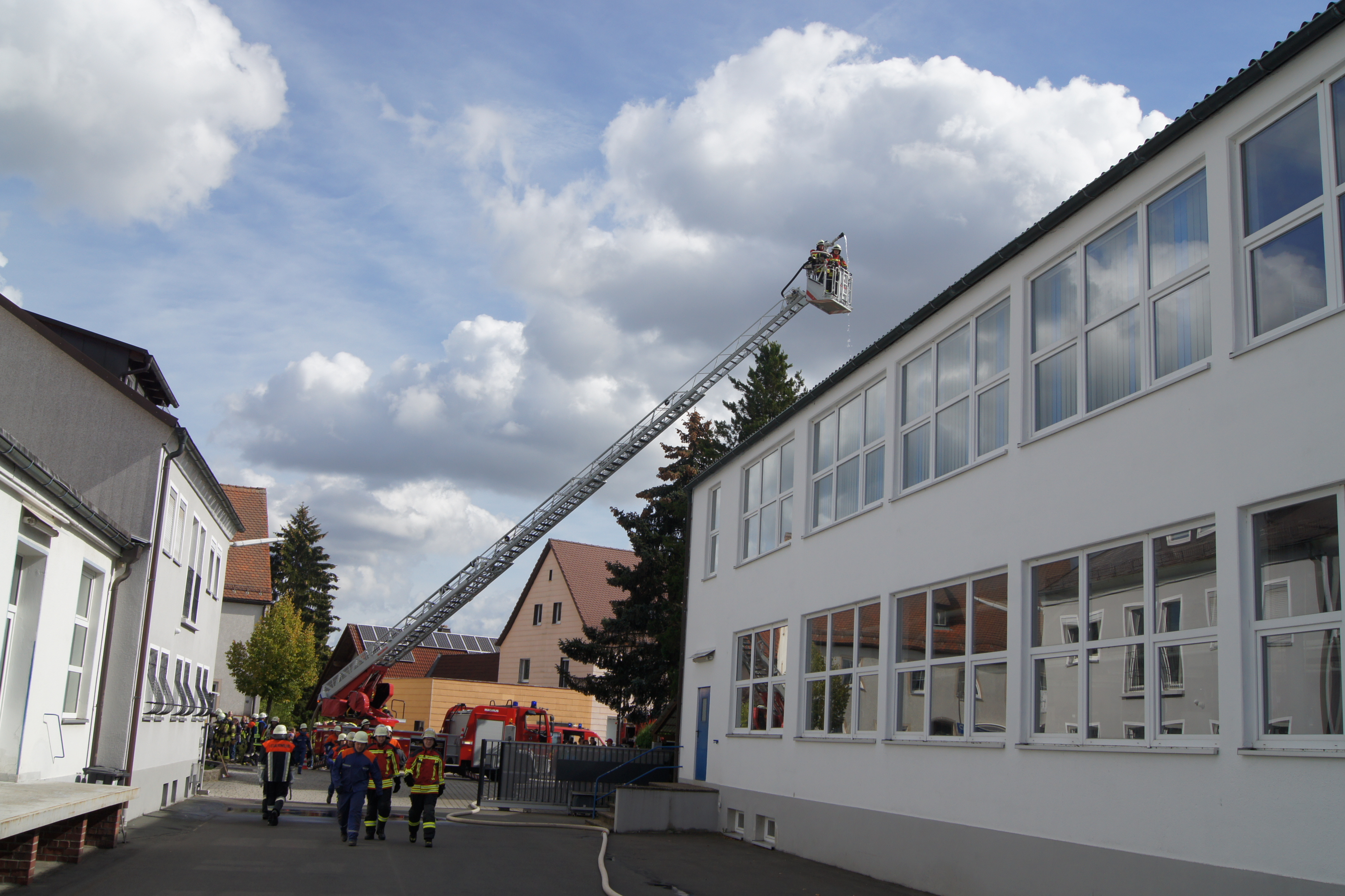 Die Übung im Rahmen der Feuerwehraktionswoche fand am Samstag Nachmittag in der Inspektion IV in Speichersdorf statt. Dort war man bei der Firma Friedrich Richter Meßwerkzeugfabrik GmbH & Co. KG in der Hauptstraße davon ausgegangen, dass es zu einem Unfall in der Färberei gekommen ist, in dessen Zuge es zu einem Feuer gekommen ist. Mehrere Mitarbeiter seien vermisst, das Feuer habe sich schnell auf weitere Teile der Firma ausgebreitet, zwei Hallen stünden in Vollbrand. Vermisst würden ca.5 Mitarbeiter, Chemikalien seien in größeren Mengen vorhanden, so das anspruchsvolle Szenario, das die Feuerwehren Speichersdorf, Kirchenlaibach, Weidenberg, Seybothenreuth, Kemnath, Tressau, Windischenlaibach, Göppmannsbühl, Plössen, Zeulenreuth, der Löschzug Frankenpfalz sowie die Fachberater des THW Pegnitz und die zuständigen Feuerwehrführungskräfte abzuarbeiten hatten. Landrat Hermann Hübner und Bürgermeister Manfred Porsch machten sich zusammen mit Kreisbrandrat Hermann Schreck und Kreisbrandinspektorin Kerstin Schmidt vor Ort ein Bild von der Lage. Die Einsatzleitung hatte Speichersdorfs Kommandant Volker Hammon inne, der von allen Seiten Lob für die Einsatzabarbeitung erhielt.