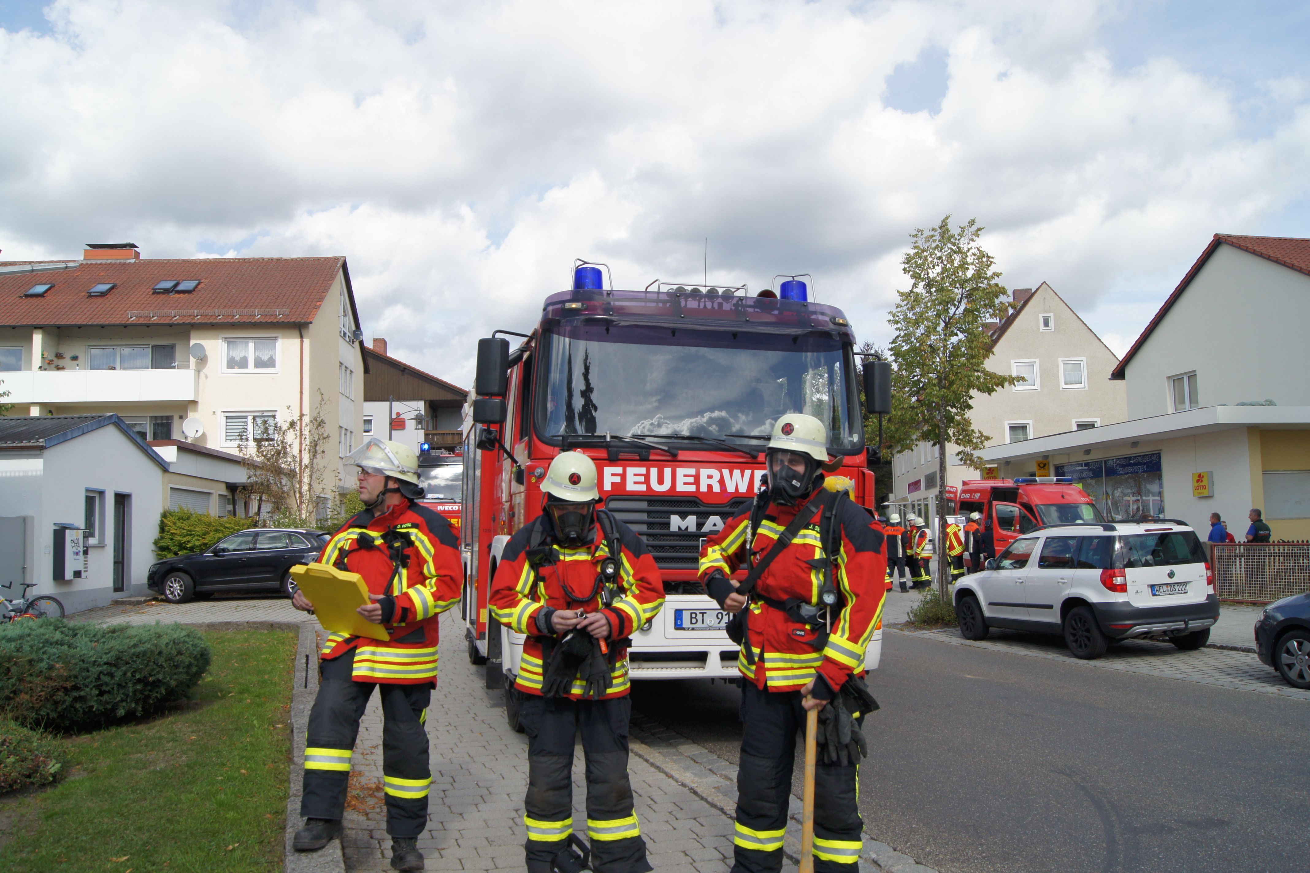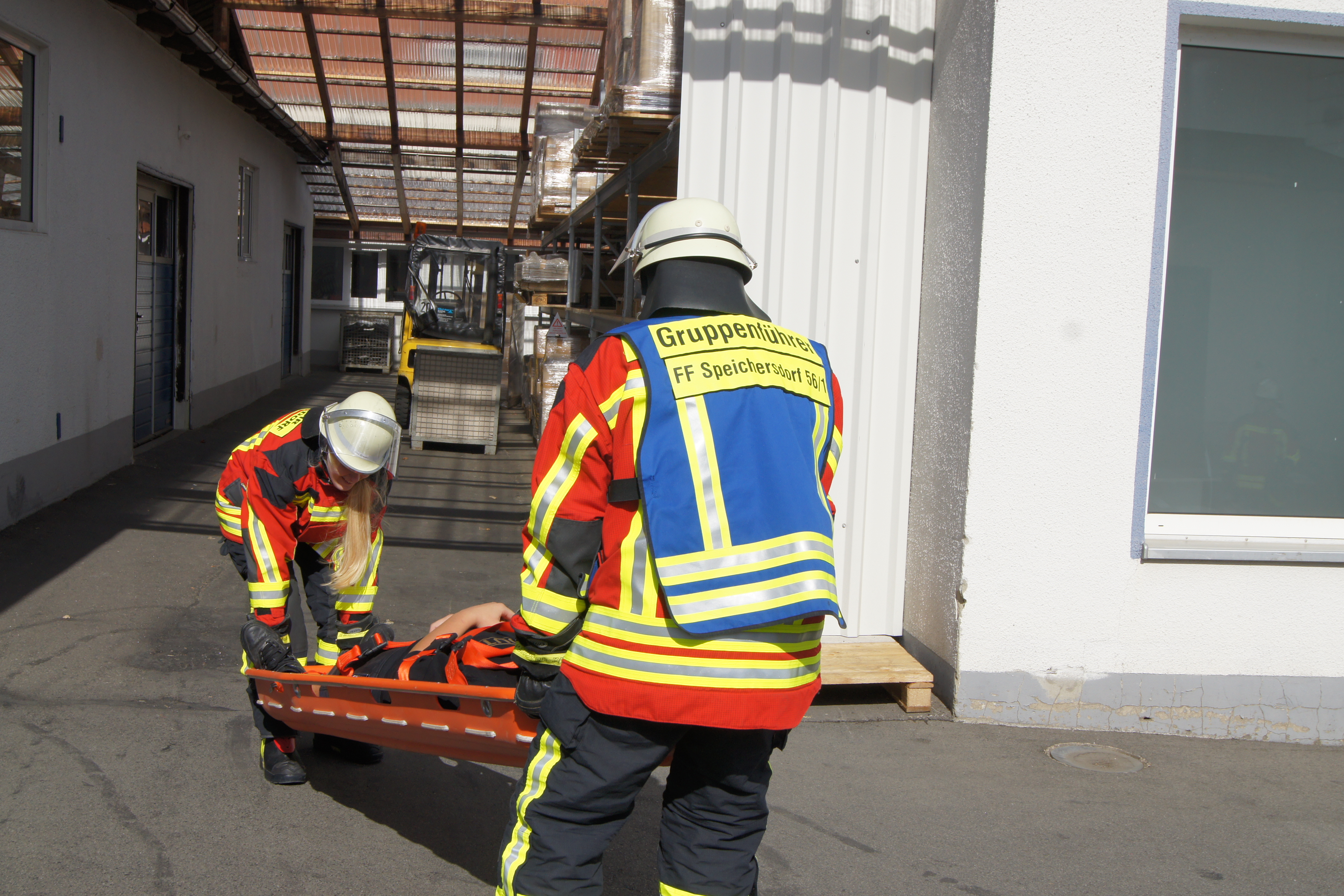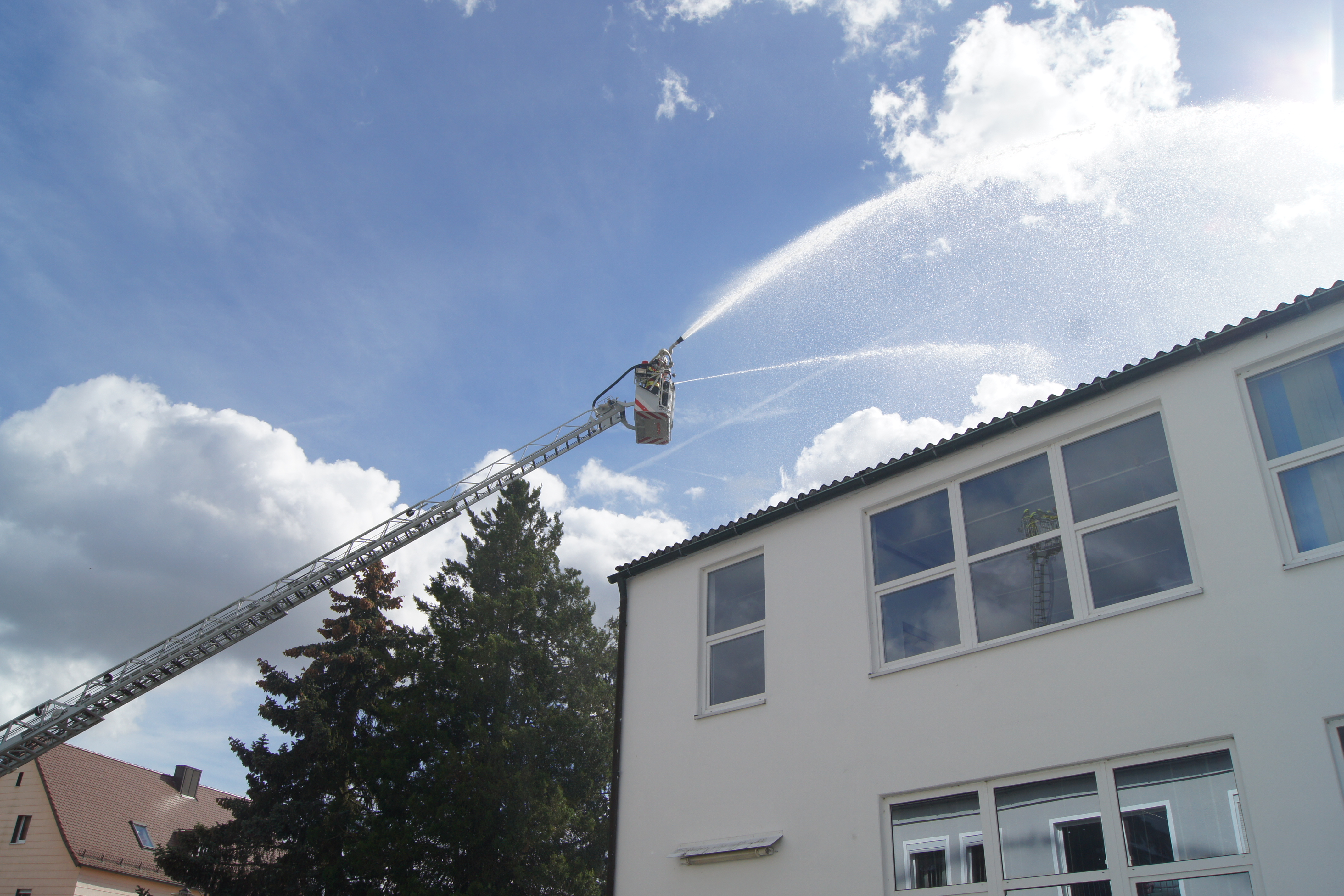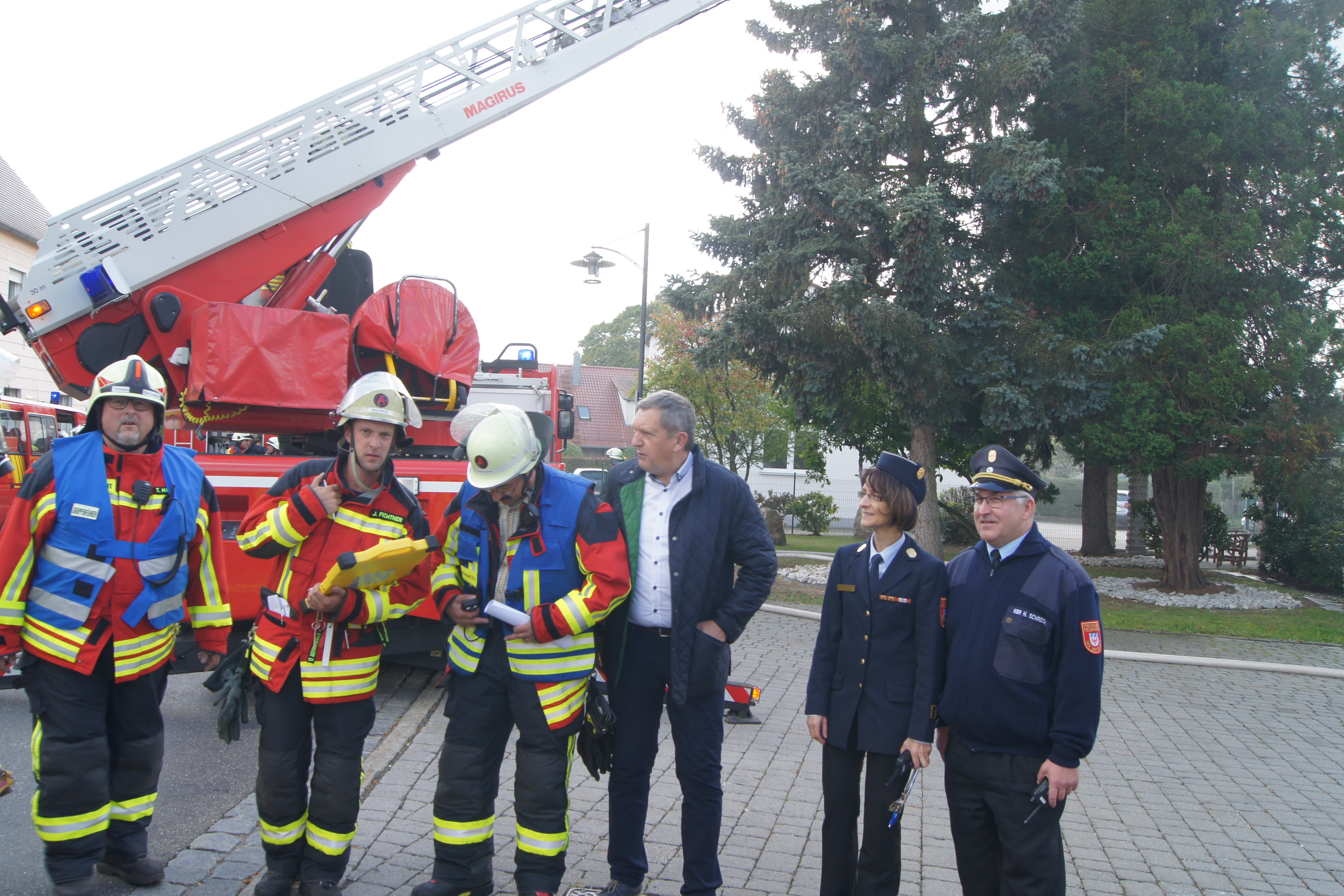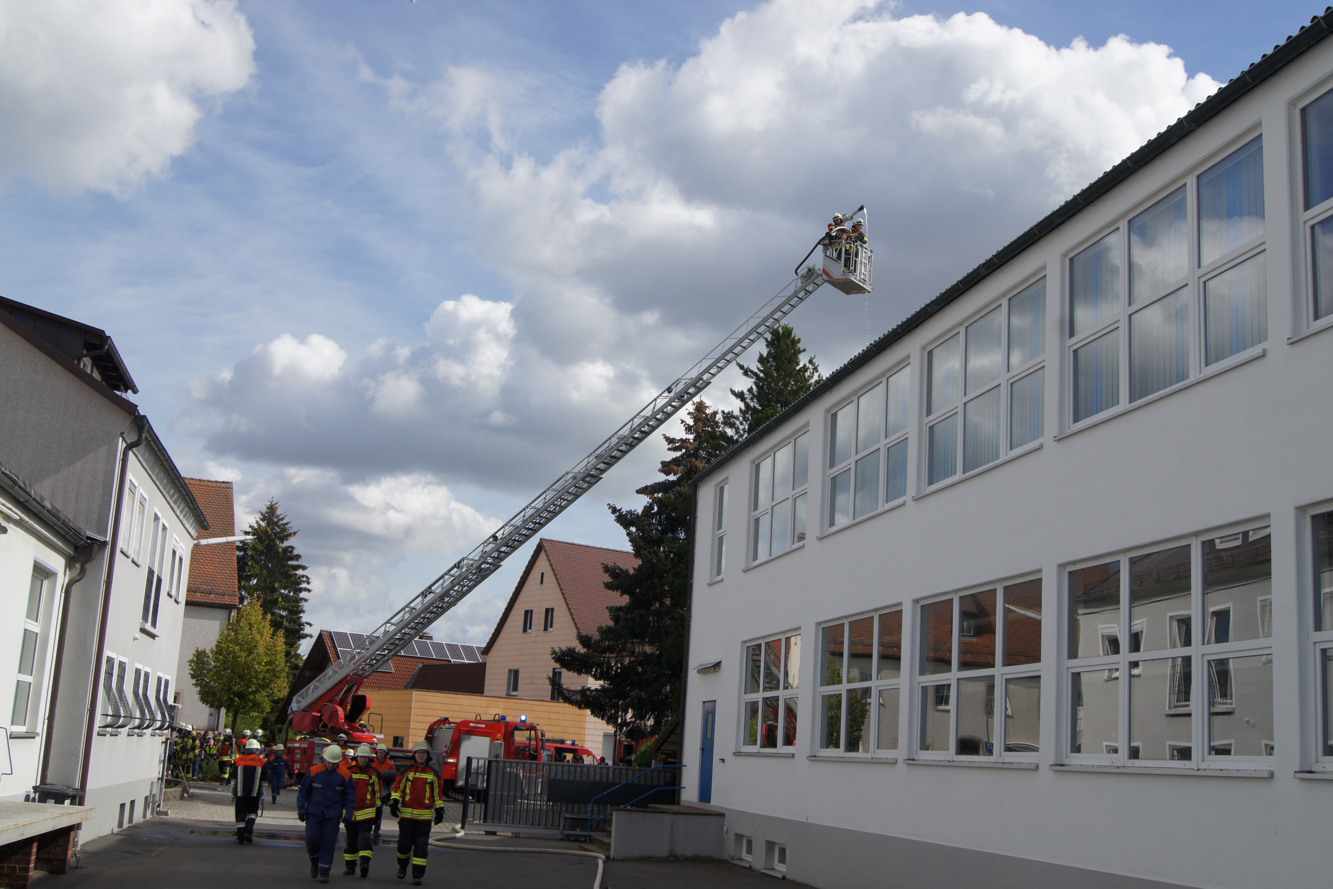 Die Übung im Rahmen der Feuerwehraktionswoche fand am Samstag Nachmittag in der Inspektion IV in Speichersdorf statt. Dort war man bei der Firma Friedrich Richter Meßwerkzeugfabrik GmbH & Co. KG in der Hauptstraße davon ausgegangen, dass es zu einem Unfall in der Färberei gekommen ist, in dessen Zuge es zu einem Feuer gekommen ist. Mehrere Mitarbeiter seien vermisst, das Feuer habe sich schnell auf weitere Teile der Firma ausgebreitet, zwei Hallen stünden in Vollbrand. Vermisst würden ca.5 Mitarbeiter, Chemikalien seien in größeren Mengen vorhanden, so das anspruchsvolle Szenario, das die Feuerwehren Speichersdorf, Kirchenlaibach, Weidenberg, Seybothenreuth, Kemnath, Tressau, Windischenlaibach, Göppmannsbühl, Plössen, Zeulenreuth, der Löschzug Frankenpfalz sowie die Fachberater des THW Pegnitz und die zuständigen Feuerwehrführungskräfte abzuarbeiten hatten. Landrat Hermann Hübner und Bürgermeister Manfred Porsch machten sich zusammen mit Kreisbrandrat Hermann Schreck und Kreisbrandinspektorin Kerstin Schmidt vor Ort ein Bild von der Lage. Die Einsatzleitung hatte Speichersdorfs Kommandant Volker Hammon inne, der von allen Seiten Lob für die Einsatzabarbeitung erhielt.