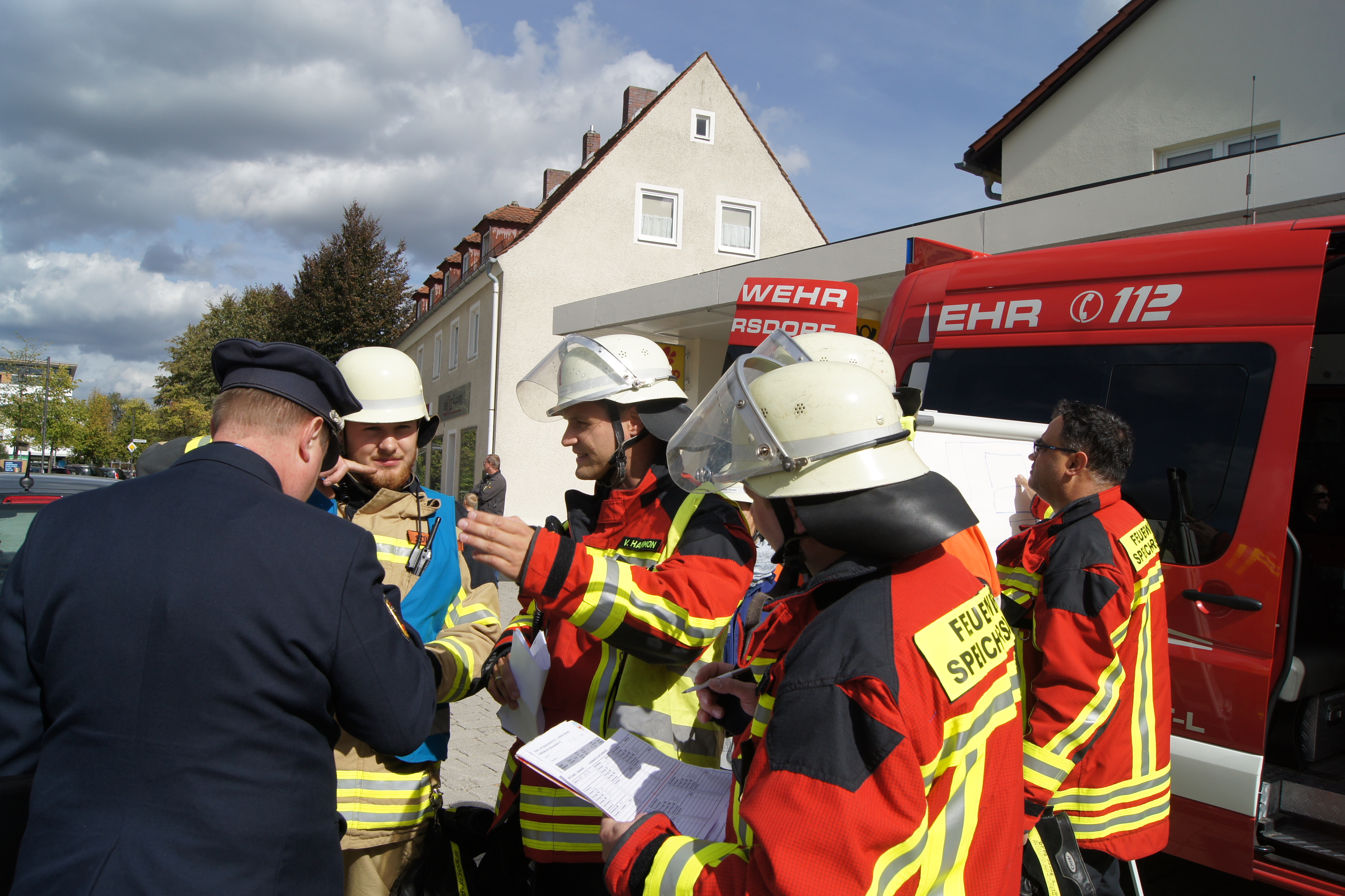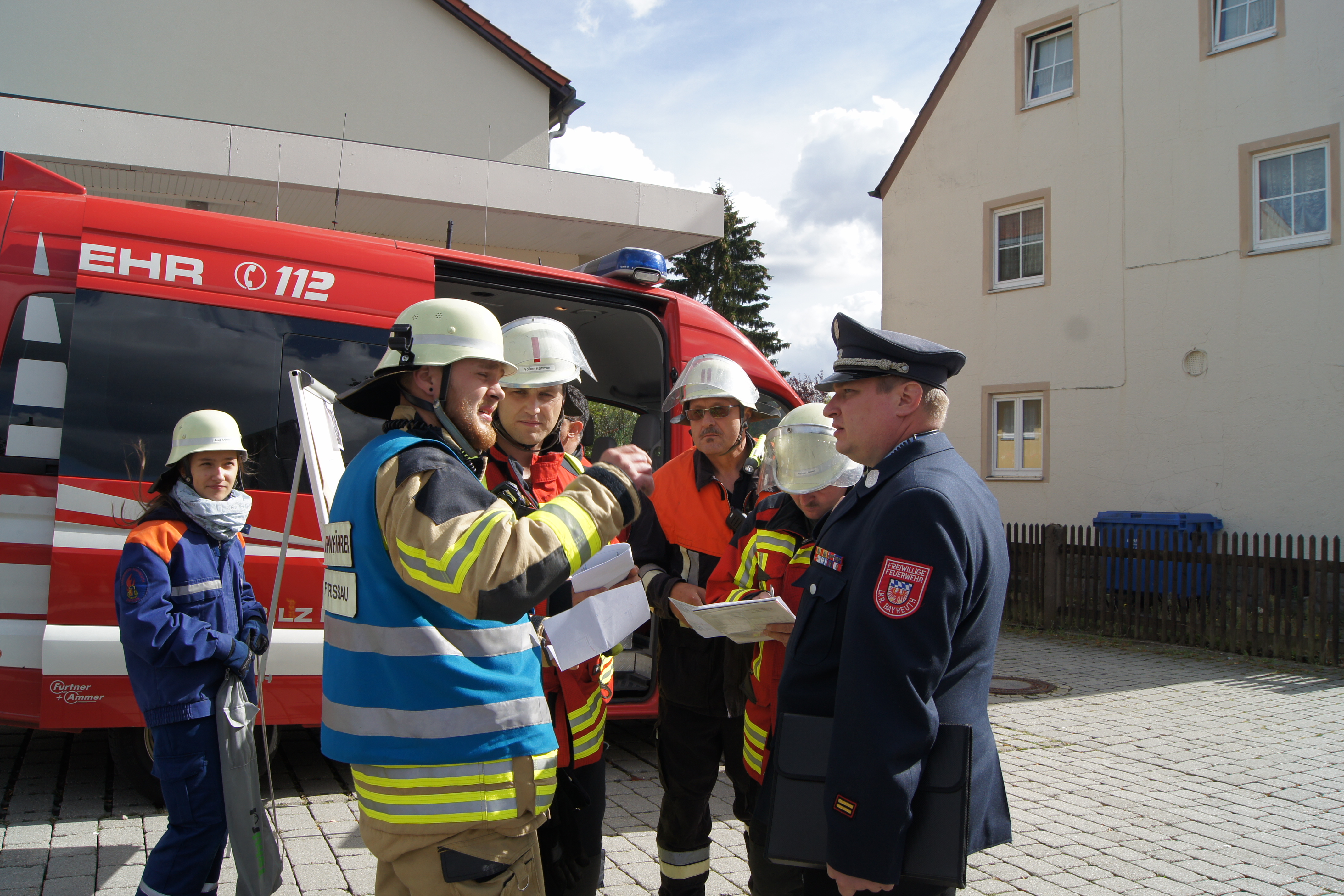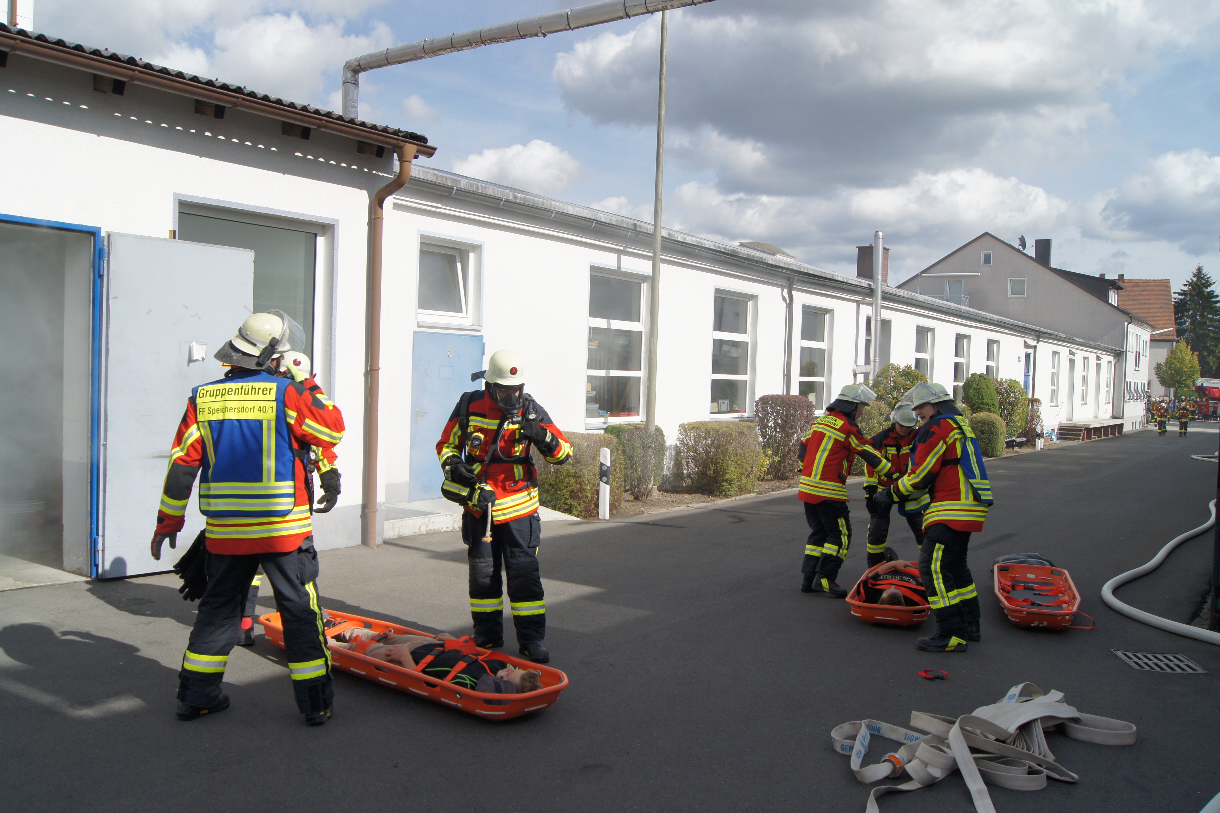 Die Übung im Rahmen der Feuerwehraktionswoche fand am Samstag Nachmittag in der Inspektion IV in Speichersdorf statt. Dort war man bei der Firma Friedrich Richter Meßwerkzeugfabrik GmbH & Co. KG in der Hauptstraße davon ausgegangen, dass es zu einem Unfall in der Färberei gekommen ist, in dessen Zuge es zu einem Feuer gekommen ist. Mehrere Mitarbeiter seien vermisst, das Feuer habe sich schnell auf weitere Teile der Firma ausgebreitet, zwei Hallen stünden in Vollbrand. Vermisst würden ca.5 Mitarbeiter, Chemikalien seien in größeren Mengen vorhanden, so das anspruchsvolle Szenario, das die Feuerwehren Speichersdorf, Kirchenlaibach, Weidenberg, Seybothenreuth, Kemnath, Tressau, Windischenlaibach, Göppmannsbühl, Plössen, Zeulenreuth, der Löschzug Frankenpfalz sowie die Fachberater des THW Pegnitz und die zuständigen Feuerwehrführungskräfte abzuarbeiten hatten. Landrat Hermann Hübner und Bürgermeister Manfred Porsch machten sich zusammen mit Kreisbrandrat Hermann Schreck und Kreisbrandinspektorin Kerstin Schmidt vor Ort ein Bild von der Lage. Die Einsatzleitung hatte Speichersdorfs Kommandant Volker Hammon inne, der von allen Seiten Lob für die Einsatzabarbeitung erhielt.