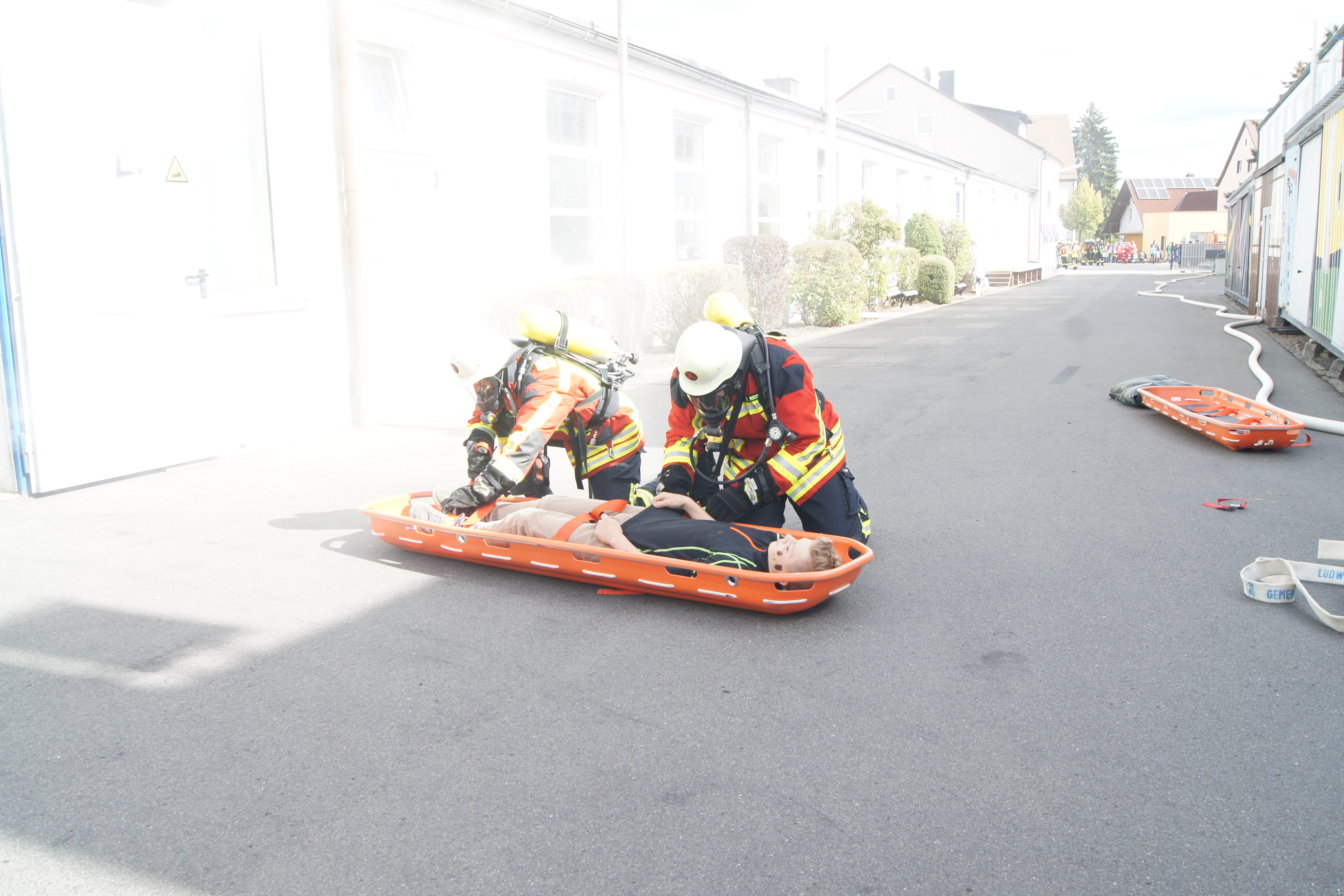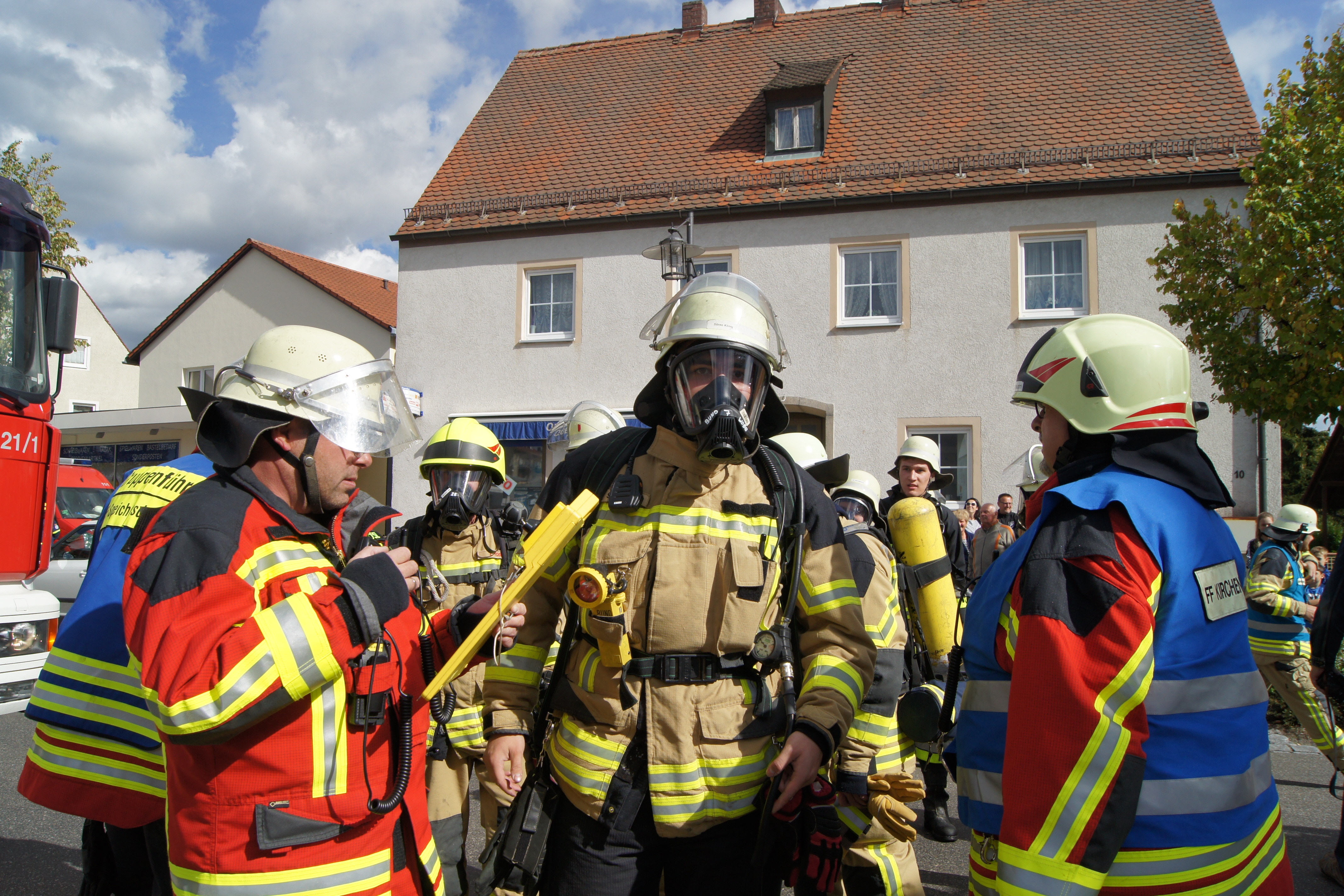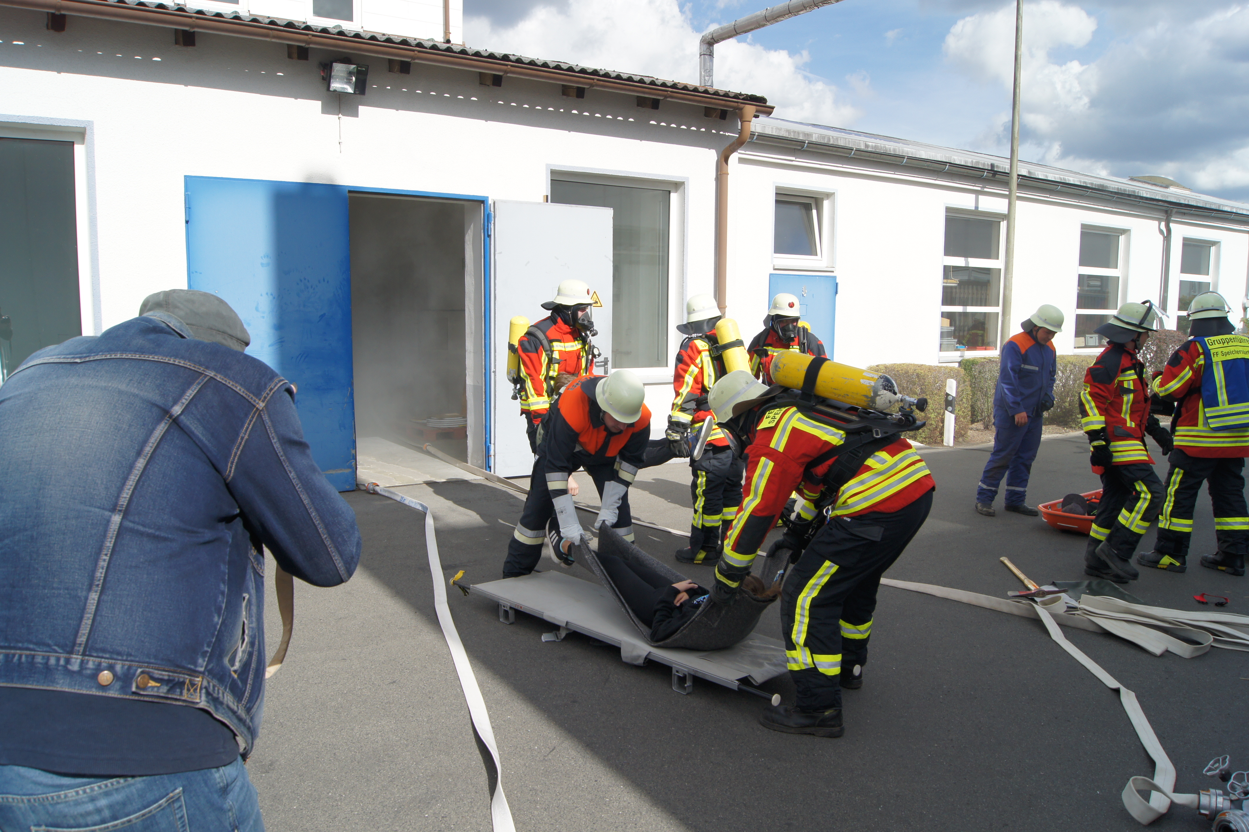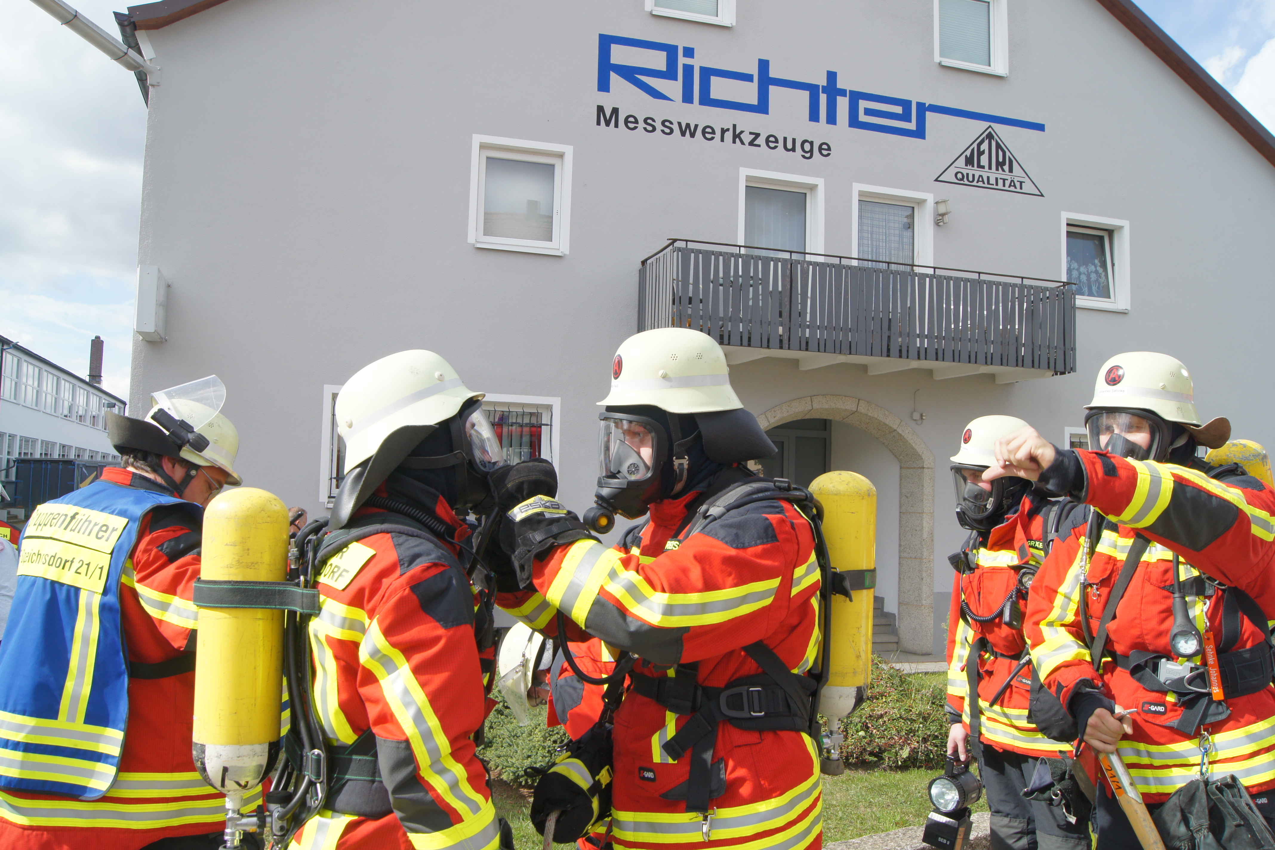 Die Übung im Rahmen der Feuerwehraktionswoche fand am Samstag Nachmittag in der Inspektion IV in Speichersdorf statt. Dort war man bei der Firma Friedrich Richter Meßwerkzeugfabrik GmbH & Co. KG in der Hauptstraße davon ausgegangen, dass es zu einem Unfall in der Färberei gekommen ist, in dessen Zuge es zu einem Feuer gekommen ist. Mehrere Mitarbeiter seien vermisst, das Feuer habe sich schnell auf weitere Teile der Firma ausgebreitet, zwei Hallen stünden in Vollbrand. Vermisst würden ca.5 Mitarbeiter, Chemikalien seien in größeren Mengen vorhanden, so das anspruchsvolle Szenario, das die Feuerwehren Speichersdorf, Kirchenlaibach, Weidenberg, Seybothenreuth, Kemnath, Tressau, Windischenlaibach, Göppmannsbühl, Plössen, Zeulenreuth, der Löschzug Frankenpfalz sowie die Fachberater des THW Pegnitz und die zuständigen Feuerwehrführungskräfte abzuarbeiten hatten. Landrat Hermann Hübner und Bürgermeister Manfred Porsch machten sich zusammen mit Kreisbrandrat Hermann Schreck und Kreisbrandinspektorin Kerstin Schmidt vor Ort ein Bild von der Lage. Die Einsatzleitung hatte Speichersdorfs Kommandant Volker Hammon inne, der von allen Seiten Lob für die Einsatzabarbeitung erhielt.
