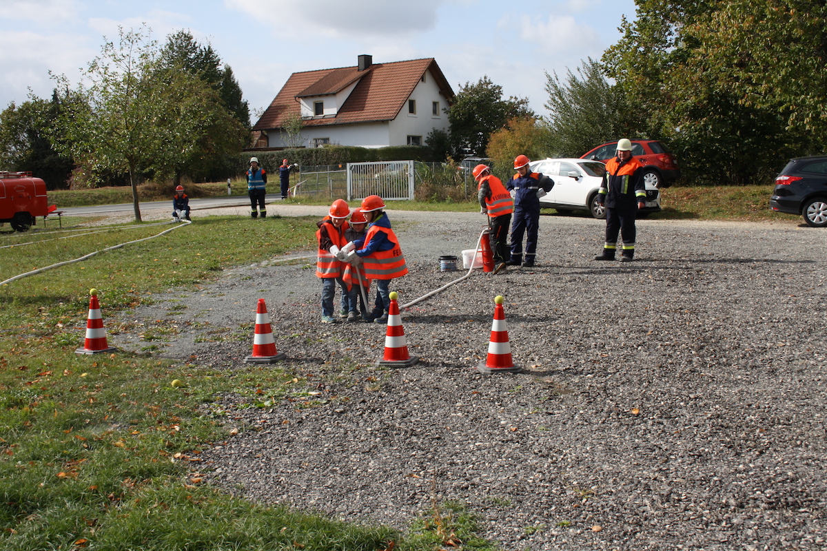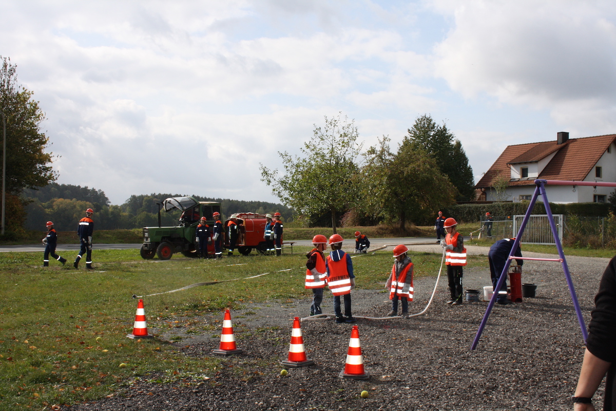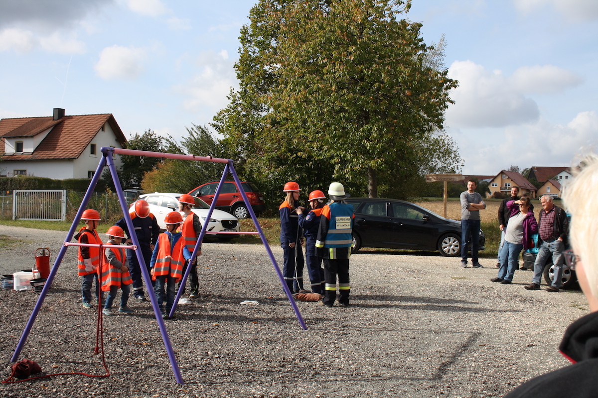 Unter der Leitung von Kommandant Johannes Teufel und Betreuerin Julia Teufel zeigten die Jugendlichen und Kinder ihr feuerwehrtechnisches Können. Die Jugendlichen legten eine Schlauchleitung mit zwei C-Rohren und gaben den Befehl „Wasser marsch“. Die Kinder bauten ihre Schlauchleitung mit der Kübelspritze und D-Rohr auf.