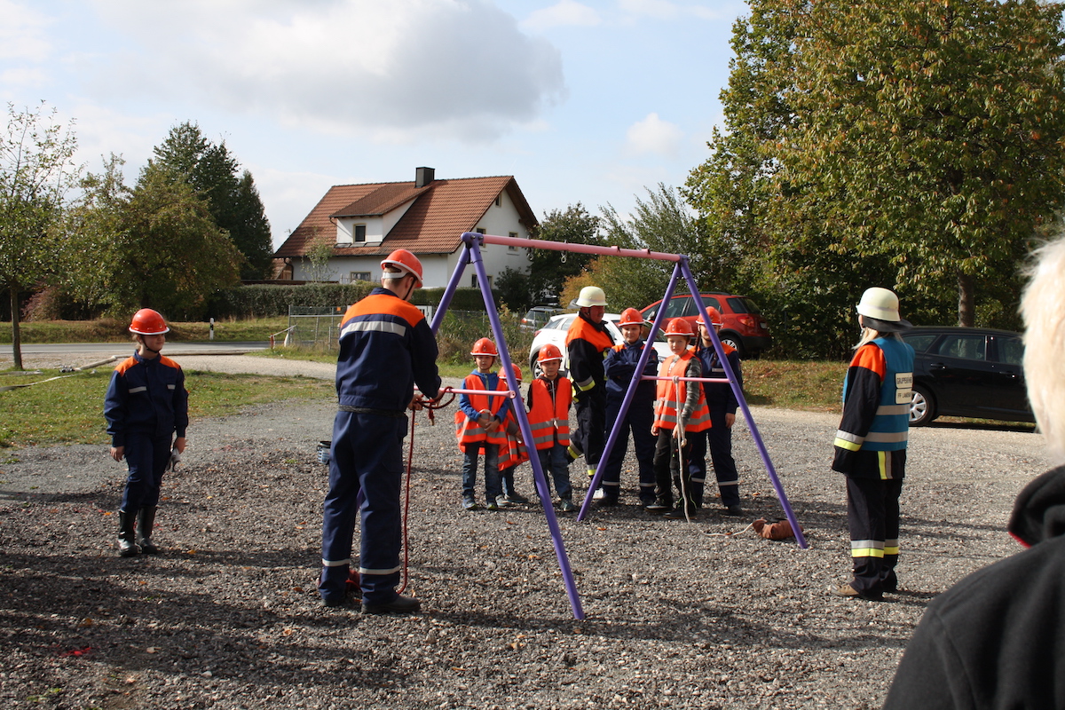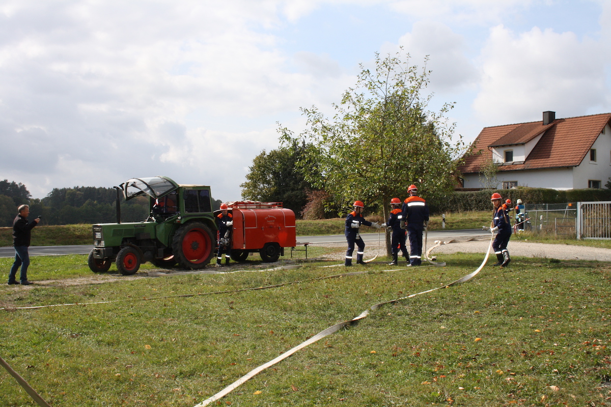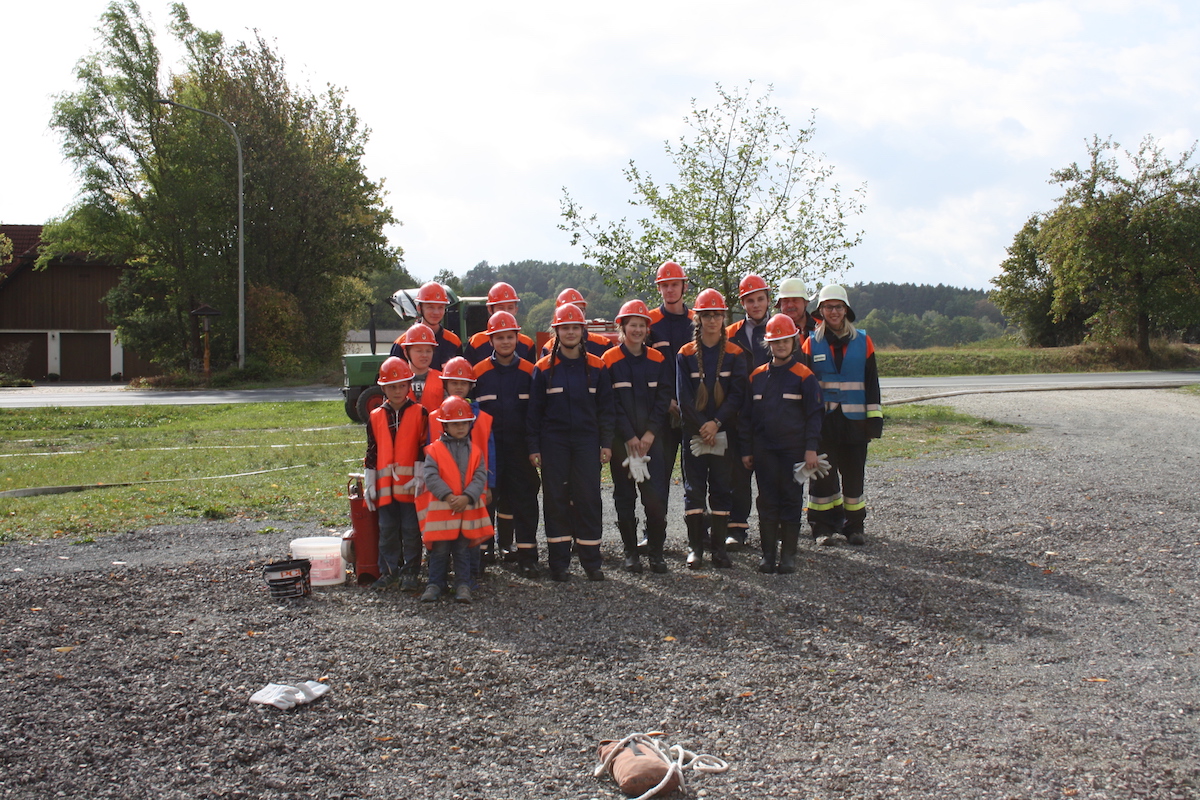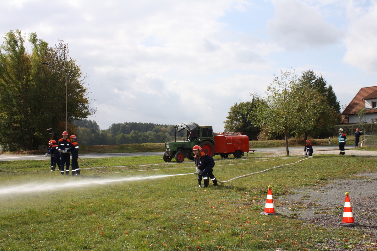 Unter der Leitung von Kommandant Johannes Teufel und Betreuerin Julia Teufel zeigten die Jugendlichen und Kinder ihr feuerwehrtechnisches Können. Die Jugendlichen legten eine Schlauchleitung mit zwei C-Rohren und gaben den Befehl „Wasser marsch“. Die Kinder bauten ihre Schlauchleitung mit der Kübelspritze und D-Rohr auf.