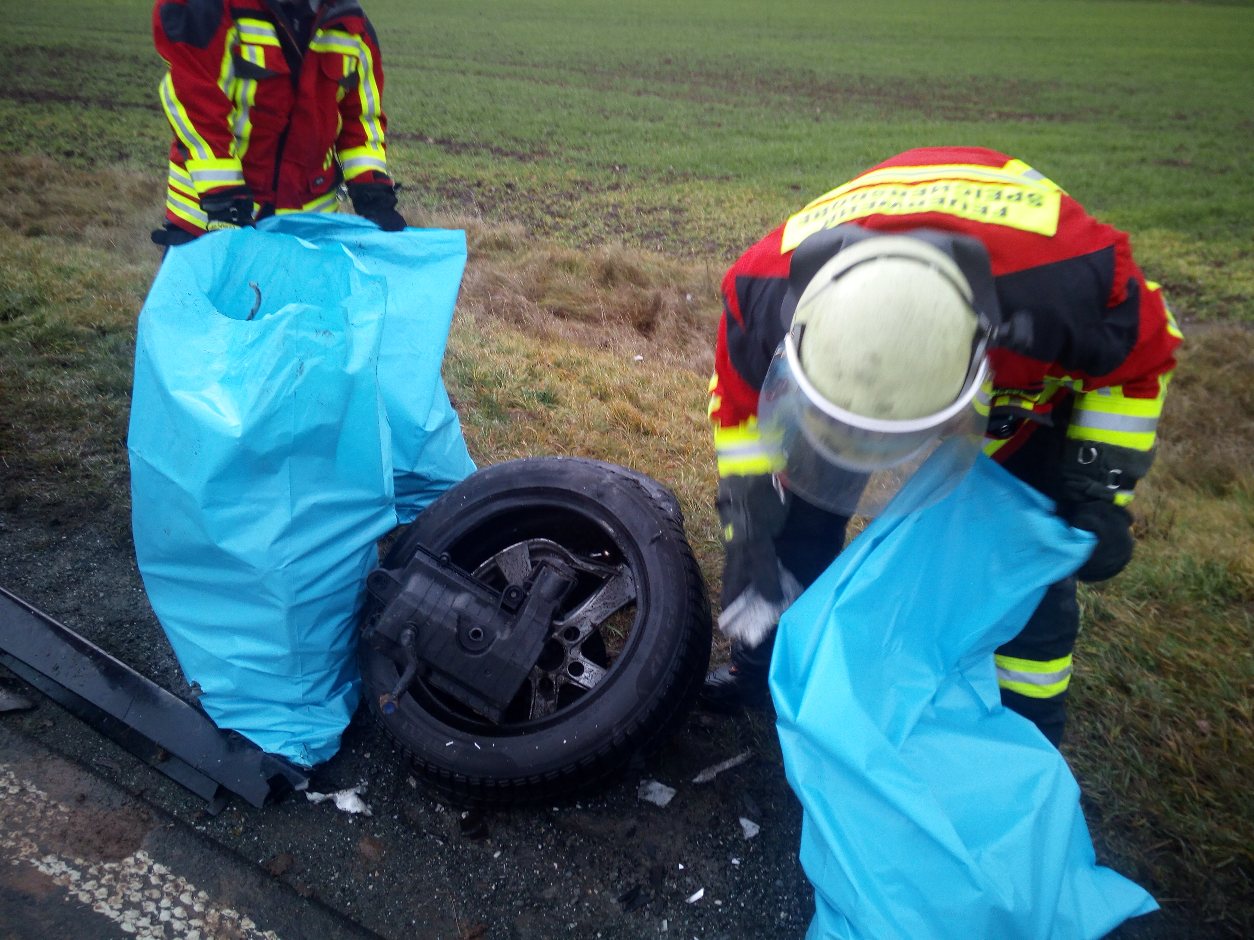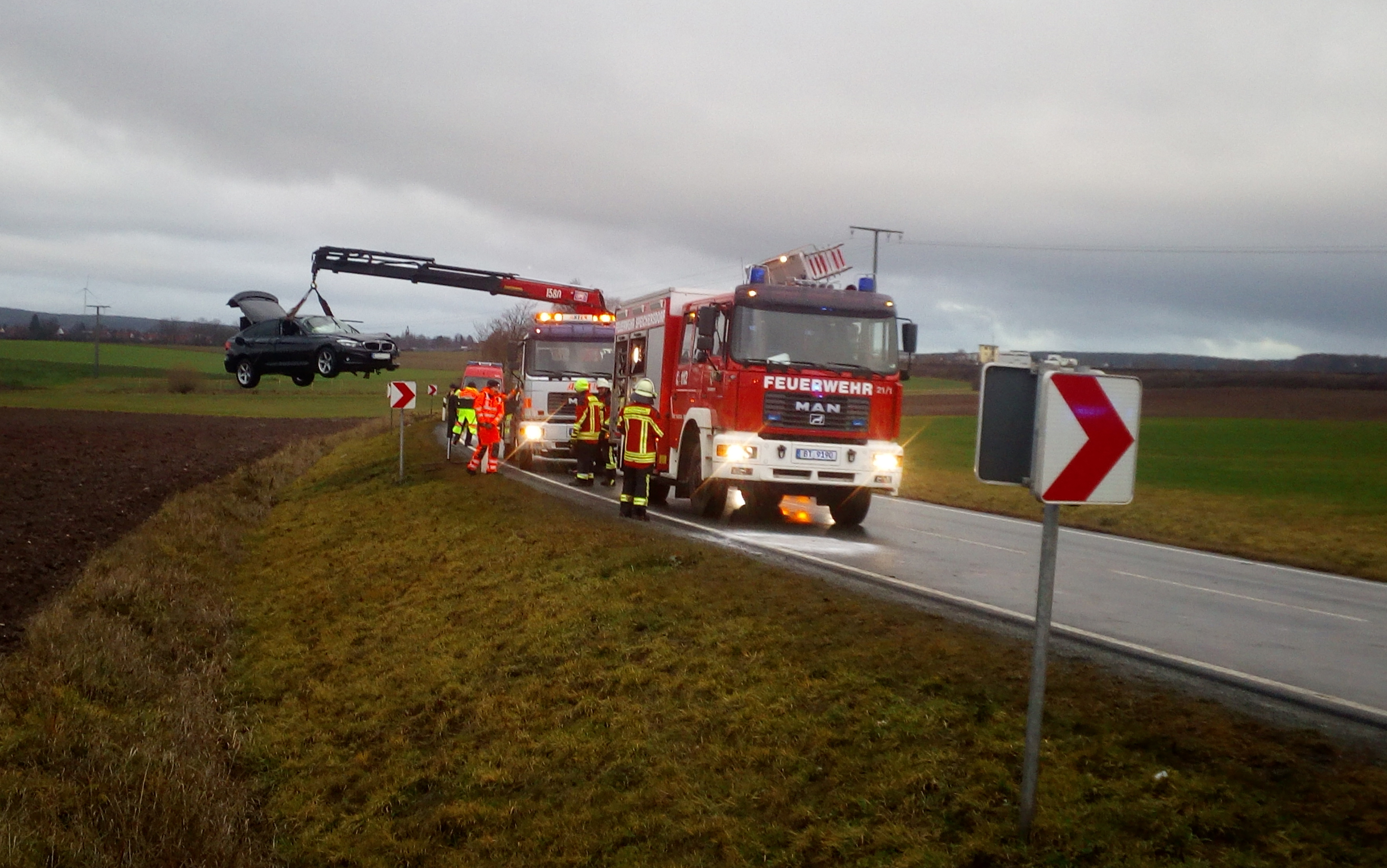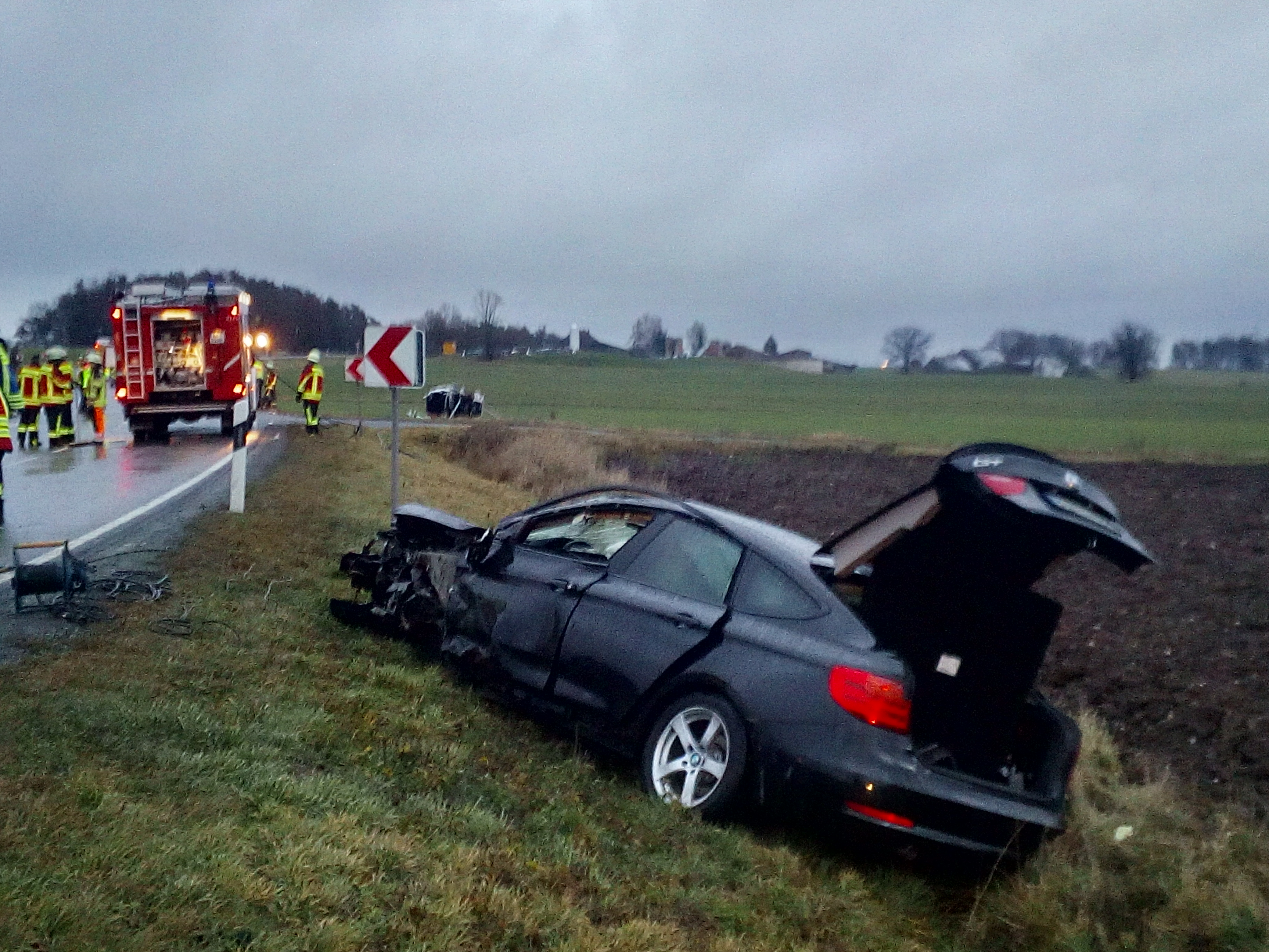Die ersten Einsatzkräfte der Feuerwehr fanden zwei PKWs vor, die im Graben, bzw. im Acker lagen. Beide Fahrzeuge waren im Frontbereich stark beschädigt und eine Person war in dem auf der Seite liegenden Audi eingeklemmt. Eine Person des gegnerischen BMWs konnte sich aus eigener Kraft befreien. Die eingeklemmte Fahrerin des Audis wurde nach Anweisung des Notarztes patientengerecht aus den Fahrzeug gerettet. Hierzu wurde das Dach des Autos entfernt, das Fahrzeug wurde während der Rettungsaktion mit Bolzen stabilisiert. Alle zwei Insassen wurden dem BRK zur weiteren Versorgung übergeben und anschließend mit leichten bis schweren Verletzungen in ein Krankenhaus transportiert.