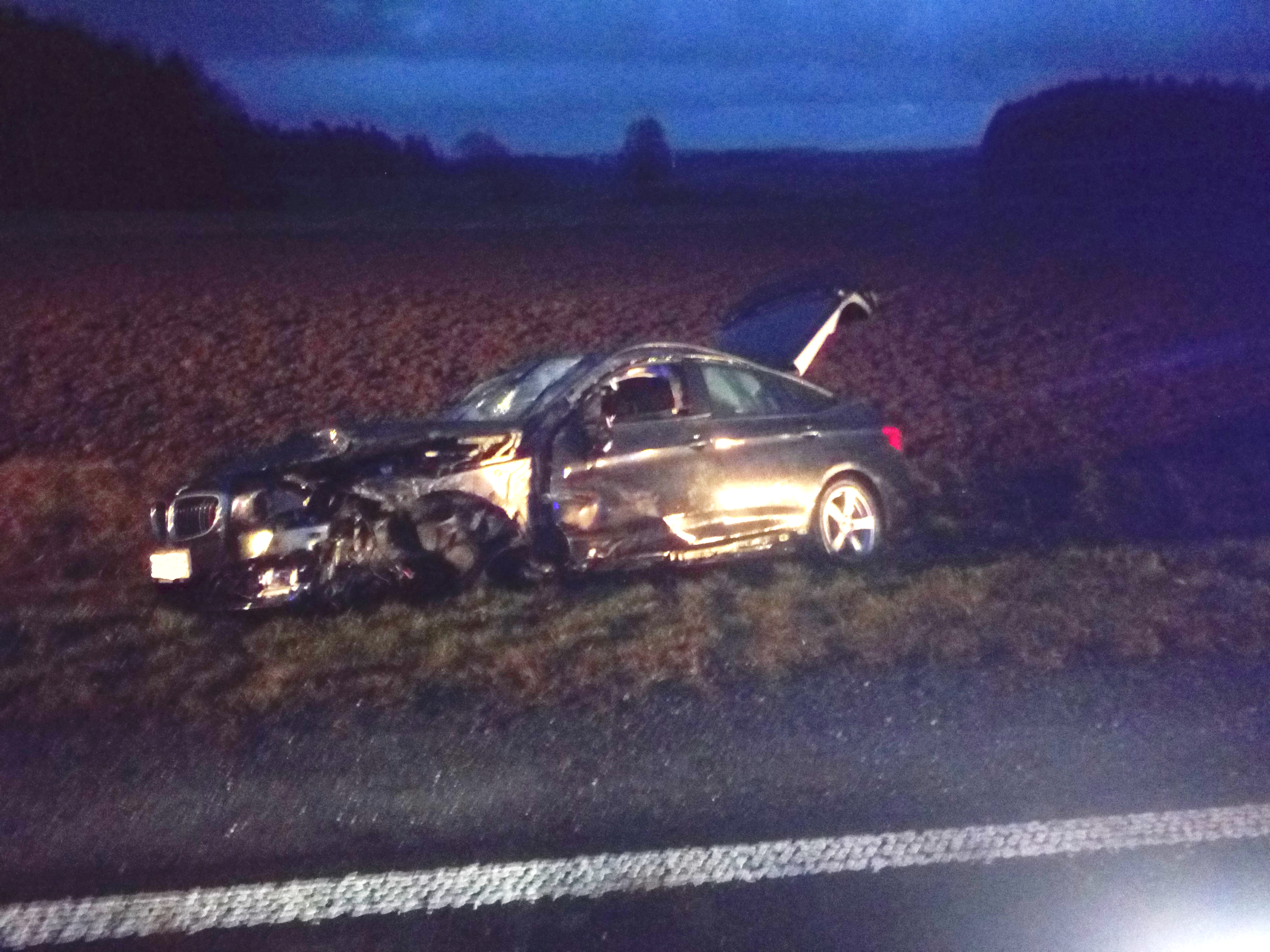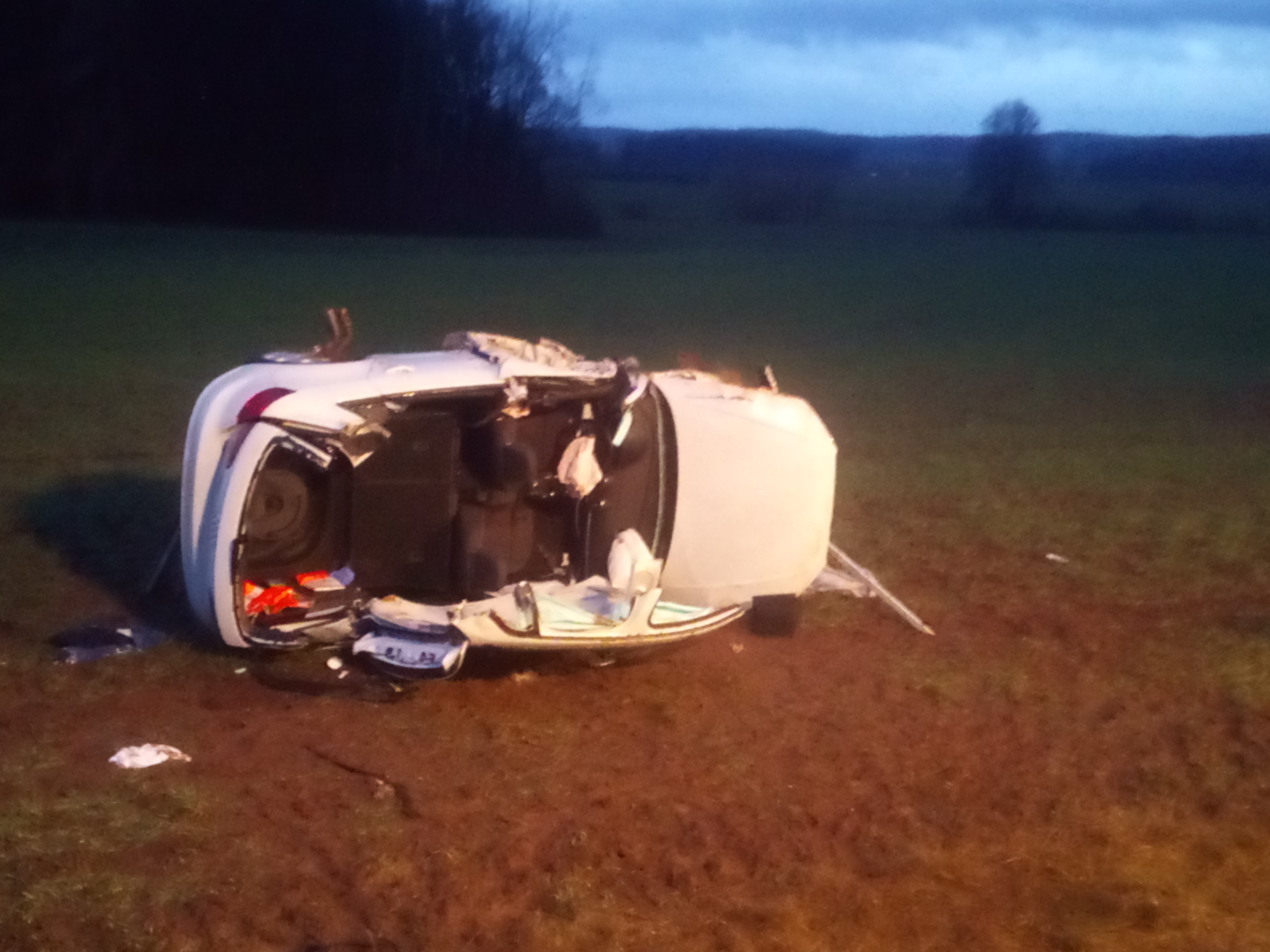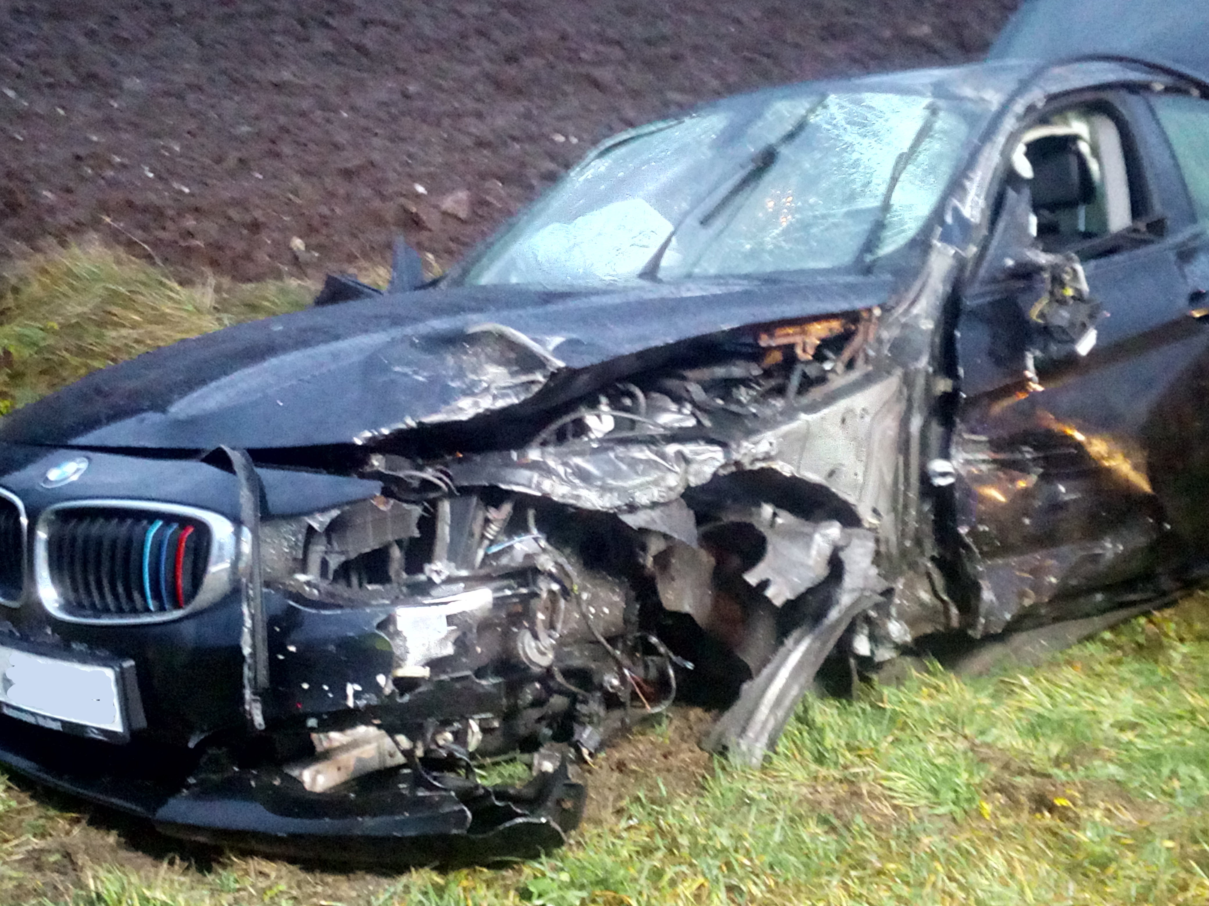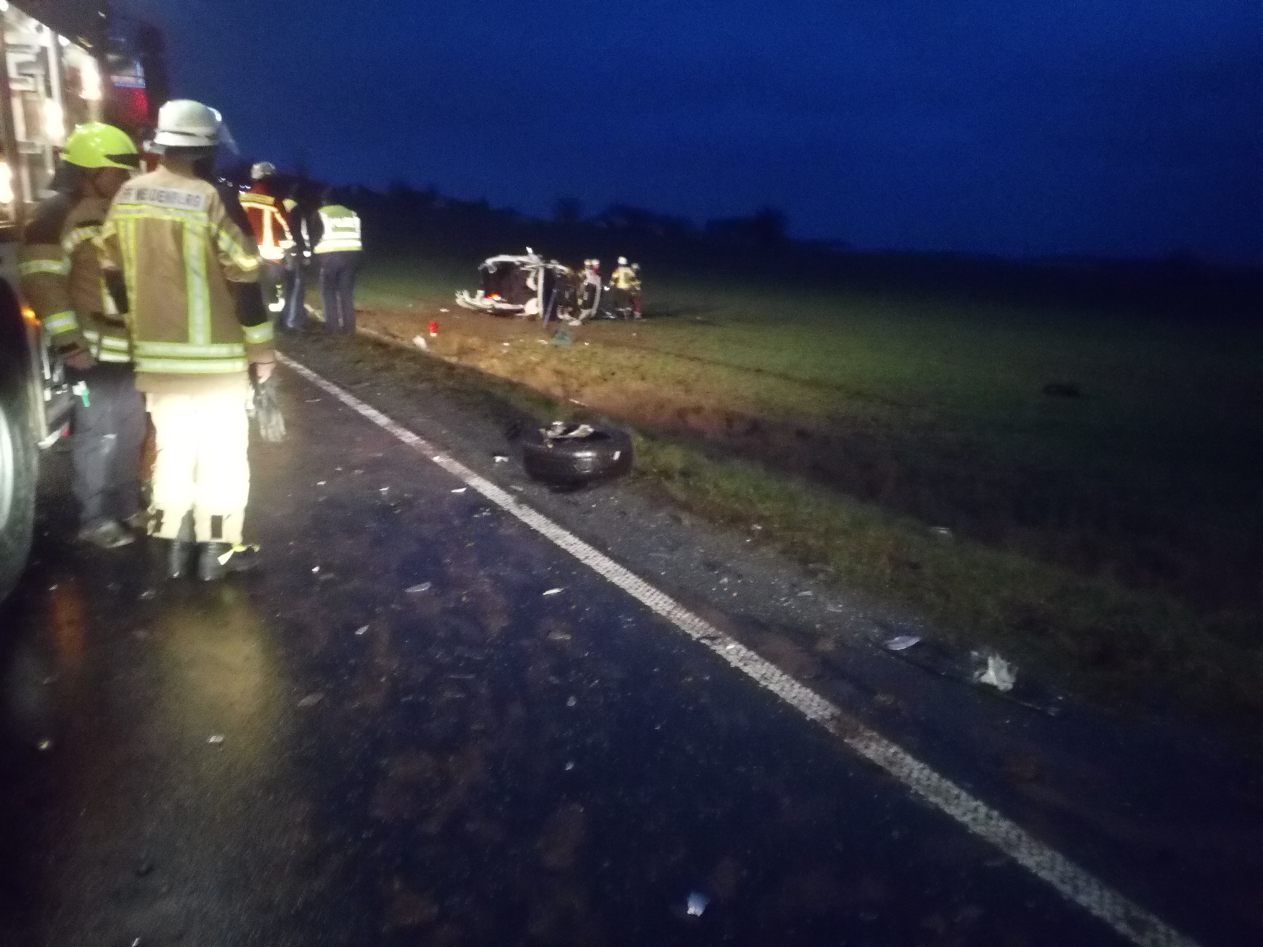 Die ersten Einsatzkräfte der Feuerwehr fanden zwei PKWs vor, die im Graben, bzw. im Acker lagen. Beide Fahrzeuge waren im Frontbereich stark beschädigt und eine Person war in dem auf der Seite liegenden Audi eingeklemmt. Eine Person des gegnerischen BMWs konnte sich aus eigener Kraft befreien. Die eingeklemmte Fahrerin des Audis wurde nach Anweisung des Notarztes patientengerecht aus den Fahrzeug gerettet. Hierzu wurde das Dach des Autos entfernt, das Fahrzeug wurde während der Rettungsaktion mit Bolzen stabilisiert. Alle zwei Insassen wurden dem BRK zur weiteren Versorgung übergeben und anschließend mit leichten bis schweren Verletzungen in ein Krankenhaus transportiert.