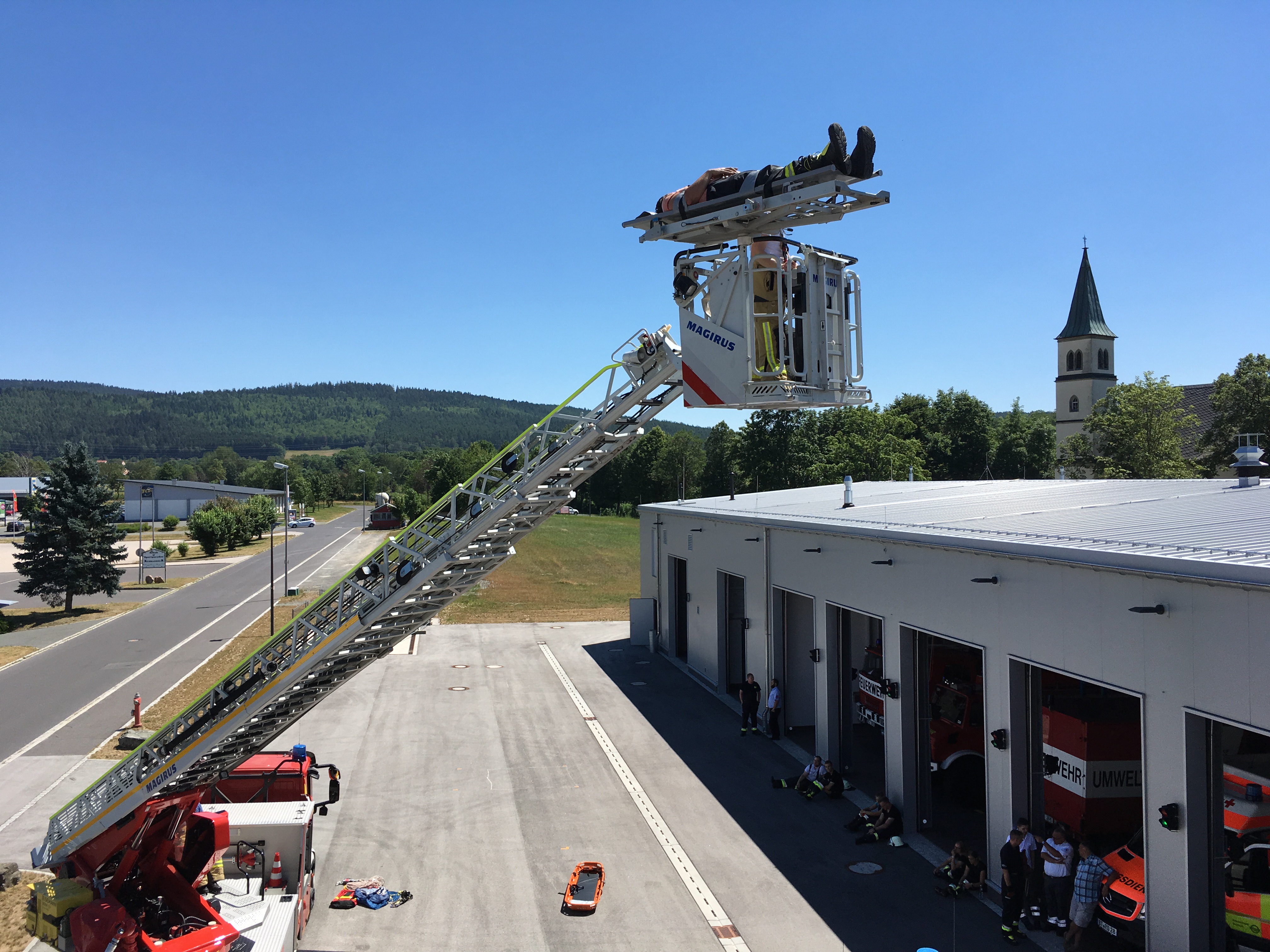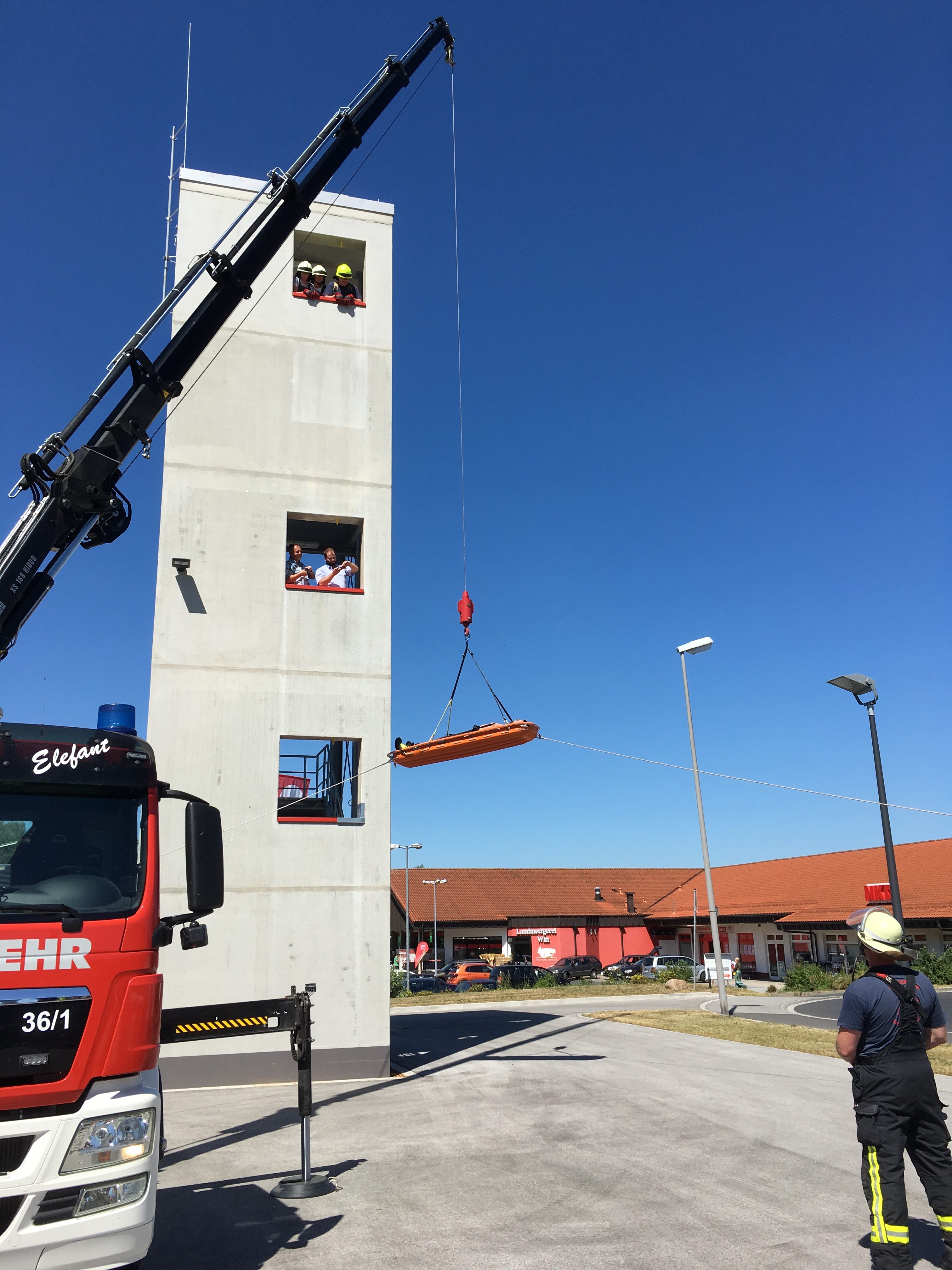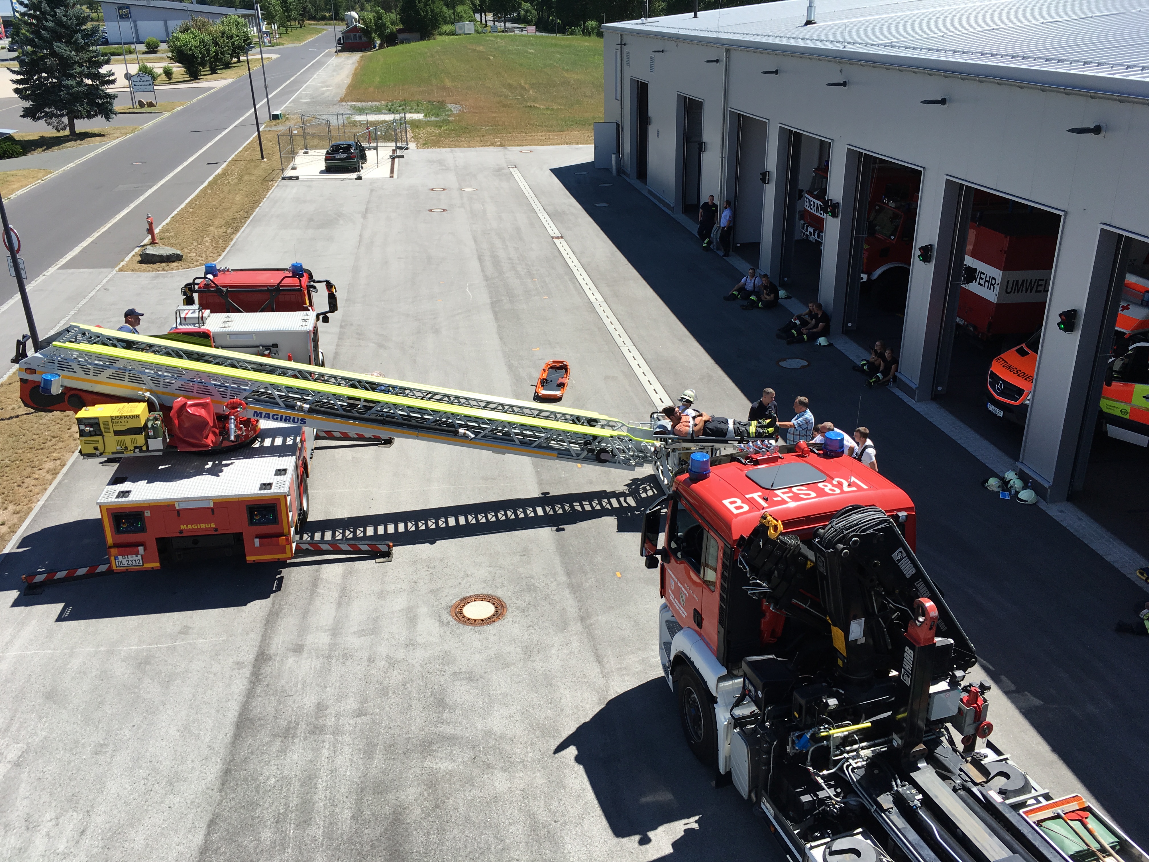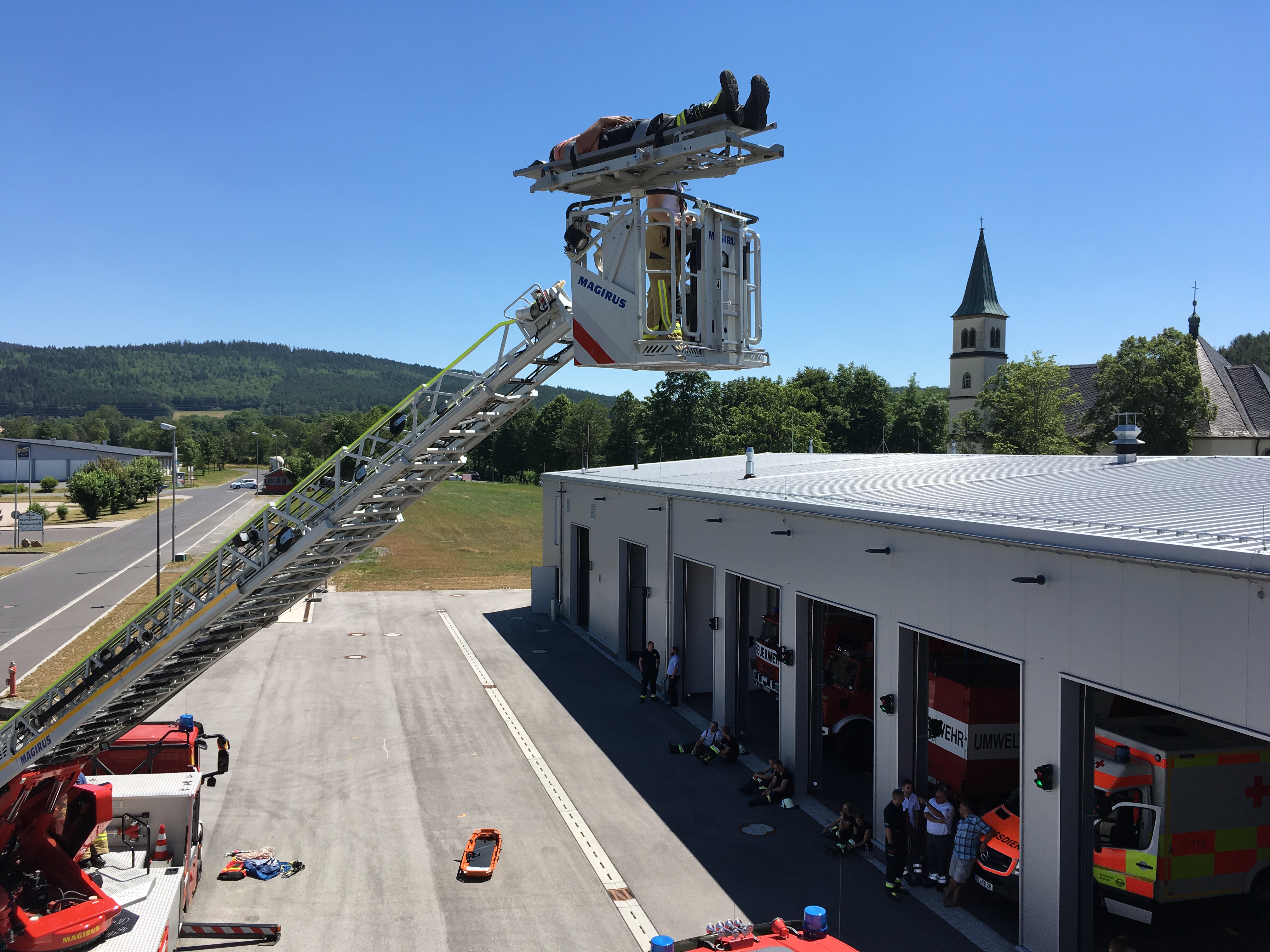 Im Praxisteil wurden verschiedene Rettungsmöglichkeiten über Drehleiter, Kran und Rollgliss vorgestellt und geprobt.