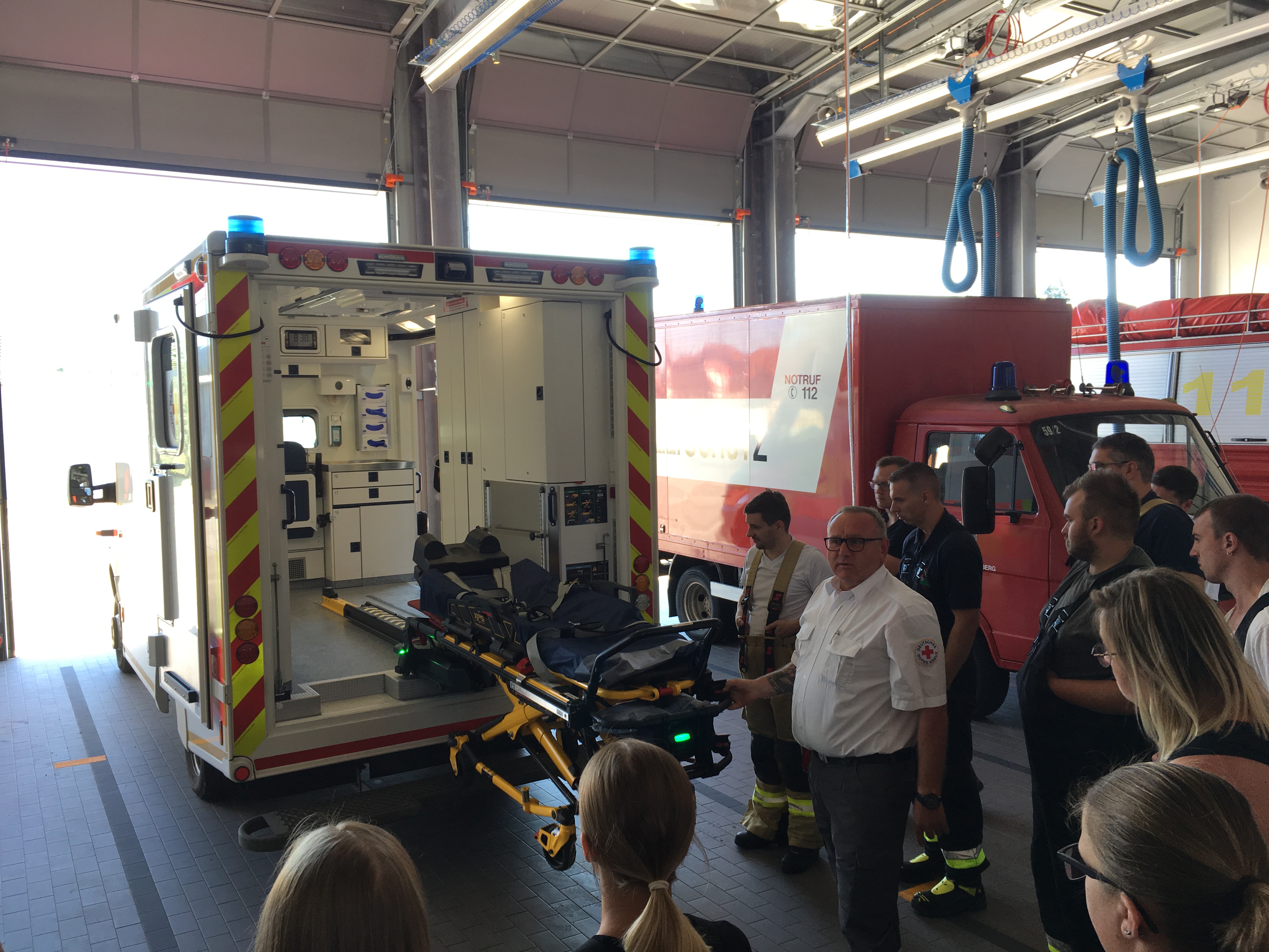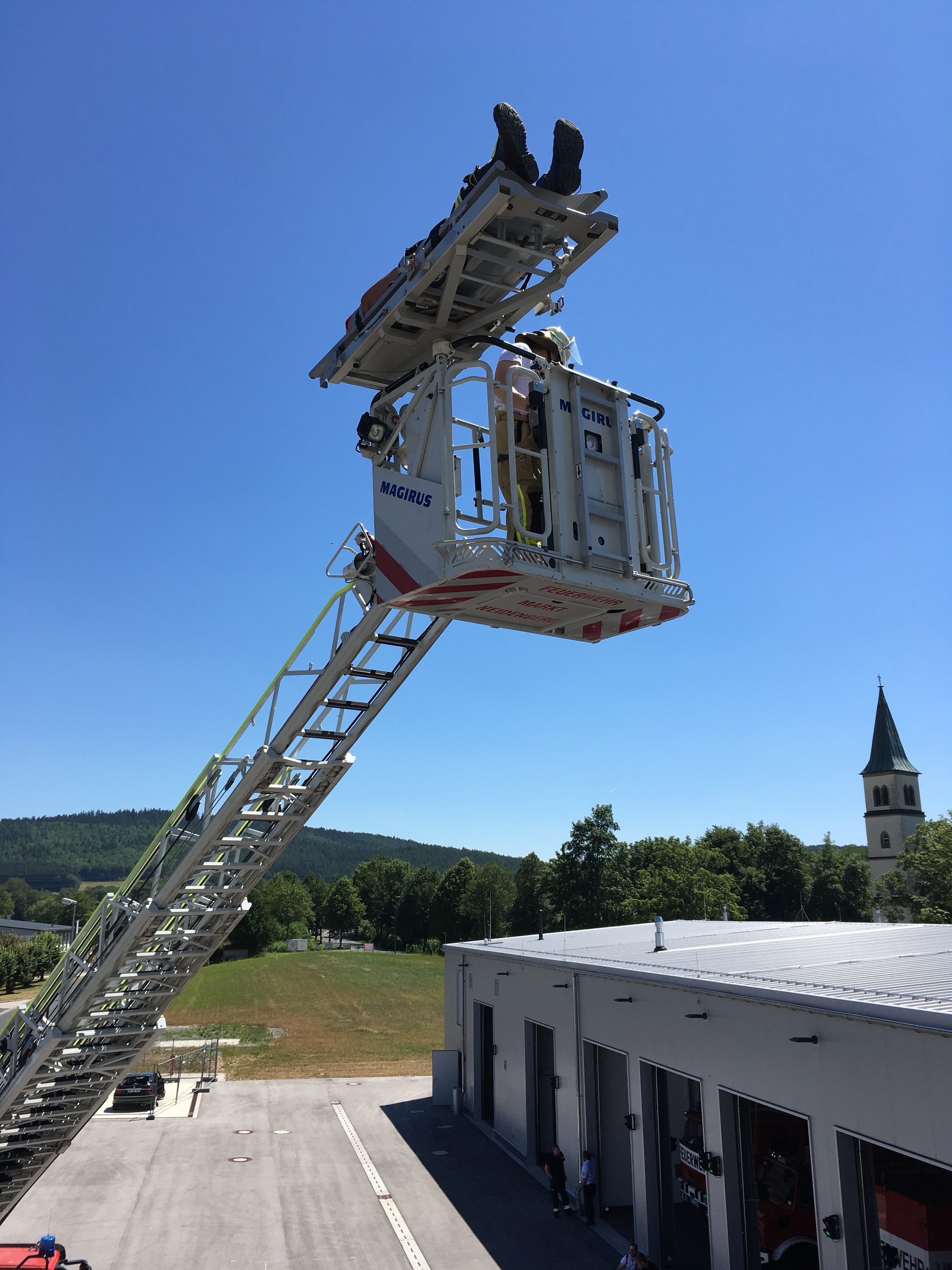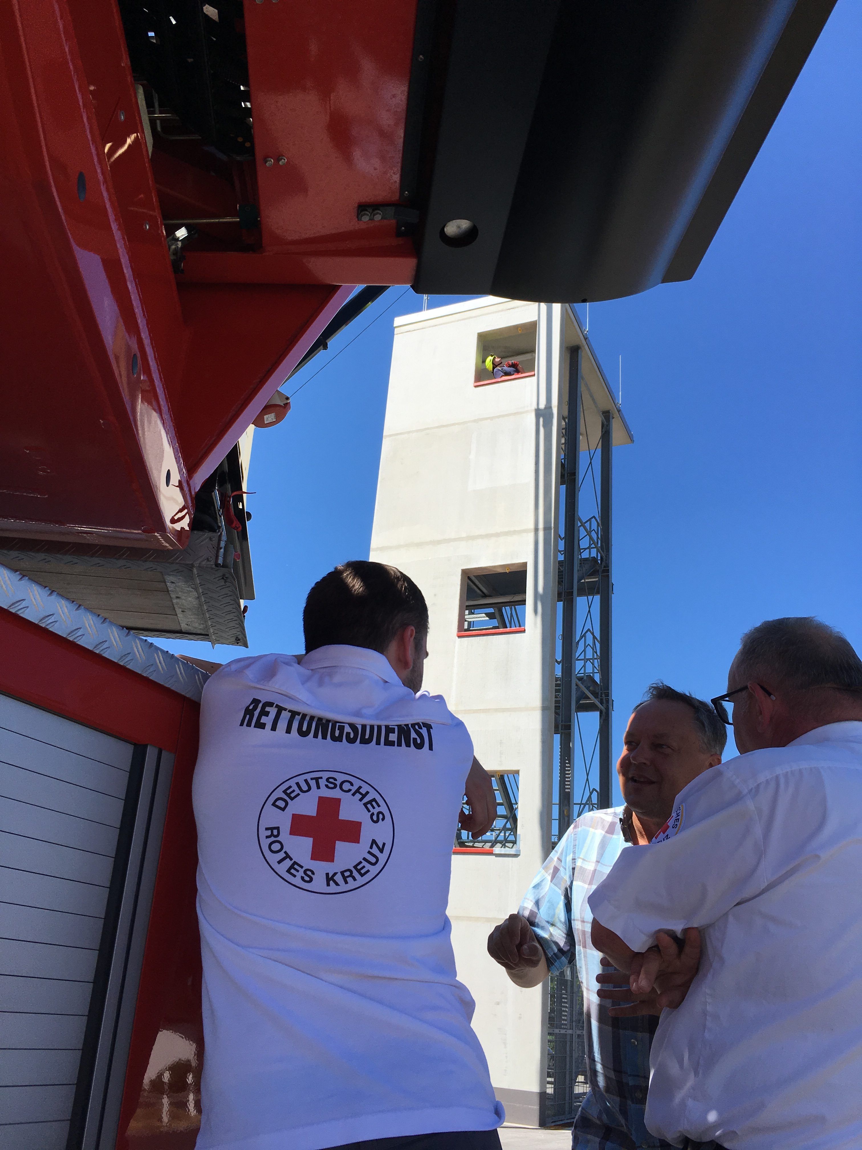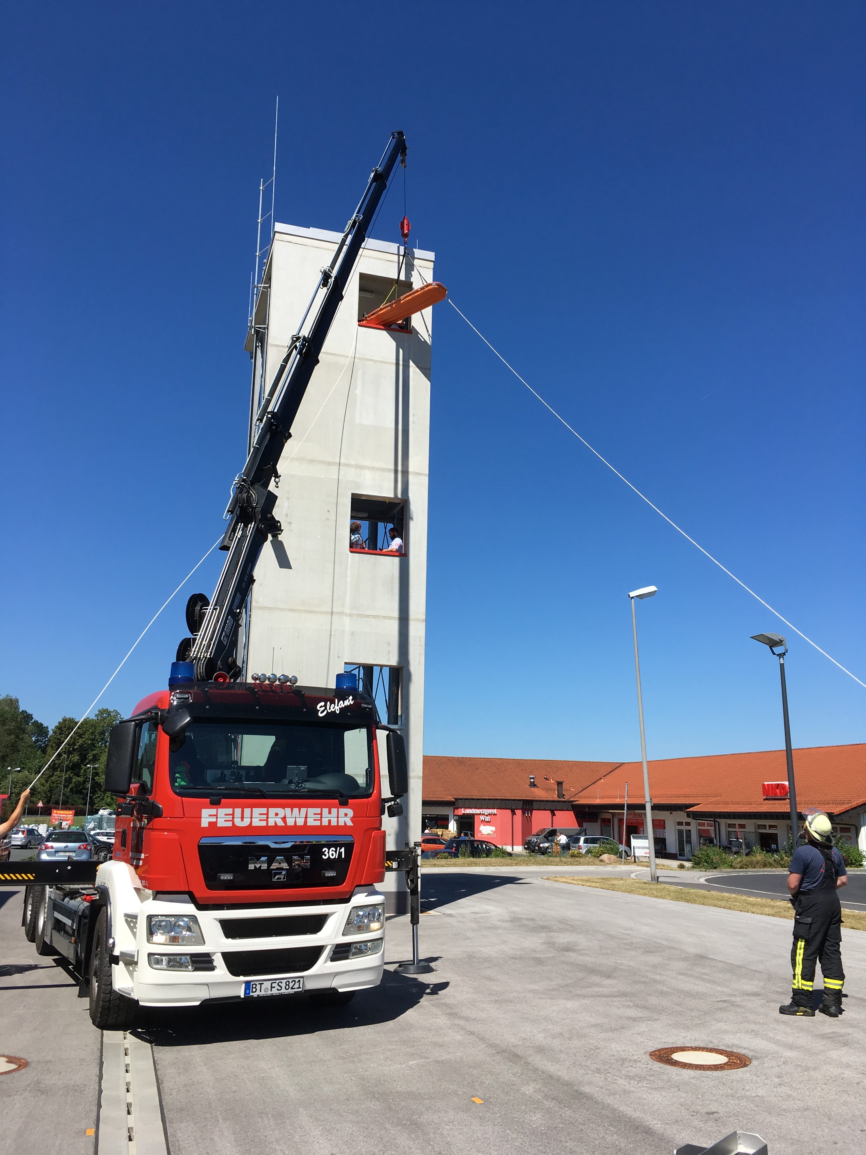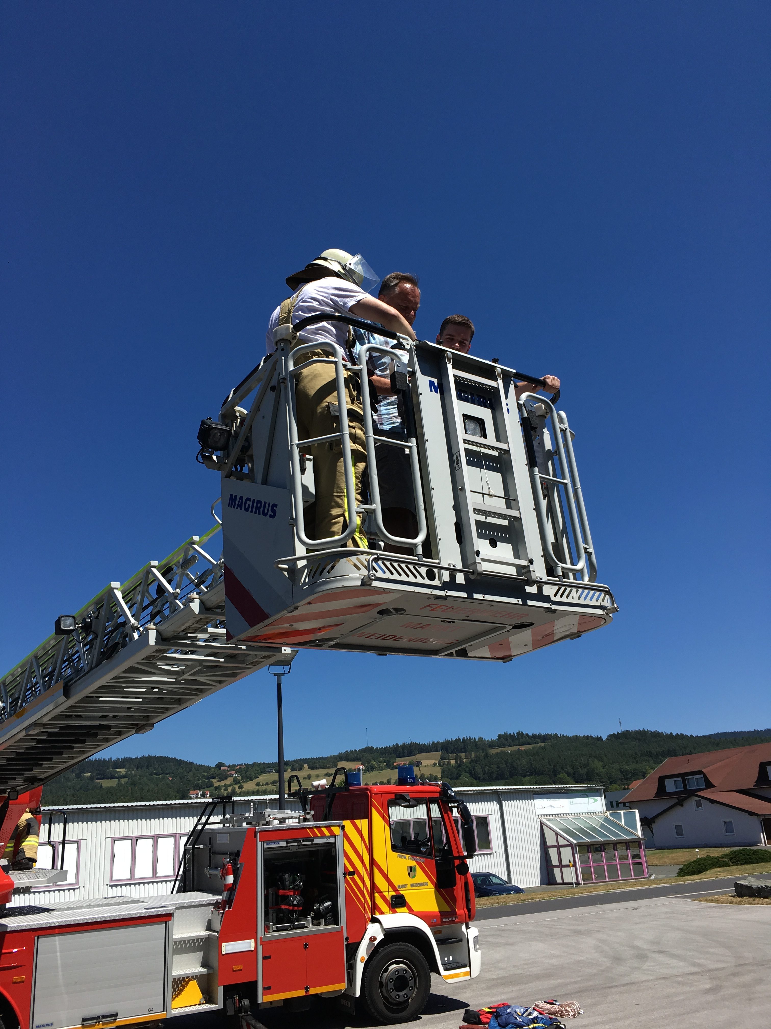 Im Praxisteil wurden verschiedene Rettungsmöglichkeiten über Drehleiter, Kran und Rollgliss vorgestellt und geprobt.