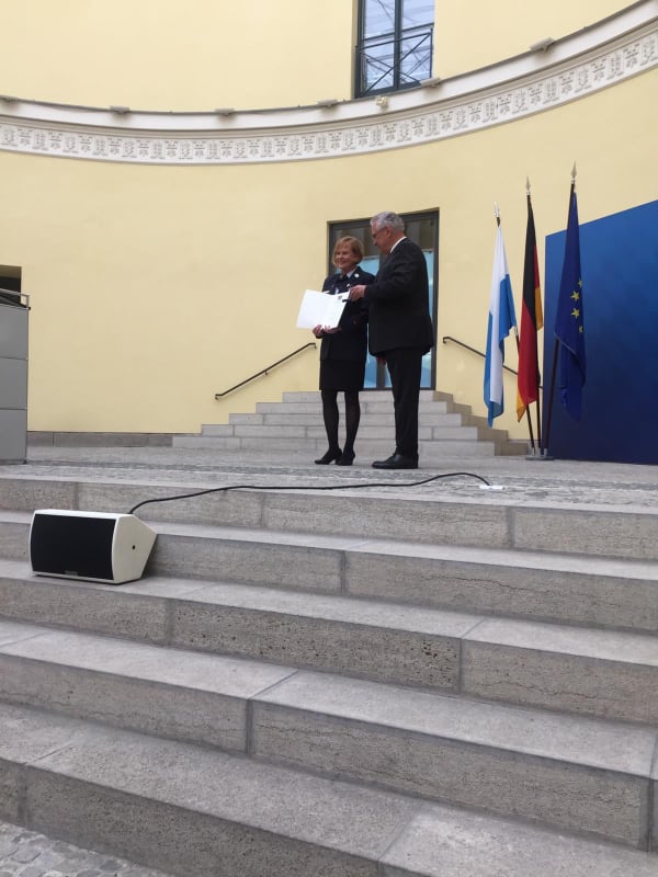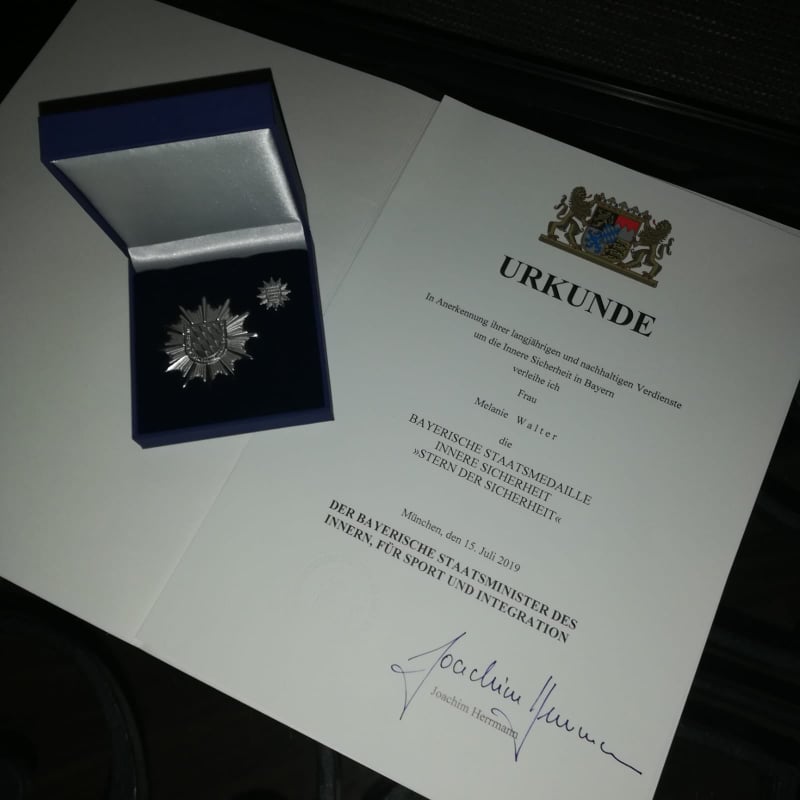 Melanie Walter aus Bischofsgrün hat in Anerkennung für ihre langjährigen und nachhaltigen Verdienste um die Innere Sicherheit in Bayern eine hohe Auszeichnung bekommen. Aus den Händen von Innenminister Joachim Herrmann erhielt sie am 16.07.2019 in München die Bayerische Staatsmedaille Innere Sicherheit „Stern der Sicherheit“ .