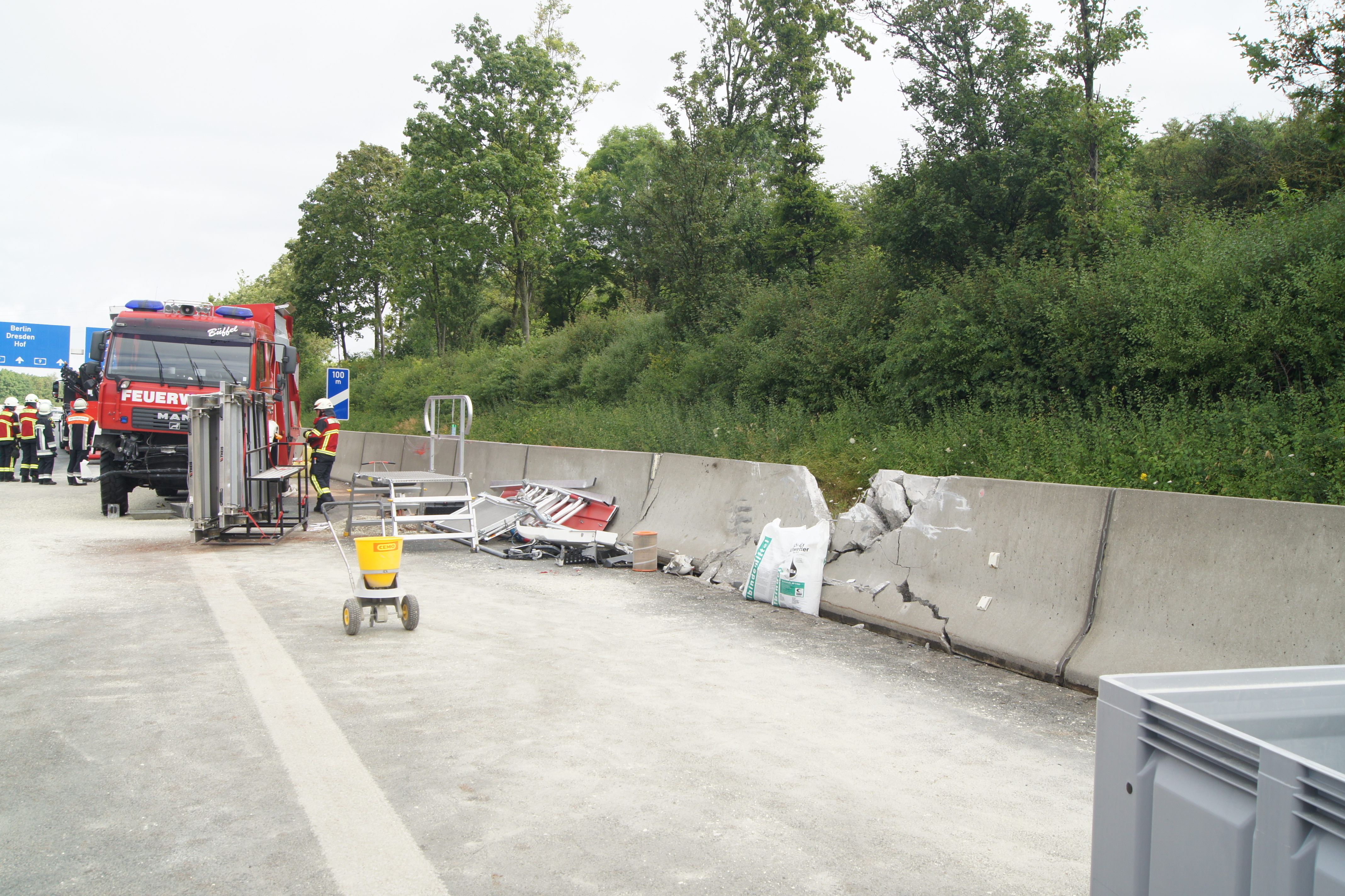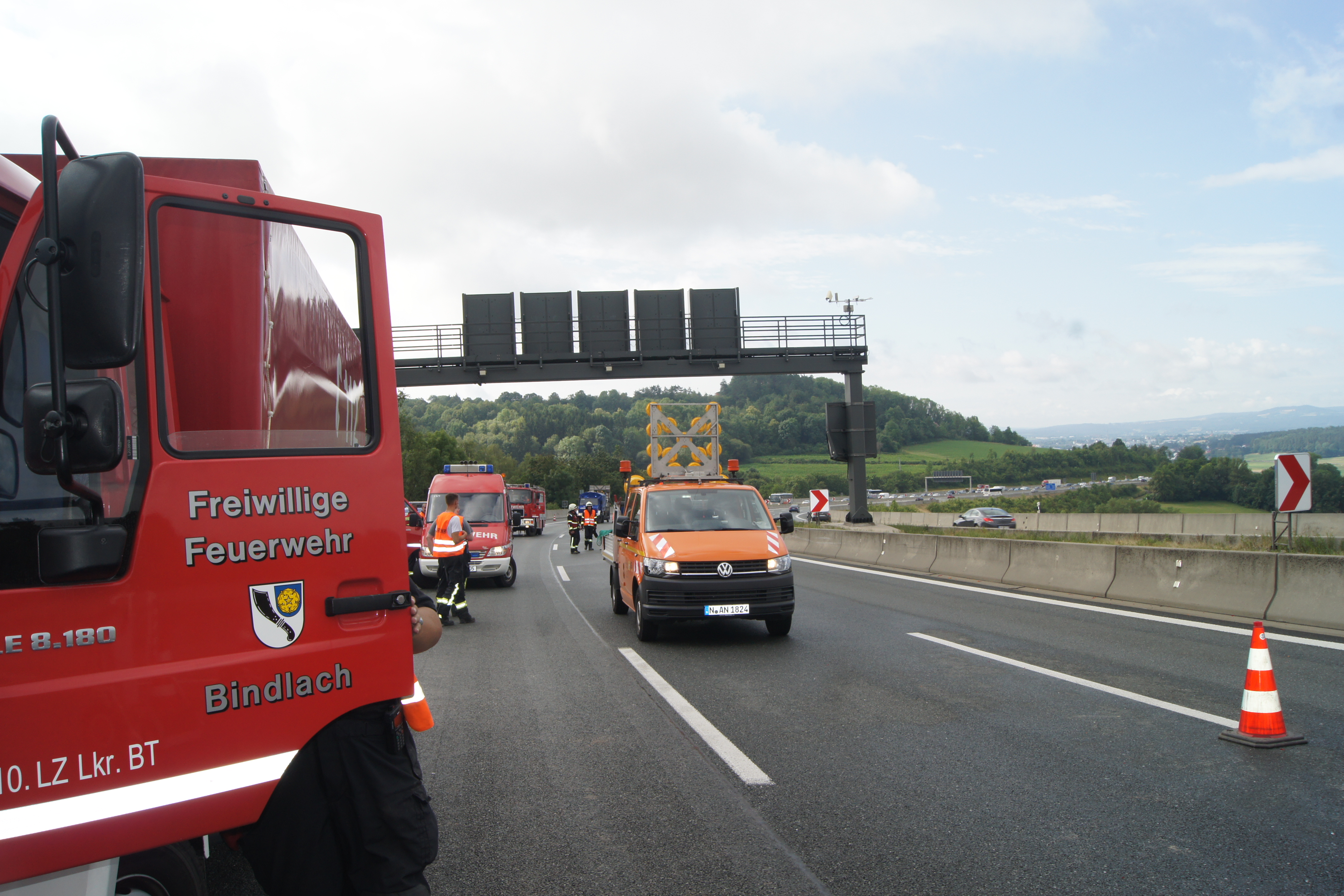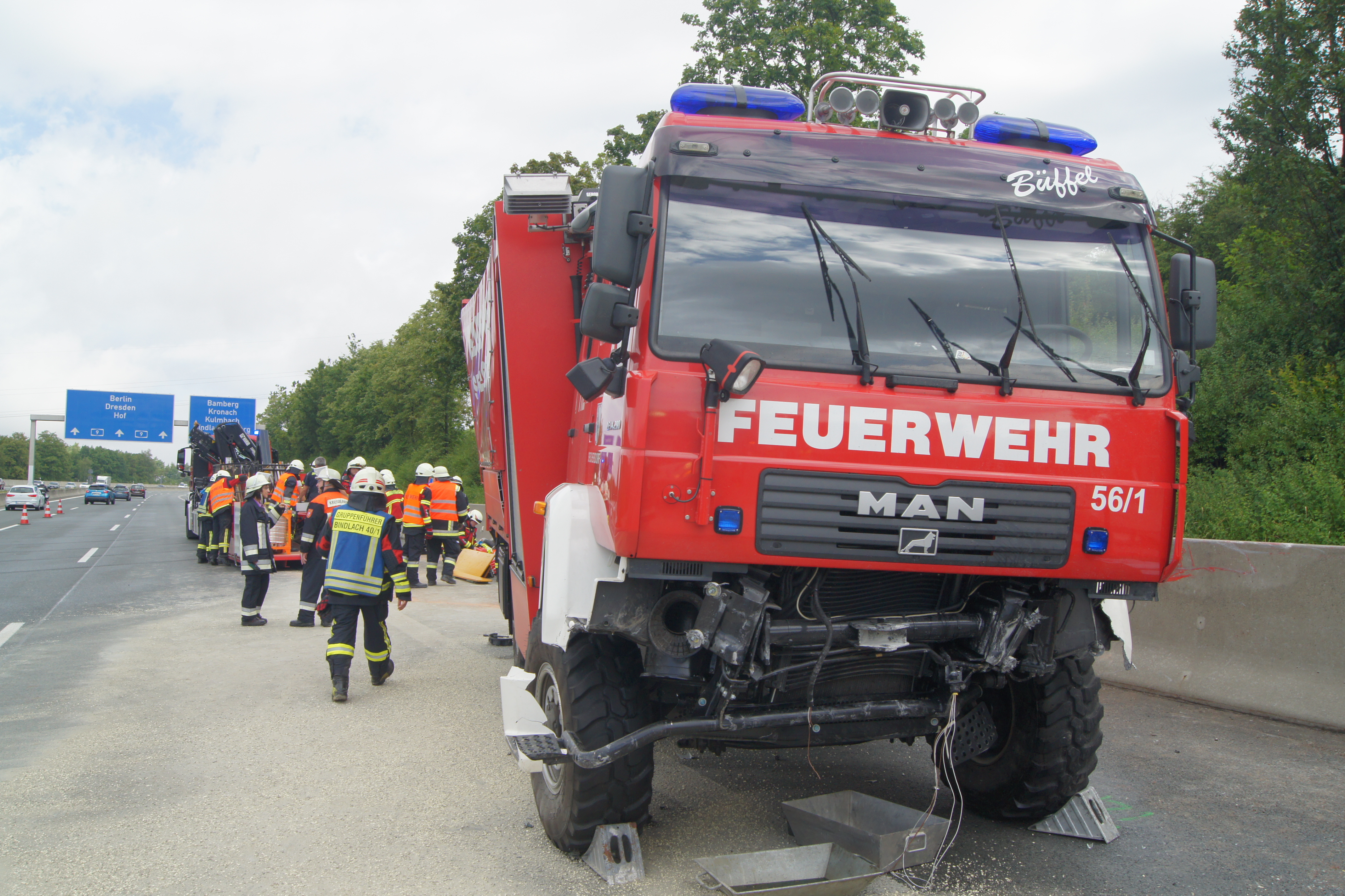Zu einem schweren Unfall mit einem Feuerwehrfahrzeug wurden die Ständige Wache Bayreuth, die Freiwillige Feuerwehr Bindlach, das THW sowie Rettungsdienst und Polizei am Morgen des 21.07.2019 alarmiert. Auf der BAB 9 in Fahrtrichtung Norden war kurz nach 8 Uhr wenige Hundert Meter vor der Ausfahrt Bindlacher Berg ein Fahrzeug der Freiwilligen Feuerwehr Speichersdorf verunglückt.