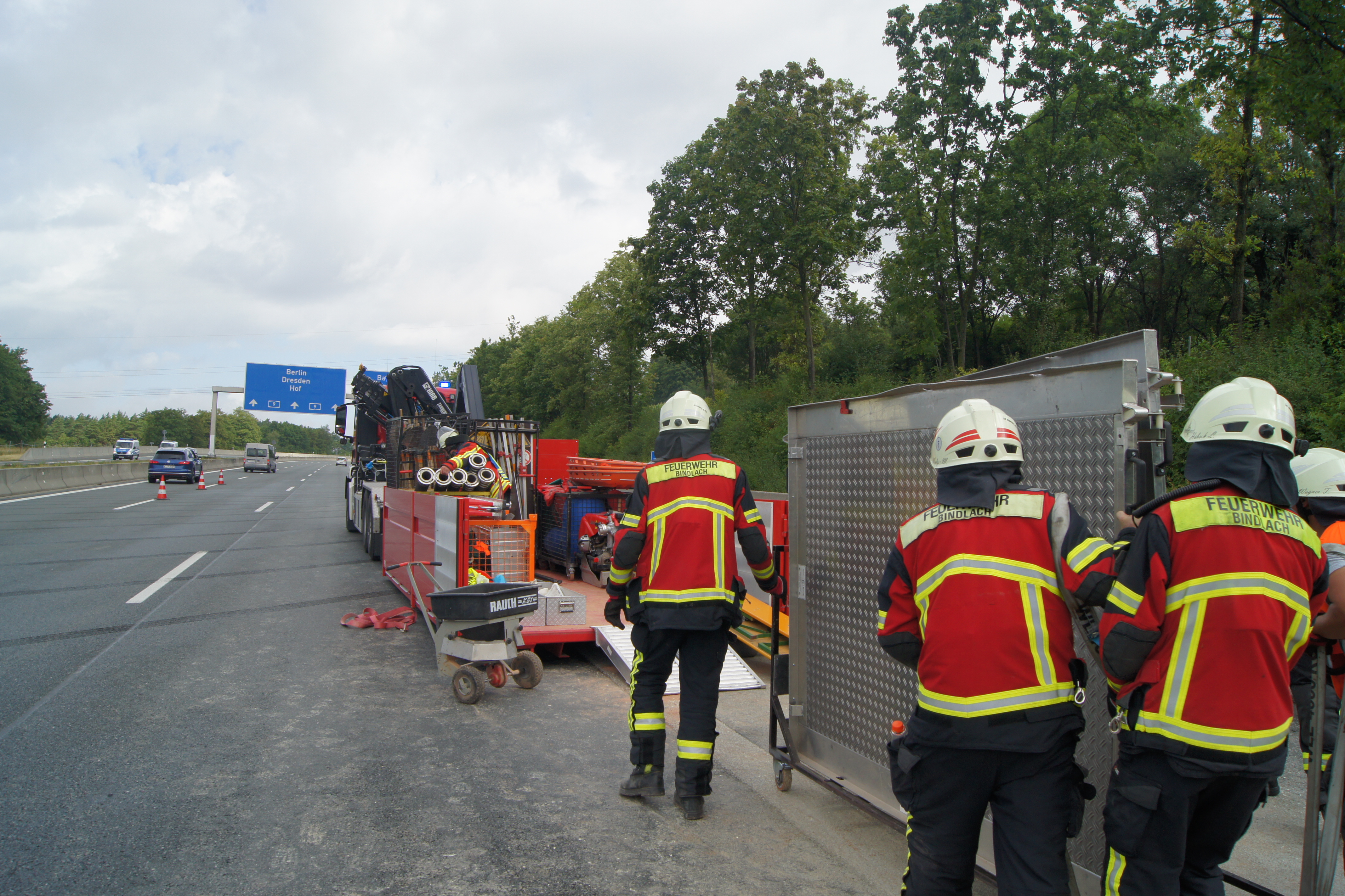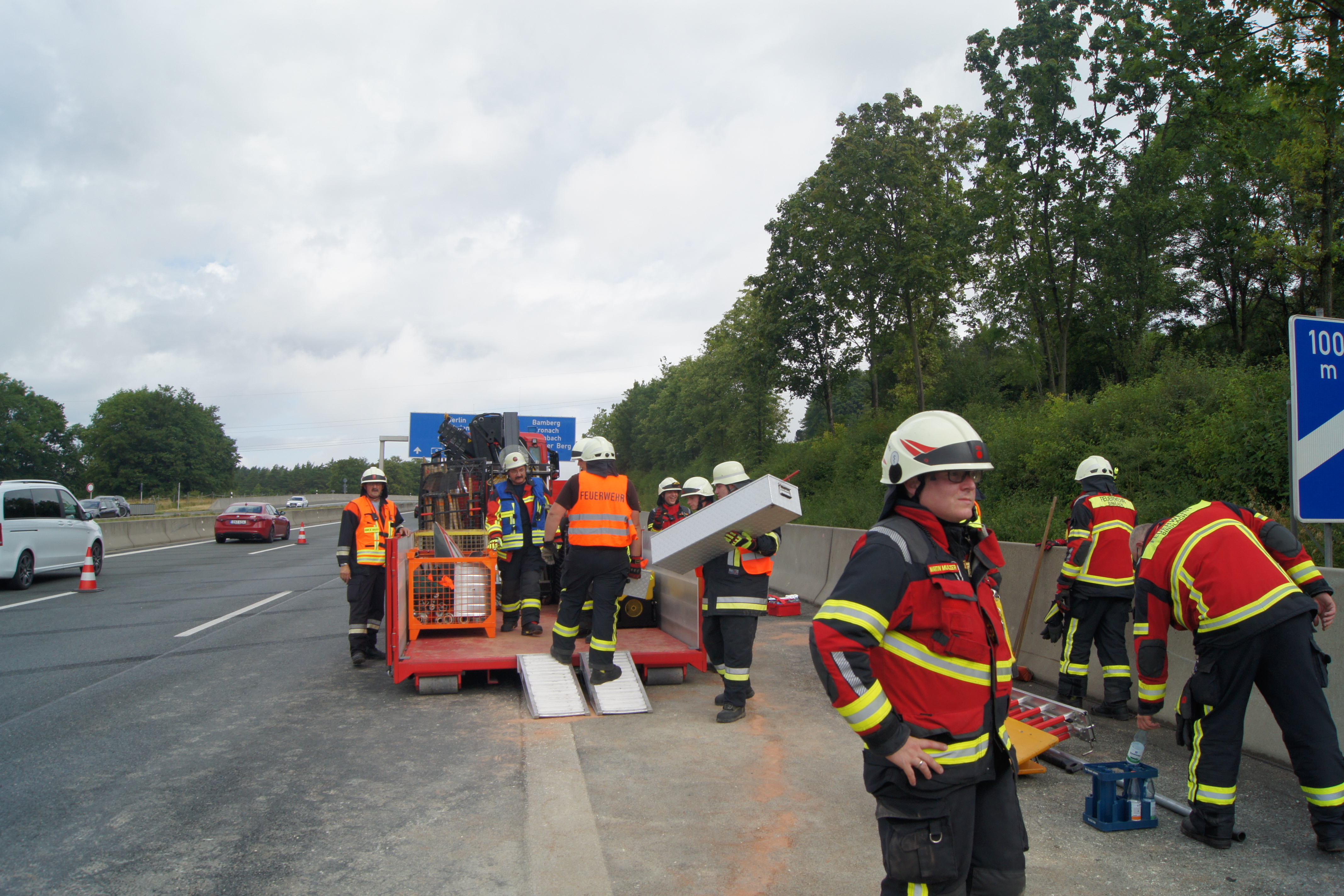 Gemeinsam mit der Feuerwehr Bindlach wurde die in dem total beschädigten LKW befindliche Gerätschaft umgeladen und von der Feuerwehr Speichersdorf abtransportiert. Das THW Bayreuth übernahm die Stauabsicherung.