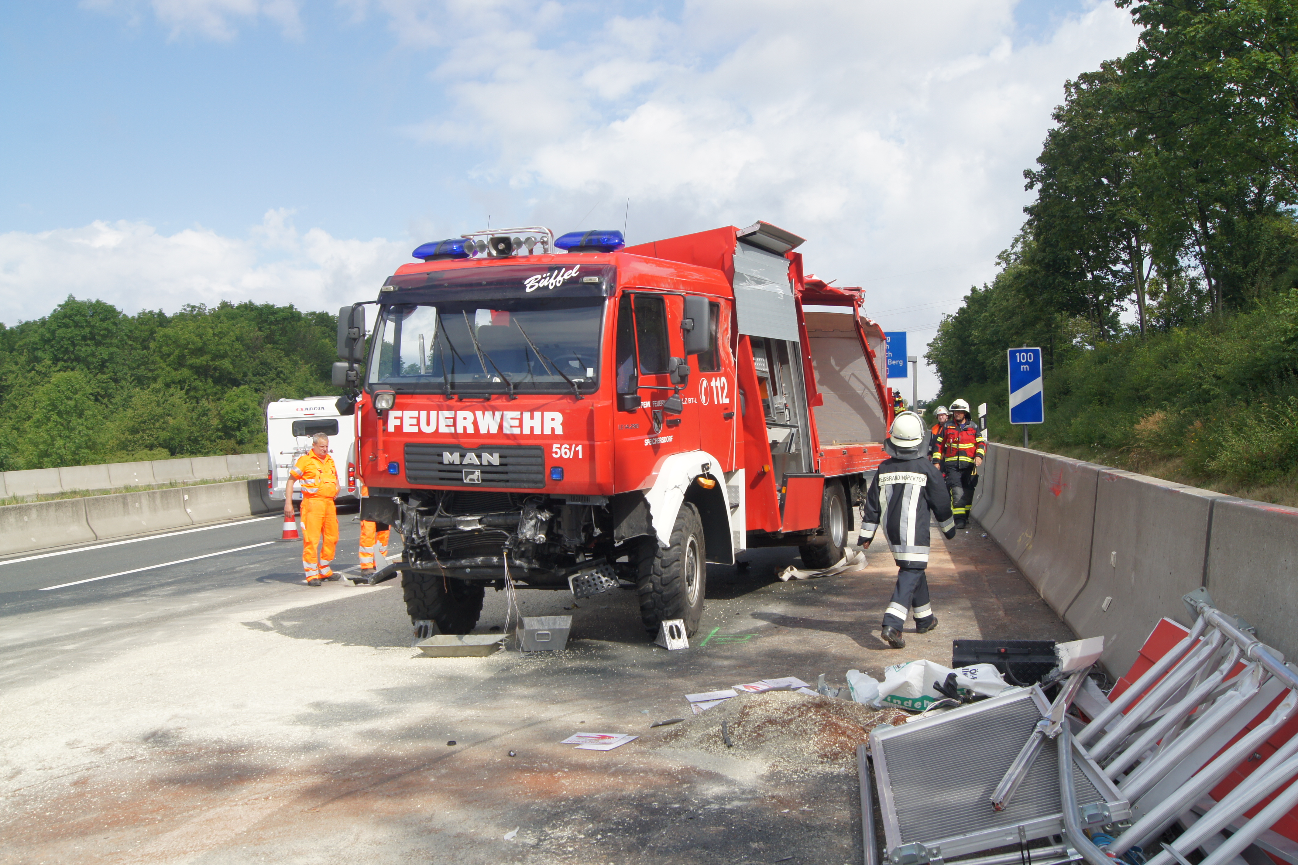 Zu einem schweren Unfall mit einem Feuerwehrfahrzeug wurden die Ständige Wache Bayreuth, die Freiwillige Feuerwehr Bindlach, das THW sowie Rettungsdienst und Polizei am Morgen des 21.07.2019 alarmiert. Auf der BAB 9 in Fahrtrichtung Norden war kurz nach 8 Uhr wenige Hundert Meter vor der Ausfahrt Bindlacher Berg ein Fahrzeug der Freiwilligen Feuerwehr Speichersdorf verunglückt.