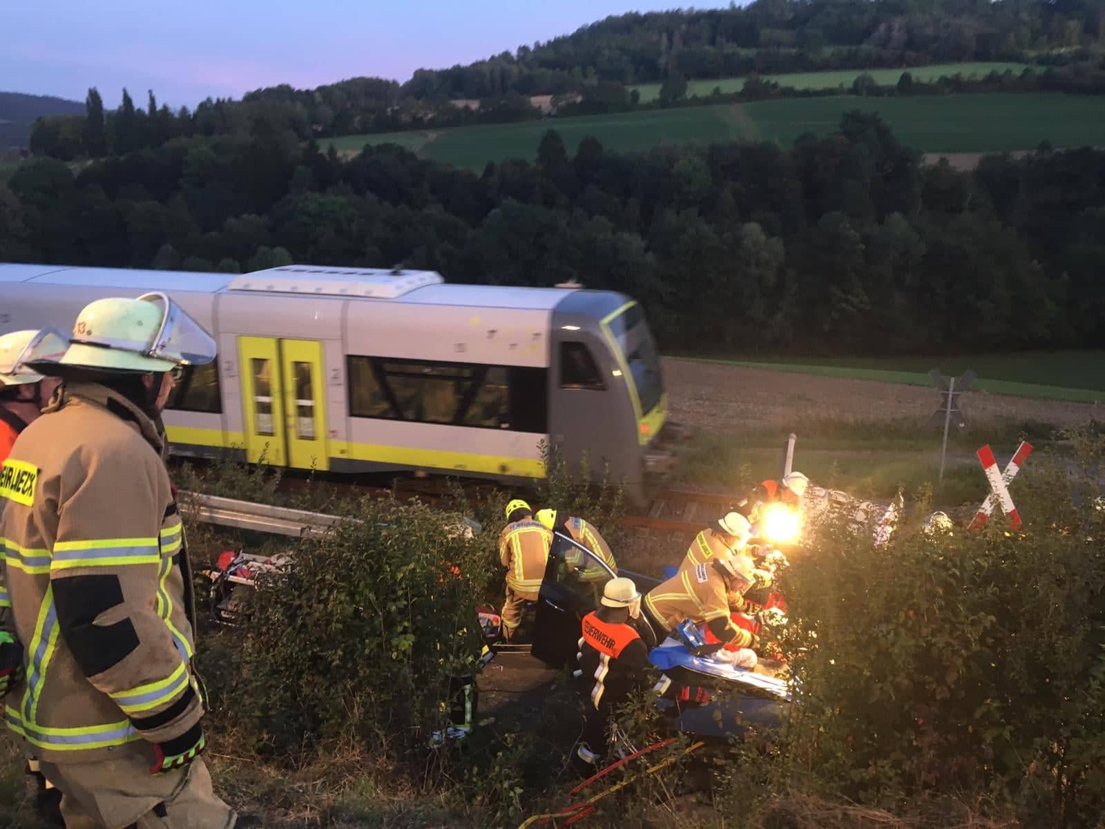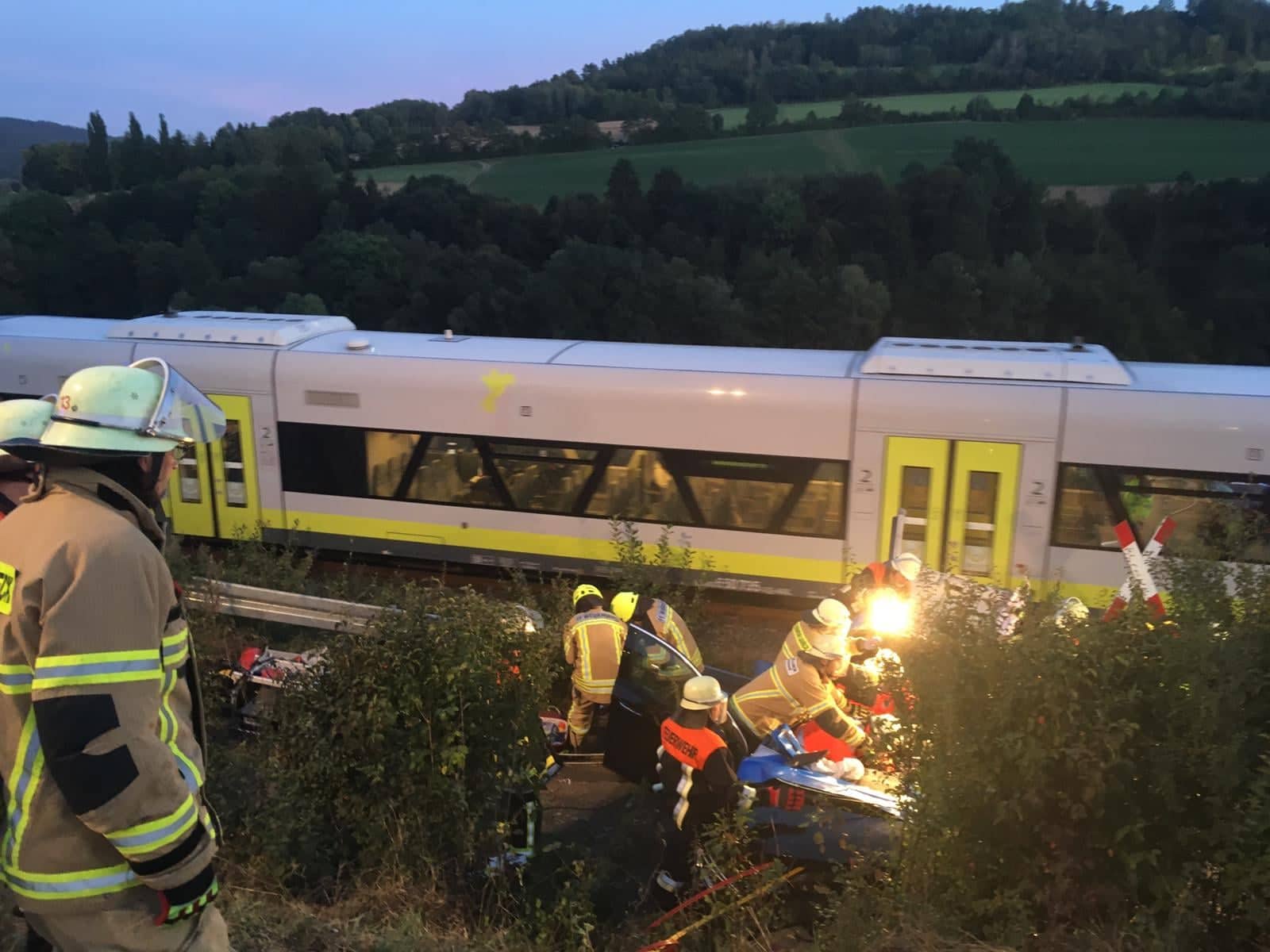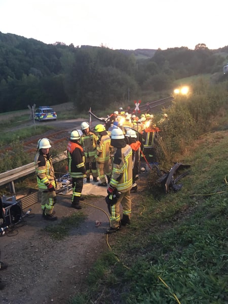 Erneut ist es zu einem schweren Verkehrsunfall auf der Staatsstraße 2181 nahe Döhlau gekommen. Kurz vor 19 Uhr alarmierte die Integrierte Leitstelle BT/KU die Einsatzkräfte auf die Staatsstraße zwischen Bayreuth und Weidenberg mit der Meldung, dass nach einem Unfall mit mehreren beteiligten Fahrzeugen mindestens zwei Personen eingeklemmt seien. Diese Meldung bestätigte sich nach Eintreffen der Retter: zwei Personen waren in jeweils einem verunfallten PKW schwerst eingeklemmt und mussten von der Feuerwehr befreit werden. Ein Fahrzeug wurde bei dem Aufprall von der Straße geschleudert und landete direkt neben den Bahngleisen. Der Regionalzug konnt die Unfallstelle jedoch langsam passieren.