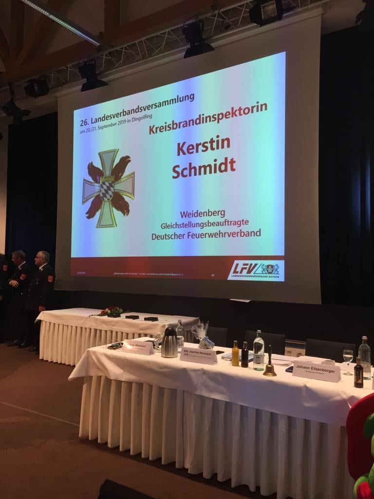 Hohe Auszeichnung für Kreisbrandinspektorin Kerstin Schmidt: Anlässlich der 26. Delegiertenversammlung des Landesfeuerwehrverbandes Bayern wurde ihr das Steckkreuz verliehen. In Dingolfing überreichte Innenminster Joachim Herrmann der 47jährigen das Ehrenzeichen. Kerstin Schmidt ist seit vielen Jahren in der Freiwilligen Feuerwehr Weidenberg aktiv. Darüber hinaus hat sie verschiedene Ämter im Feuerwehrverband bis hin zur Bundesebene inne. Hier ist sie als Gleichstellungsbeauftragte tätig. Als Kreisbrandinspektorin der Inspektion IV ( östlicher Landkreis Bayreuth ) steht sie 50 Feuerwehren beratend und unterstützend zur Seite. Auch im Bereich der Einsatznachsorge bei psychisch belastenden Einsätzen ist Kerstin Schmidt landkreisweit eine wichtige Säule. Als Ständige Vertreterin des Kreisbrandrates übernimmt sie hohe Verantwortung.