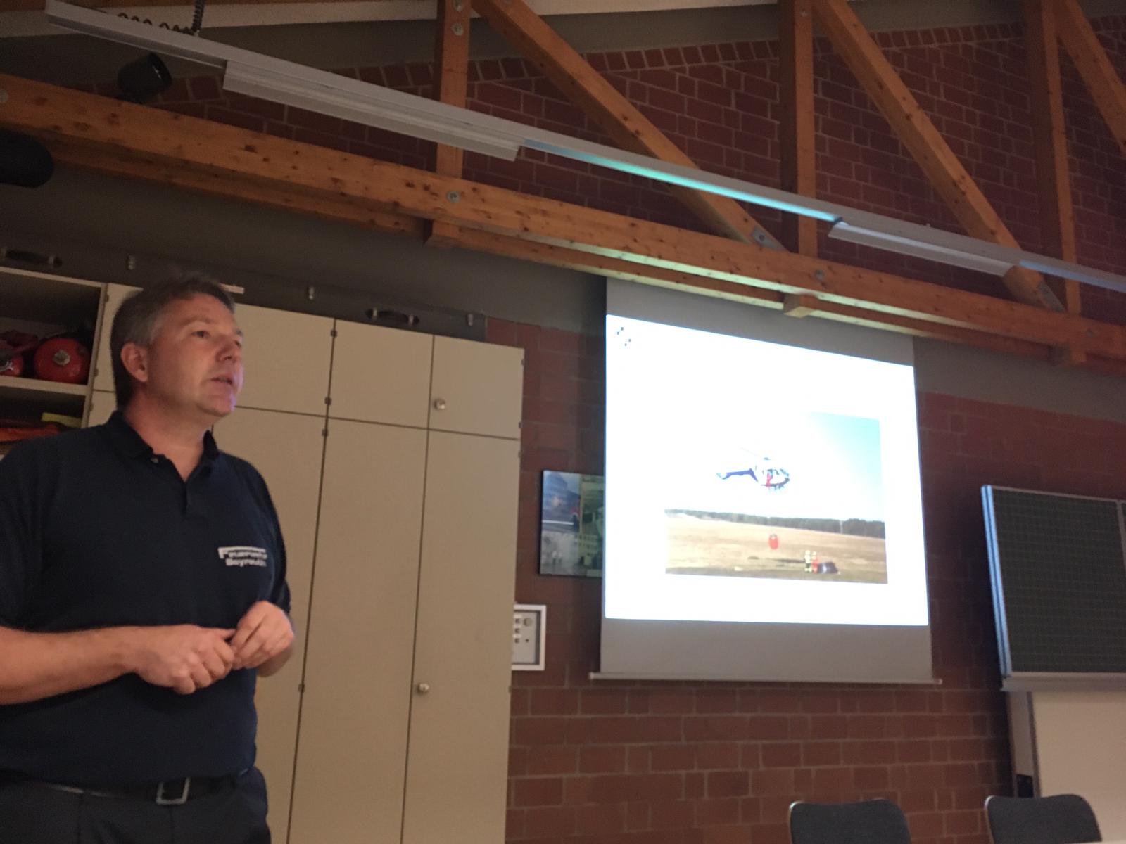 Stadtbrandrat Ralph Hermann referierte zunächst anschaulich über Entwicklung, Aufgaben, Einsatzmöglichkeiten und Arbeitsweise der Flughelfergruppen in Bayern, speziell derjenigen in Bayreuth, dem insoweit einzigen Standort in Oberfranken. In einem praktischen Teil wurden den Teilnehmern vor allem verschiedene Löschwasser-Abwurfvarianten eines Außenlastbehälters demonstriert.
