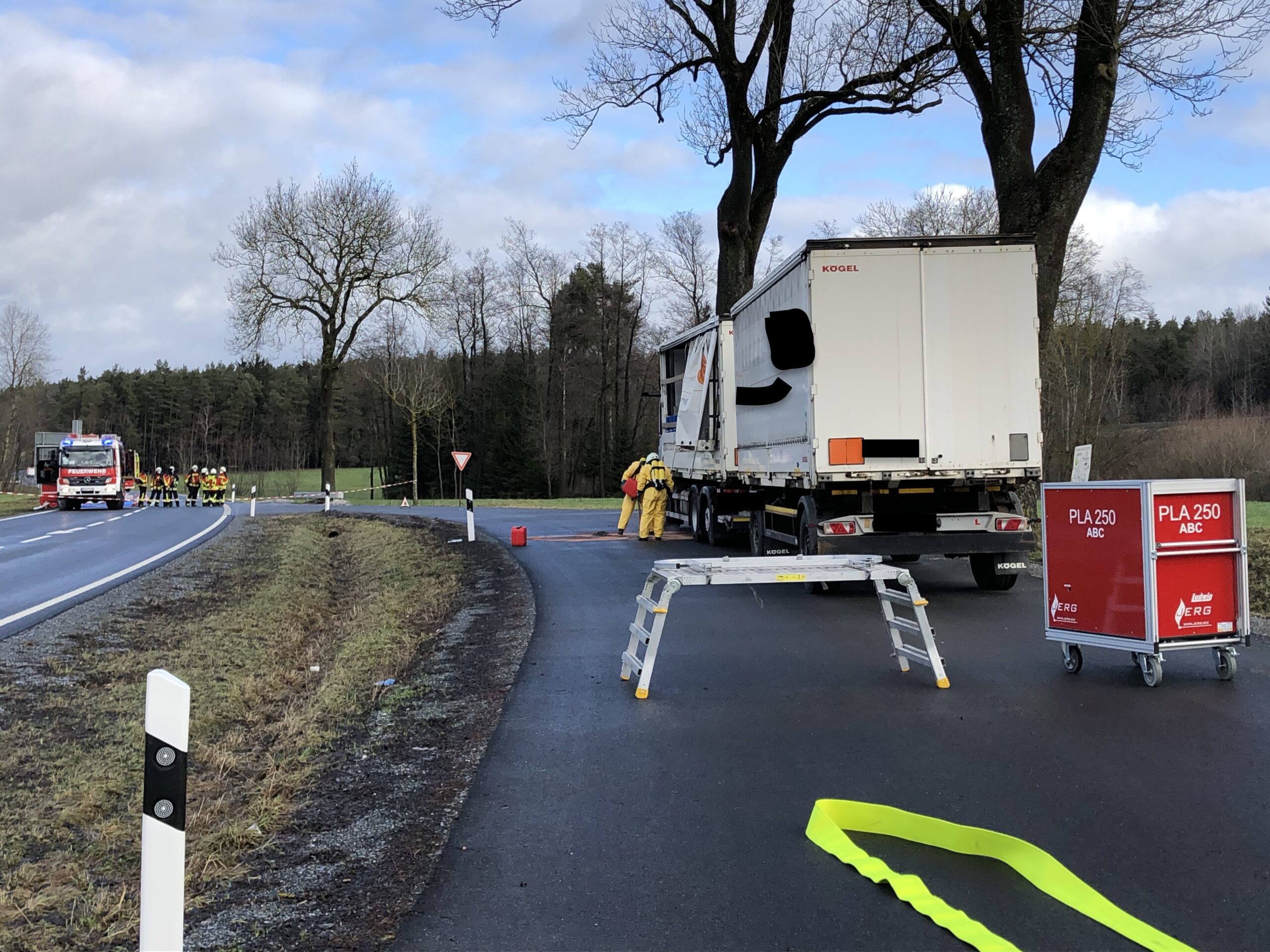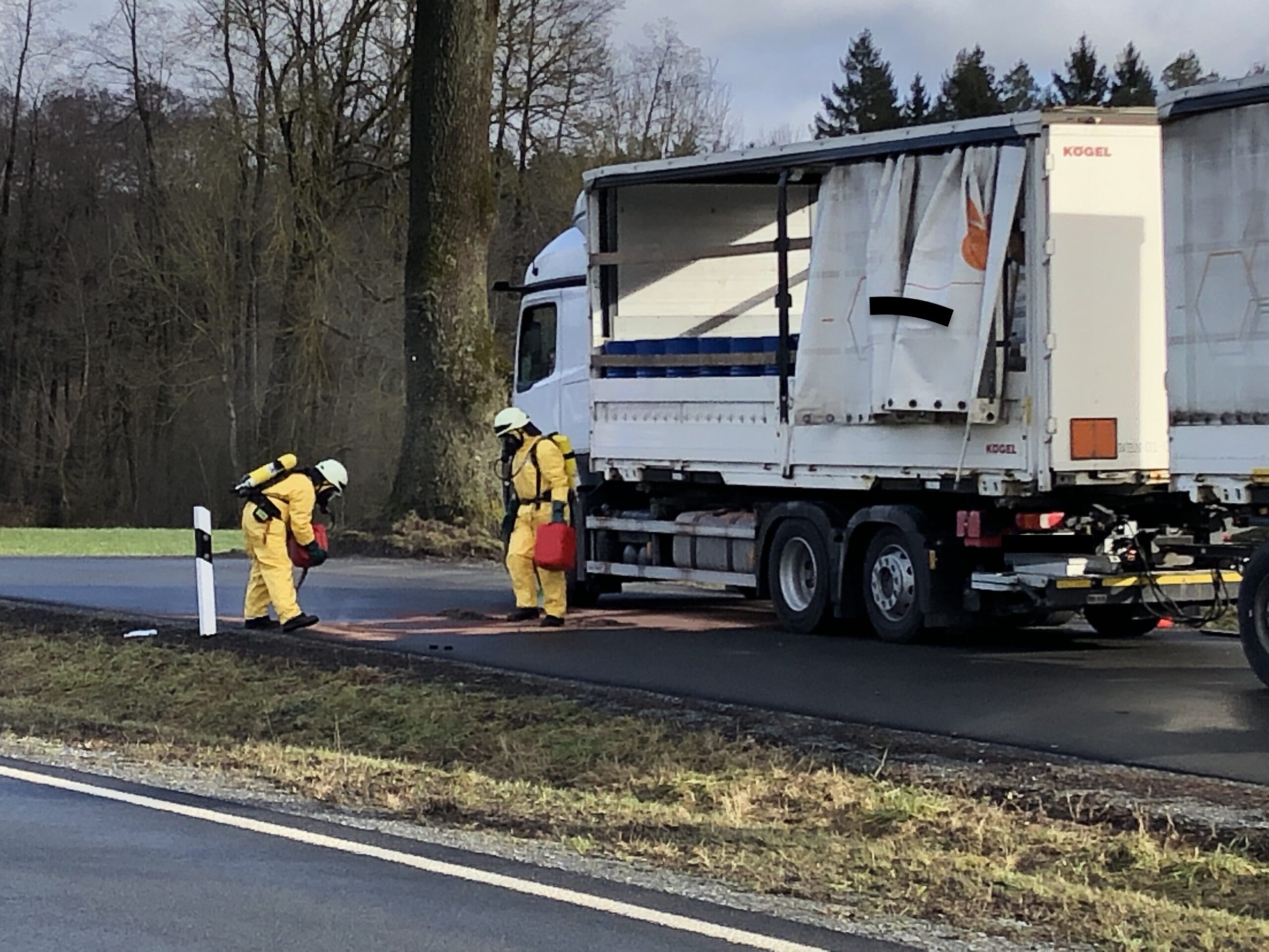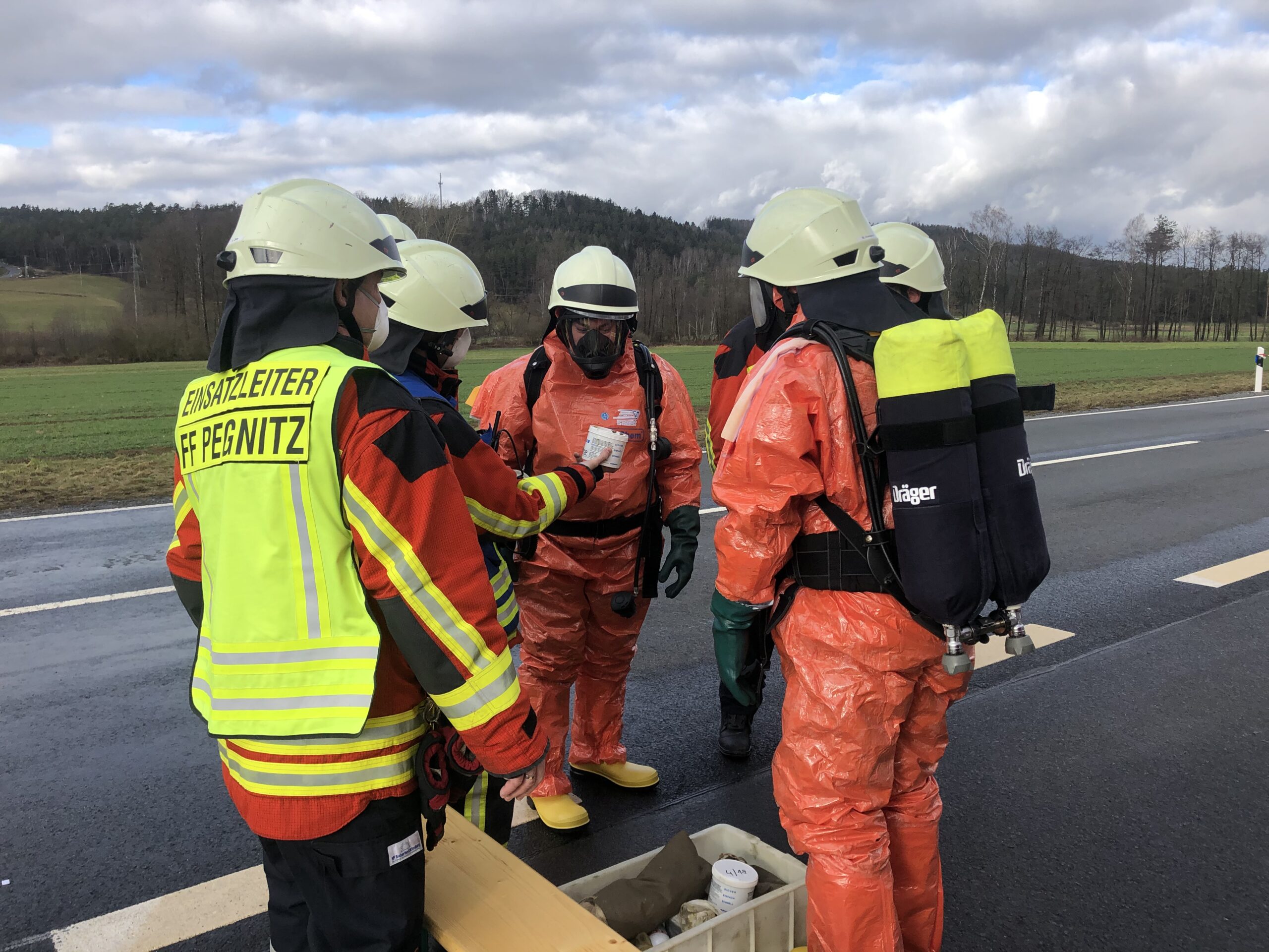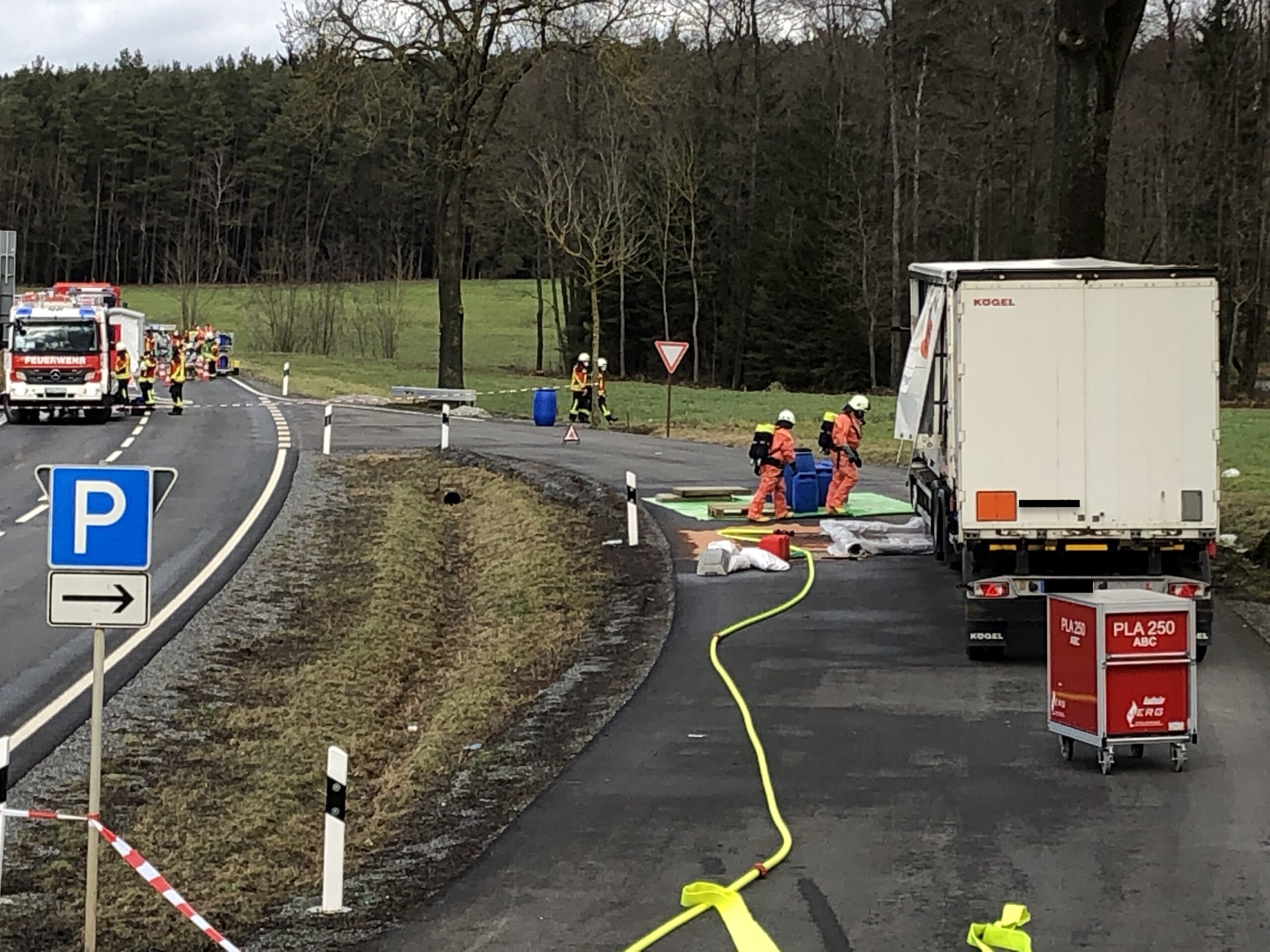 Am Vormittag des 04. Februar 2021 kam es zu einem Gefahrguteinsatz mit einem Natronlauge transportierenden LKW auf der B85 zwischen Pegnitz und Schnabelwaid. Auf Höhe von Zips traten aus bislang unklaren Gründen aus einem 60-Liter-Kanister rund 30 Liter der ätzenden, farblosen Flüssigkeit aus. Der Großteil davon verteilte sich auf der Ladefläche des LKW, etwa 2 Liter tropften auf die Teerfläche eines dortigen Parkplatzes.