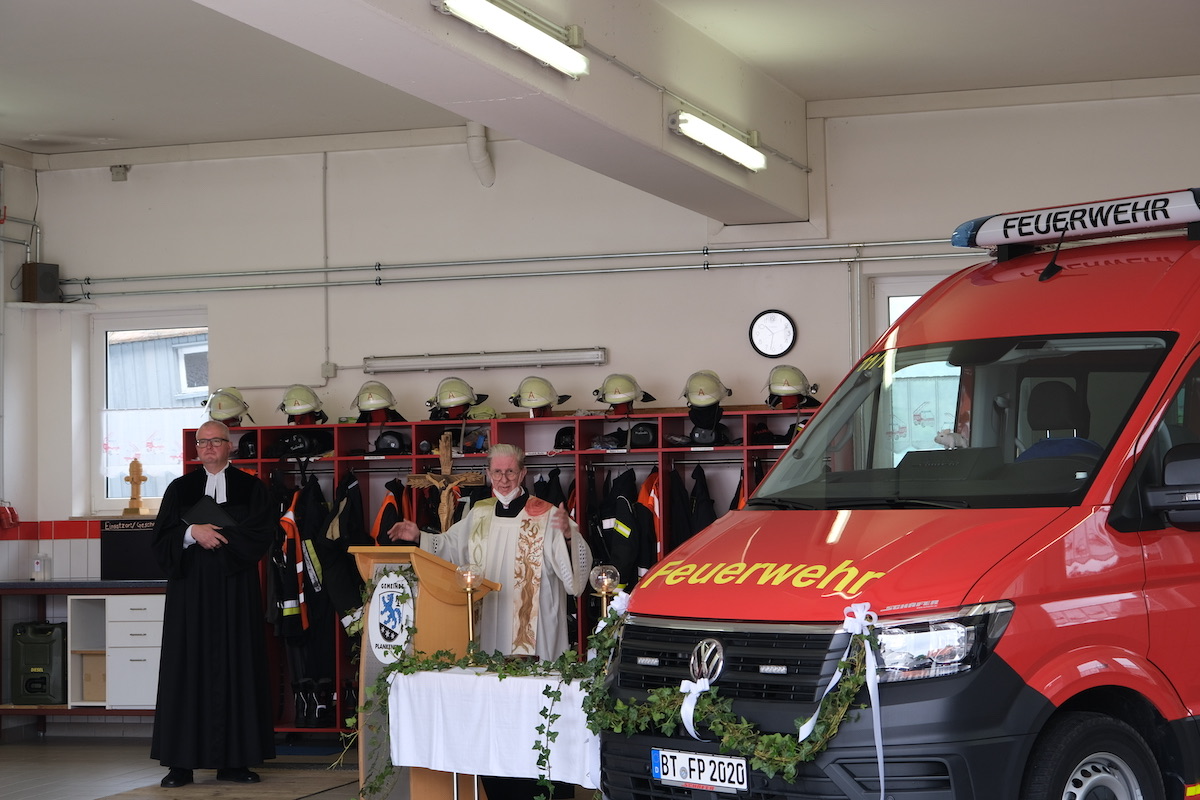 Die beiden Pfarrer Bernhard Simon und Thilo Neuhaus zeigten ihre Verbundenheit mit einem kurzweiligen ökumenischen Gottesdienst. Unter Bezugnahme auf das Gleichnis vom barmherzigen Samariter aus dem Lukasevangelium, der als Ikone des Helfens und der Fürsorge gilt, spannten sie den Bogen zu den ehrenamtlichen Feuerwehrleuten: „So gehe hin, und tue desgleichen!“ Der kirchliche Segen gelte nicht nur dem Fahrzeug, sondern auch allen, die es nutzen.