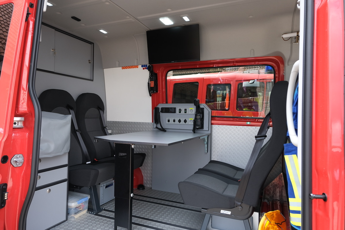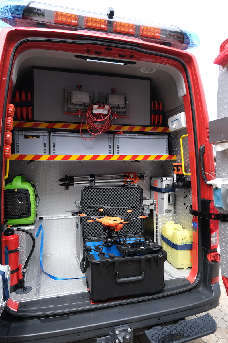 Der auffällig beklebte VW Crafter mit Aufbau durch die Fa. Schäfer aus Oberderdingen verfügt unter anderem über ein Lichtstativ mit LED-Beleuchtung, Stromerzeuger und eine Markise. Es ist als „EALF“ besonders ausgerüstet für Leitungsaufgaben. Mitgeführt wird außerdem eine Drohne des Landkreises Bayreuth, für die sich die Mannschaft derzeit ausbilden lässt.