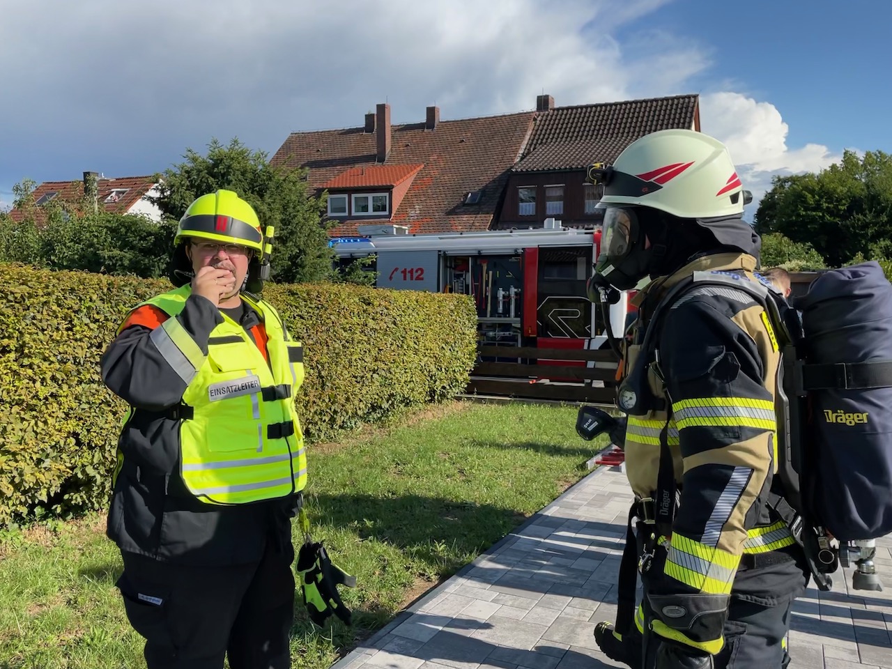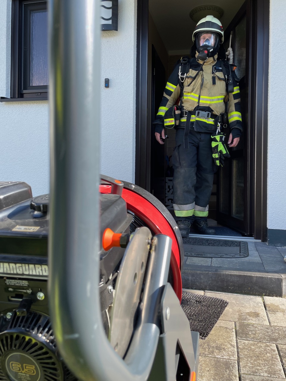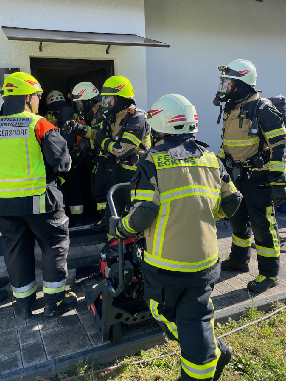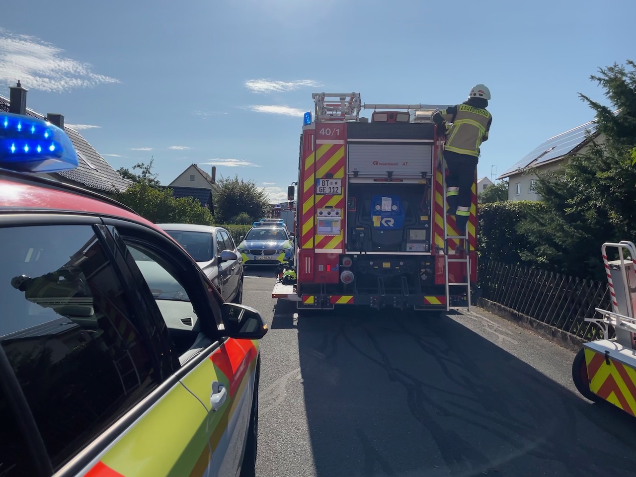 Starker Qualm aus einem Wohnhaus, schrillende Rauchmelder und aufmerksame Mitbürger, die sofort die Feuerwehr verständigten: verhältnismäßig glimpflich endete ein als „B3 – Person“ alarmierter Einsatz am Sonntagabend (08. August 2021) in Eckersdorf. Die ersteintreffenden Kräfte gingen unter der Leitung von 2. Kommandant Michael Güllner sofort mit zwei Atemschutztrupps in das Gebäude vor und brachten eine Person ins Freie, die dem Rettungsdienst übergeben wurde. Der aus dem Küchenbereich ausgehende Qualm wurde mittels Belüftungsgerät ins Freie geblasen. Löschmaßnahmen waren in diesem noch frühen Stadium nicht notwendig. Im Einsatz waren die Wehren aus Eckersdorf, Donndorf, Oberwaiz, Plankenfels, die Ständige Wache der Feuerwehr Bayreuth sowie die besonderen Führungskräfte, darunter KBM Daniel Ermer.