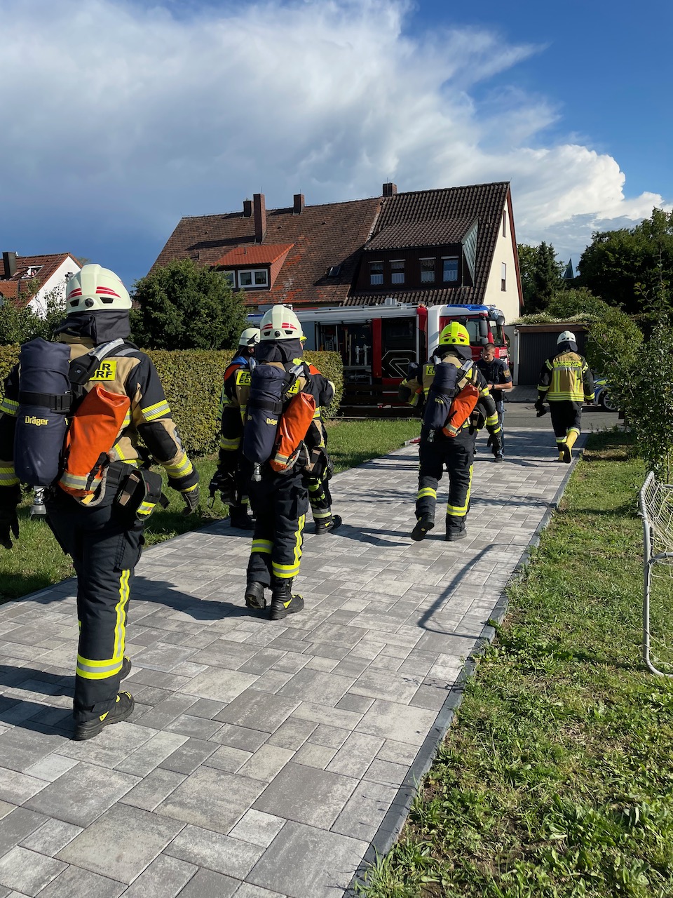 Starker Qualm aus einem Wohnhaus, schrillende Rauchmelder und aufmerksame Mitbürger, die sofort die Feuerwehr verständigten: verhältnismäßig glimpflich endete ein als „B3 – Person“ alarmierter Einsatz am Sonntagabend (08. August 2021) in Eckersdorf. Die ersteintreffenden Kräfte gingen unter der Leitung von 2. Kommandant Michael Güllner sofort mit zwei Atemschutztrupps in das Gebäude vor und brachten eine Person ins Freie, die dem Rettungsdienst übergeben wurde. Der aus dem Küchenbereich ausgehende Qualm wurde mittels Belüftungsgerät ins Freie geblasen. Löschmaßnahmen waren in diesem noch frühen Stadium nicht notwendig. Im Einsatz waren die Wehren aus Eckersdorf, Donndorf, Oberwaiz, Plankenfels, die Ständige Wache der Feuerwehr Bayreuth sowie die besonderen Führungskräfte, darunter KBM Daniel Ermer.