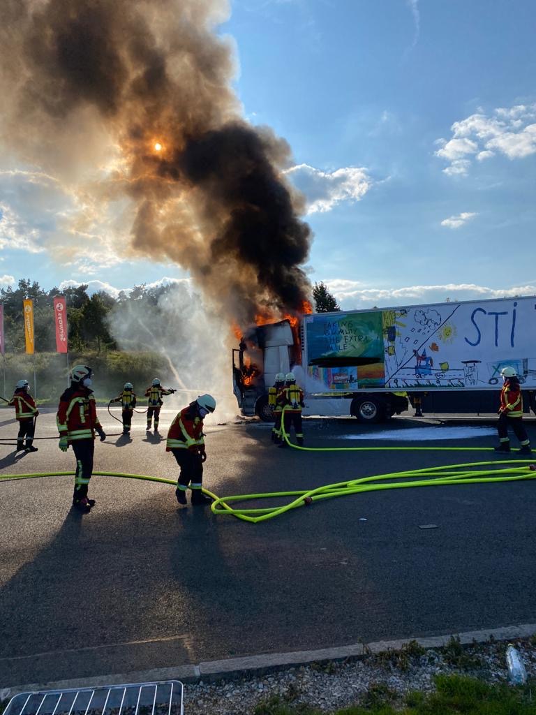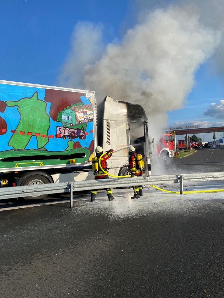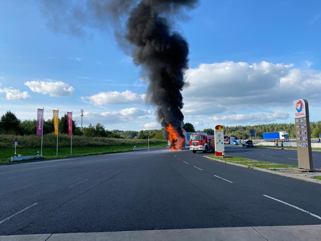 Zu einem brennenden LKW an der an der BAB9 gelegenen Rastanlage Fränkische Schweiz alarmierte die Integrierte Leitstelle Bayreuth/Kulmbach am 01. September 2021 gegen 17.25 Uhr die Feuerwehren Pegnitz und Trockau sowie das THW Pegnitz. Das Führerhaus des mit Milch beladenen, circa 100 Meter von der dortigen Tankstelle entfernt befindlichen Fahrzeugs stand bei Eintreffen der ersten Kräfte bereits in Flammen. Unter schwerem Atemschutz wurde das Feuer abgelöscht. Mit der im Laufe des Einsatzes noch hinzugezogenen Drehleiter aus Pegnitz wurden von oben Nachlöscharbeiten durchgeführt. Die Zufahrt zur Rastanlage sperrte das THW Pegnitz kurzzeitig, um ein gefahrloses Arbeiten zu ermöglichen. Der Fahrer blieb glücklicherweise unverletzt.