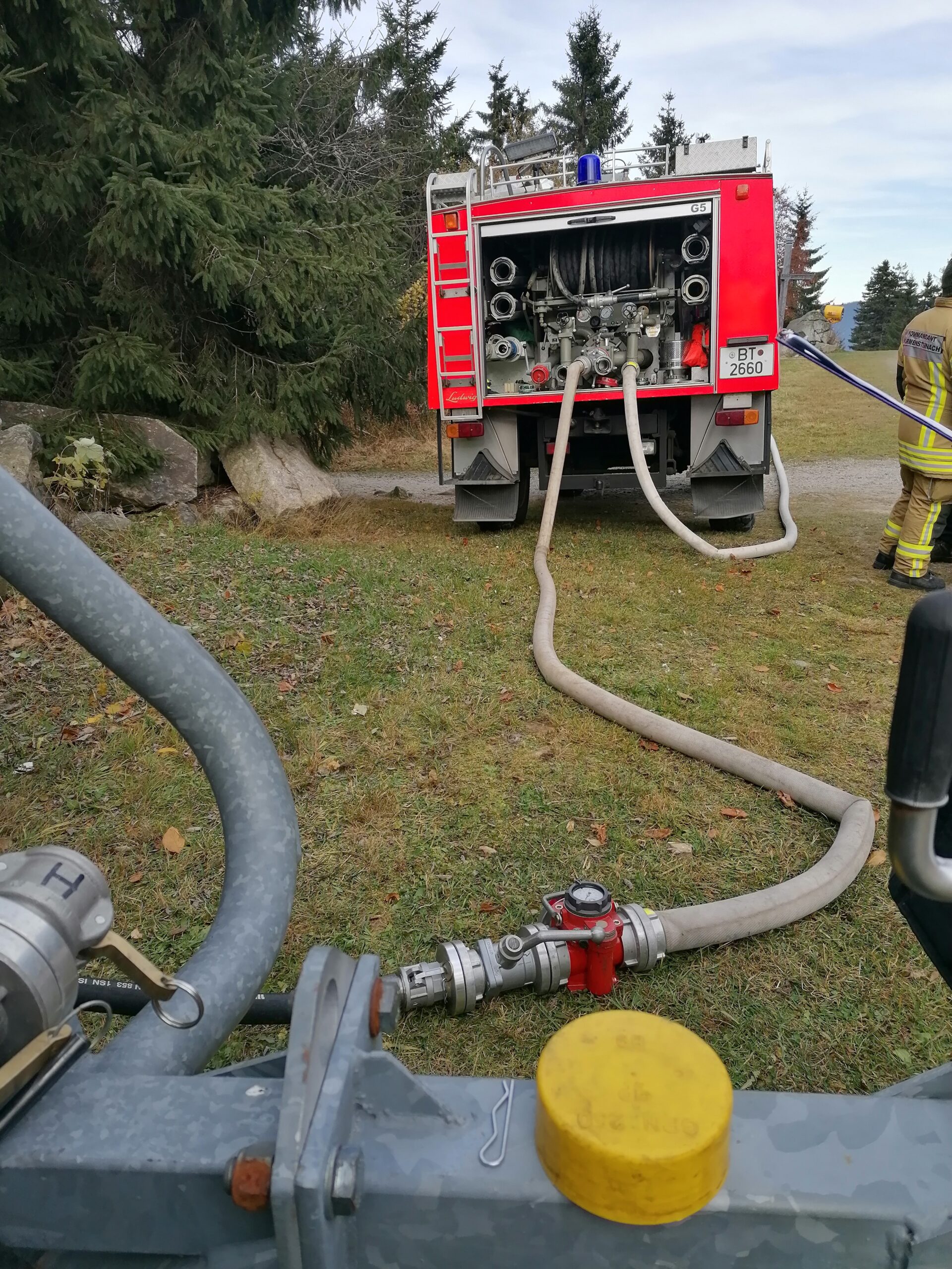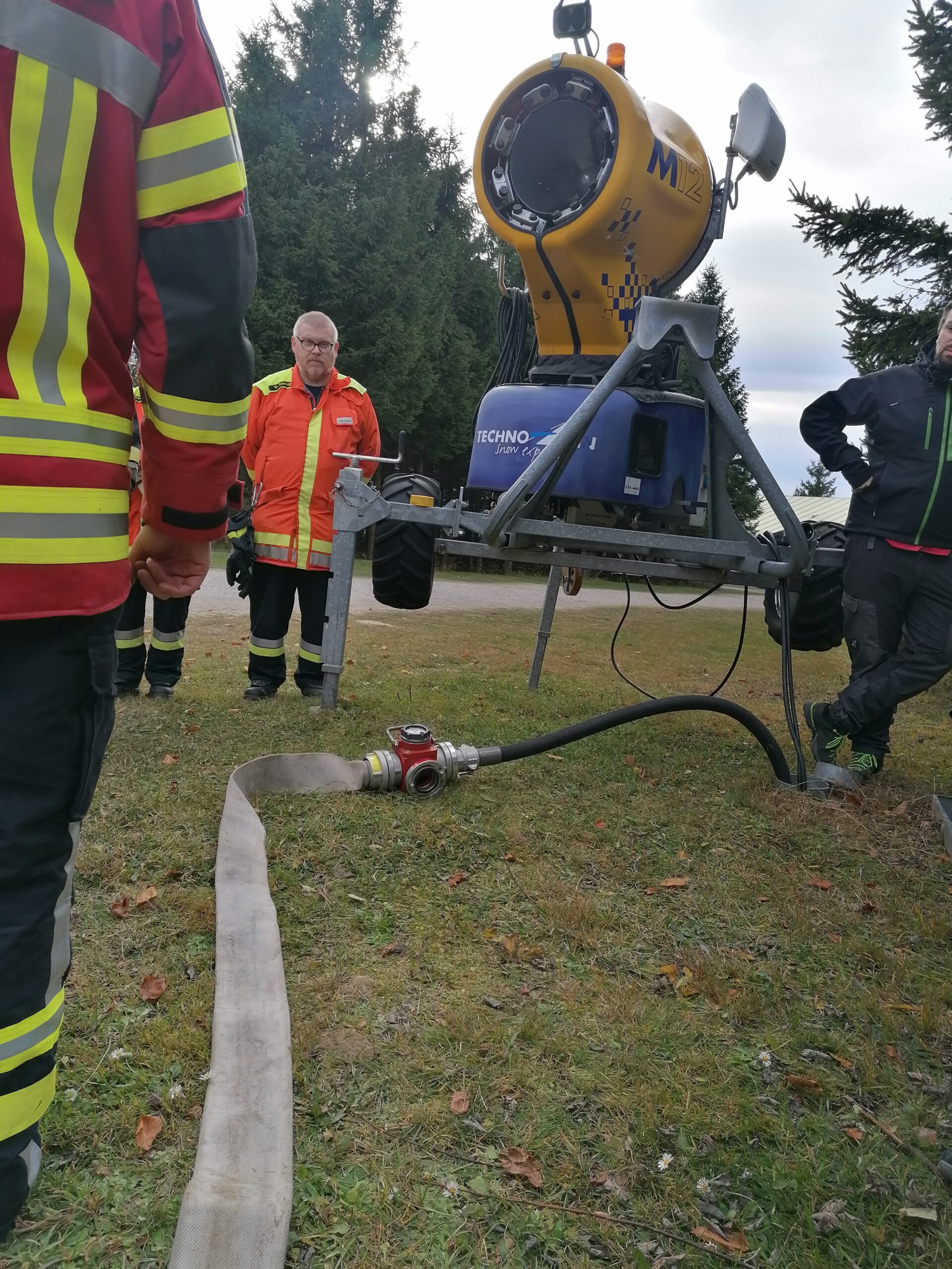 Genau hier hatte die Begehung zum Ziel alle dafür in Zukunft zuständigen Führungskräfte auch in fachpraktischer Weise mit dem Objekt Ochsenkopf zu schulen und einzuweisen. Nach einer Begehung der Gaststätte Asenturm wurde auch das umliegende Gelände erkundet um potenzielle Gefahrenstellen wie z.B. einen oberirdischen Gastank hinter dem Gebäude im Ernstfall bereits zu kennen damit eine Erkundungszeit deutlich geringer ausfallen kann. Neben einer kurzen praktischen Prüfung der Löschmittelentnahmestelle vor dem Gebäude die einen Zugriff auf einen 80.000 L Wassertank ermöglicht lag der Schwerpunkt auf der Inbetriebnahme einer von insgesamt 40 Schächten der Schneekanonen, die in Zukunft zur Wasserförderung verwendet werden können. Hier wurde im Vorfeld eine Lösung erarbeitet, die es erlaubt mittels speziell angefertigter Übergangsstücke direkt vom Wasserschlauch der Beschneiungsanlage zu den Feuerwehramaturen überzugehen. Durch dieses Vorgehen ist ein zügiger Erstangriff möglich bis die langen Schlauchstrecken zur Wasserförderung stehen. Überzeugt von dem System der Wasserentnahme war KBI Jürgen Wunderlich und beendete die Begehung in der Hoffnung, dass sich kommendes Jahr die Hygienevorschriften der Pandemie soweit lockern damit im Rahmen einer Einsatzübung im Unterkreis 2 das Objekt Ochsenkopf mit auf dem Plan stehen kann.