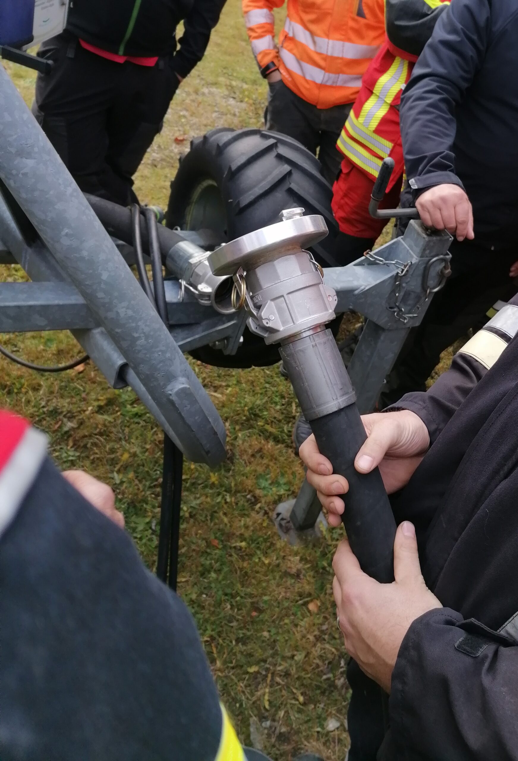Genau hier hatte die Begehung zum Ziel alle dafür in Zukunft zuständigen Führungskräfte auch in fachpraktischer Weise mit dem Objekt Ochsenkopf zu schulen und einzuweisen. Nach einer Begehung der Gaststätte Asenturm wurde auch das umliegende Gelände erkundet um potenzielle Gefahrenstellen wie z.B. einen oberirdischen Gastank hinter dem Gebäude im Ernstfall bereits zu kennen damit eine Erkundungszeit deutlich geringer ausfallen kann. Neben einer kurzen praktischen Prüfung der Löschmittelentnahmestelle vor dem Gebäude die einen Zugriff auf einen 80.000 L Wassertank ermöglicht lag der Schwerpunkt auf der Inbetriebnahme einer von insgesamt 40 Schächten der Schneekanonen, die in Zukunft zur Wasserförderung verwendet werden können. Hier wurde im Vorfeld eine Lösung erarbeitet, die es erlaubt mittels speziell angefertigter Übergangsstücke direkt vom Wasserschlauch der Beschneiungsanlage zu den Feuerwehramaturen überzugehen. Durch dieses Vorgehen ist ein zügiger Erstangriff möglich bis die langen Schlauchstrecken zur Wasserförderung stehen. Überzeugt von dem System der Wasserentnahme war KBI Jürgen Wunderlich und beendete die Begehung in der Hoffnung, dass sich kommendes Jahr die Hygienevorschriften der Pandemie soweit lockern damit im Rahmen einer Einsatzübung im Unterkreis 2 das Objekt Ochsenkopf mit auf dem Plan stehen kann.