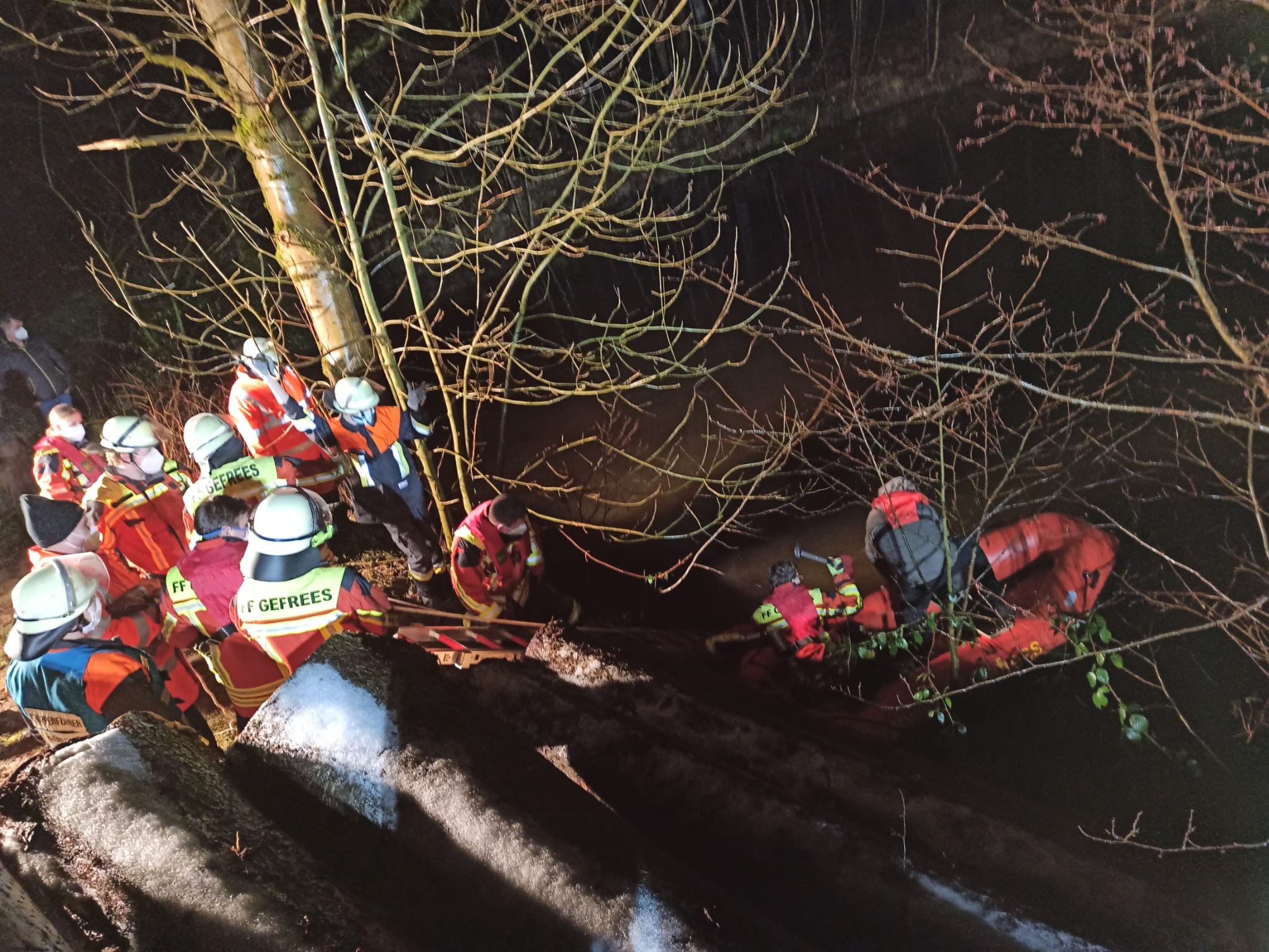 Ein glückliches Ende nahm ein Tierrettungseinsatz am Abend des 14. Dezember 2021 bei Grünstein. Ein Schäferhundmischling hatte sich beim Schwimmen in einem Weiher an einem Ast verhakt und saß auf einer kleinen Insel in dem tiefen Gewässer fest. Rund 20 Feuerwehrleute aus Grünstein und Gefrees konnten mithilfe eines Schlauchboots das Tier zügig aus seiner hilflosen Situation befreien. Der Schäferhundmischling blieb unverletzt.