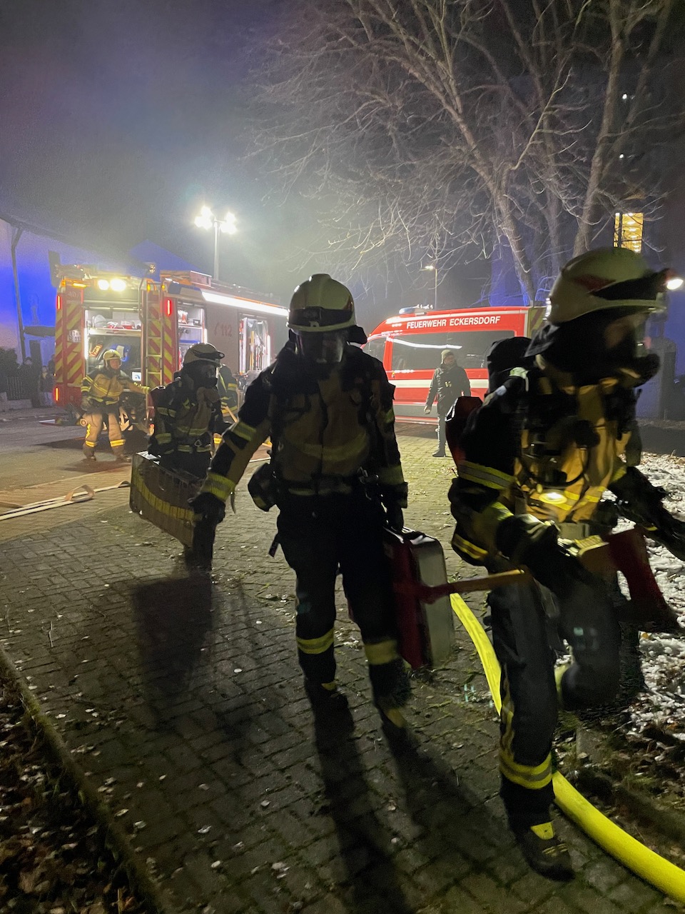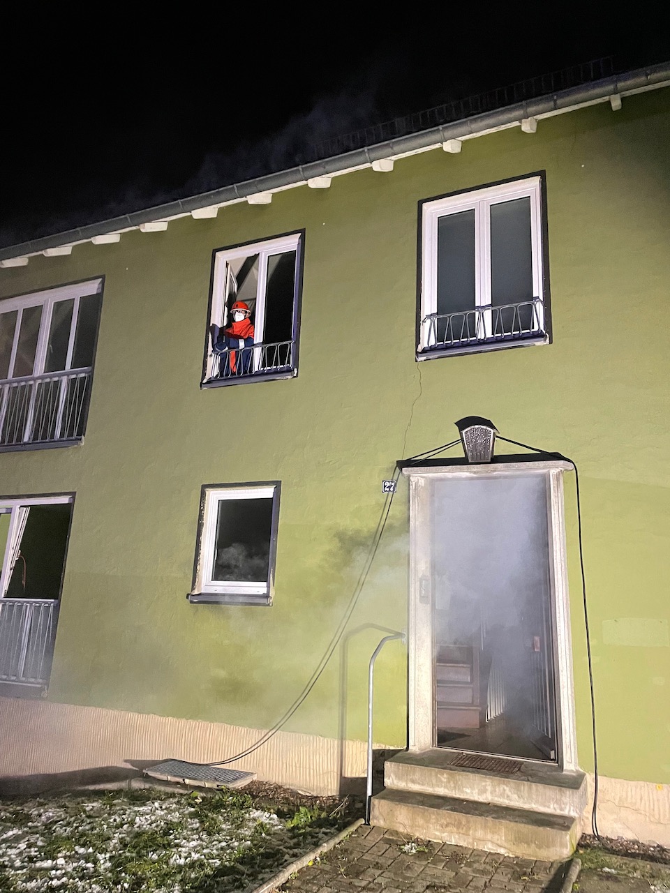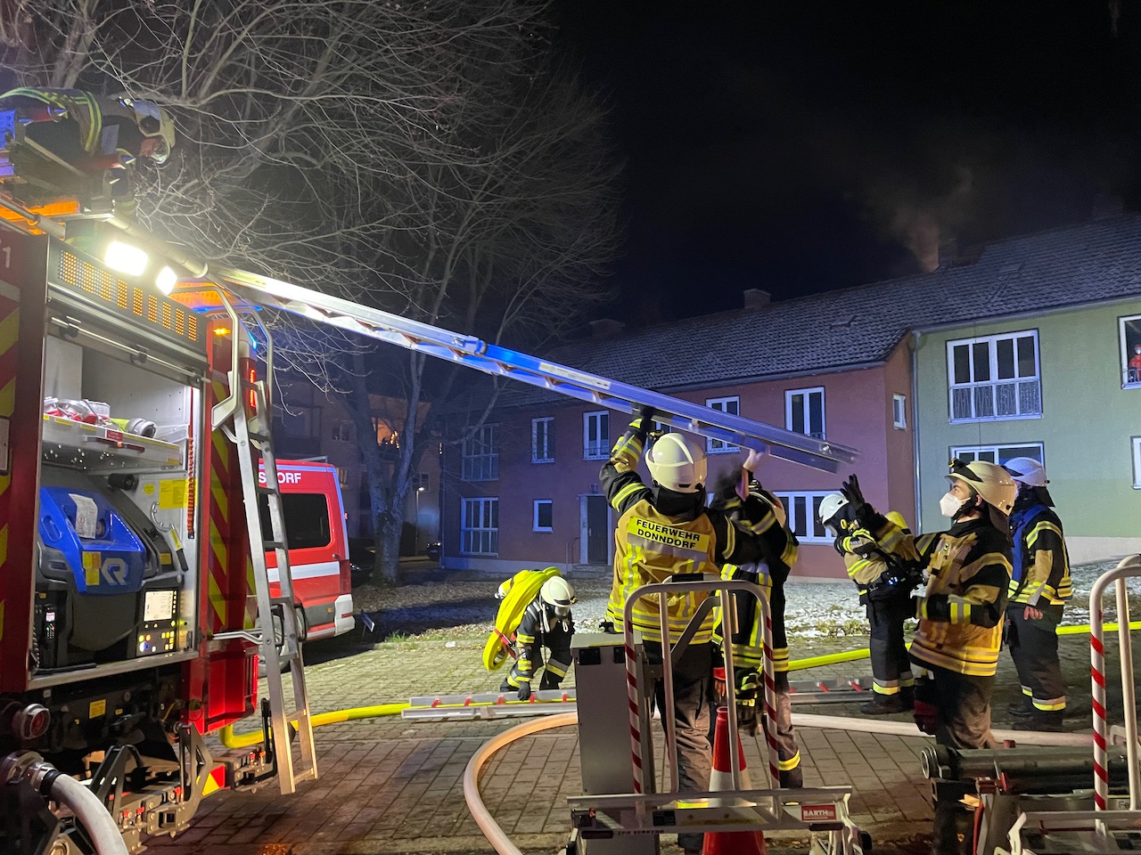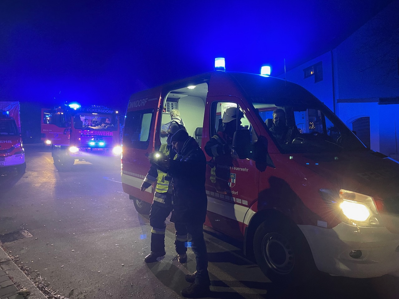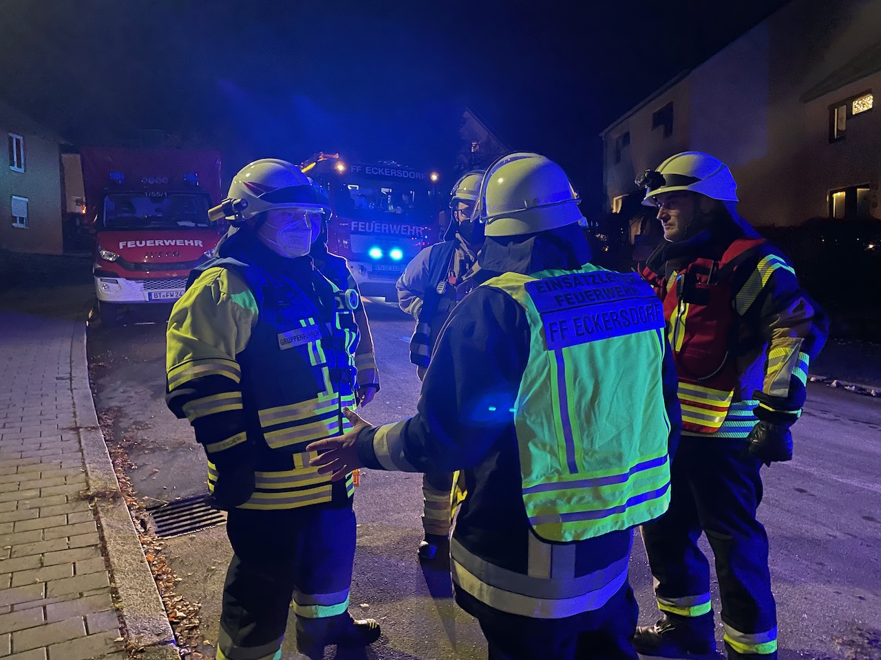 Mit einer durchaus anspruchsvollen Übung warteten die Verantwortlichen der Feuerwehren Eckersdorf, Donndorf und der Abteilung Innere Stadt der Feuerwehr Bayreuth am Abend des 03. Dezember 2021 auf. Es bot sich nämlich in einem zum Abbruch stehenden Mehrfamilienhaus in Bayreuth die gerne in Anspruch genommene Möglichkeit, sehr realitätsorientiert und praxisgerecht zu üben. Ausgehend von einem Brandgeschehen im Keller sollte sich „Feuer und Rauch“ durch den ganzen Komplex entwickeln. Mit mehreren Nebelmaschinen, Lichteffekten, Verletztendarstellern und versteckten Übungspuppen wirkte das Szenario nicht nur ziemlich echt, sondern sorgte auch dafür, dass die Teilnehmer alle Hände voll zu tun hatten.