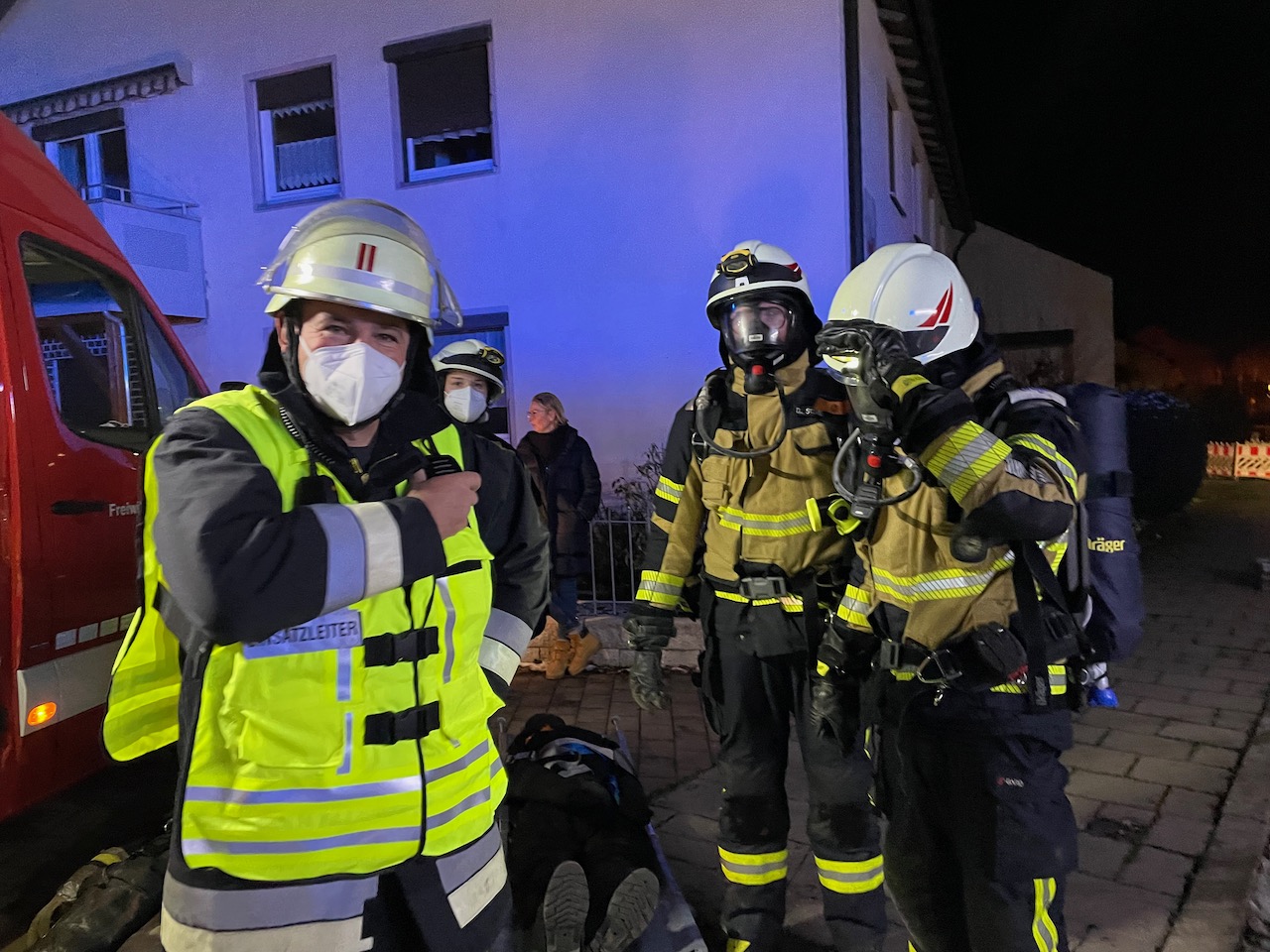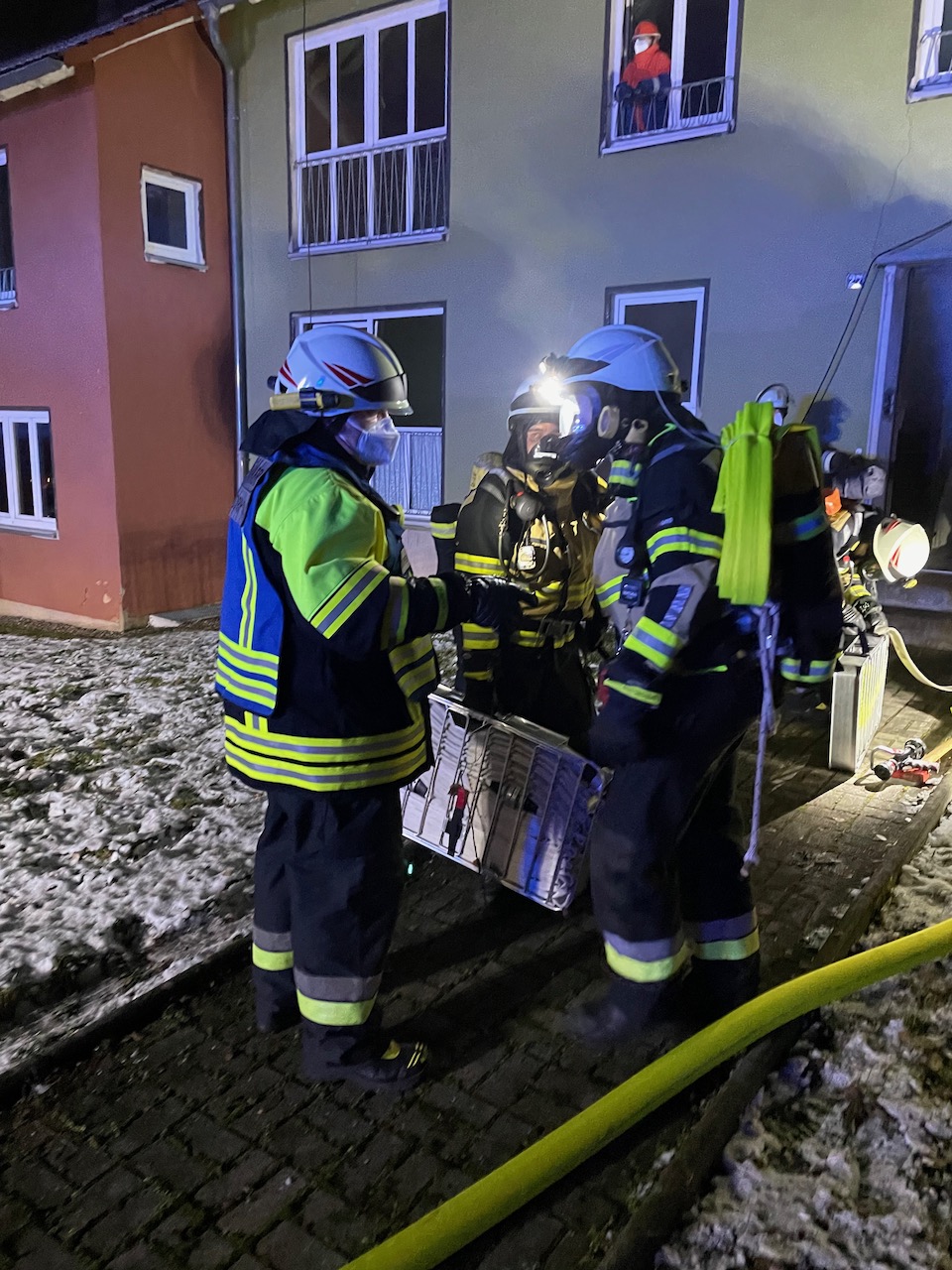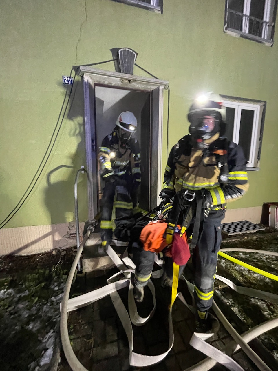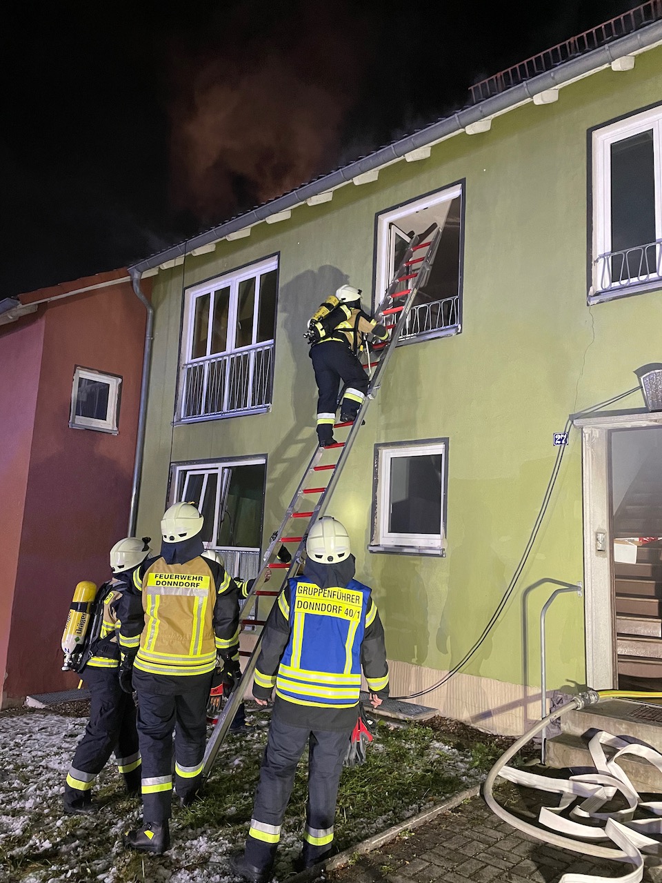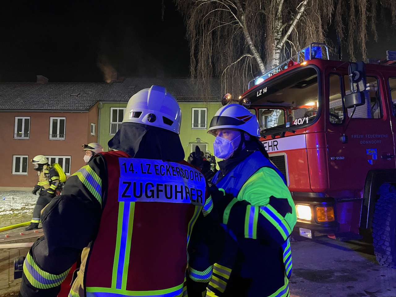 Mit einer durchaus anspruchsvollen Übung warteten die Verantwortlichen der Feuerwehren Eckersdorf, Donndorf und der Abteilung Innere Stadt der Feuerwehr Bayreuth am Abend des 03. Dezember 2021 auf. Es bot sich nämlich in einem zum Abbruch stehenden Mehrfamilienhaus in Bayreuth die gerne in Anspruch genommene Möglichkeit, sehr realitätsorientiert und praxisgerecht zu üben. Ausgehend von einem Brandgeschehen im Keller sollte sich „Feuer und Rauch“ durch den ganzen Komplex entwickeln. Mit mehreren Nebelmaschinen, Lichteffekten, Verletztendarstellern und versteckten Übungspuppen wirkte das Szenario nicht nur ziemlich echt, sondern sorgte auch dafür, dass die Teilnehmer alle Hände voll zu tun hatten.