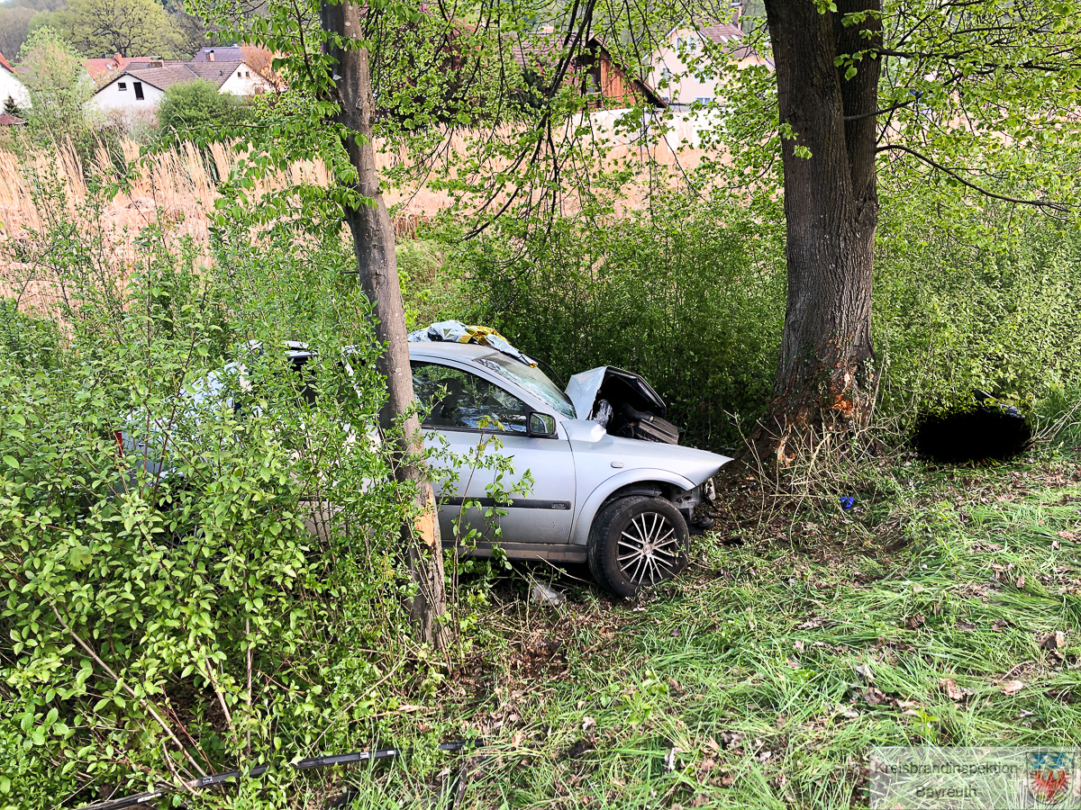 Der verunfallte PKW war aus bisher ungeklärter Ursache, auf der Straße zwischen Goldmühl und Goldkronach, in einer Rechtskurve nach links von der Straße abgekommen und frontal gegen einen Baum geprallt. Das Unfallfahrzeug kam zwischen Bäumen im Bereich der tieferliegenden Böschung zum Stehen.