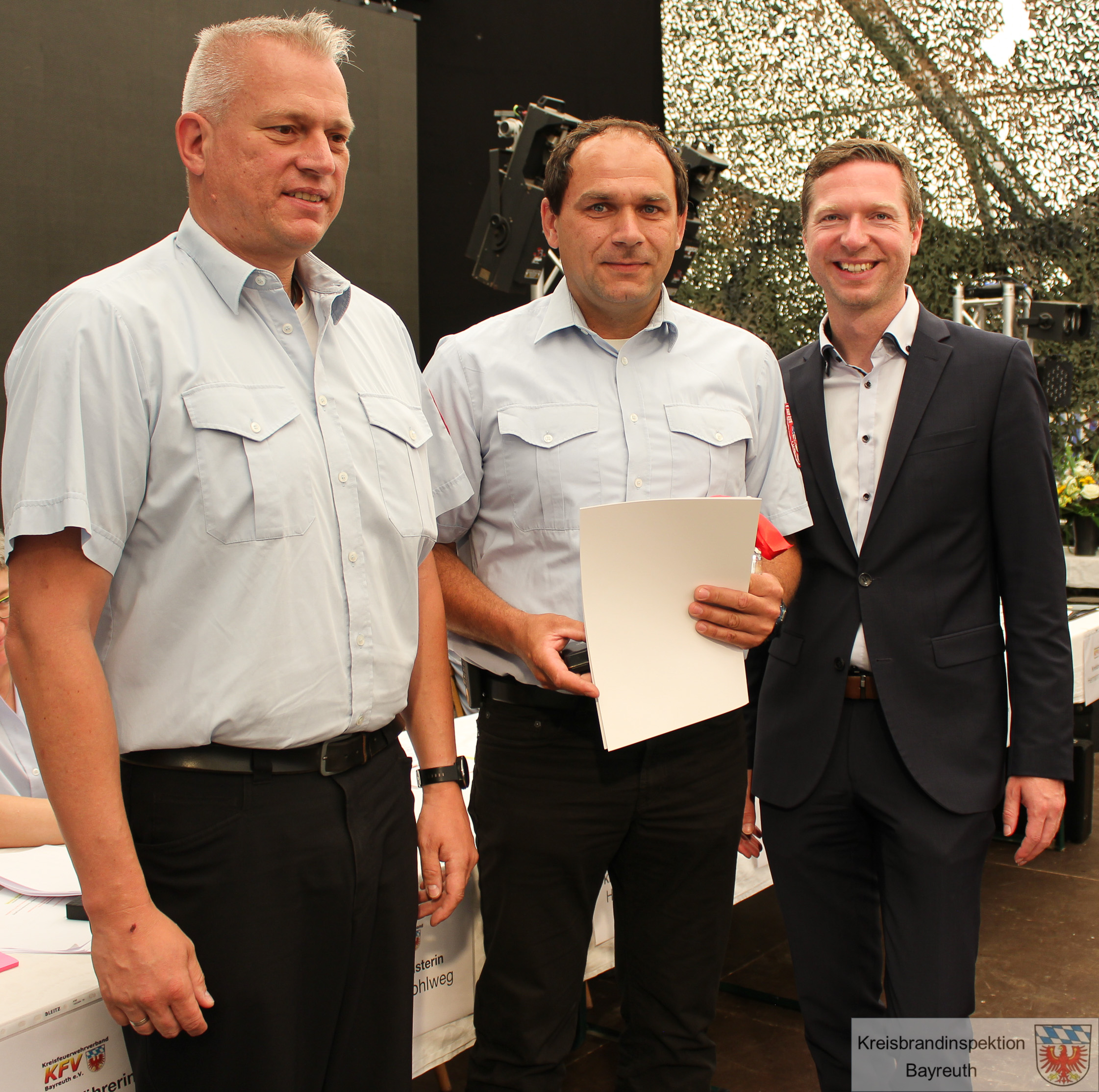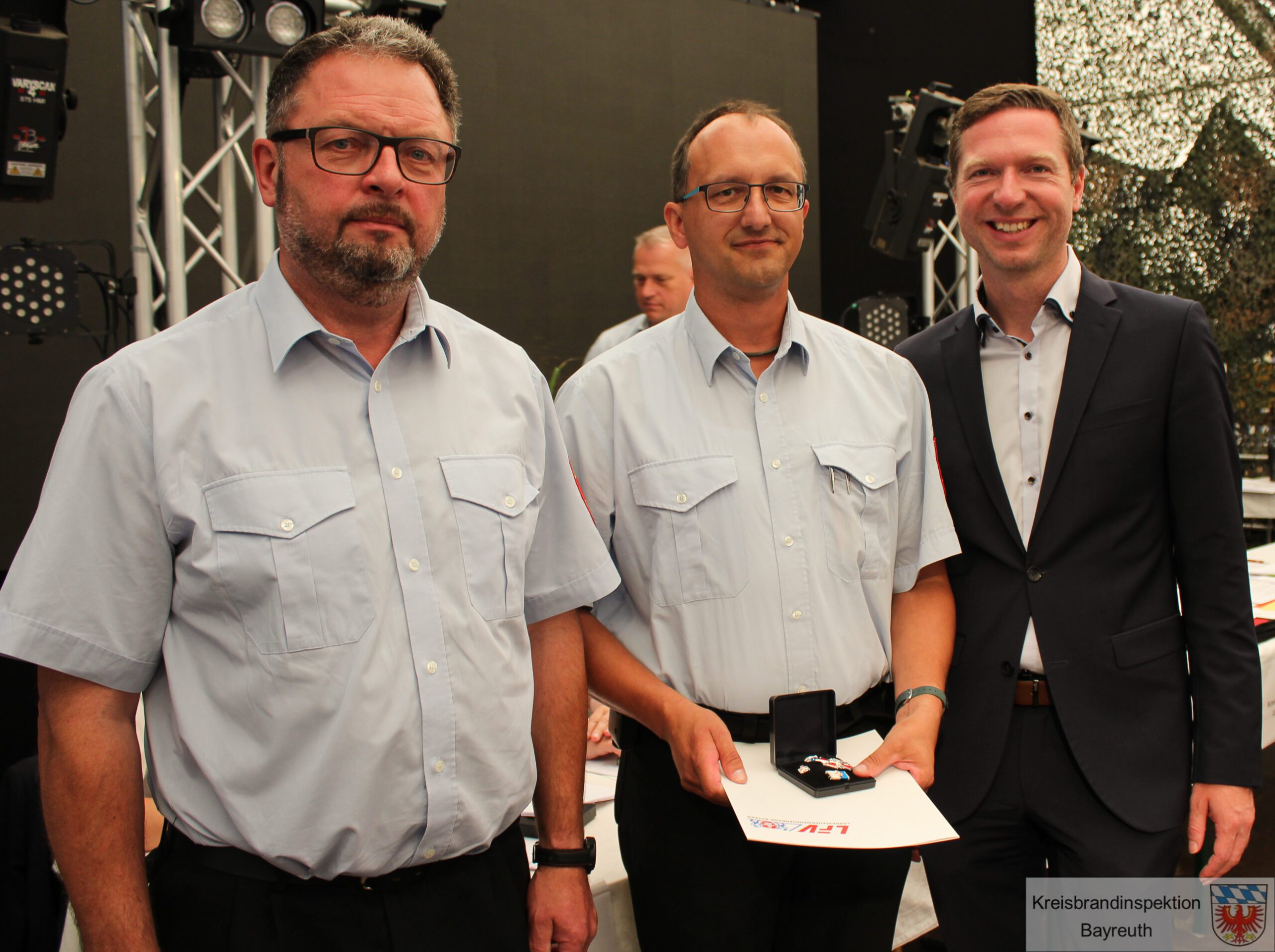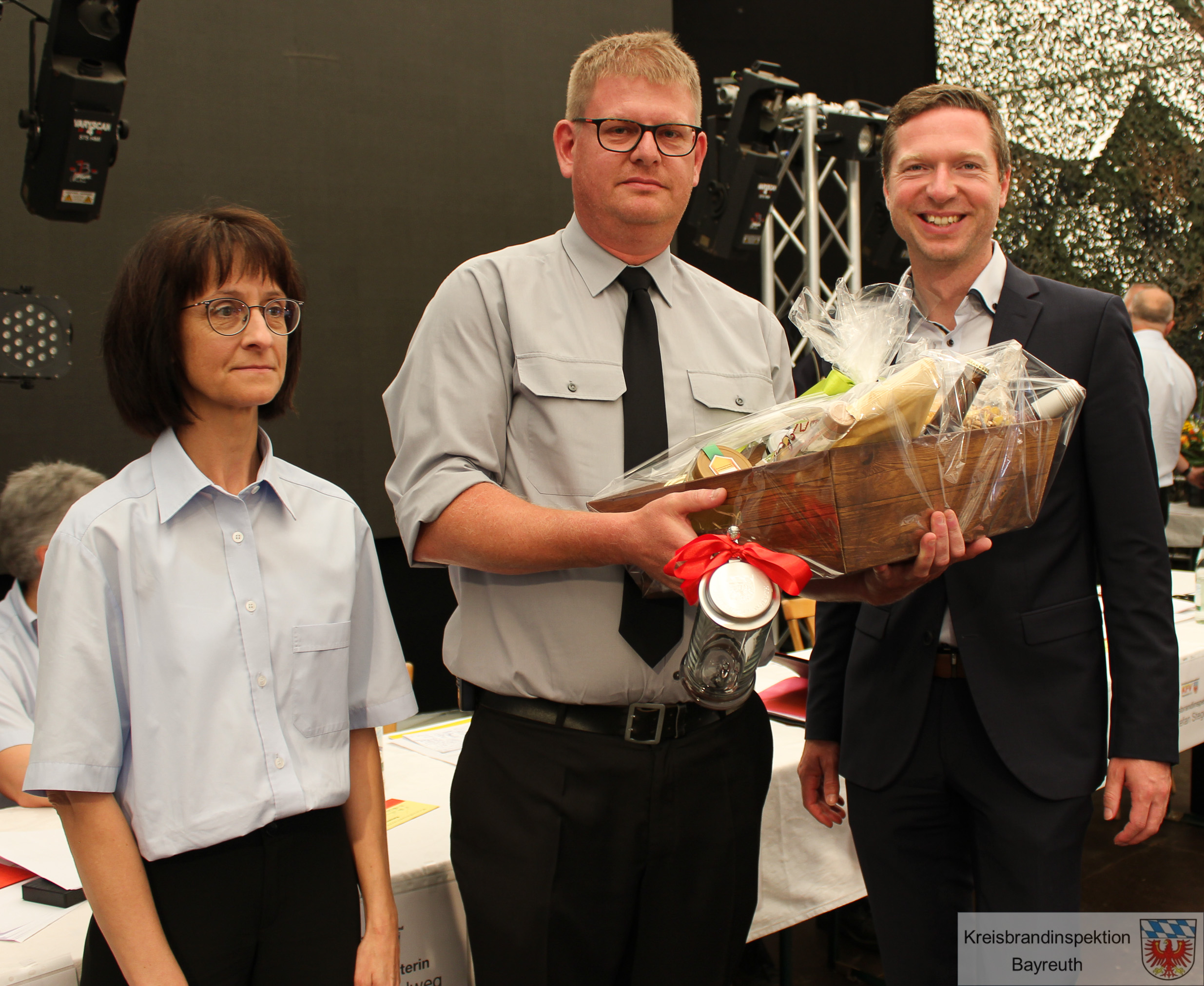 KBI Harald Schöberl hatte die Ehre, einen wichtigen Partner im Bereich der Blaulichtfamilie, der auch stets positiv den Feuerwehren gegenüber eingestellt ist, die Firmenehrung zu überreichen. Die SKS gGmbH Ambulanz aus Bayreuth mit seinem Geschäftsführer Korbinian Specht erhielt die Ehrentafel des KFV Bayreuth als wichtiger und unverzichtbarer Partner der Feuerwehren. Besonders in den Corona Jahren waren sie eine große Unterstützung, indem sie Sonderimpfangebote für uns bereit stellten, damit auch im Ehrenamt Feuerwehr die Einsatzbereitschaft weiterhin gewährleistet werden konnte. Desweiteren wurde durch SKS unsere Hilfskräfte im Bereich der Schnelltestungen immer wieder unbürokratisch unterstützt.